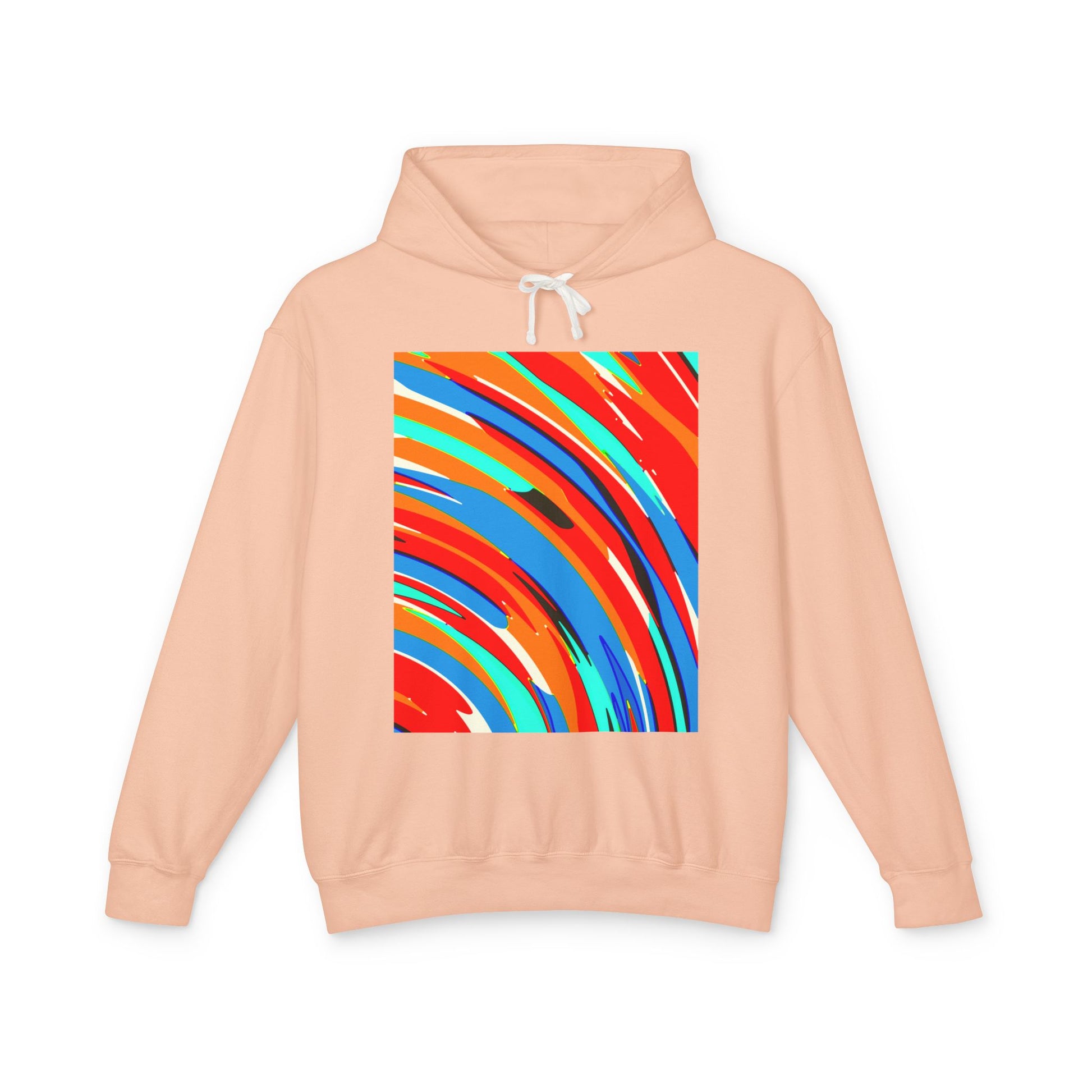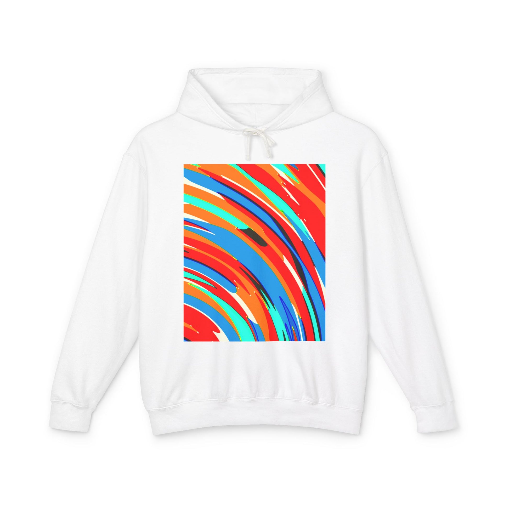 This lightweight hooded sweatshirt brings bright, kinetic energy to everyday layers. The vivid abstract swirl print sits centered on a soft white canvas, catching eyes with bold strokes of red, orange, turquoise and cobalt. It wears like an easygoing staple—light enough for warmer days, cozy enough for cool evenings. The relaxed cut and jersey-lined hood make it comfortable for long walks, studio sessions, or coffee shop hangs. Sustainable details like OEKO-TEX low-impact dyes and U.S. Cotton Trust Protocol cotton add quiet confidence: it looks lively and feels thoughtful to own.