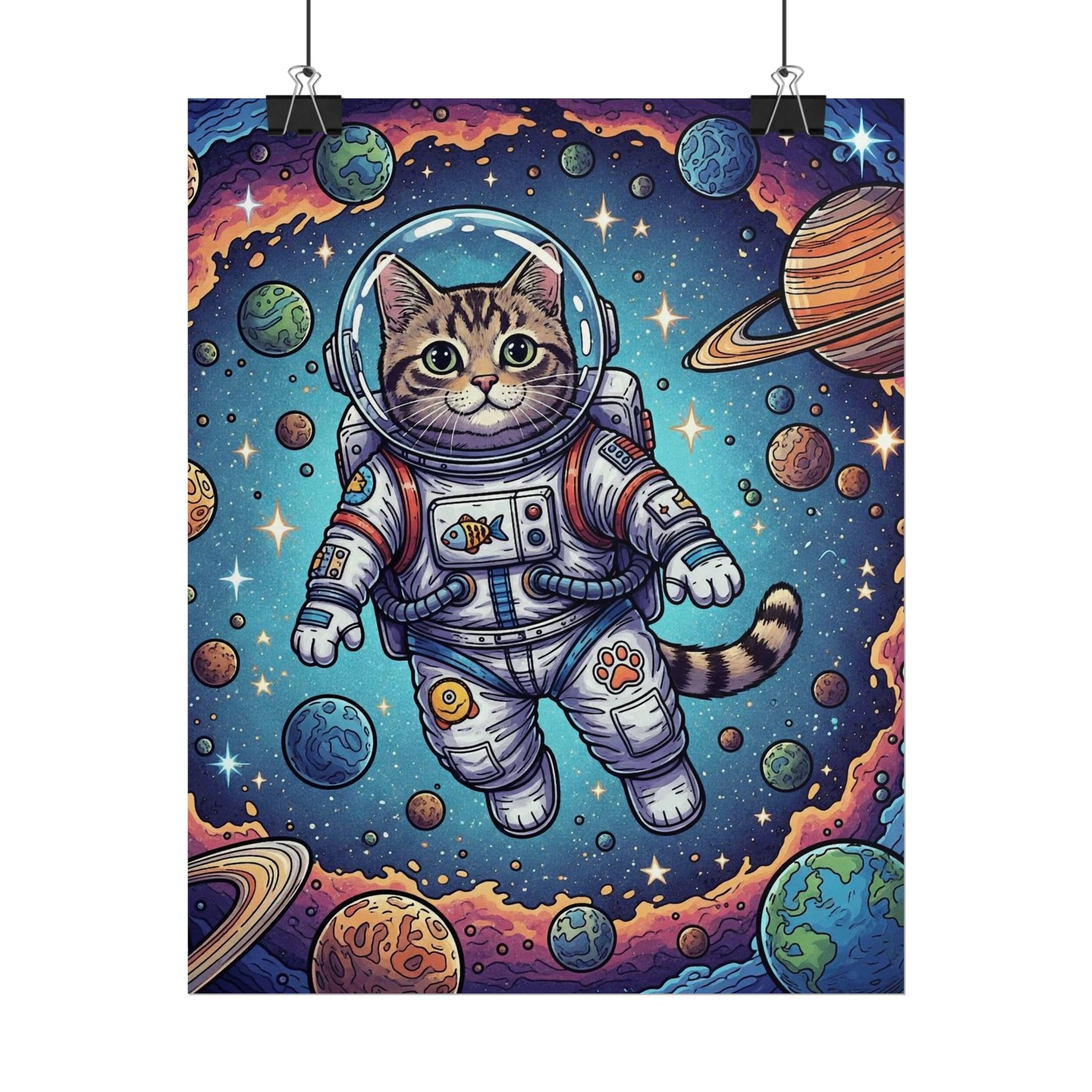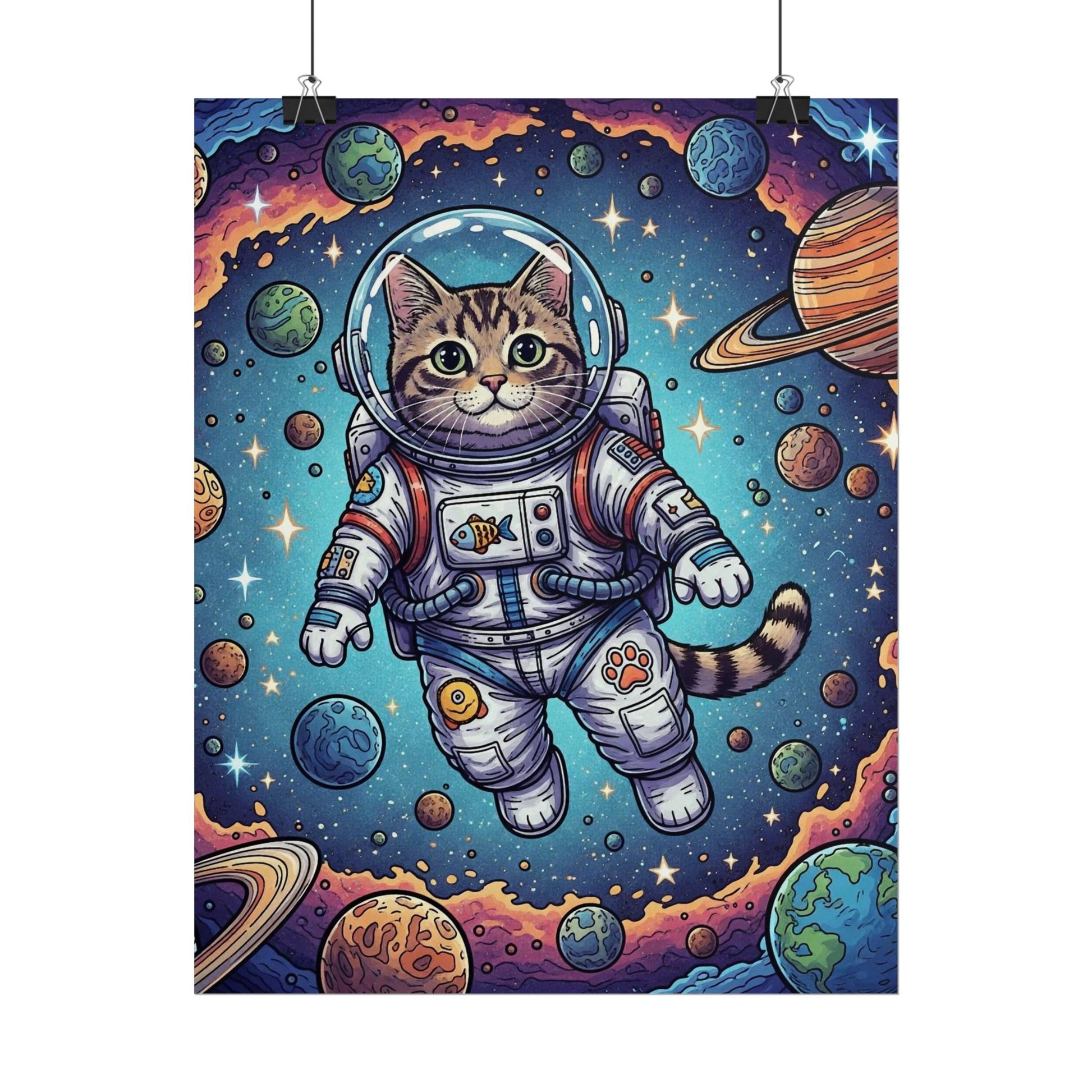 This rolled poster brings a playful, cosmic energy to any wall. A wide-eyed tabby floats in a colorful galaxy, rendered with bright, giclée-quality inks that hold their vibrancy. Choose from textured fine art, satin semi-gloss, or low-sheen matte paper to match your space—each size and orientation prints crisply so the tiny planet details and starfield pop. Hung in a studio, bedroom, or office, the illustration feels like a cheerful reminder to stay curious and keep exploring.