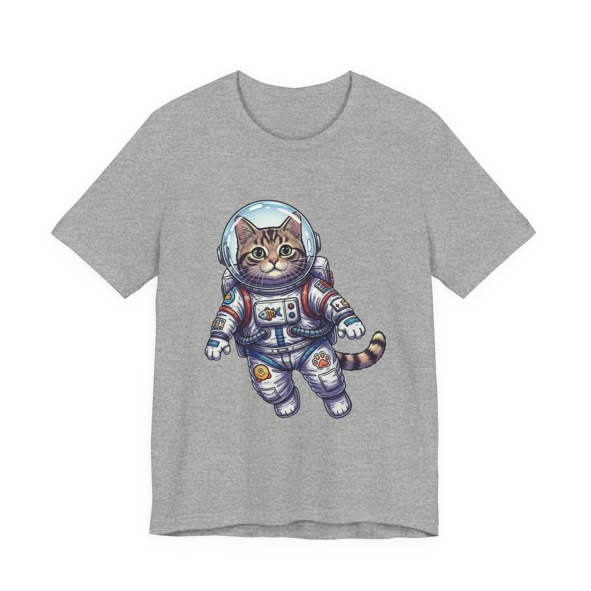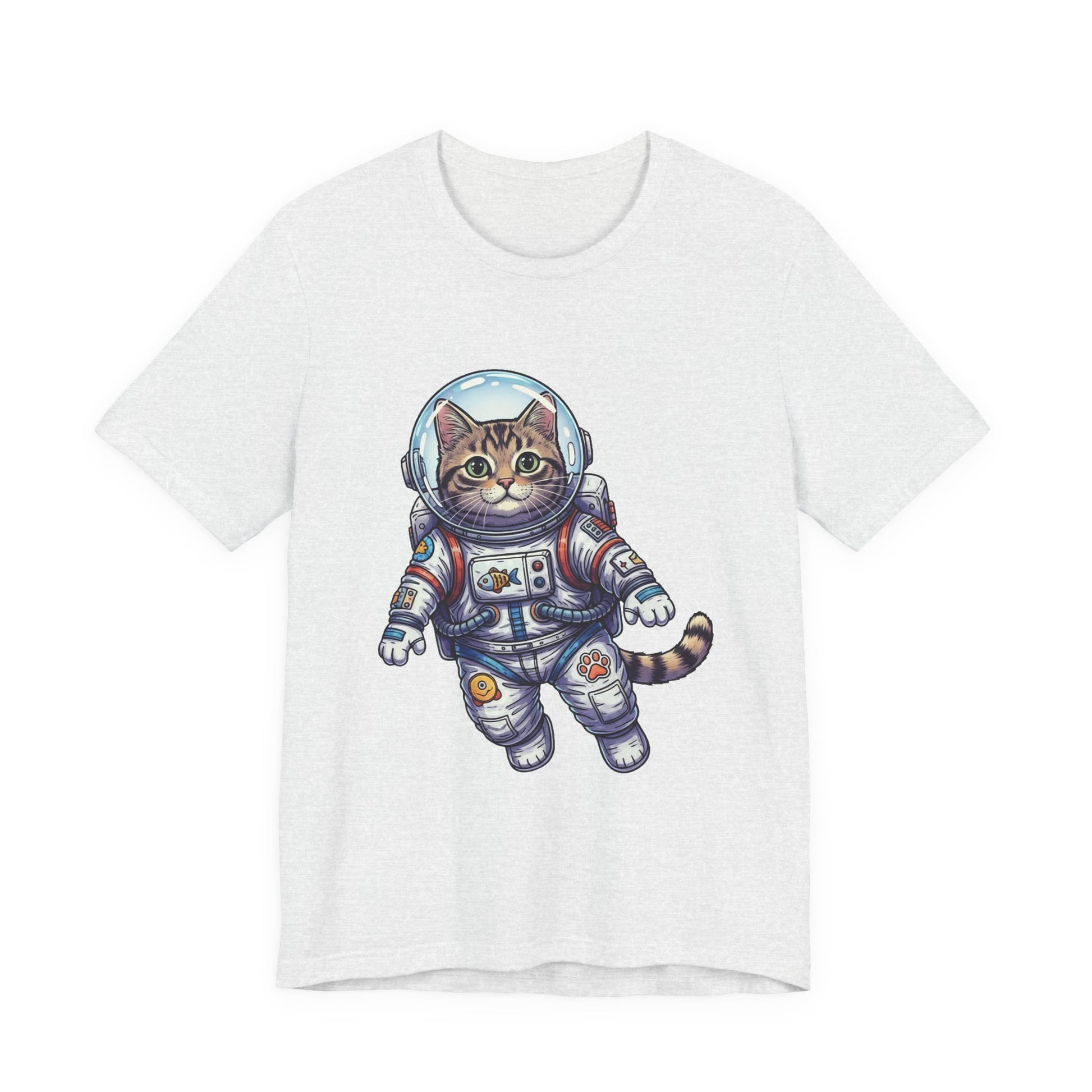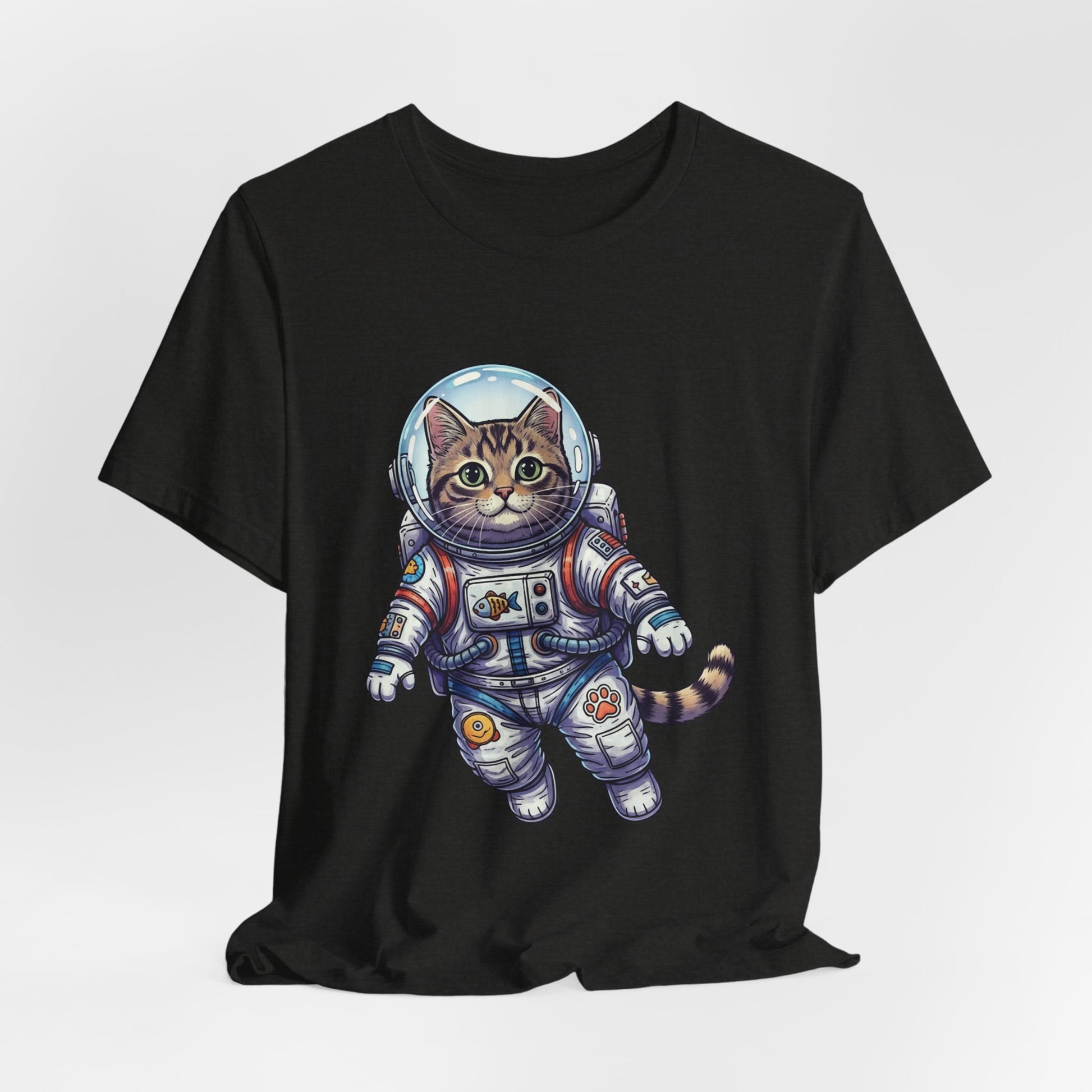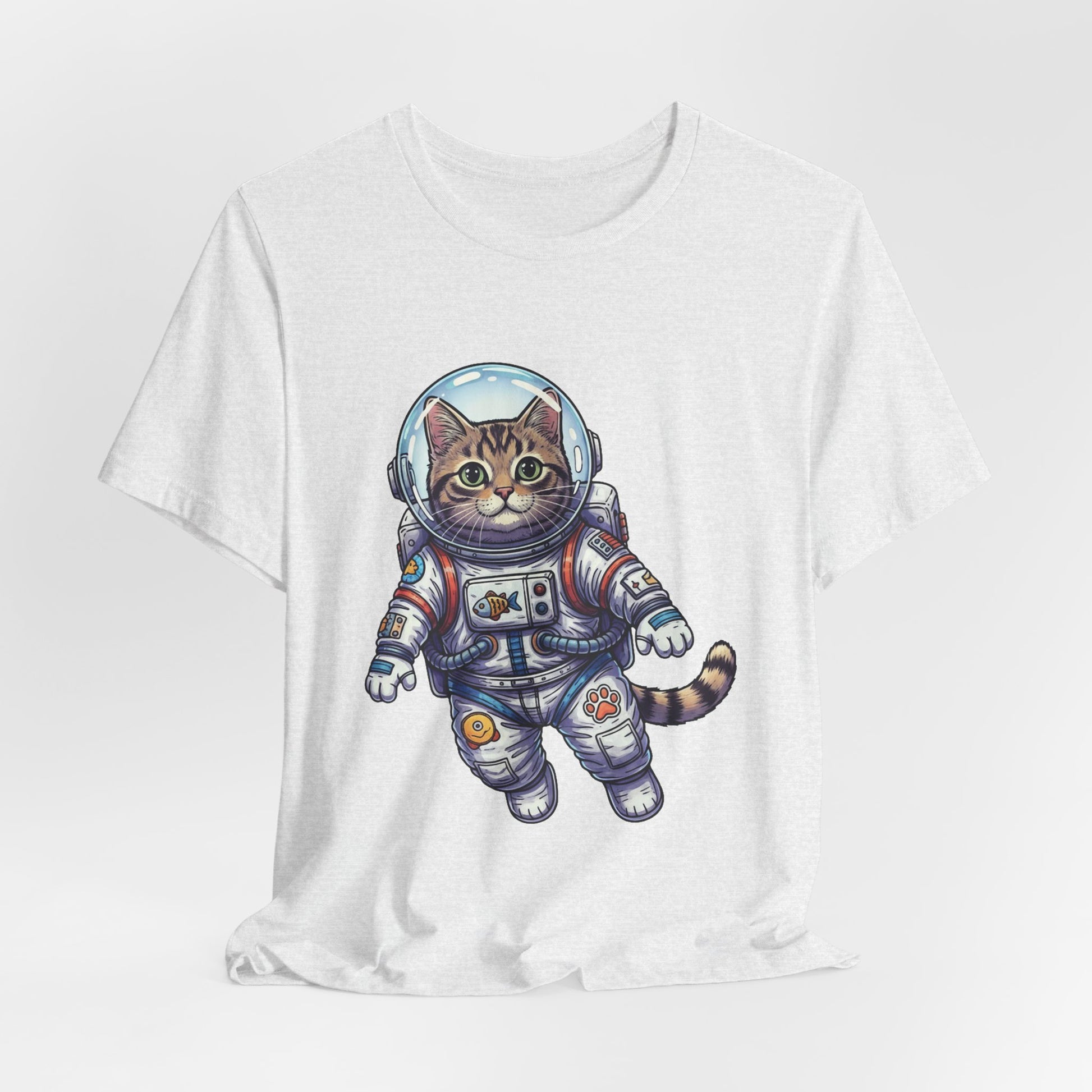 This lightweight crew-neck tee brings playful wonder to everyday wear. A detailed astronaut cat floats across the chest in vibrant, hand-drawn colors—whiskers peeking behind a reflective helmet, patches and tiny tech details on the suit that invite a second look. The soft, breathable Airlume combed cotton feels gentle against skin and layers easily under jackets or over hoodies. It wears like a favorite from day one: structured by side seams and shoulder tape, with a ribbed collar that keeps its shape and a tear-away label for itch-free comfort. Wear it to spark conversations on city walks, at casual meetups, or when you want a little cosmic charm in your routine.