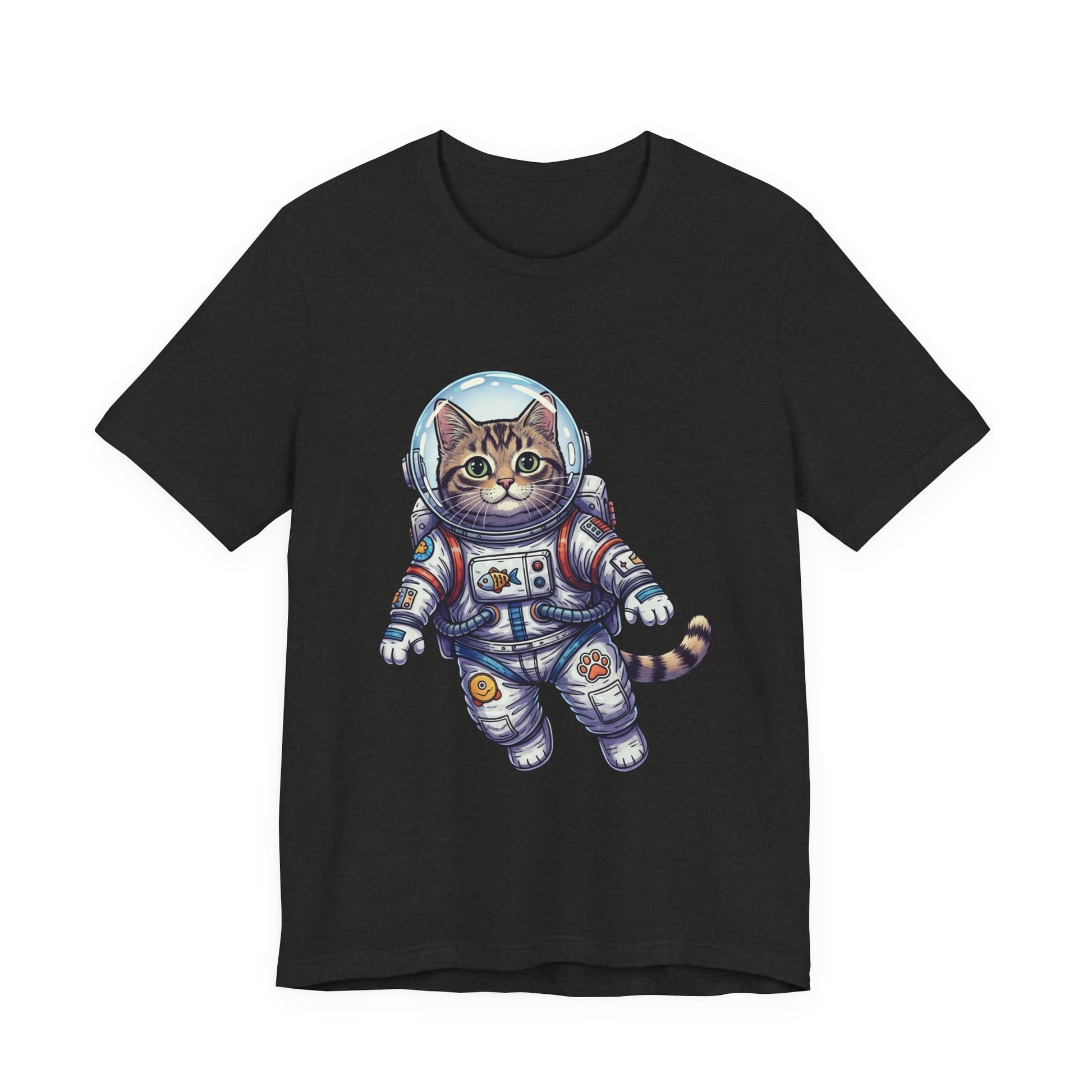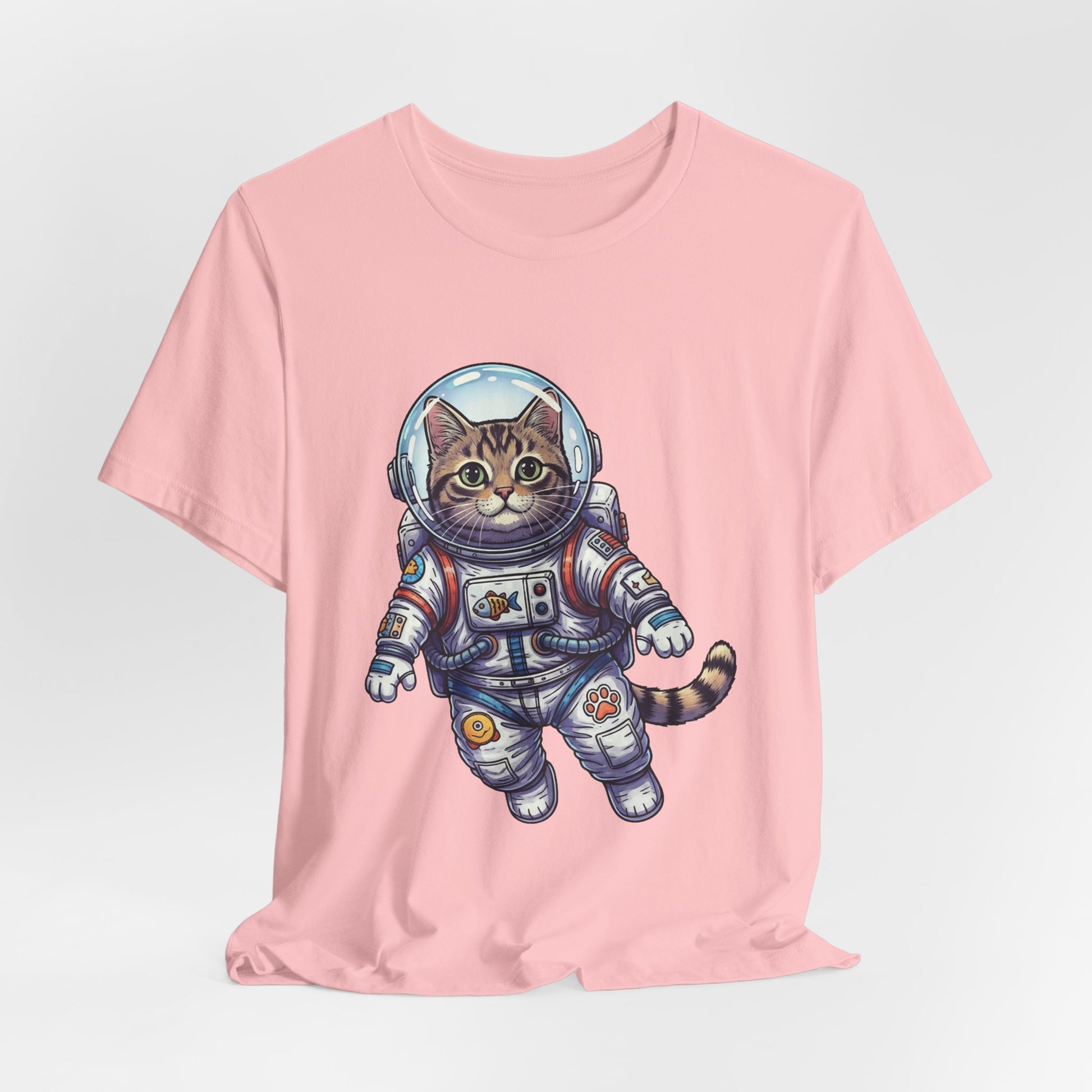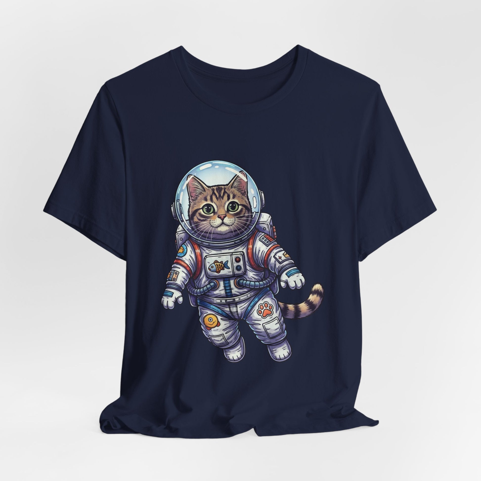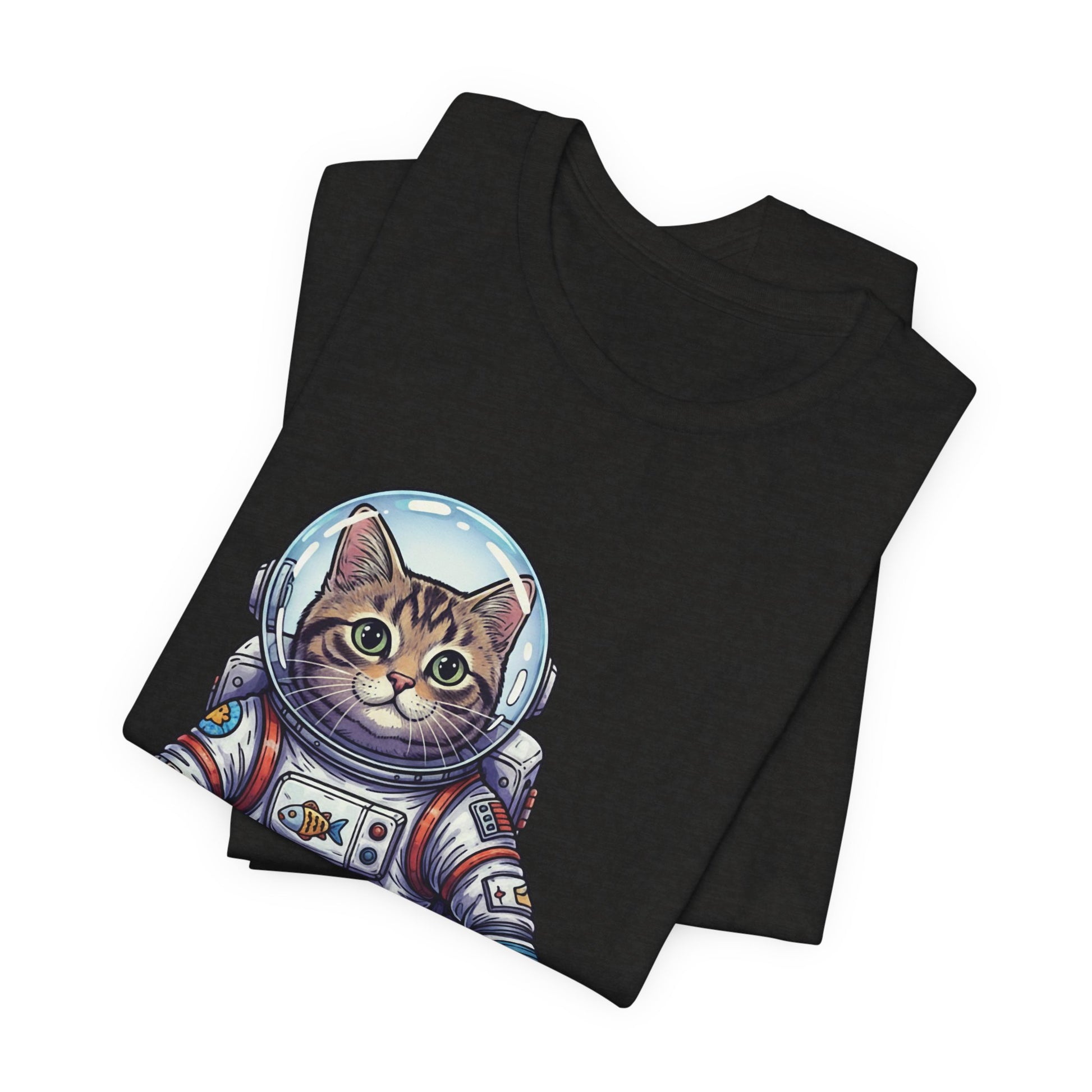 This lightweight crew-neck tee brings playful wonder to everyday wear. A detailed astronaut cat floats across the chest in vibrant, hand-drawn colors—whiskers peeking behind a reflective helmet, patches and tiny tech details on the suit that invite a second look. The soft, breathable Airlume combed cotton feels gentle against skin and layers easily under jackets or over hoodies. It wears like a favorite from day one: structured by side seams and shoulder tape, with a ribbed collar that keeps its shape and a tear-away label for itch-free comfort. Wear it to spark conversations on city walks, at casual meetups, or when you want a little cosmic charm in your routine.
