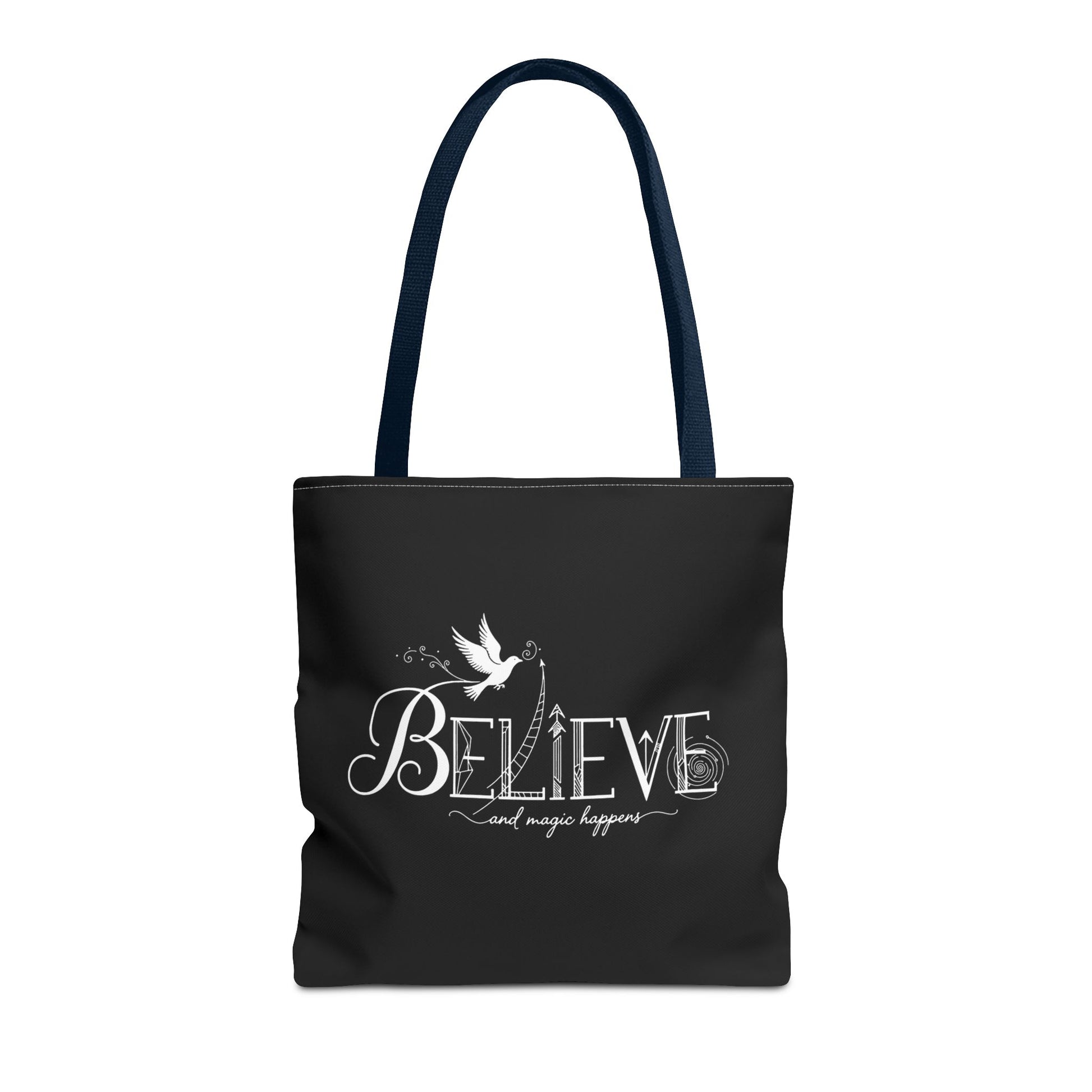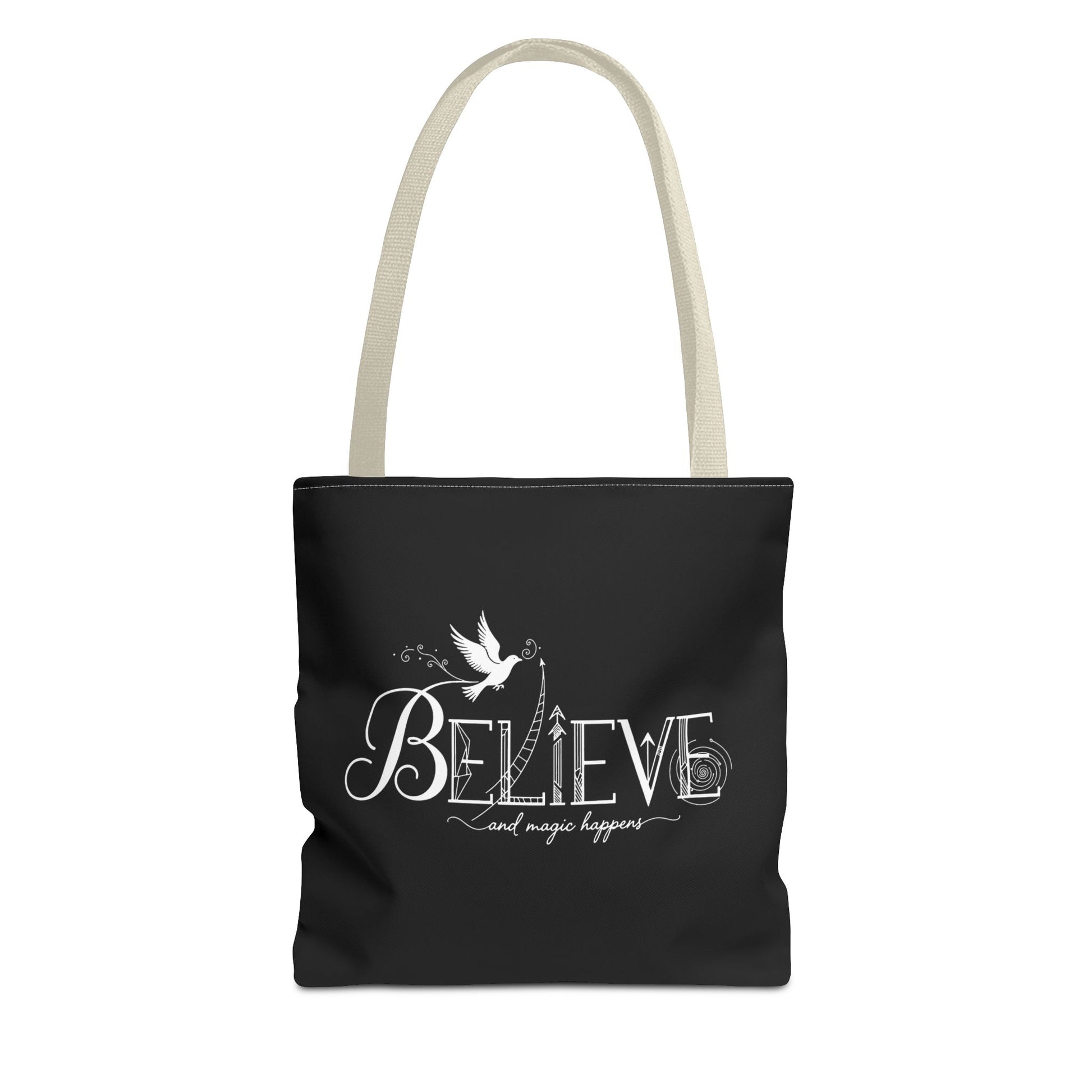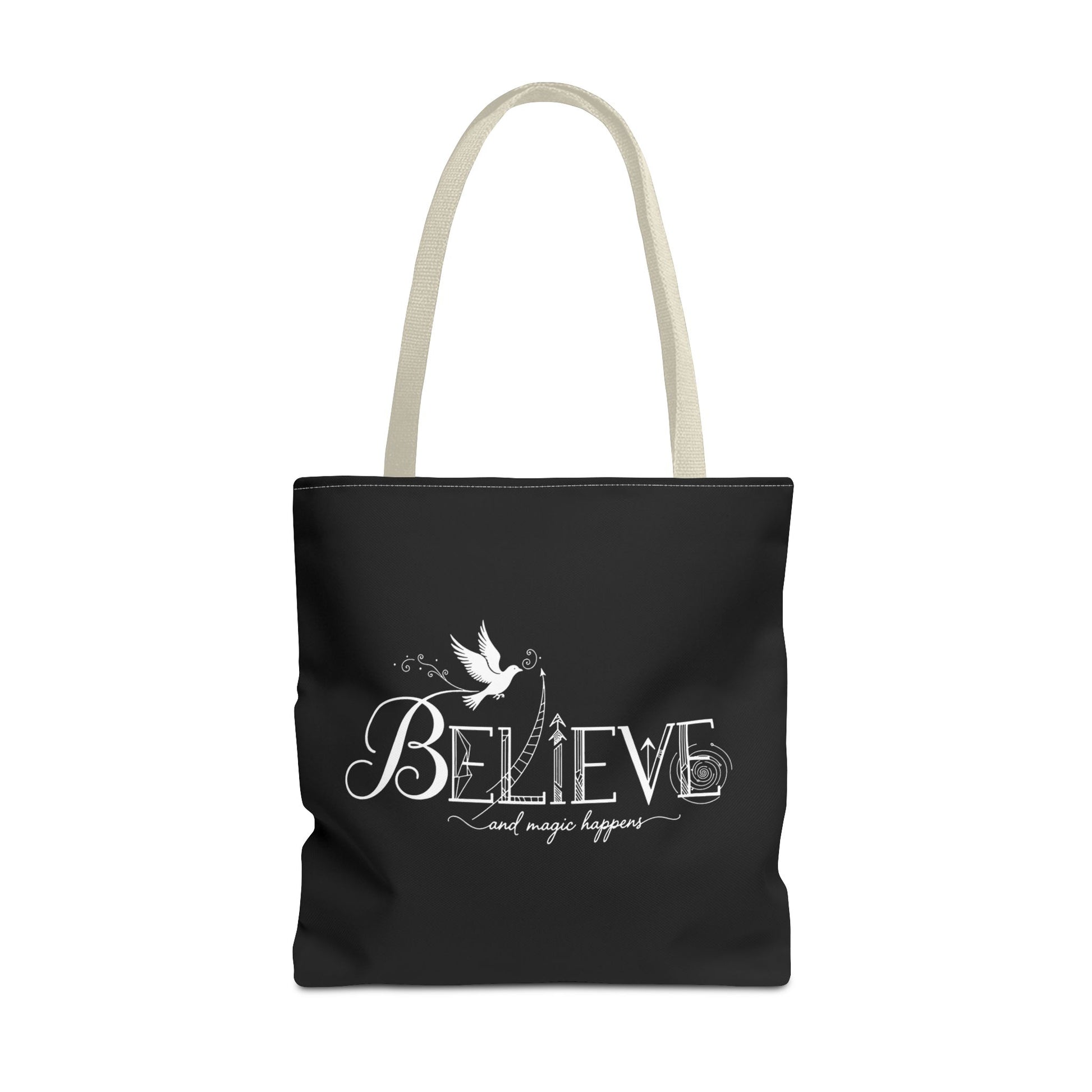 Elevate your style and carry your essentials with ease using this beautiful tote bag. Designed with a striking ‘Believe’ motif, this bag inspires positivity and hope, making it a perfect daily companion. Its lightweight yet durable fabric ensures that it holds up to everyday wear, whether you're heading to the market, the beach, or just out for a casual stroll. Ideal for those who appreciate both function and flair, this tote fits seamlessly into any lifestyle, all while spreading a message of positivity. Perfect for celebrating occasions like birthdays, holidays, or any special event where you want to share good vibes! It also makes a thoughtful gift for friends, family, or anyone in need of a little inspiration in their lives.