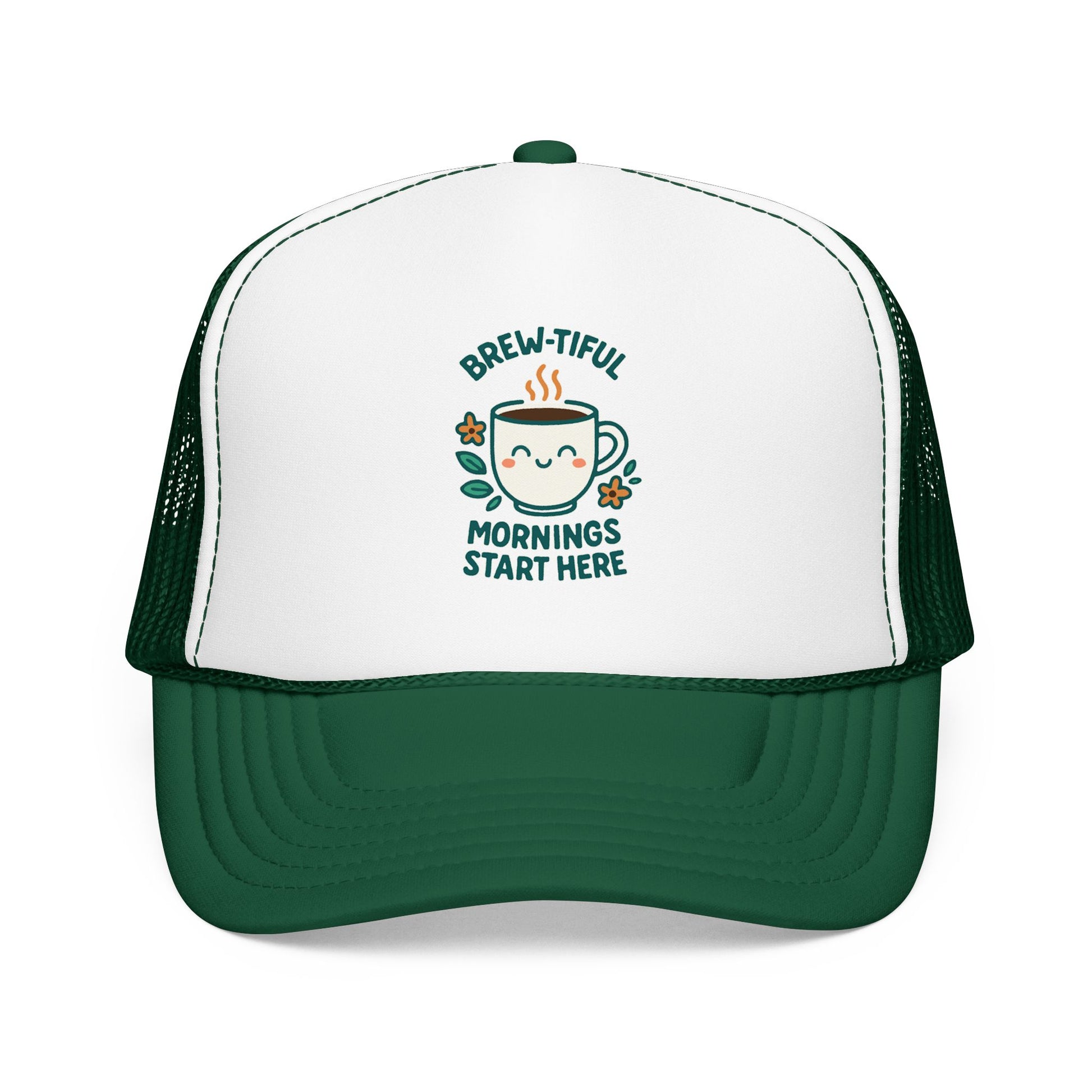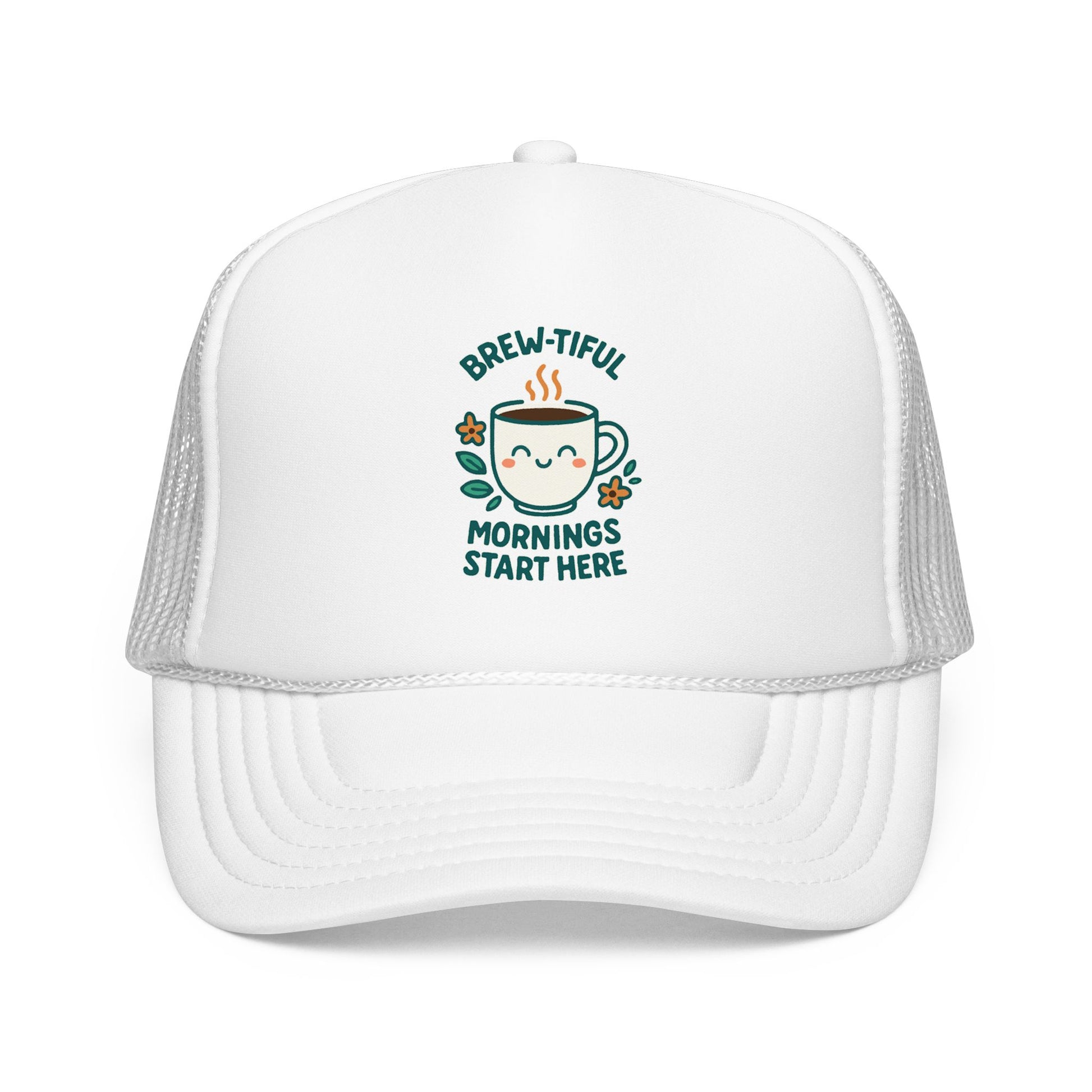 Wake up with a grin and a warm cup in hand. This foam trucker hat pairs a soft, slightly rounded foam front with breathable mesh at the back and features a cheerful illustrated mug and the hand-lettered message “Brew-tiful mornings start here.” It sits high on the head for a casual, laid-back silhouette and keeps you cool on early walks, coffee runs, or lazy weekends. The pre-curved visor shades your eyes, while the snapback closure lets you dial in a comfortable fit. Wear it with faded denim, a cozy sweater, or your favorite coffee-stained tee—this hat reads like a small, wearable love note to slow mornings and honest caffeine rituals.