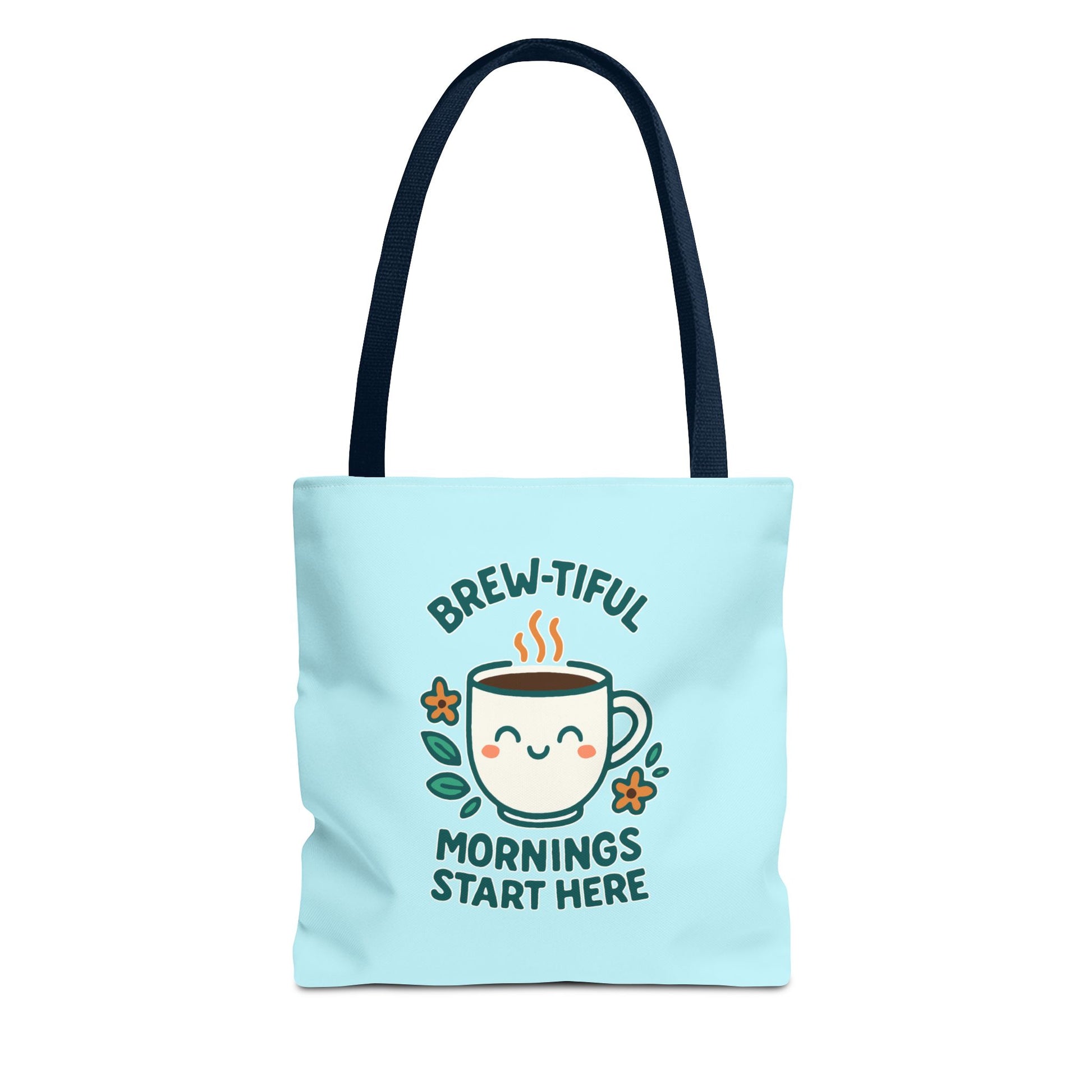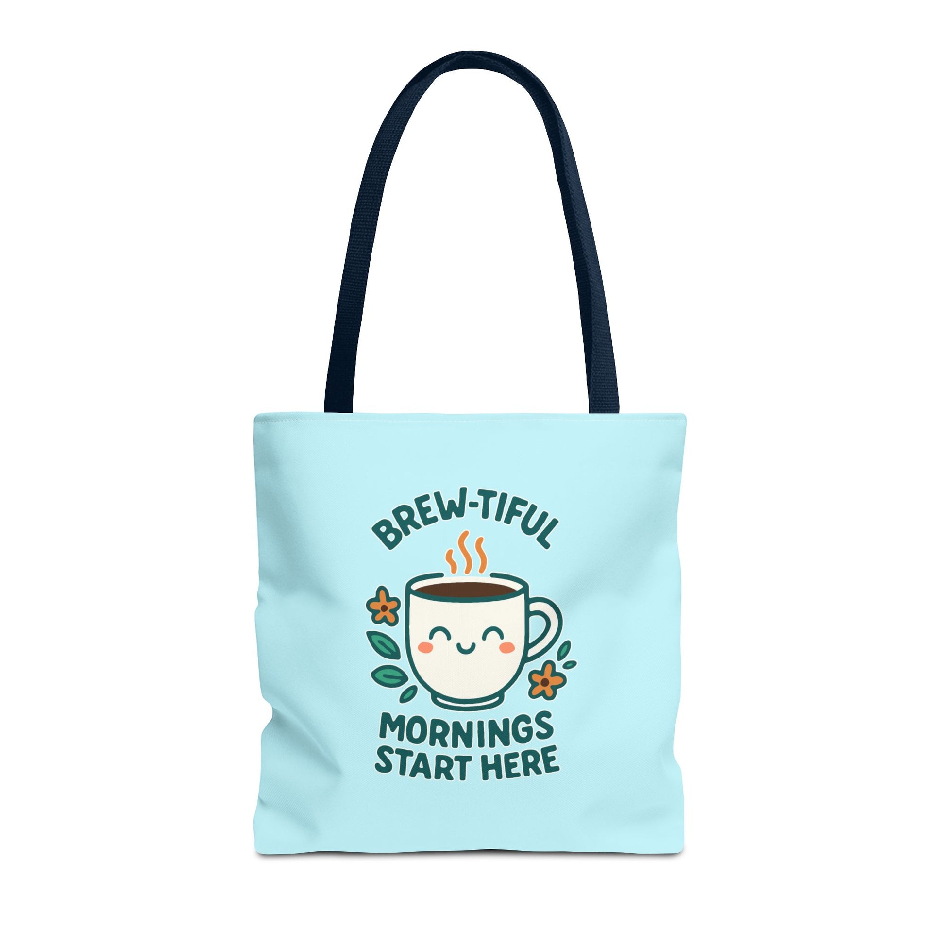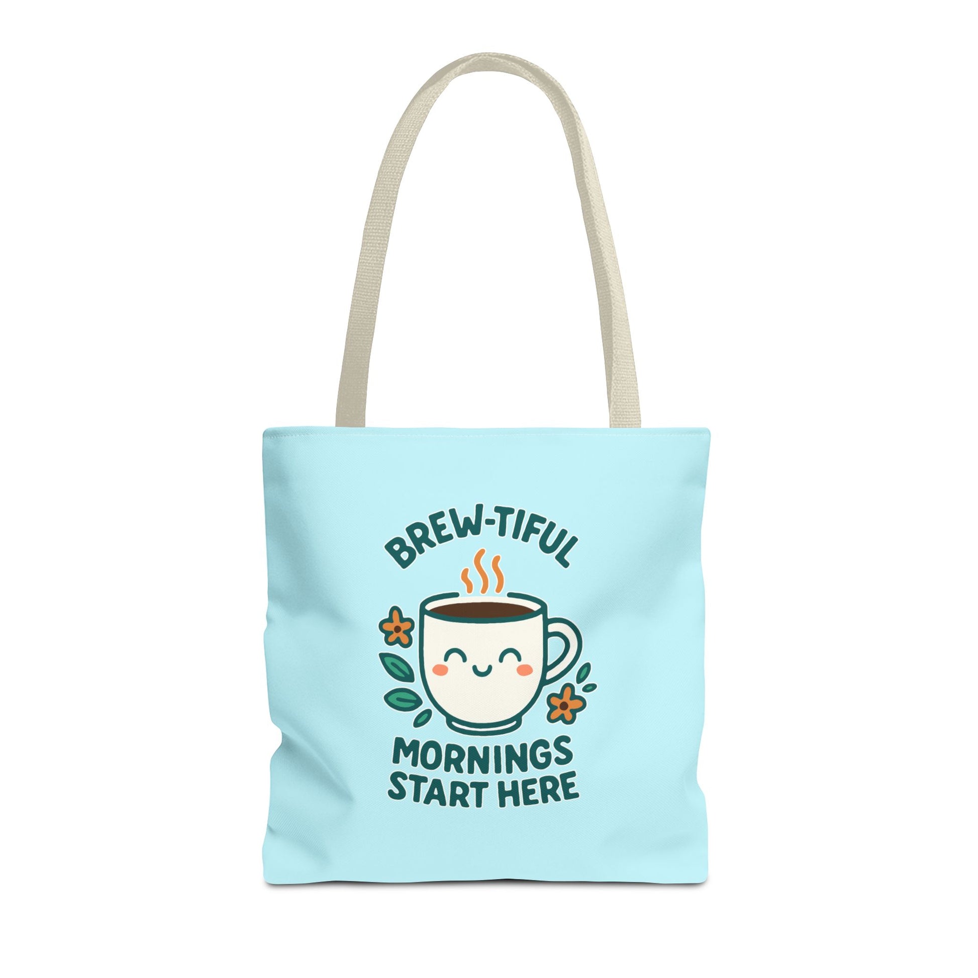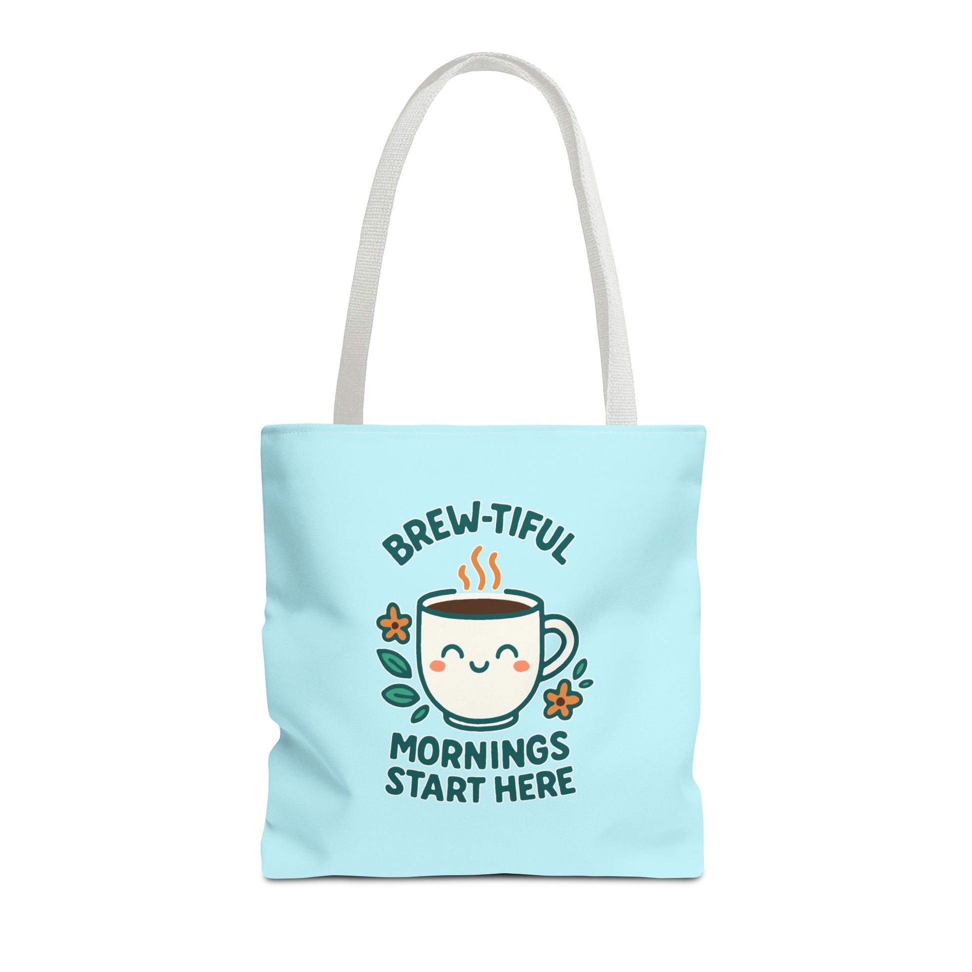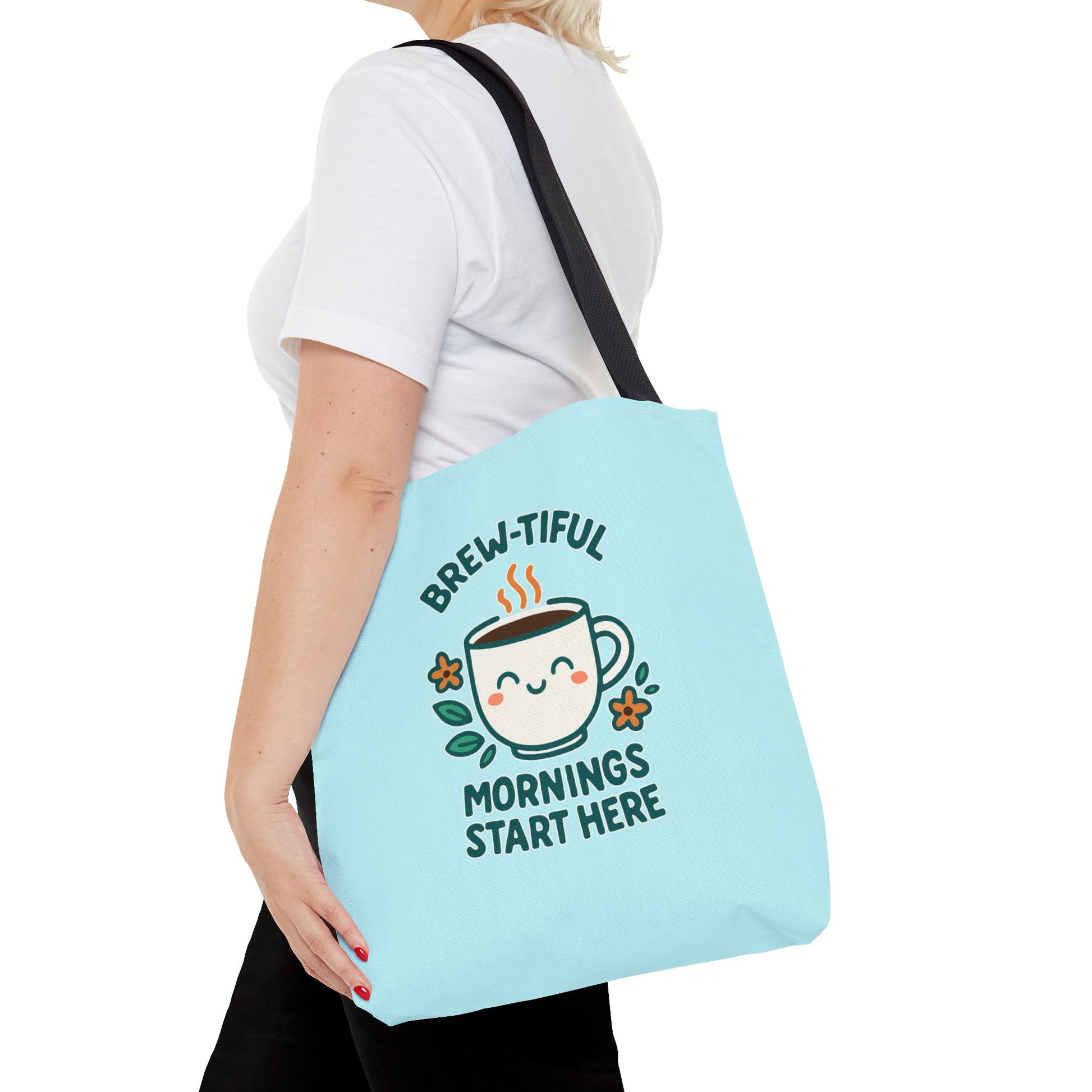 Brew-tiful Mornings Tote Bag, Cute Coffee Lover Gift, Reusable Grocery Bag, Spring Picnic Essentials, Motivational Quote Tote