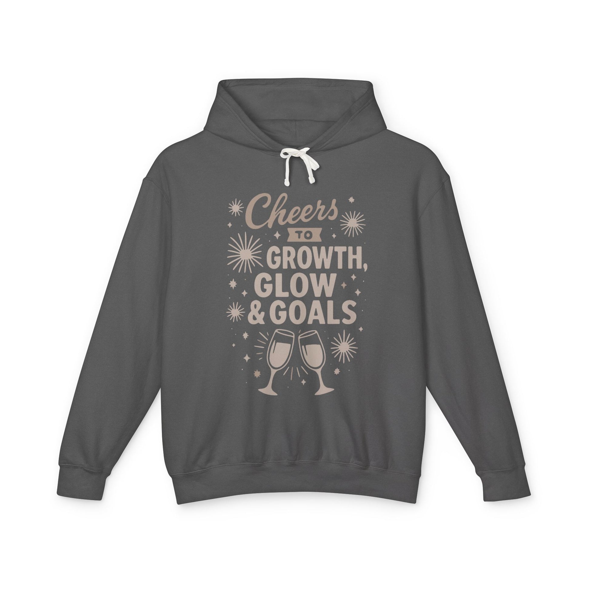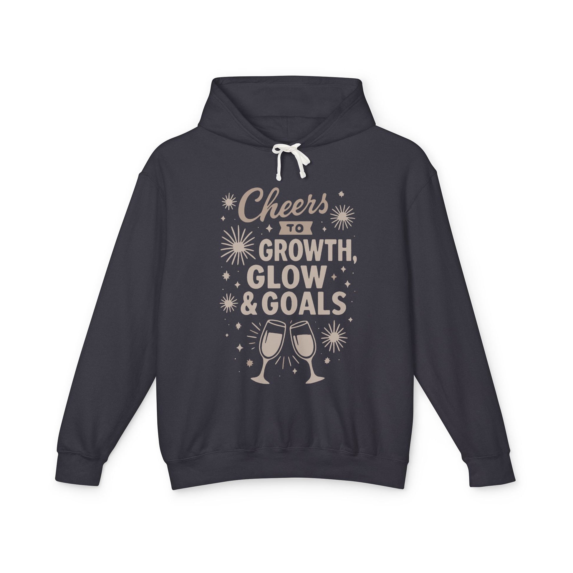 Embrace positivity and celebration with this lightweight hooded sweatshirt. Perfect for cozy gatherings or casual outings, it brings a relaxed vibe to any occasion. Featuring a chic design that reads "Cheers to Growth, Glow & Goals," this sweatshirt is ideal for individuals striving for personal growth, making it a great gift for friends and family during milestones like birthdays, New Year’s celebrations, or life transitions. It's great for those who appreciate comfort without sacrificing style, making it versatile for everyday wear or special events alike.