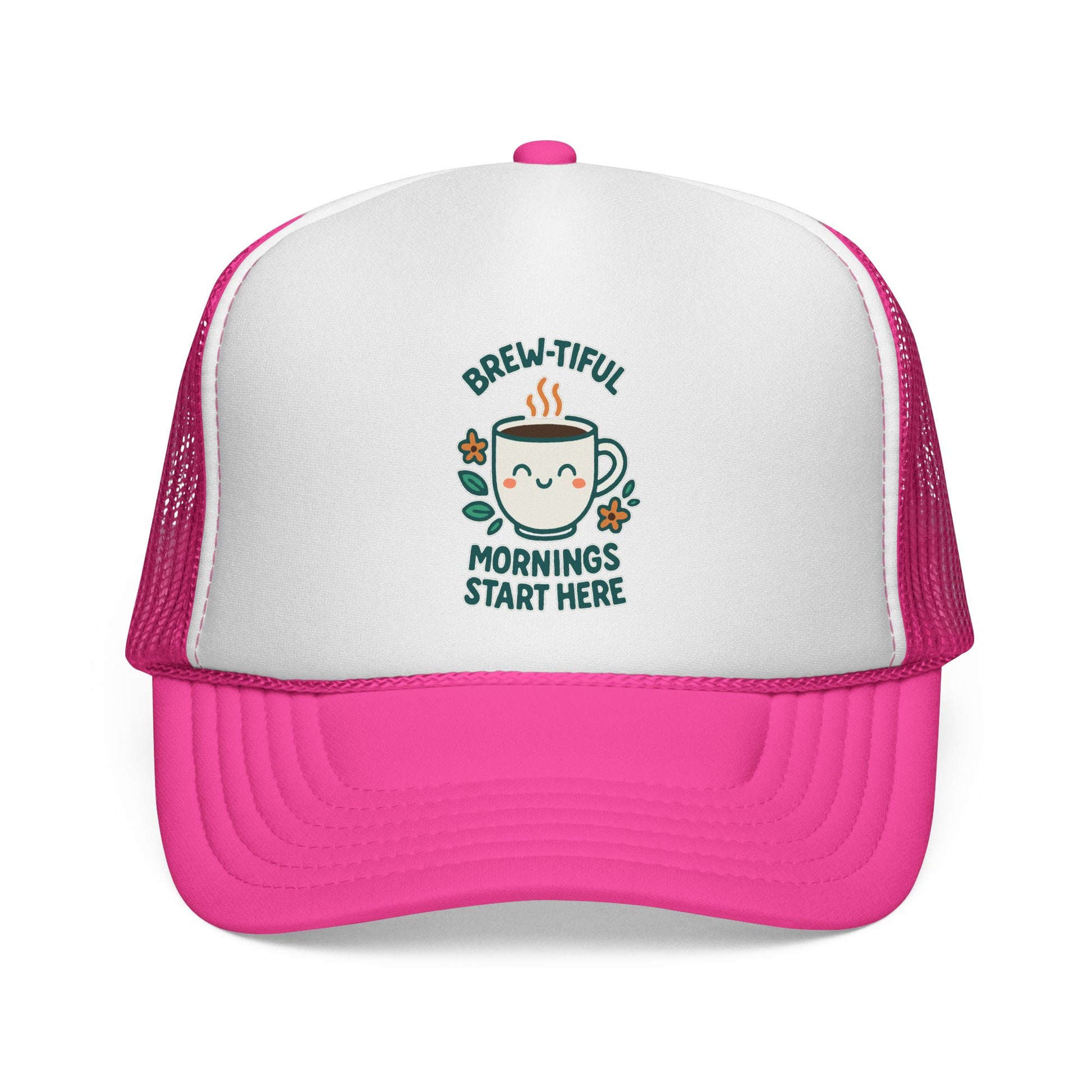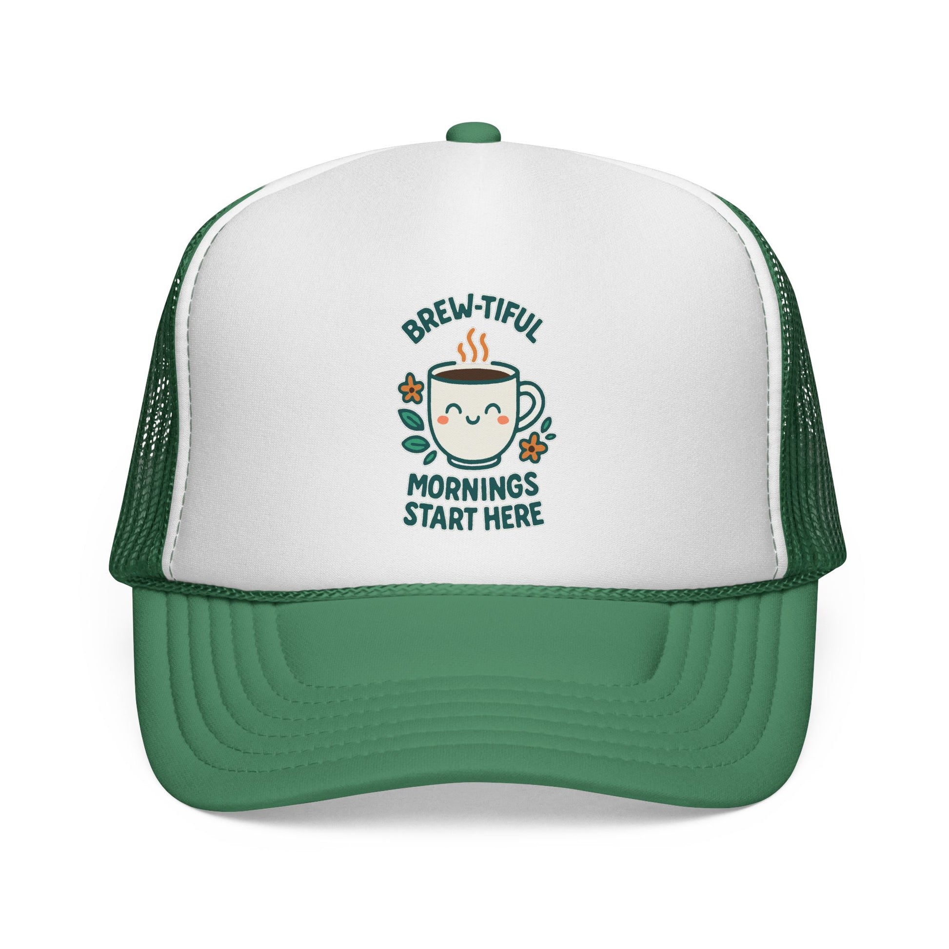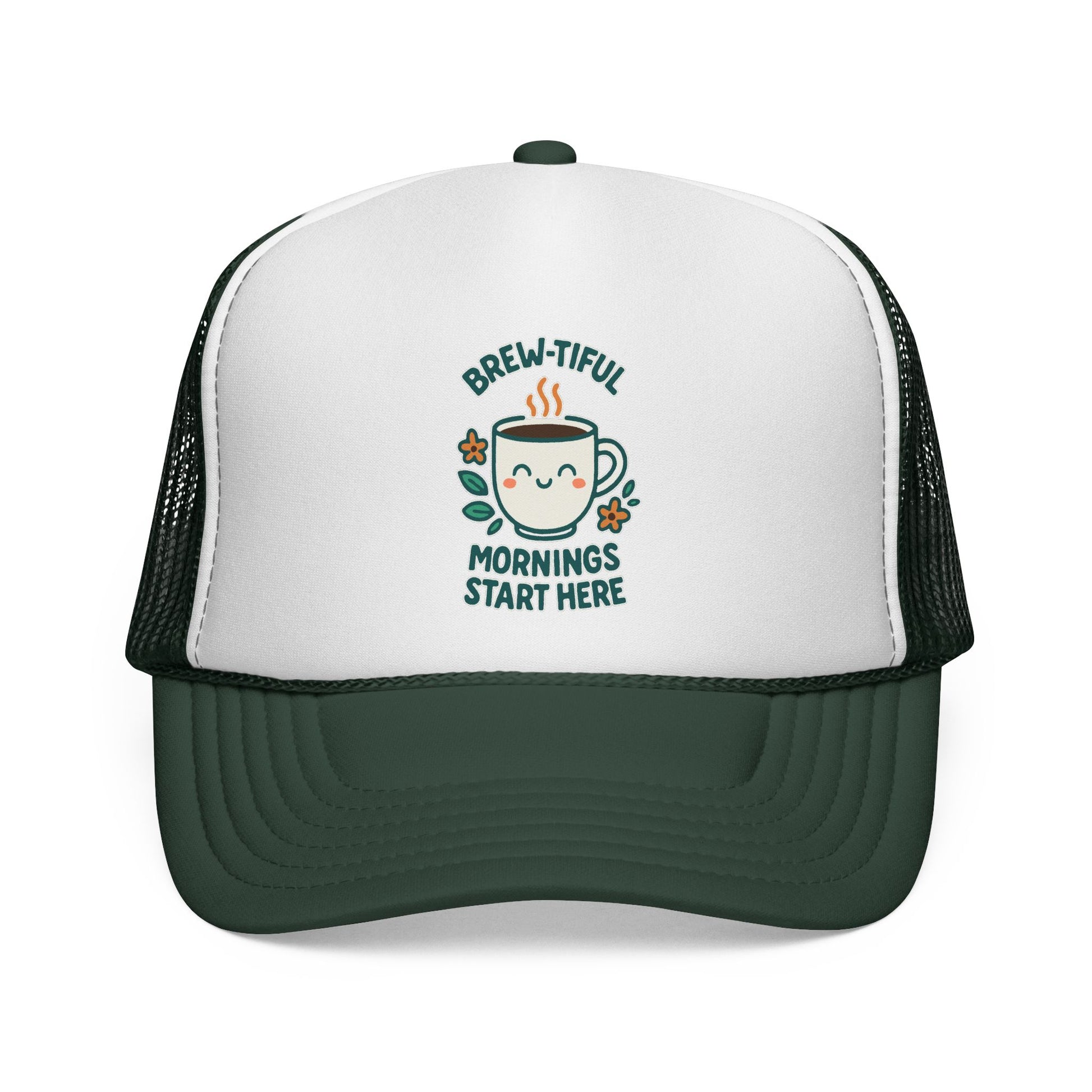Coffee Lovers Trucker Cap, Brew-tiful Mornings Start Here, Coffee Hat
