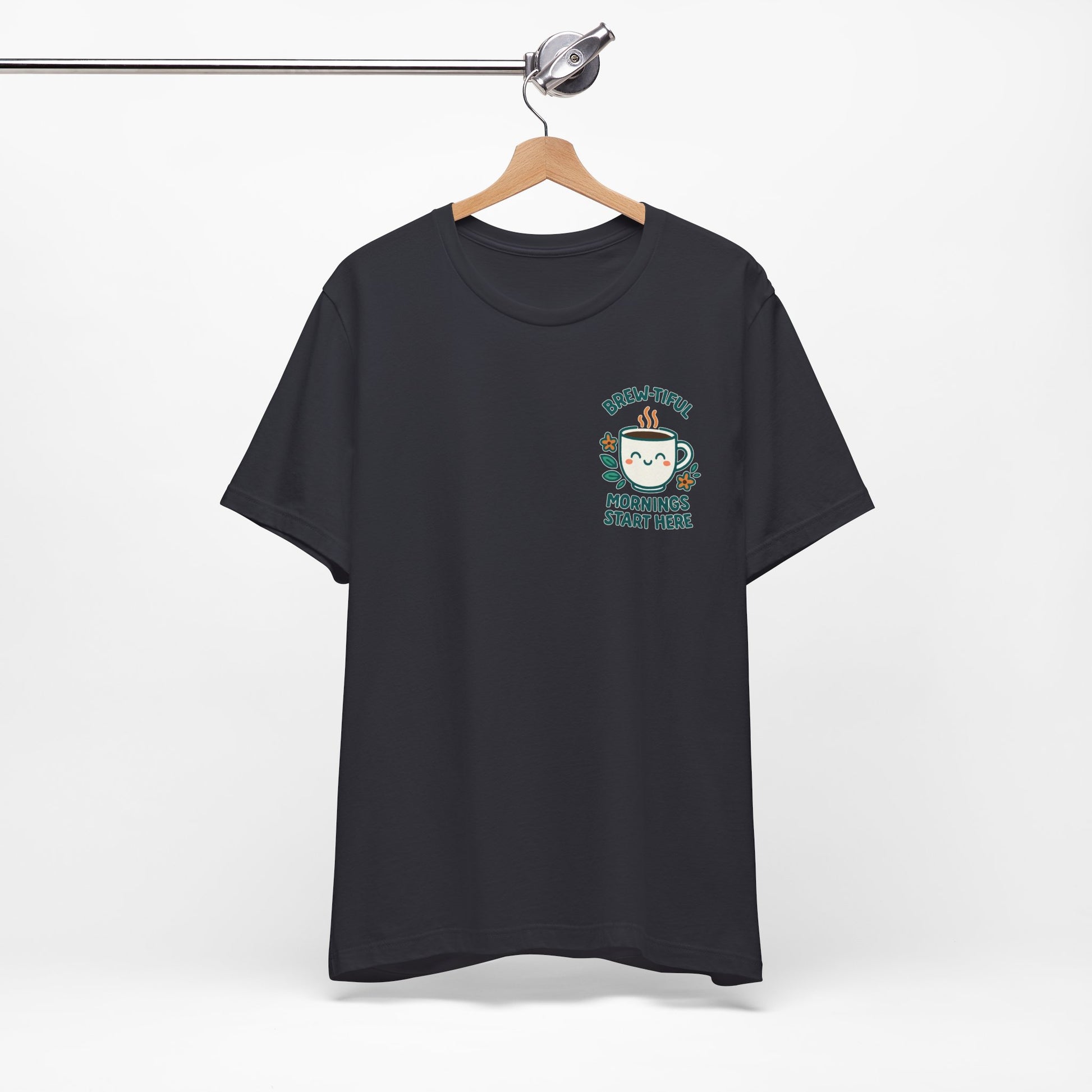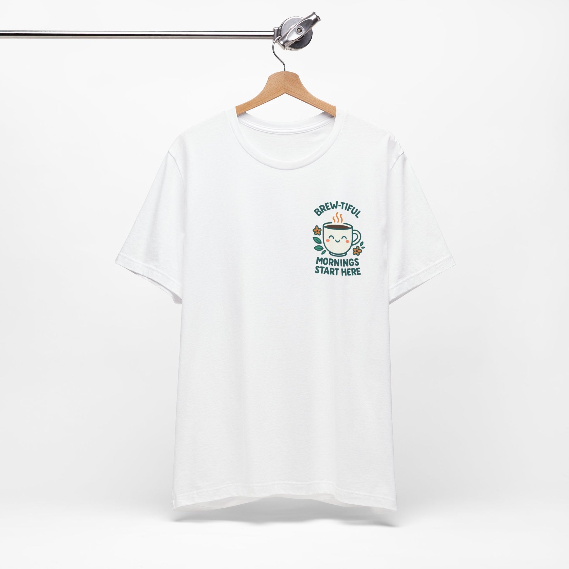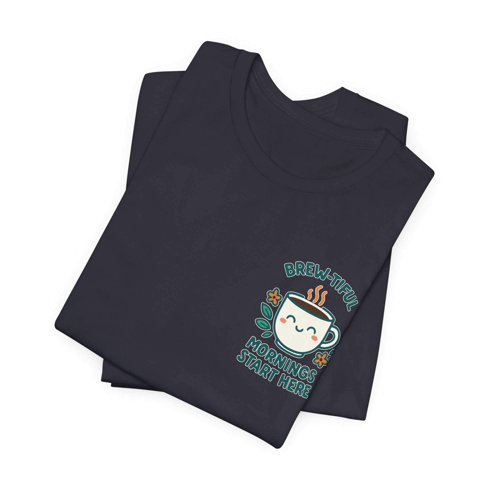 Cute Coffee Lover T-Shirt, Brew-tiful Mornings Start Here Tee, Perfect for Baristas, Gift for Coffee Enthusiasts, Cozy Everyday Wear