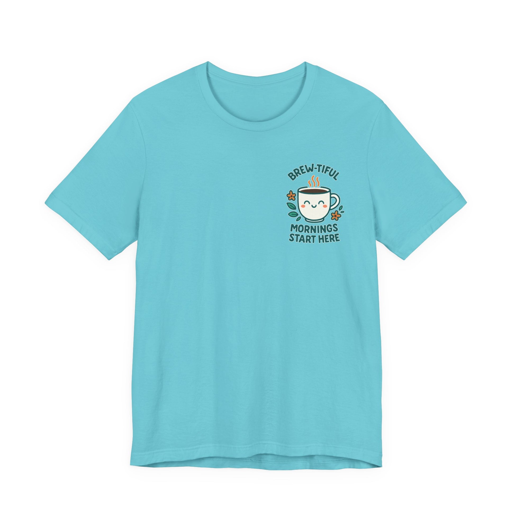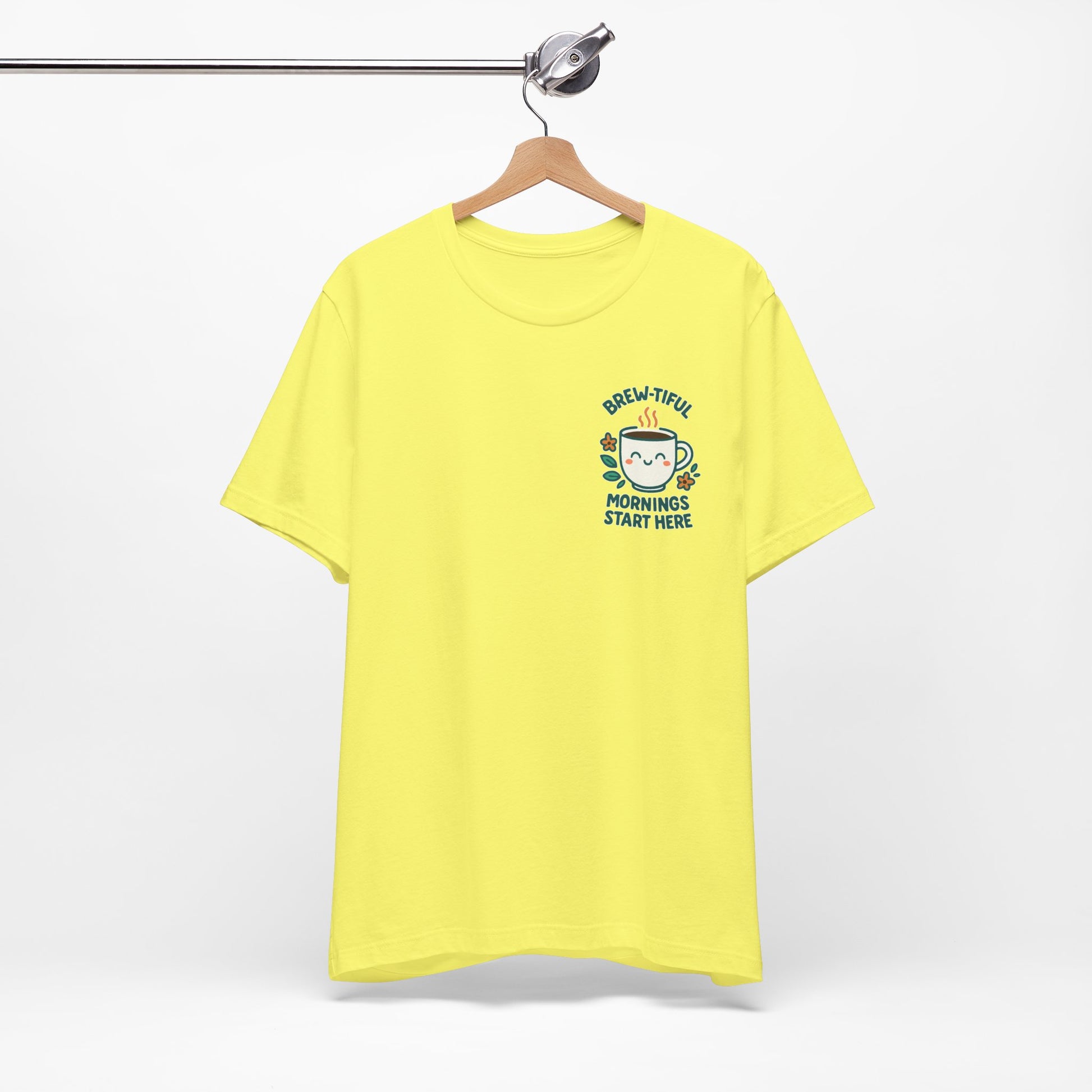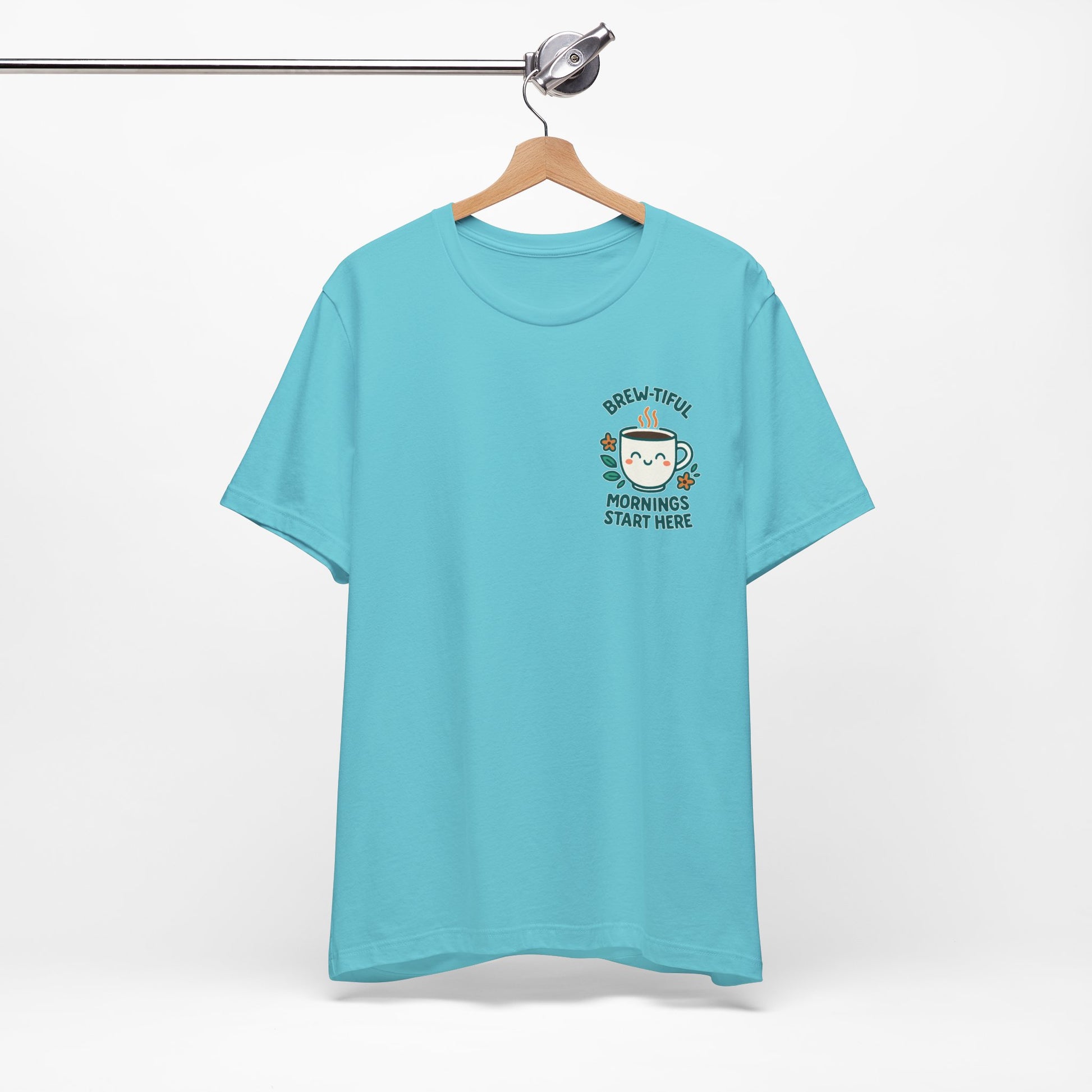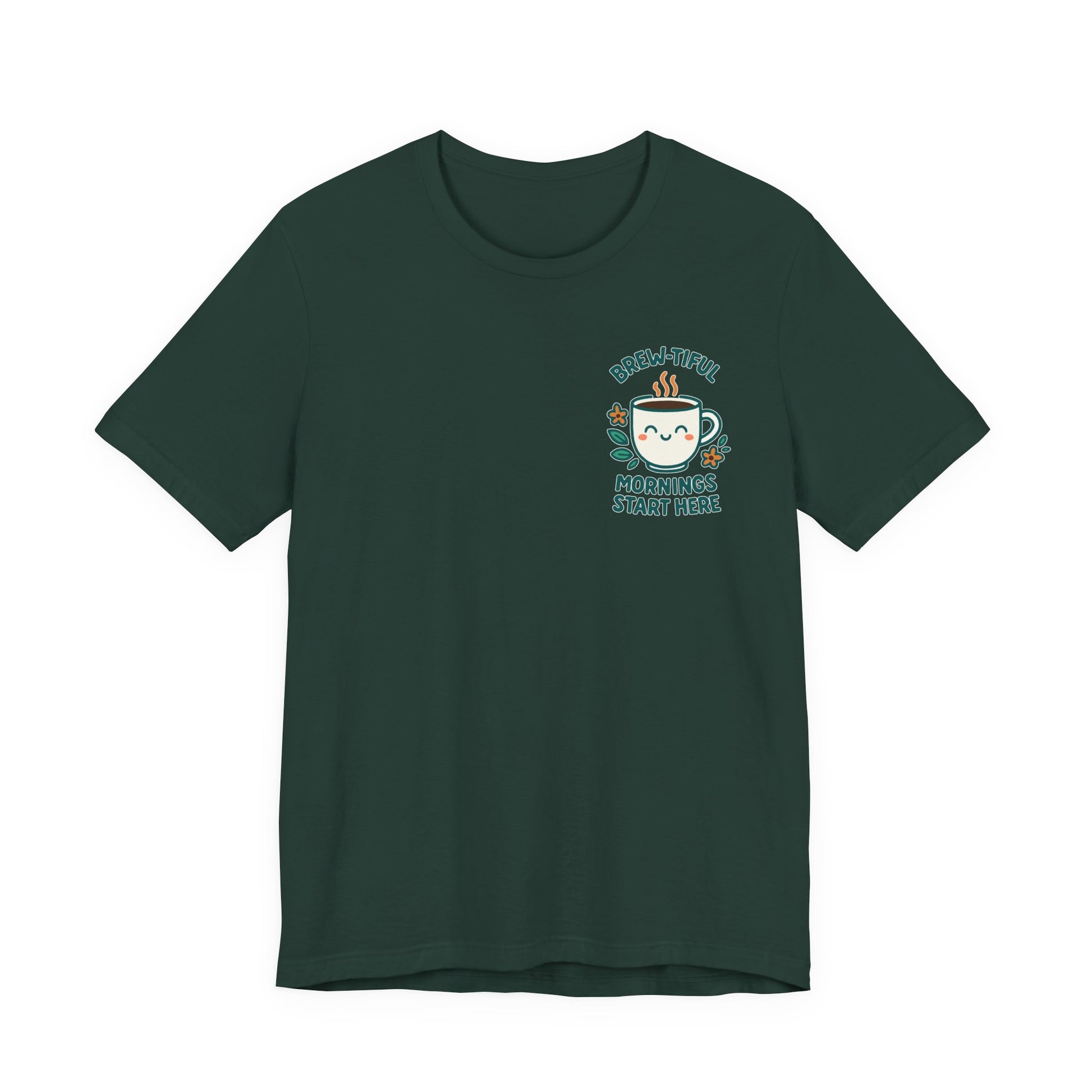 Cute Coffee Lover T-Shirt, Brew-tiful Mornings Start Here Tee, Perfect for Baristas, Gift for Coffee Enthusiasts, Cozy Everyday Wear