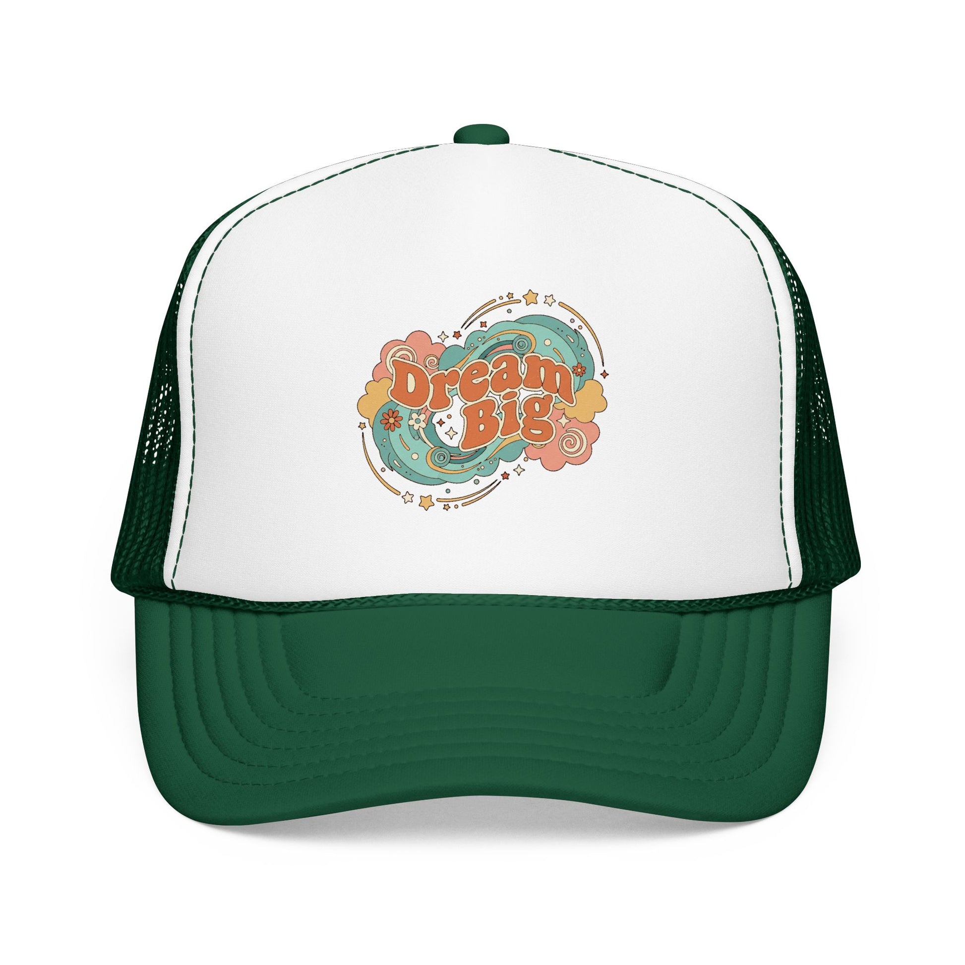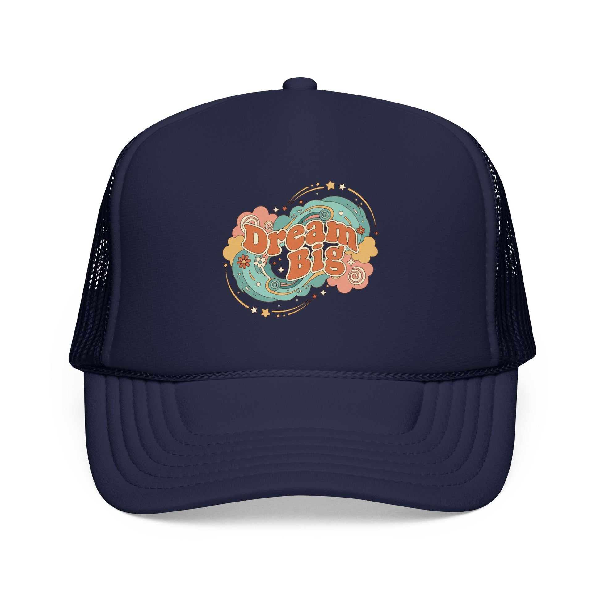 This structured foam trucker hat brings a laid-back, vintage vibe to everyday wear. The high-profile, seamless foam front showcases a colorful, retro-inspired “Dream Big” graphic surrounded by swirling stars and florals — a nod to free spirits who still chase plans and daydreams. The pre-curved visor and thick, laminated front give the cap a sturdy silhouette that holds its shape, while the mesh back keeps things breezy when the sun is up. Wear it driving to a weekend market, while sketching by a lakeside, or pairing it with a worn denim jacket for a relaxed, optimistic look.
