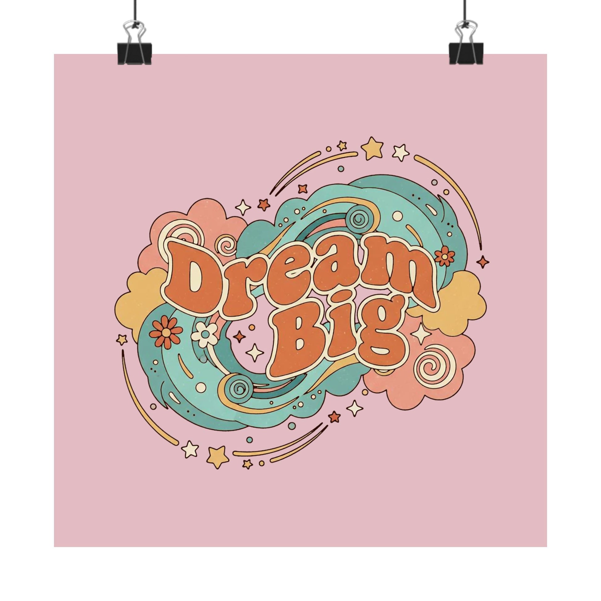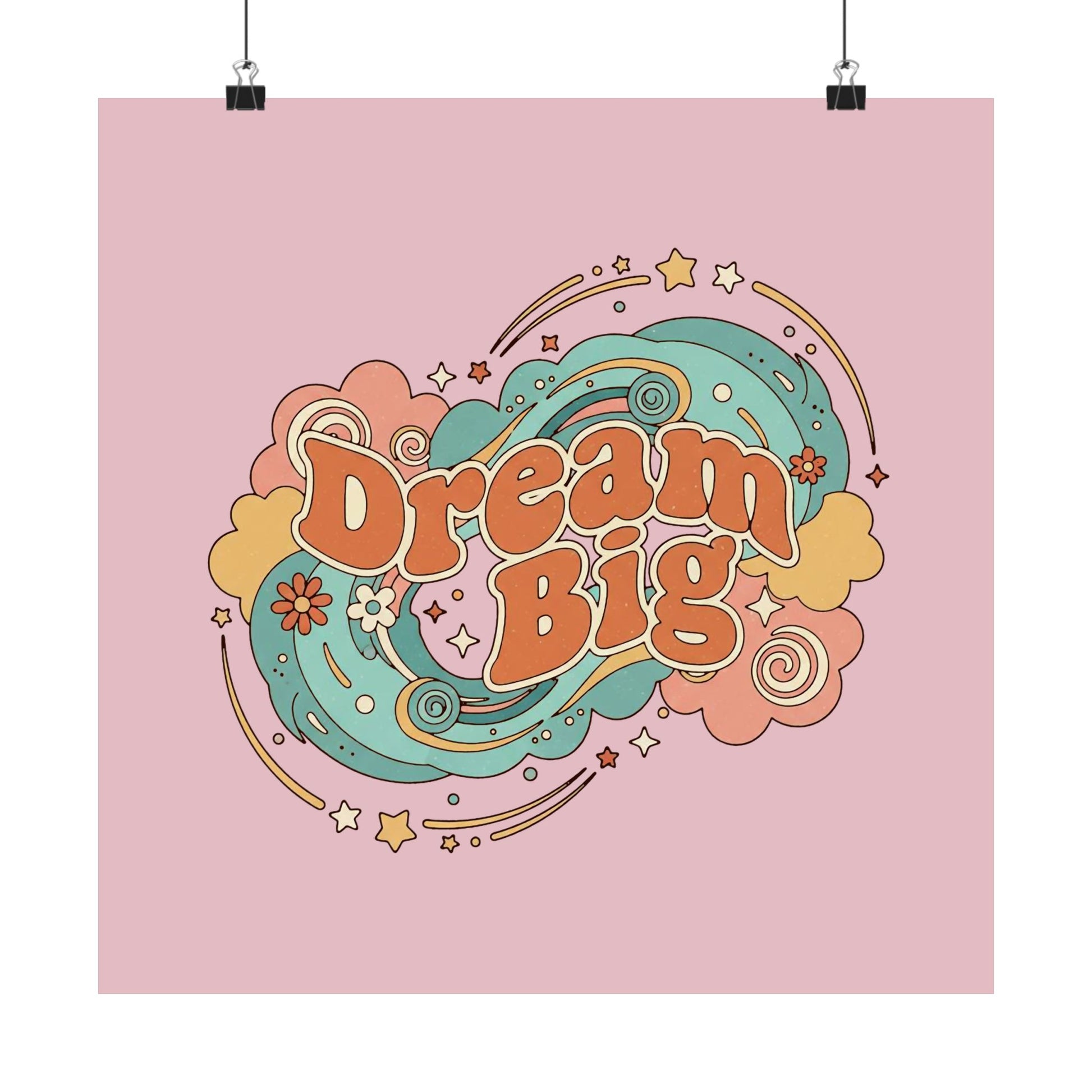 A soft, vintage-inspired poster that whispers retro optimism. Muted pink, teal and warm orange swirl together in a playful, 70s-style design that reads “Dream Big.” The matte, museum-grade paper gives the colors depth without glare, so the illustration feels like a well-loved find on a cozy bedroom wall or a sunlit creative studio. It’s the kind of piece that nudges quiet ambition—hang it above a desk, lean it on a shelf, or group it with other prints to build a space that encourages dreaming and slow, focused work.