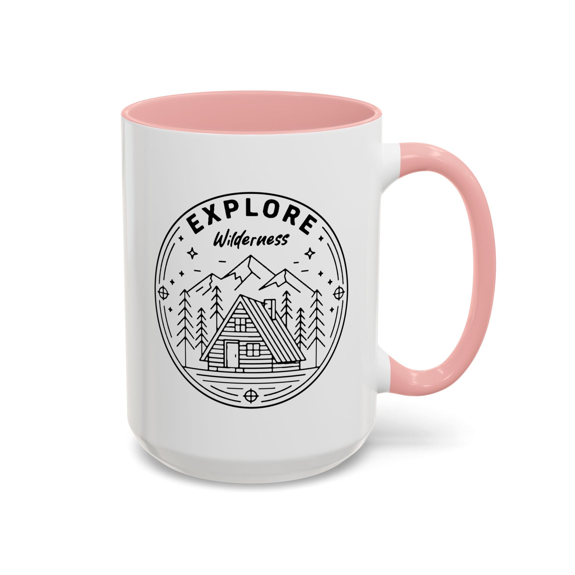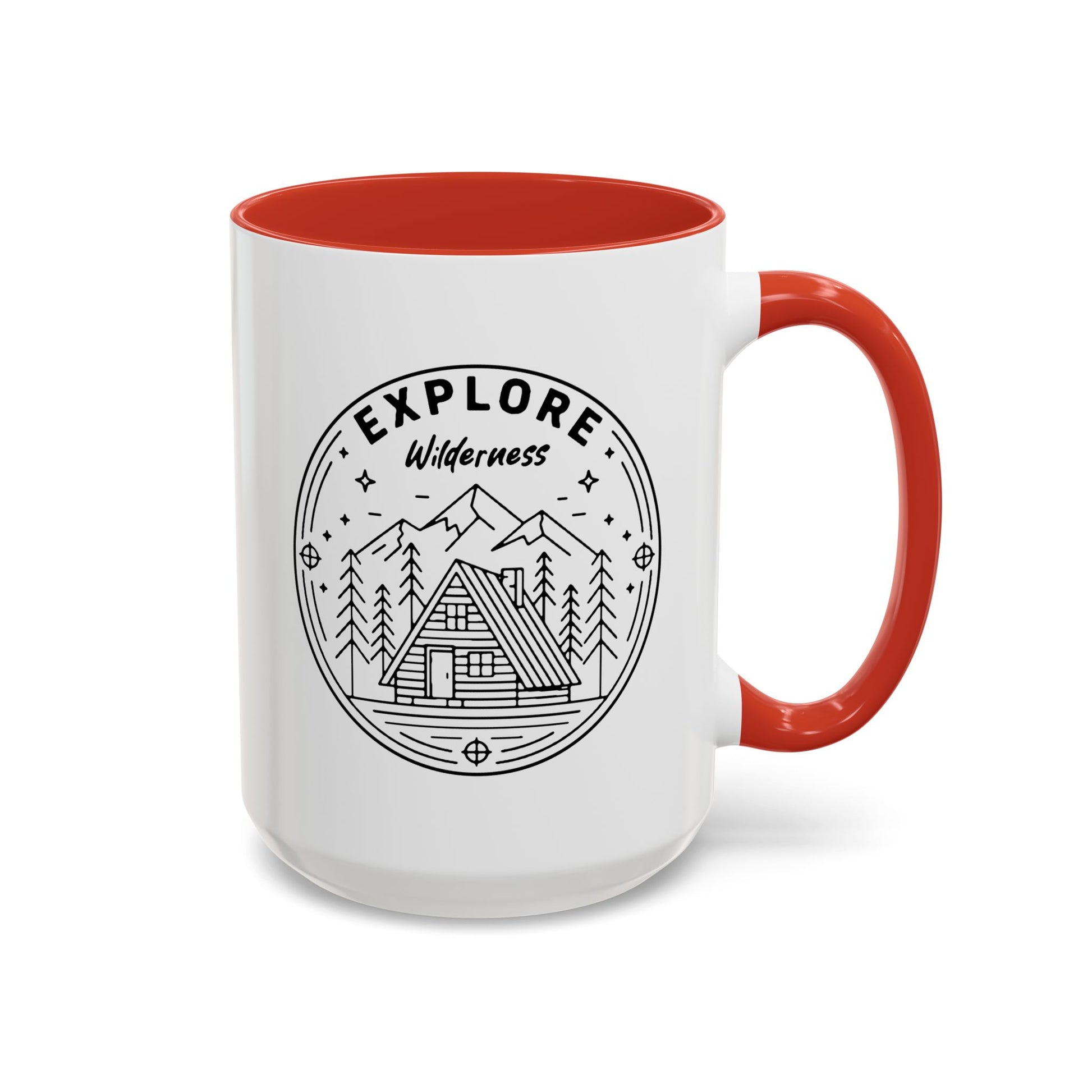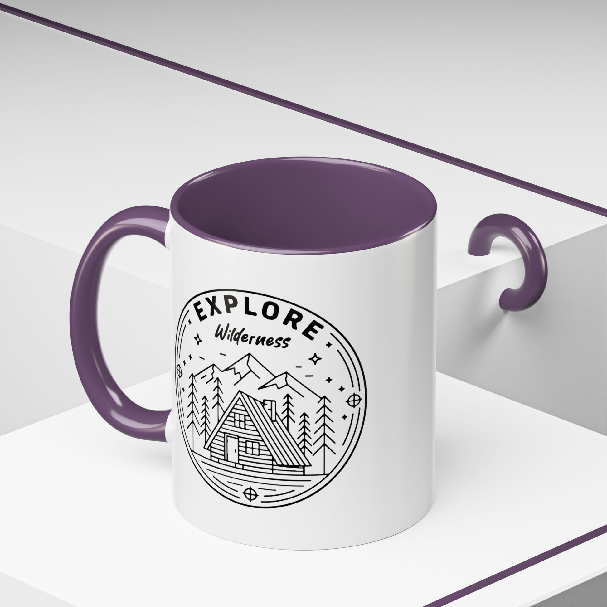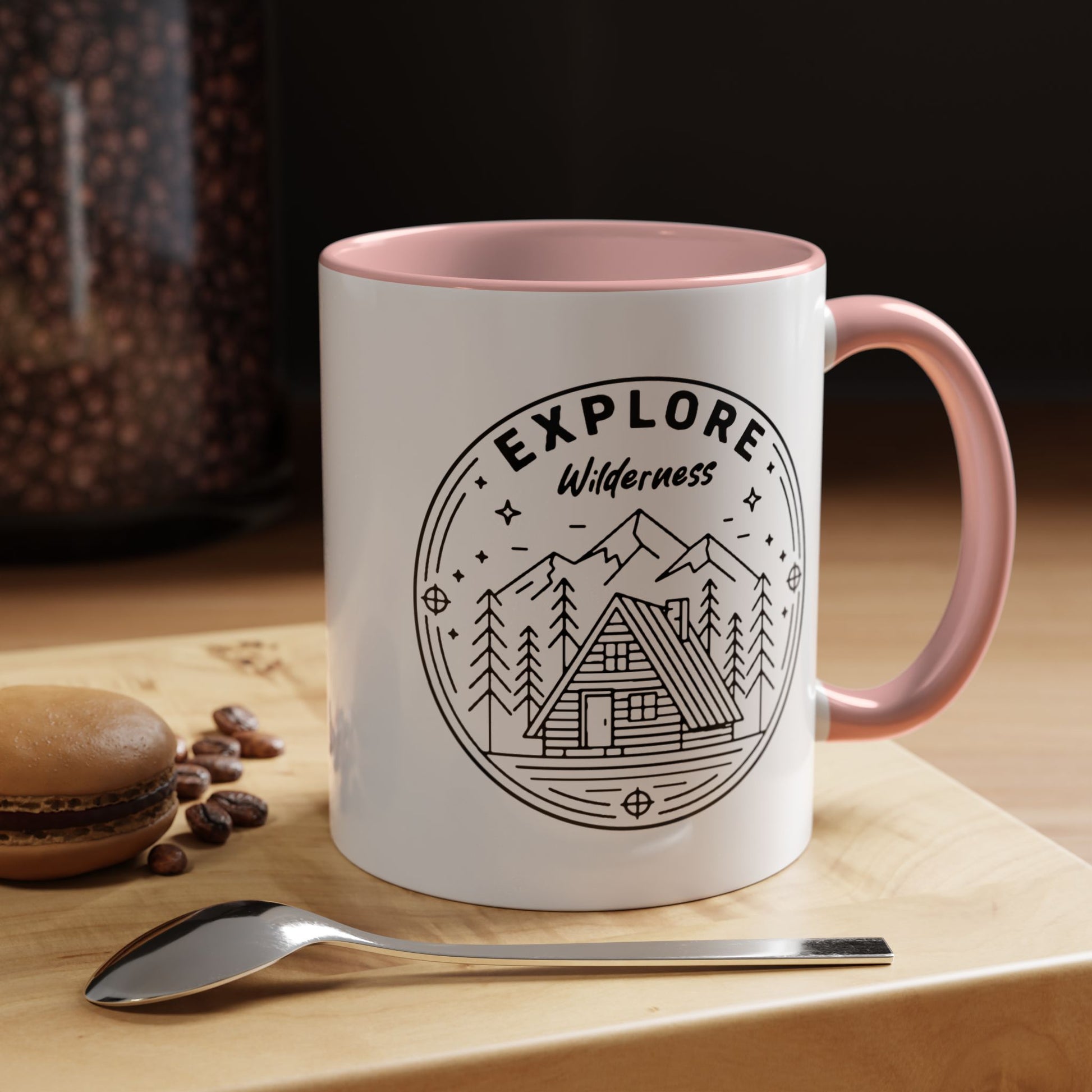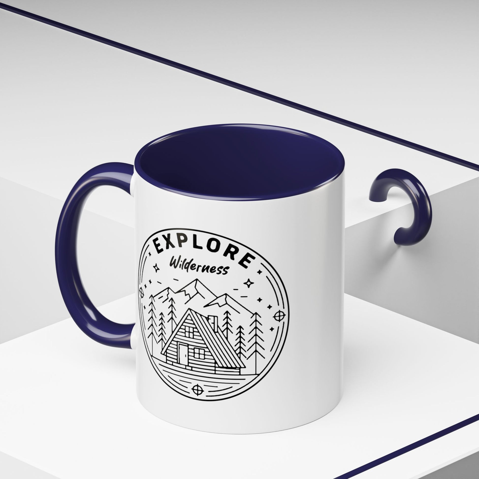 Hold a quiet morning in your hands. This ceramic mug pairs a crisp black-accent interior and handle with a line-drawn mountain cabin emblem that reads “Explore Wilderness.” It feels like the first sip after a sunrise hike — warm, steady, and quietly adventurous. Use it while mapping routes, journaling plans, or settling into a slow weekend at home. The clean monochrome art and bold color contrast make the design pop without shouting, so it fits into a camper’s kitchen, a home office with travel maps, or a cozy cabin shelf.