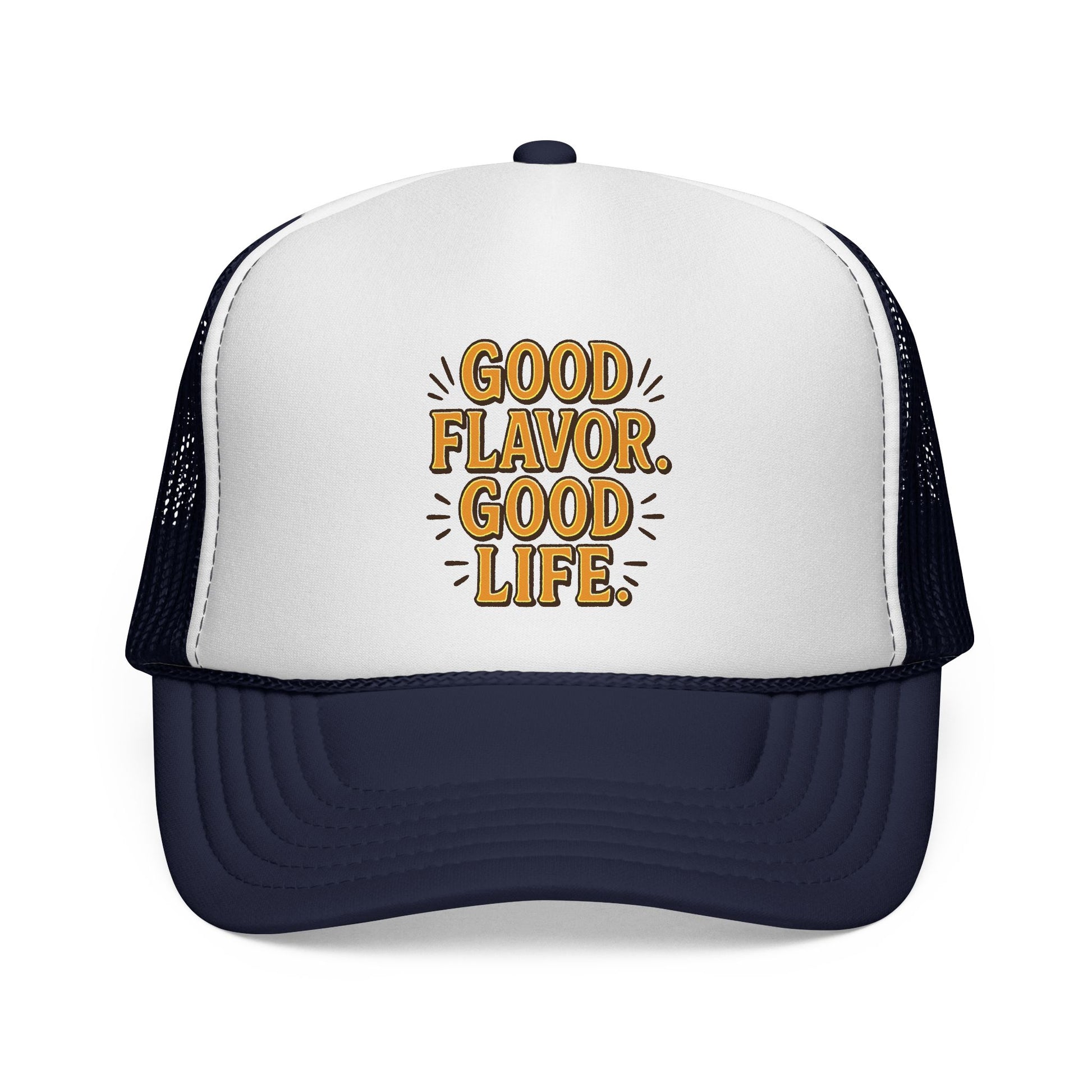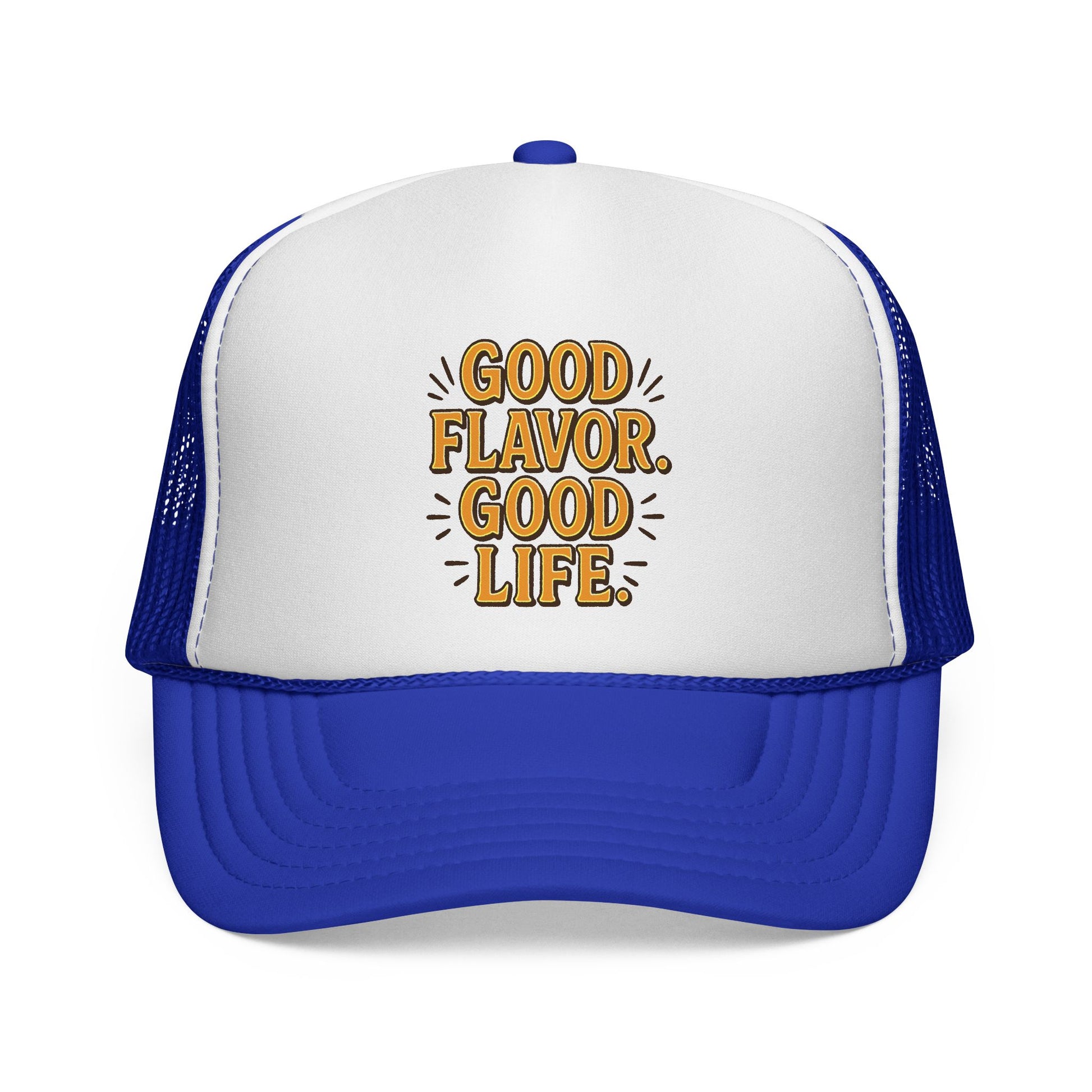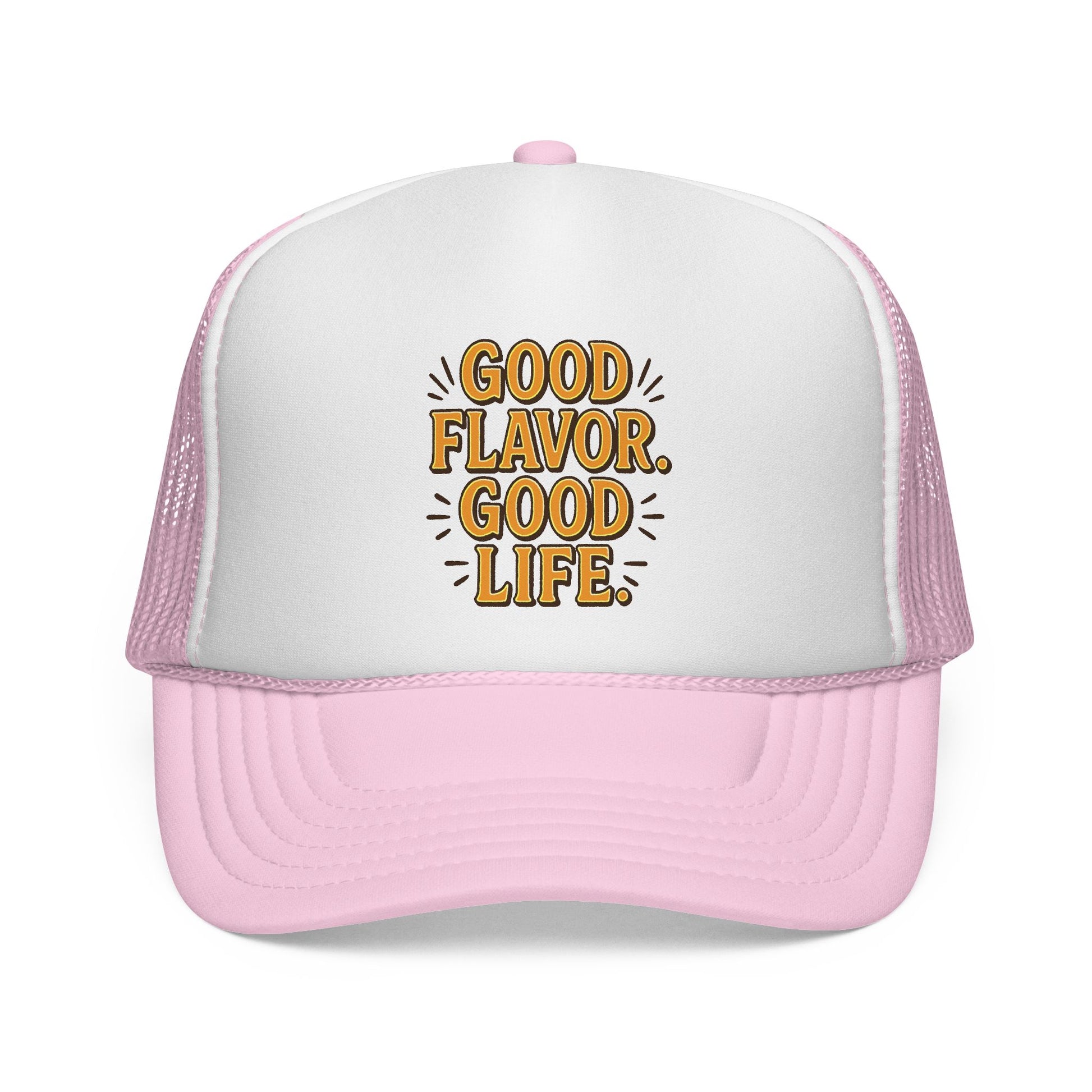This structured, colorful trucker cap brings a sunny, food-loving vibe to your everyday wear. The foam-front and mesh-back silhouette keeps things airy, while the bold embroidered message—“Good Flavor, Good Life”—makes a cheerful statement. Wear it to weekend food markets, backyard cookouts, or while running errands; the adjustable snap ensures a comfortable fit as the cap molds to your routine. The dye-matched details and crisp printing hold their punch, so the hat looks fresh after many wears. It’s light, breathable, and built for people who live around flavor—chefs, food truck regulars, grill masters, and fans of bright, lively style.