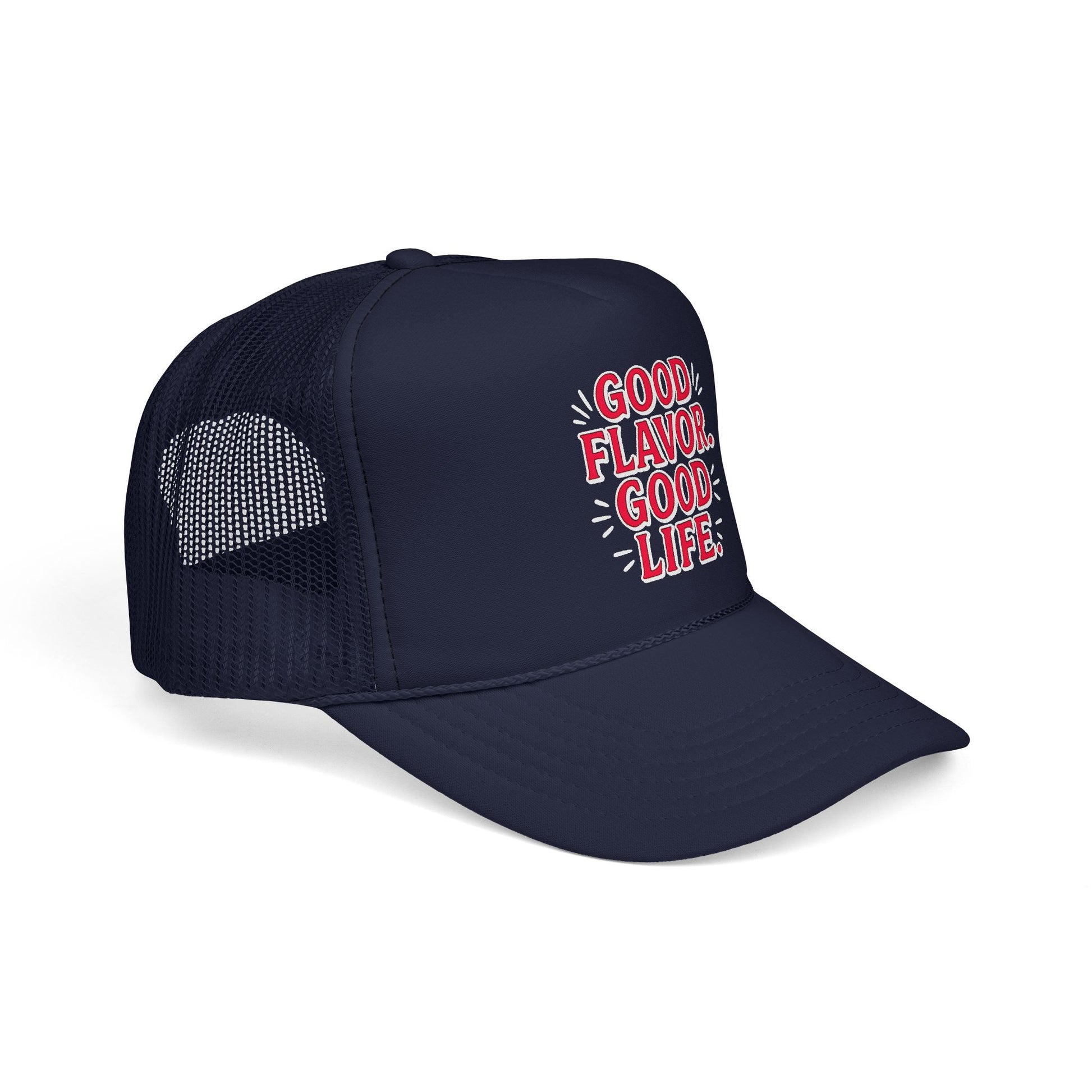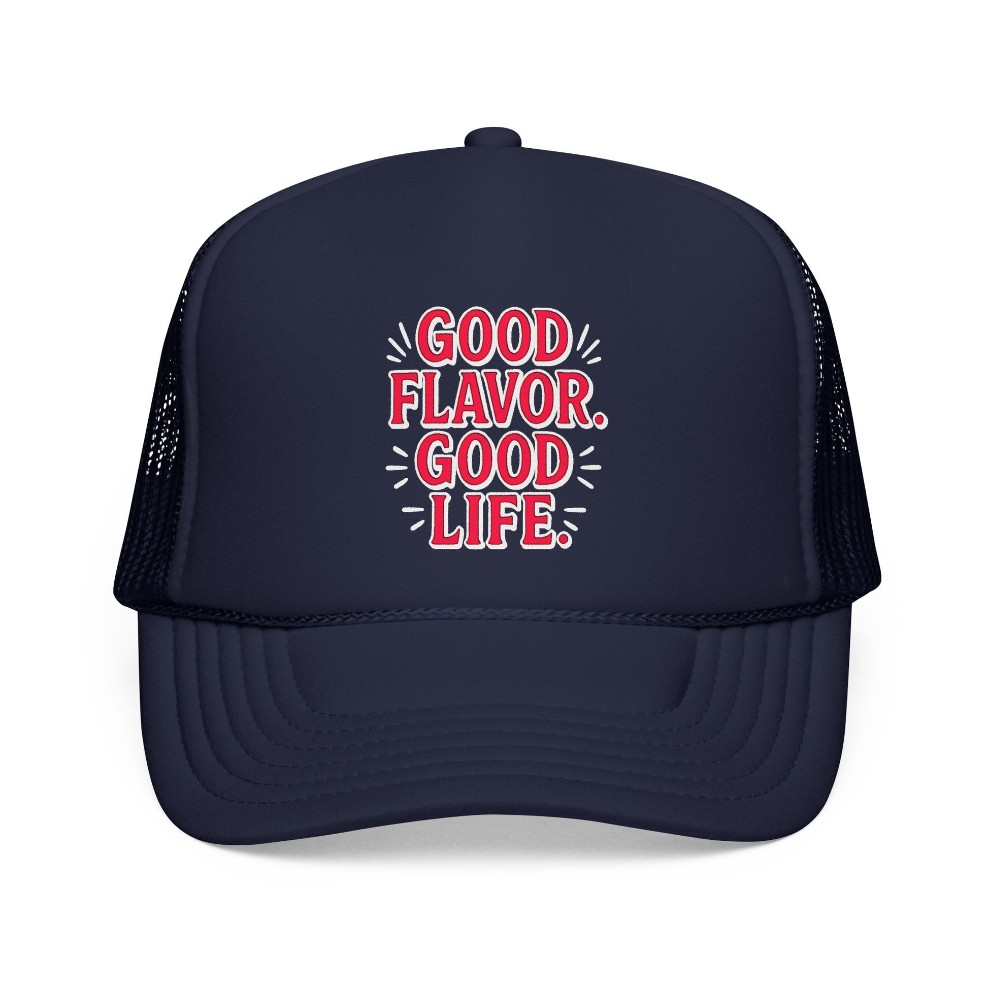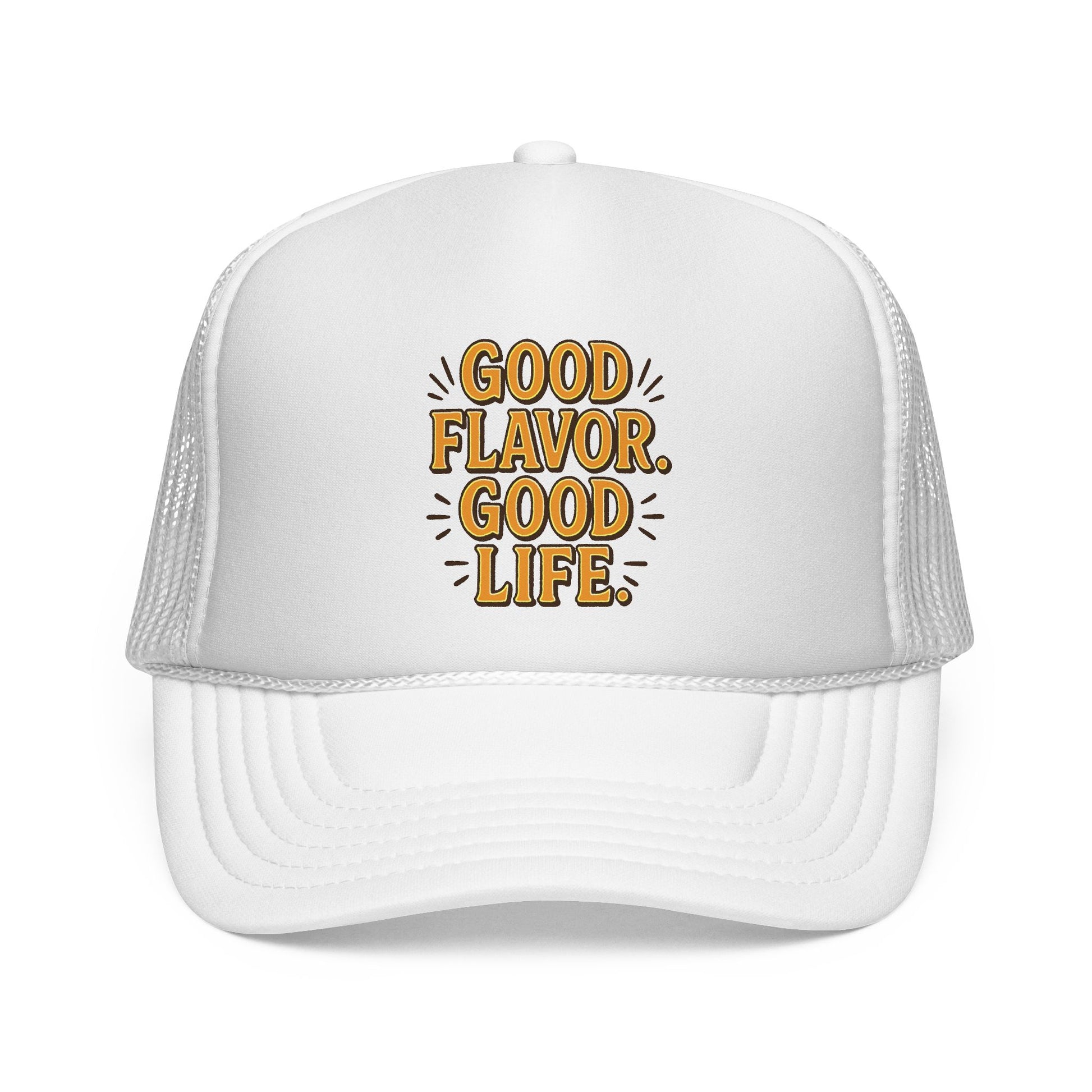 This structured, colorful trucker cap brings a sunny, food-loving vibe to your everyday wear. The foam-front and mesh-back silhouette keeps things airy, while the bold embroidered message—“Good Flavor, Good Life”—makes a cheerful statement. Wear it to weekend food markets, backyard cookouts, or while running errands; the adjustable snap ensures a comfortable fit as the cap molds to your routine. The dye-matched details and crisp printing hold their punch, so the hat looks fresh after many wears. It’s light, breathable, and built for people who live around flavor—chefs, food truck regulars, grill masters, and fans of bright, lively style.
