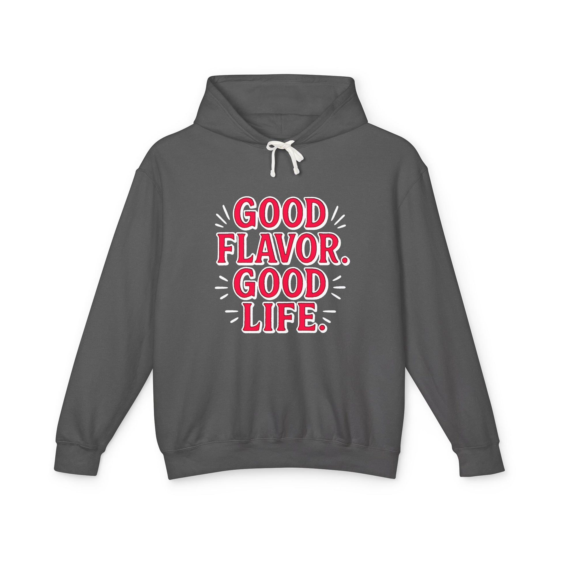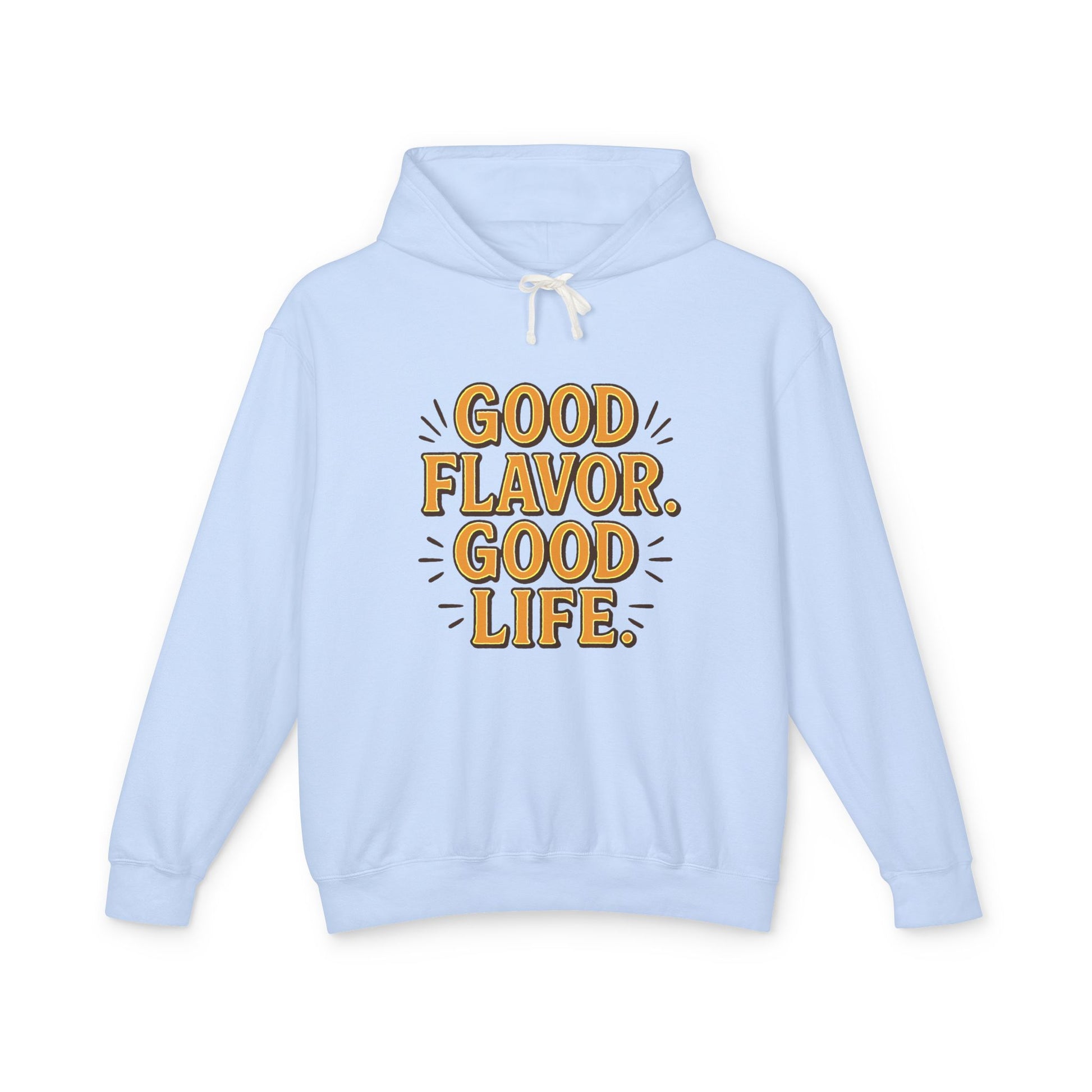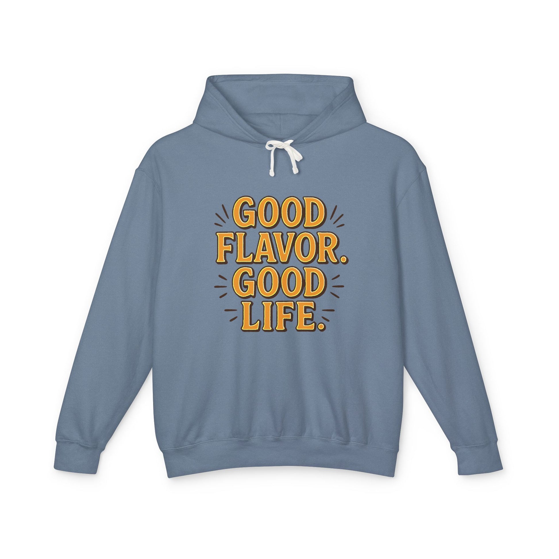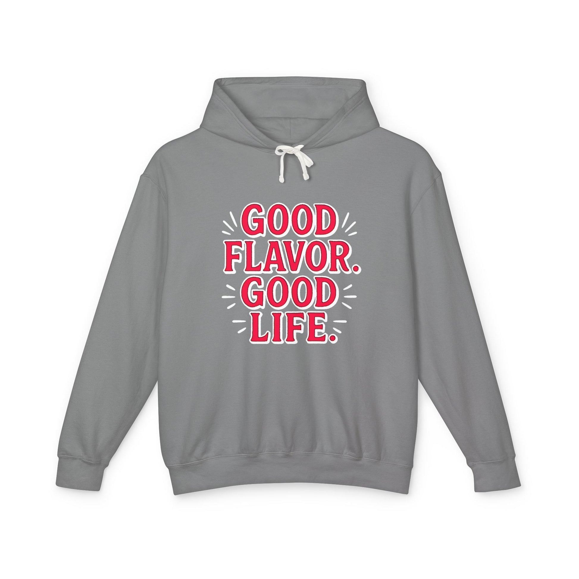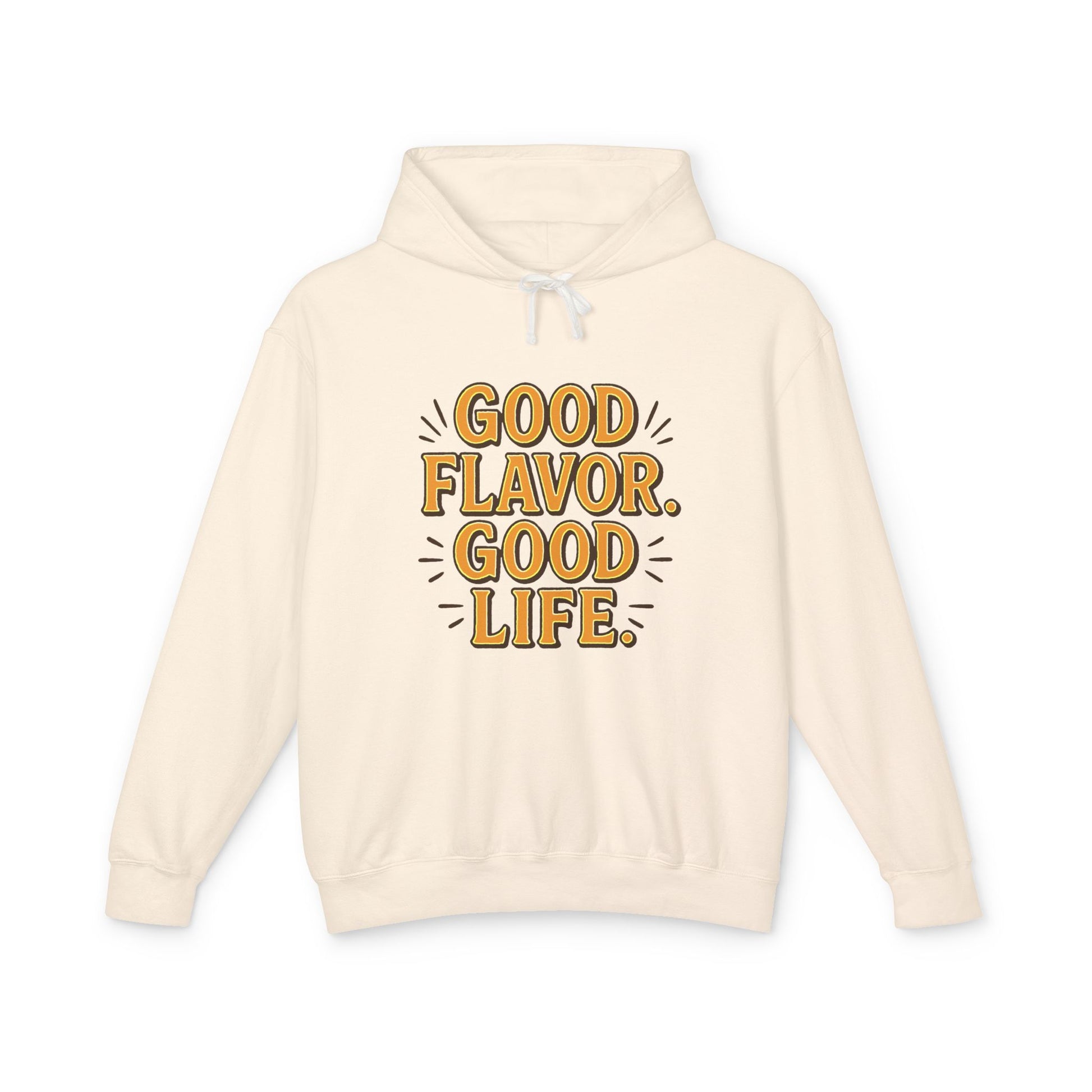 Warm, easygoing, and a little nostalgic—this lightweight hooded sweatshirt wraps you in calm and confidence. The sun-washed cream fabric and hand-lettered “GOOD FLAVOR. GOOD LIFE.” artwork bring a vintage snack‑shop vibe that reads like a personal mantra. Wear it on slow mornings with coffee, at evening farmers’ markets, or layered over a tee for casual hangouts. The relaxed cut and soft jersey-lined hood move with you, so it feels like something you’ve owned for years the moment you pull it on. Sustainability details—US-grown ring-spun cotton and OEKO‑TEX low‑impact dyes—keep the piece feeling honest and grounded.