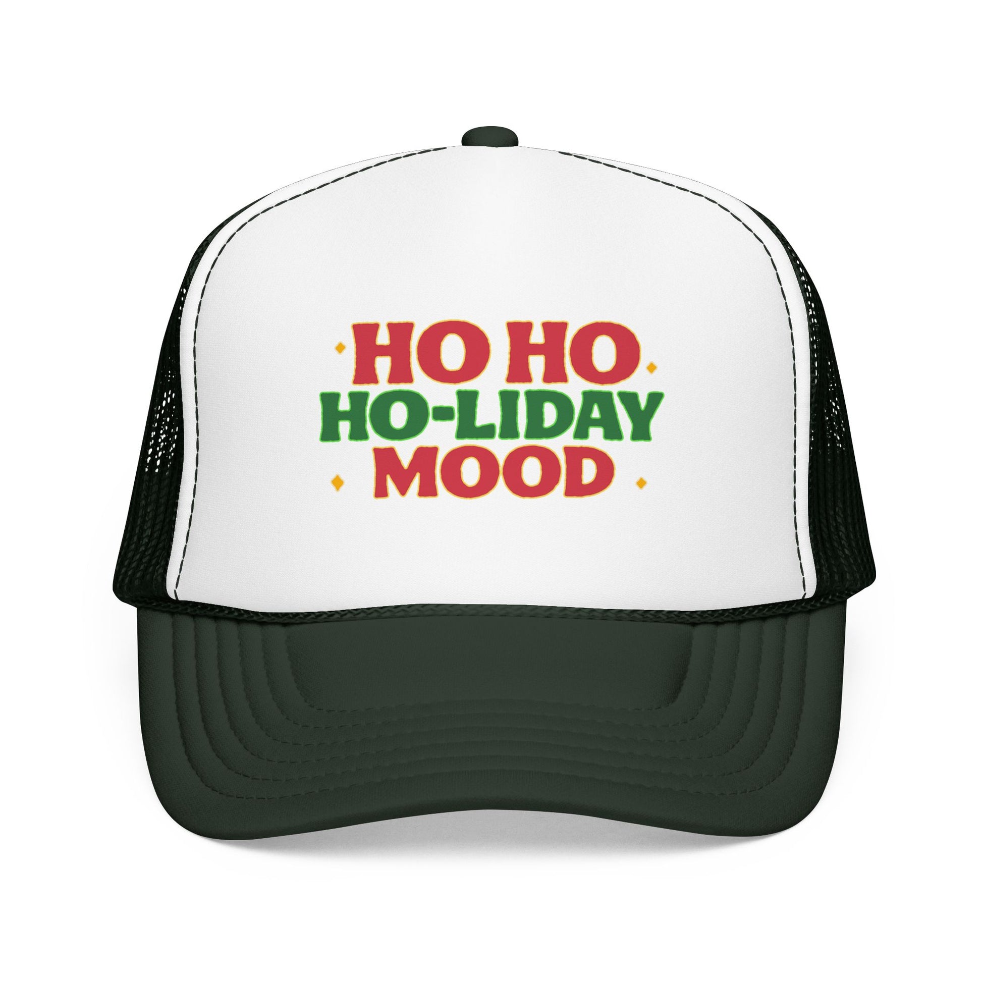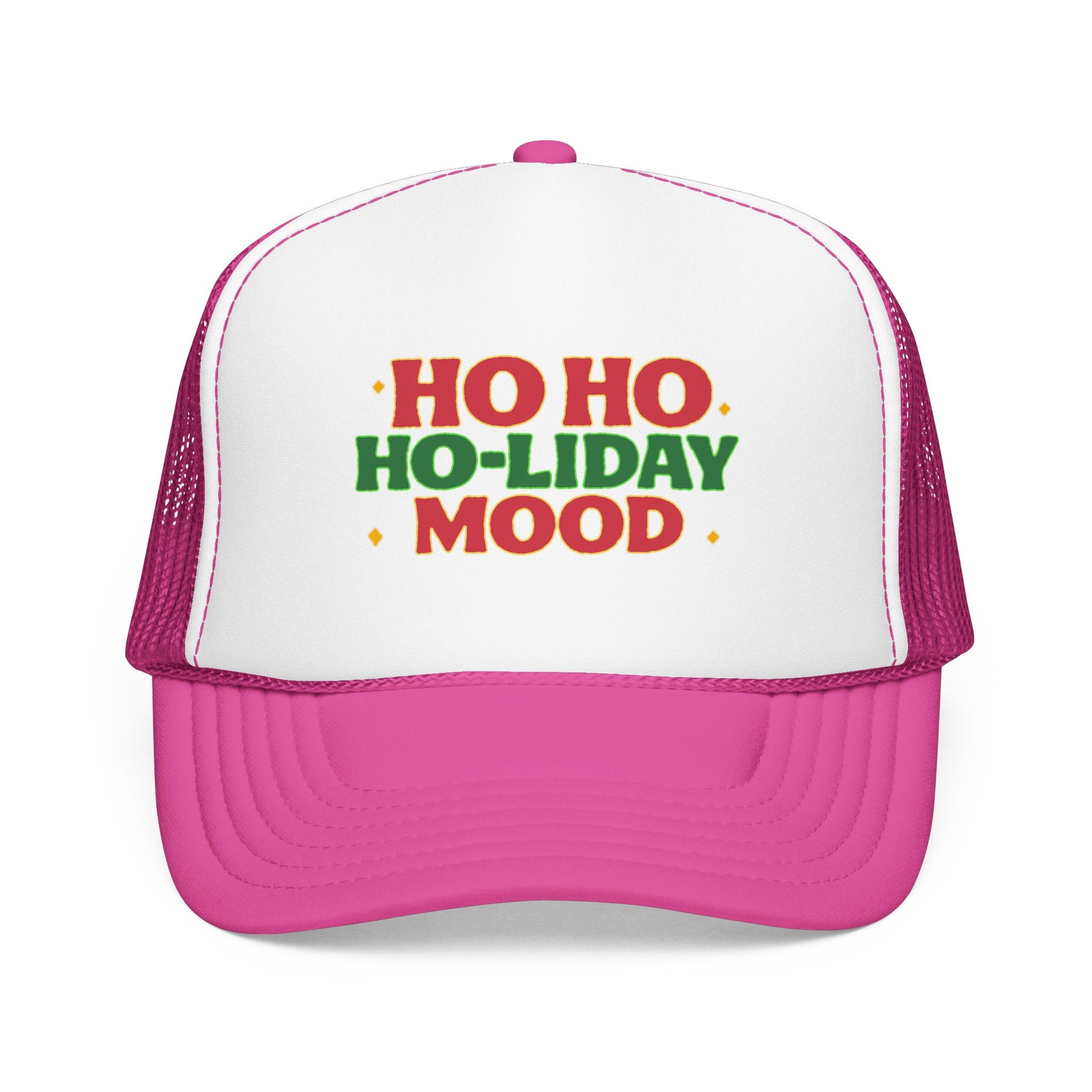Share a lighthearted holiday vibe with this foam trucker hat that sparks smiles at every gathering. The seamless foam front showcases bold, retro-inspired lettering in festive red and green: “HO HO HO-LIDAY MOOD.” The structured, high-profile silhouette and pre-curved visor hold their shape, while the breathable mesh back keeps things cool during outdoor winter markets, caroling, or last-minute gift runs. It slips on easily with the adjustable snap and sits comfortably thanks to a lined front panel and soft sweatband. Wear it to add a playful, nostalgic twist to cozy seasonal outfits or to signal your cheerful mood at tree lightings and family gatherings.