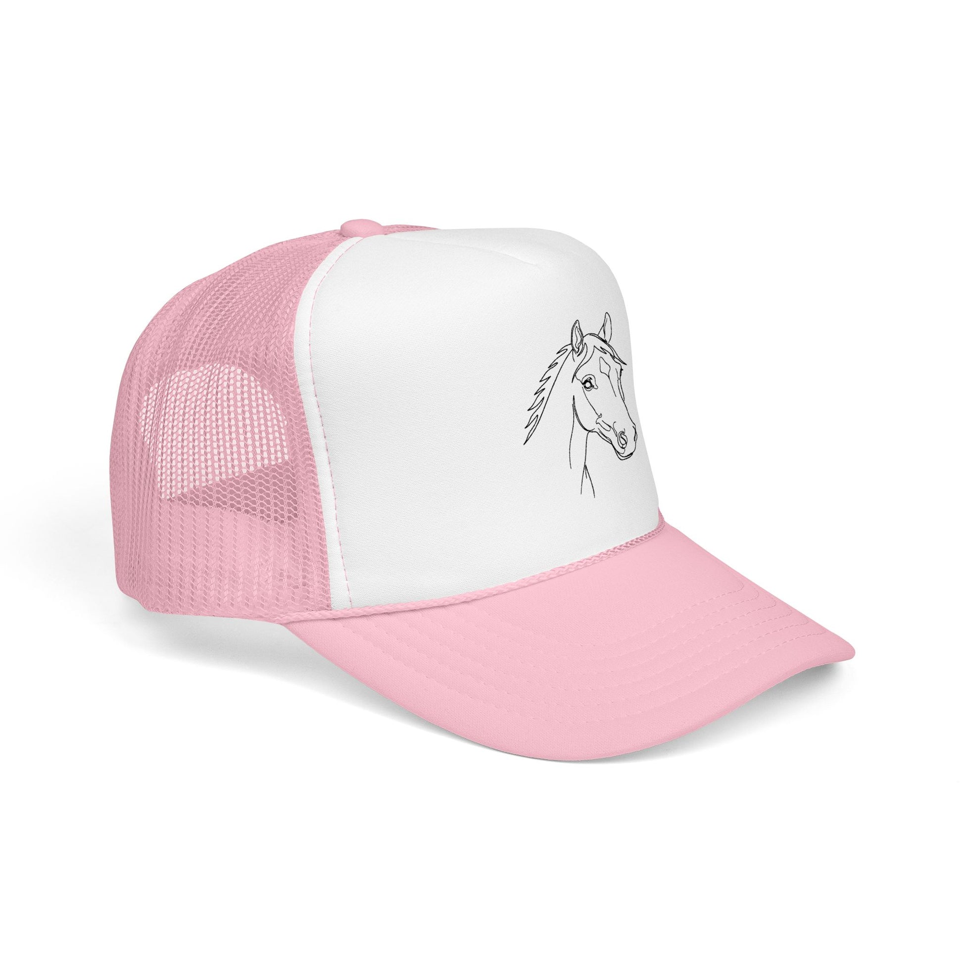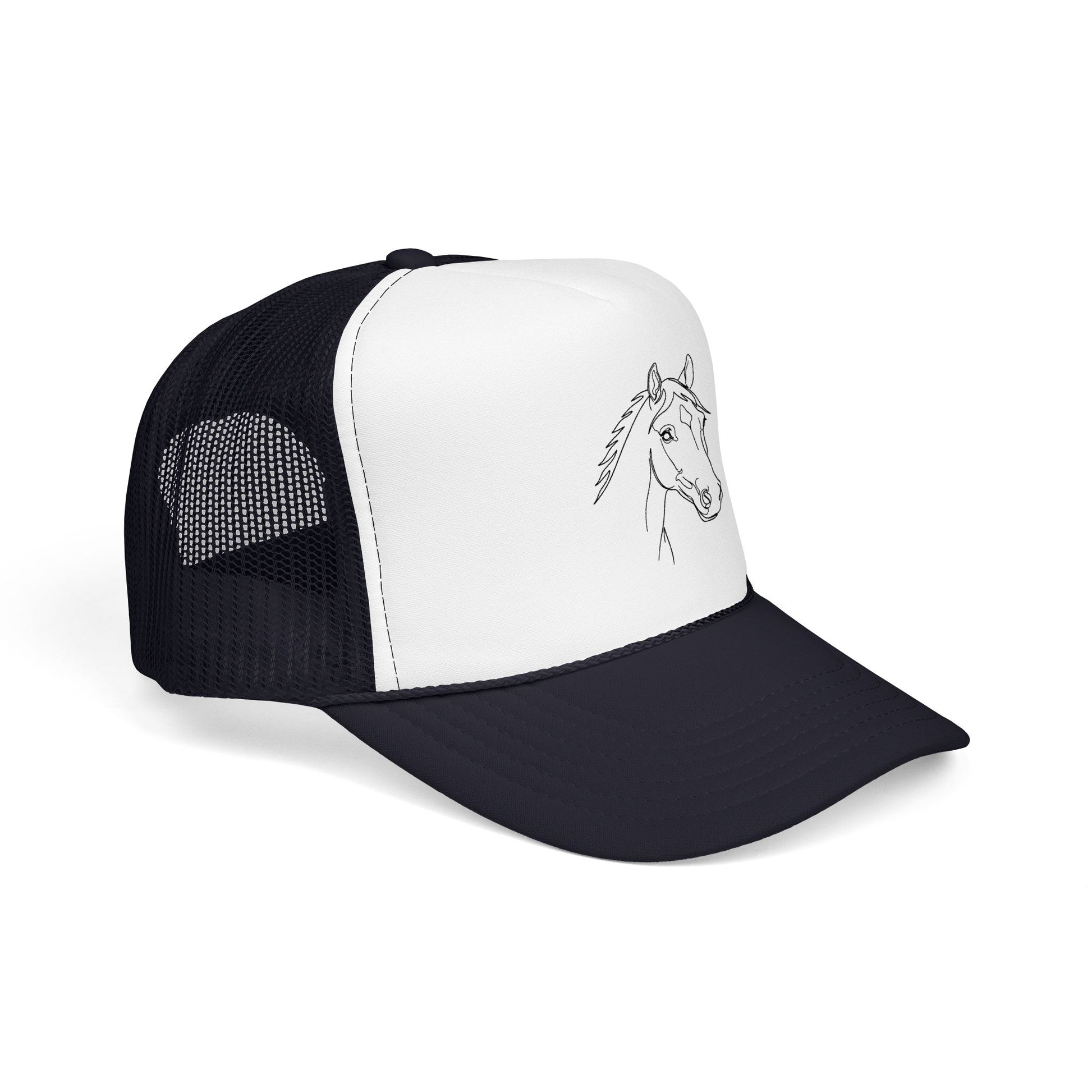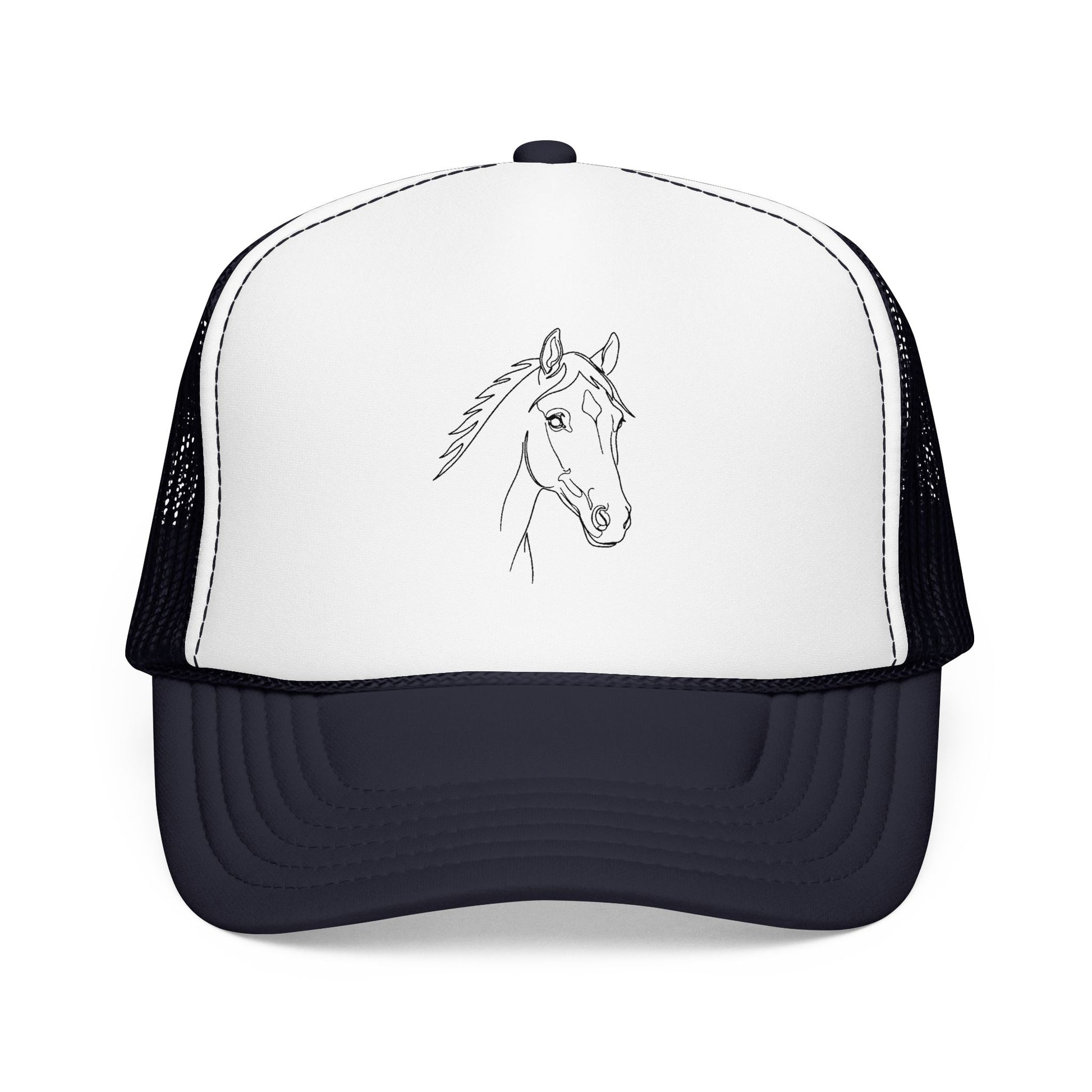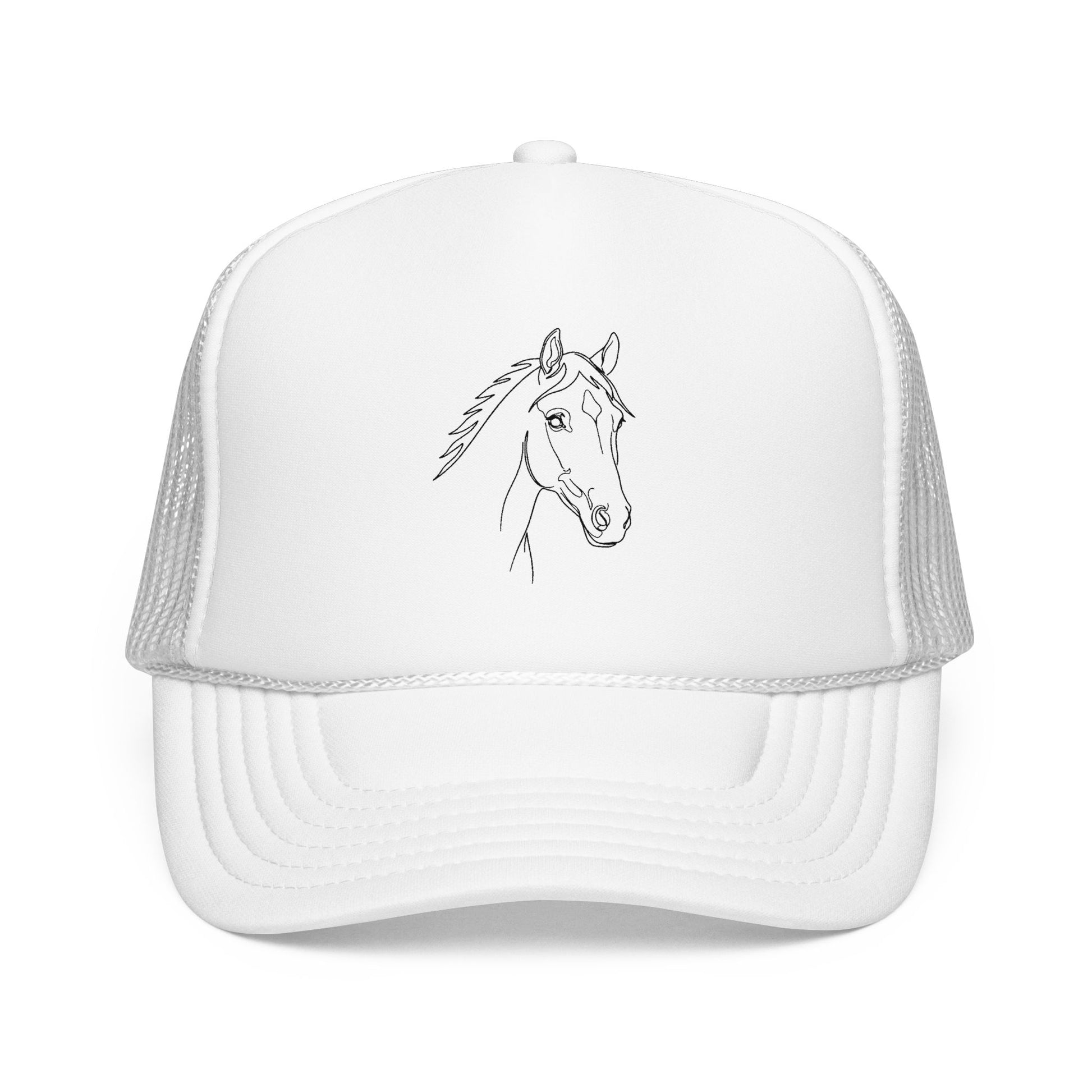 A structured foam trucker hat with a simple, hand-drawn horse head. The high-profile, seamless foam front gives the design a clean, gallery-like presence, while the breathable mesh back keeps the hat comfortable on long rides, trail days, or weekend errands. The pre-curved visor, matching undervisor, and braided trim add subtle classic trucker details, and the adjustable snapback lets this one-size cap move easily from stable chores to coffee stops. Worn low over sun or wind, it reads like a quiet nod to somebody who lives for horses—the rhythm of the barn, the dirt under boots, the calm of an early morning ride.