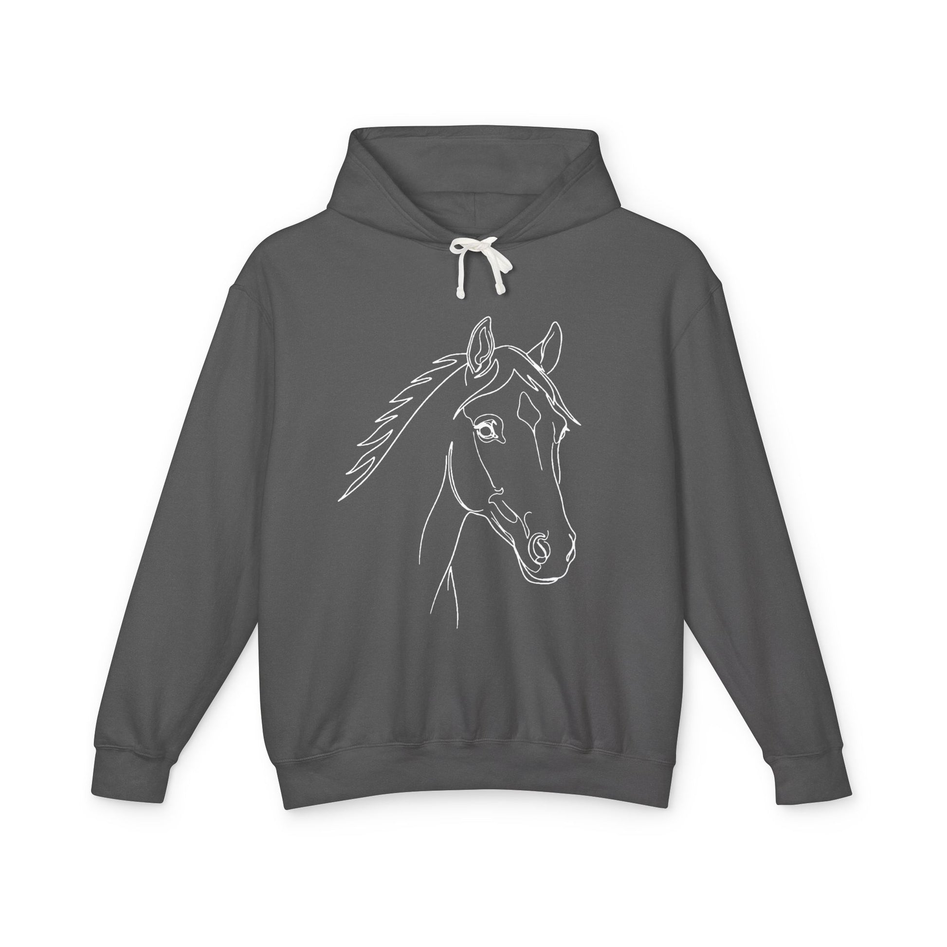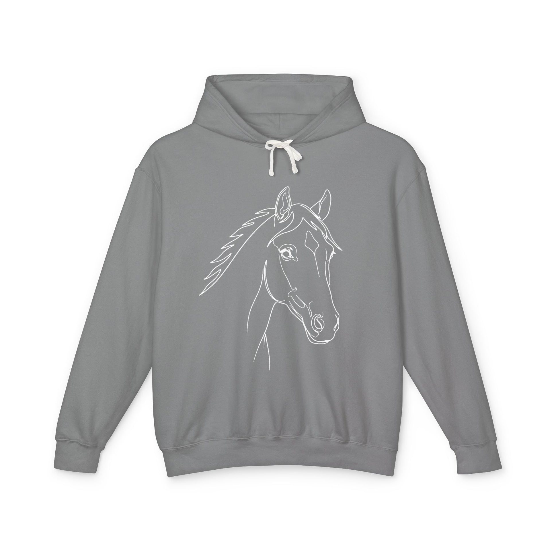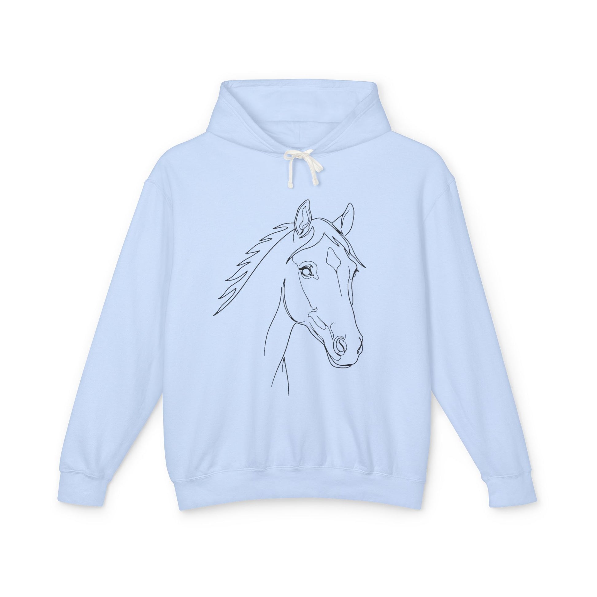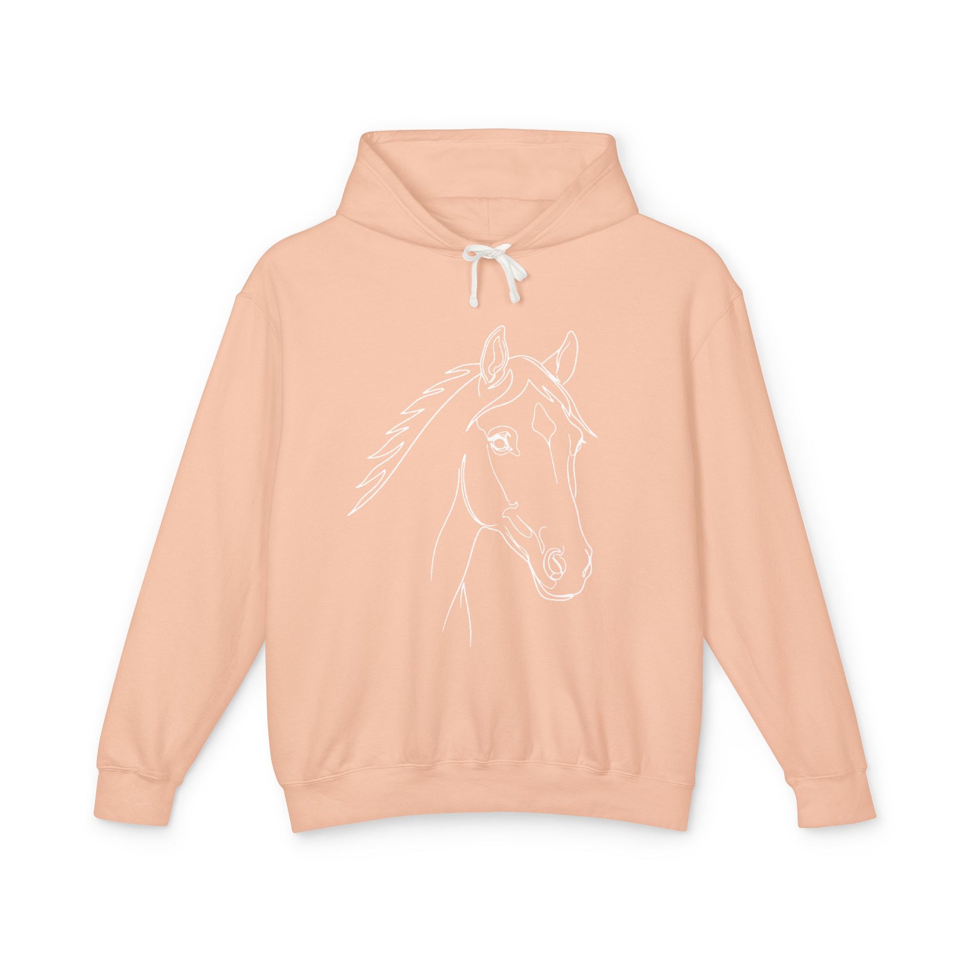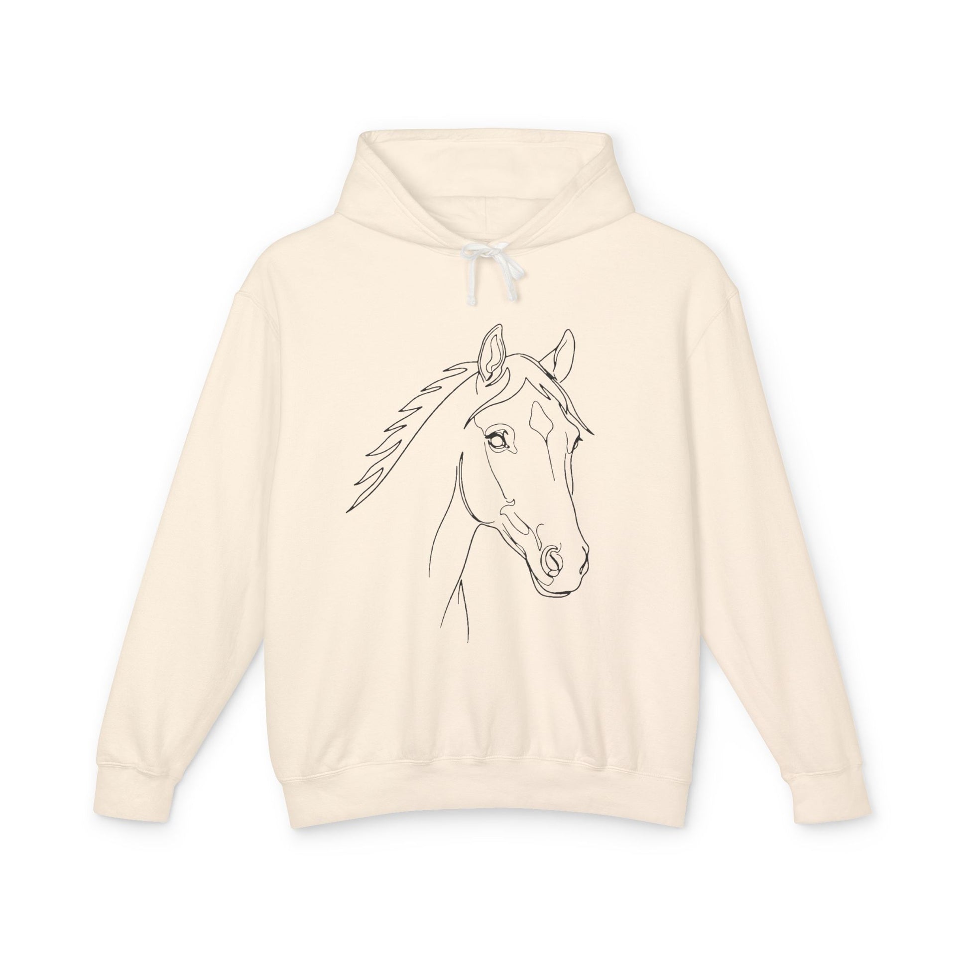 A soft, lightweight hooded sweatshirt that feels like a quiet morning in the stables. The gentle cream fabric carries a delicate, single-line horse portrait across the chest—simple, thoughtful, and quietly expressive. It drapes with a relaxed fit, the jersey-lined hood and natural flat cord adding subtle, artisanal details. Wear it on cool rides to the barn, on slow weekend drives, or layered at the coffee shop while you sketch or plan the next trail. The breathable cotton keeps movement easy, while the low-impact dyes and US Cotton Trust Protocol sourcing make it a mindful choice for riders who care about the land beneath their horse’s hooves.