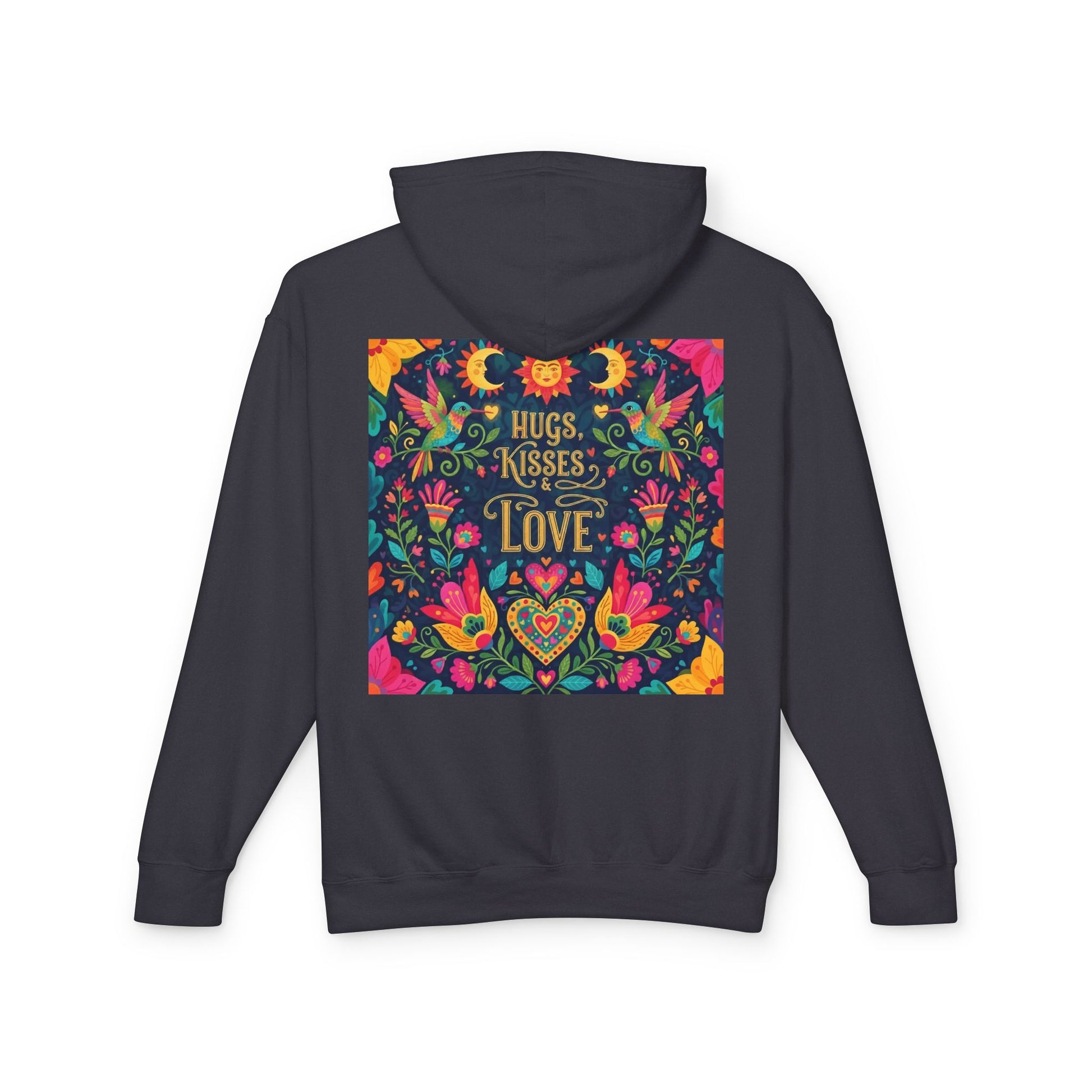 This lightweight hooded sweatshirt brings a burst of color and warmth to quiet evenings and neighborhood strolls. A vibrant, folk-art-inspired square sits at the center—blooming flowers, moons, suns, and hearts surround the hand-lettered phrase “Hugs, Kisses, Love,” creating a cozy, homespun vibe. The relaxed cut and soft ring-spun cotton let you layer it over tees or pull it on after gardening, errands, or a low-key get-together. It feels like a warm compliment you can wear: bright, cheerful, and quietly playful.