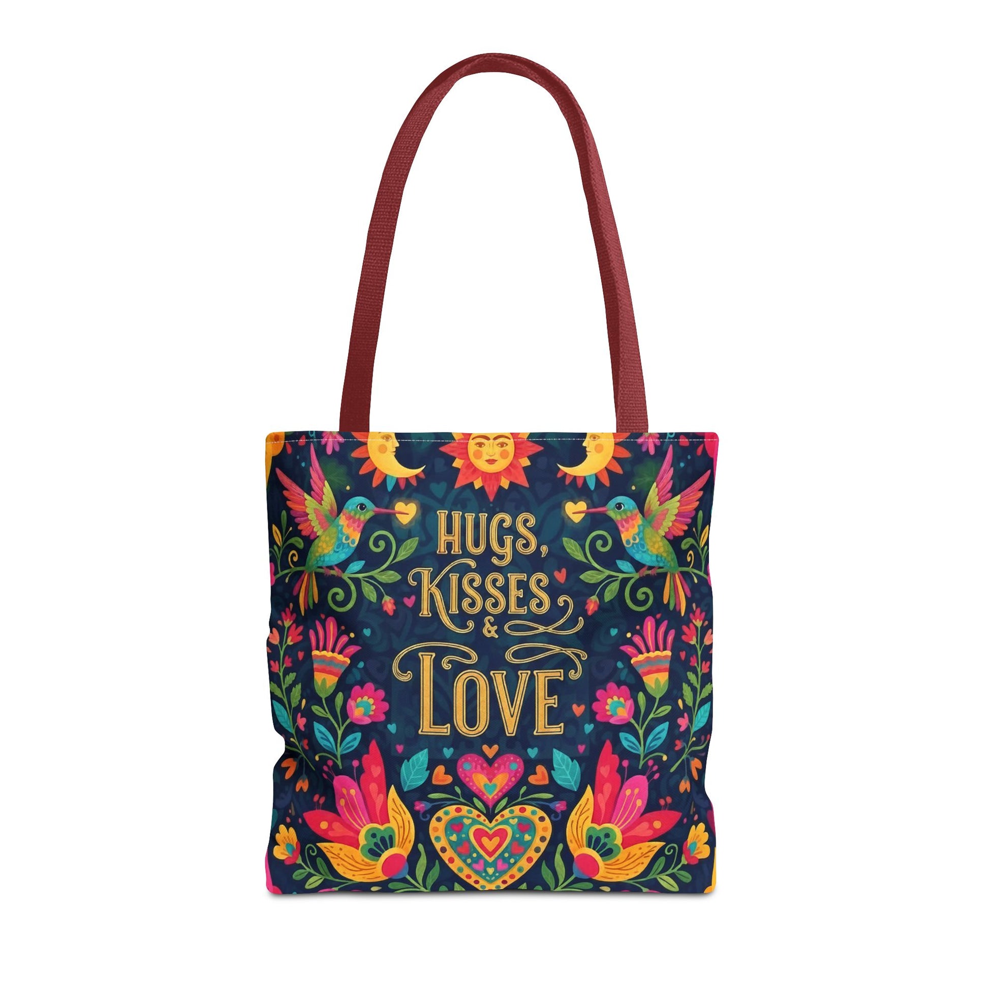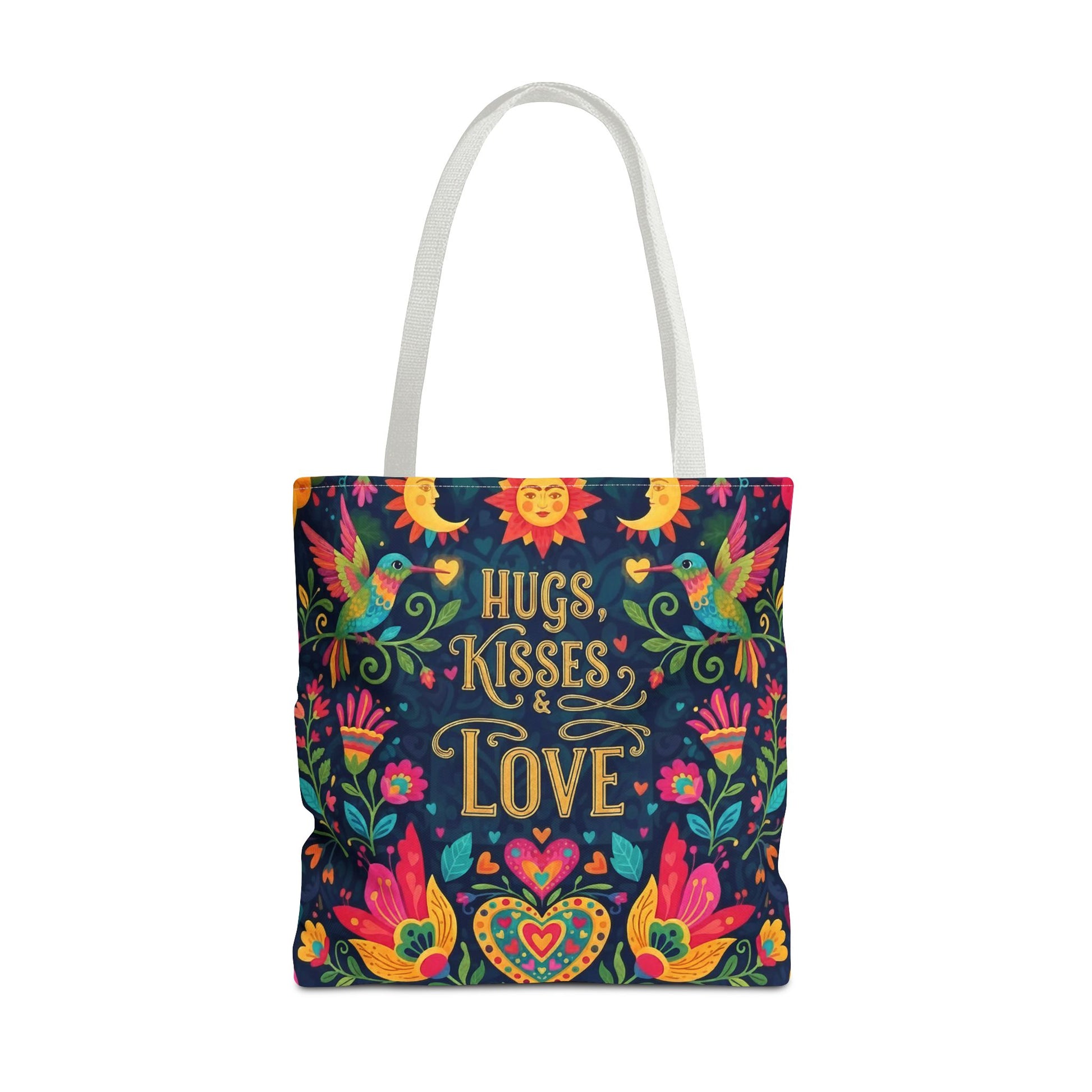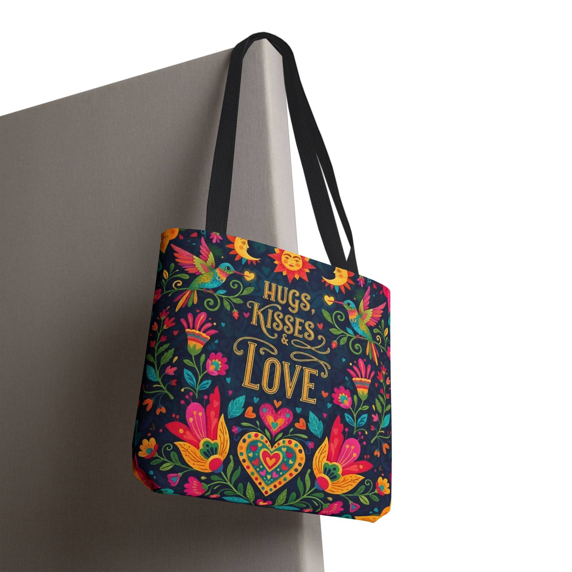 Bright, joyful, and built to carry everything from market finds to daily essentials. This roomy tote brings a folk-art burst of color to errands and outings: a midnight-blue background scattered with suns, hearts, blooming flowers, and playful birds surrounding the phrase “Hugs, Kisses & Love.” The reinforced handles and boxed corners give it structure for heavier loads, while the lightweight polyester body resists moisture and keeps the print vivid. Use it for library runs, weekend markets, or to add a cheerful accent to a casual outfit—this tote travels easily, holds its shape, and keeps the art front and center.