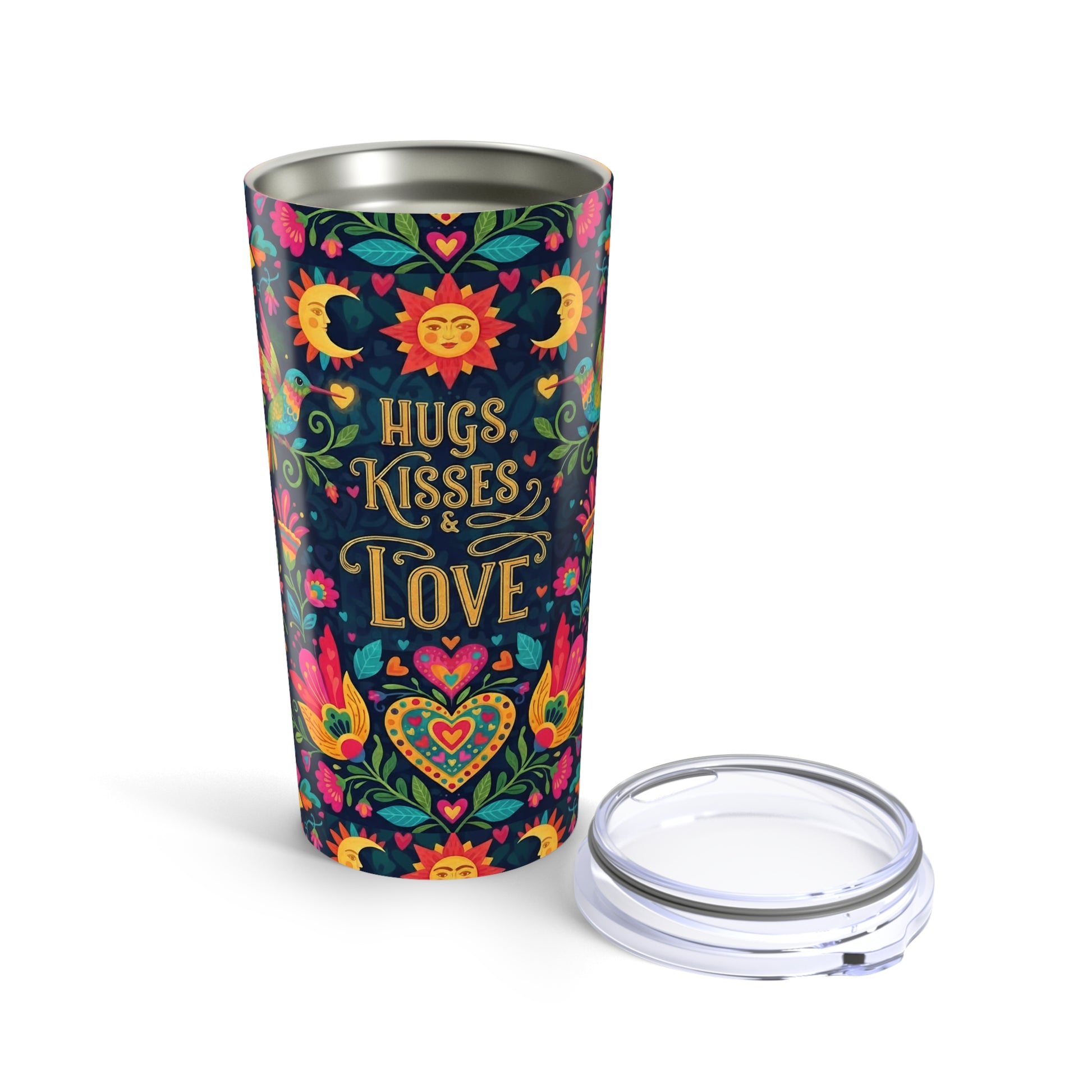 Bright, joyful, and built to go with you everywhere—this 20 oz stainless steel tumbler carries a folk-art garden of color and warmth. Sun motifs, hearts, hummingbirds, and hand-lettered words—Hugs, Kisses & Love—wrap the glossy exterior for a cheerful, cozy vibe. The vacuum-insulated steel core keeps your coffee piping hot on crisp mornings and your iced tea chilled through sunny afternoons. The clear push-on lid with rubber gasket seals in temperature and prevents spills while still letting you sip easily. Lightweight and durable, it’s the kind of tumbler that turns daily routines into little moments of comfort and cheer.