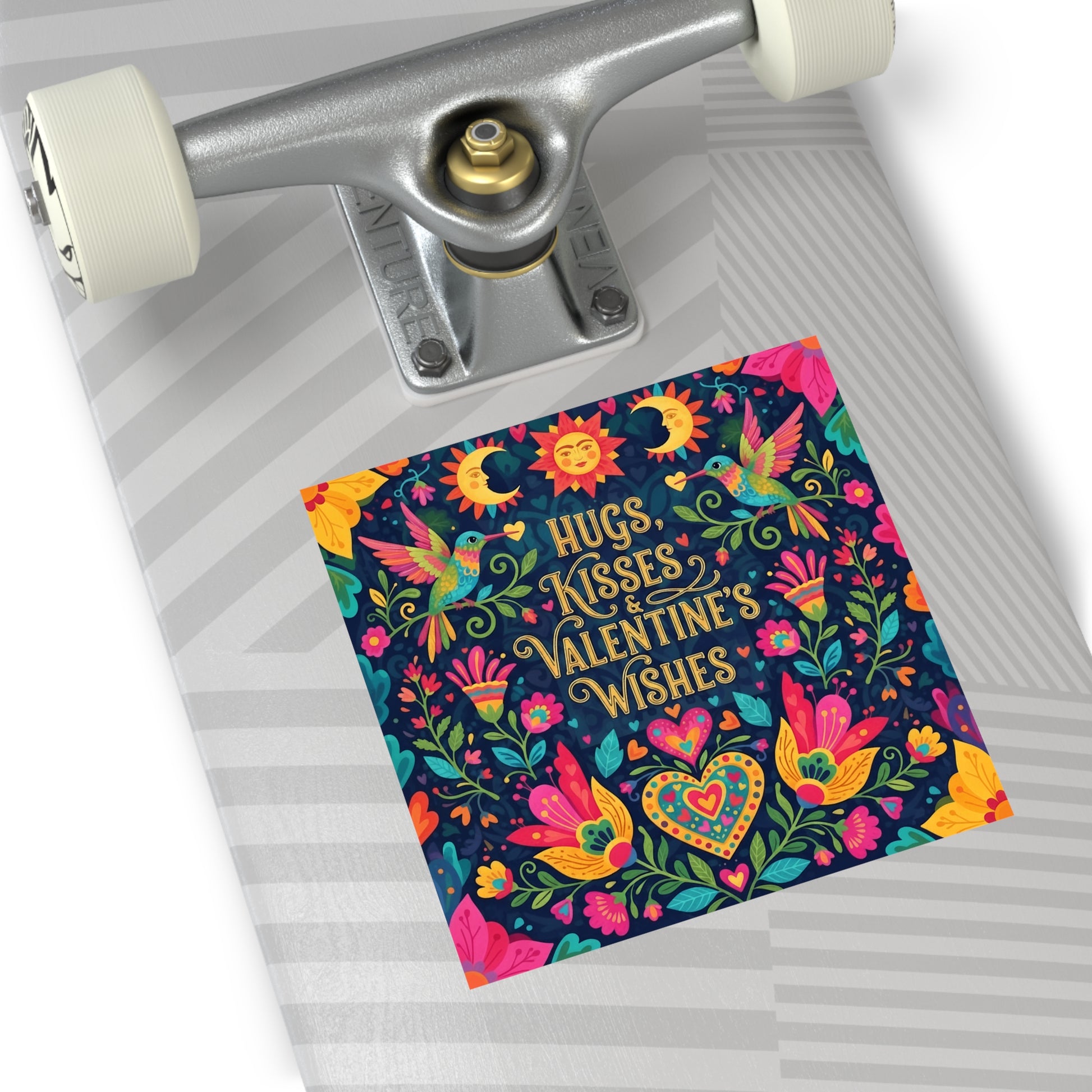 Bright, joyful vinyl sticker featuring a folk-art Valentine’s design. Rich, saturated colors and playful illustrations of hearts, flowers, the sun, the moon, and hummingbirds frame the warm message: “Hugs, Kisses & Valentine’s Wishes.” The glossy (or matte option) finish makes the colors pop on notebooks, laptops, gift boxes, or card envelopes. Weather-resistant vinyl with a permanent adhesive backing holds on smooth, flat surfaces indoors or out. Choose from five sizes to suit small keepsakes or larger display spots. This sticker brings a handcrafted, celebratory touch to Valentine’s moments—a little burst of color that turns everyday items into cheerful reminders of affection.