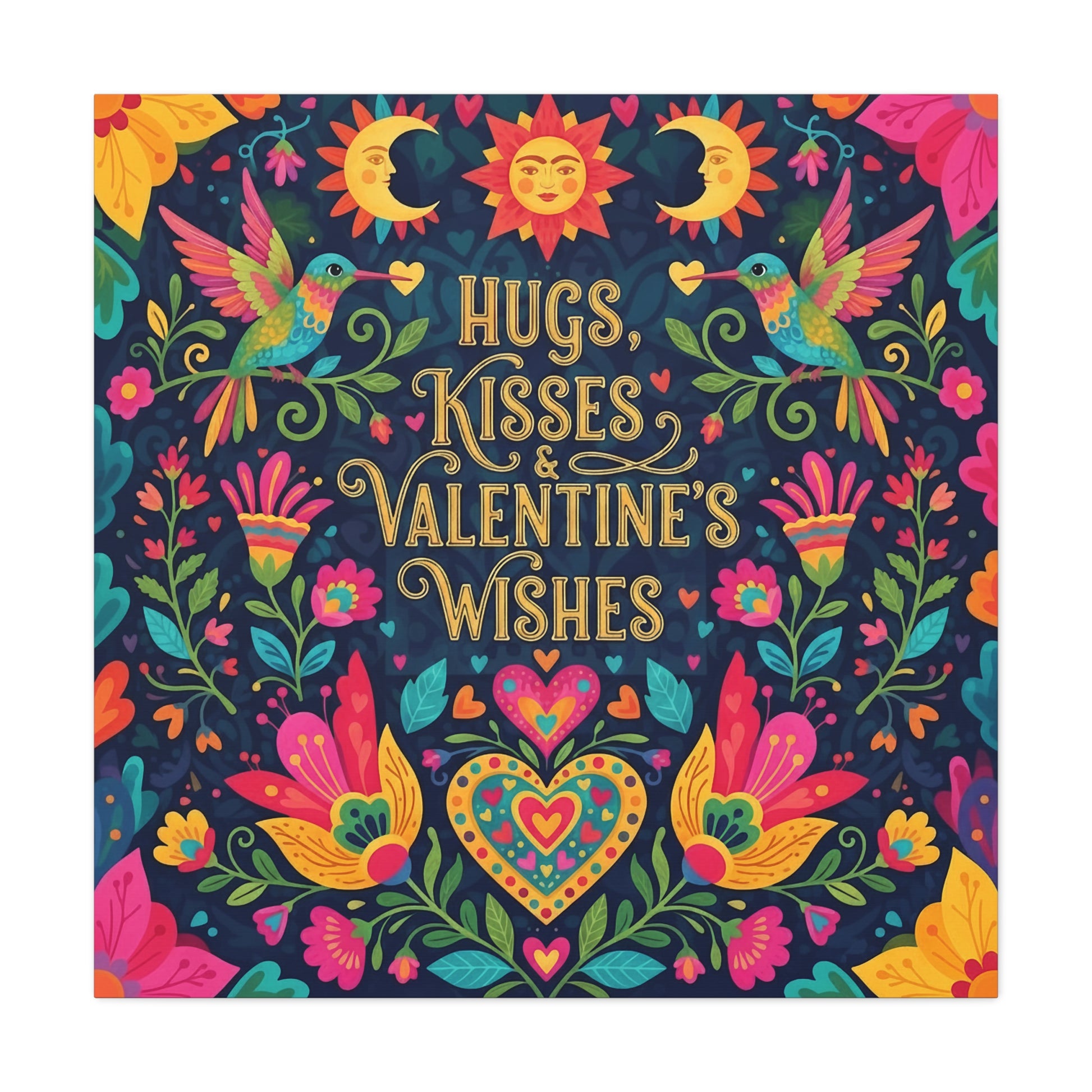 Bright, hand-painted folk art blooms and playful hummingbirds surround a warm, handwritten message: “Hugs, Kisses & Valentine’s Wishes.” Printed on a matte stretched canvas with a subtle texture, the artwork brings a cheerful, cozy energy to a living room wall, bedroom nook, or entryway. The colors feel joyous and layered—jewel tones of pink, teal, gold, and navy—so the piece reads as both a statement and a comforting presence. Lightweight but sturdy, the canvas arrives ready to hang and sits a little proud from the wall to catch light and shadow, turning a simple wall into a small celebration of love and color.