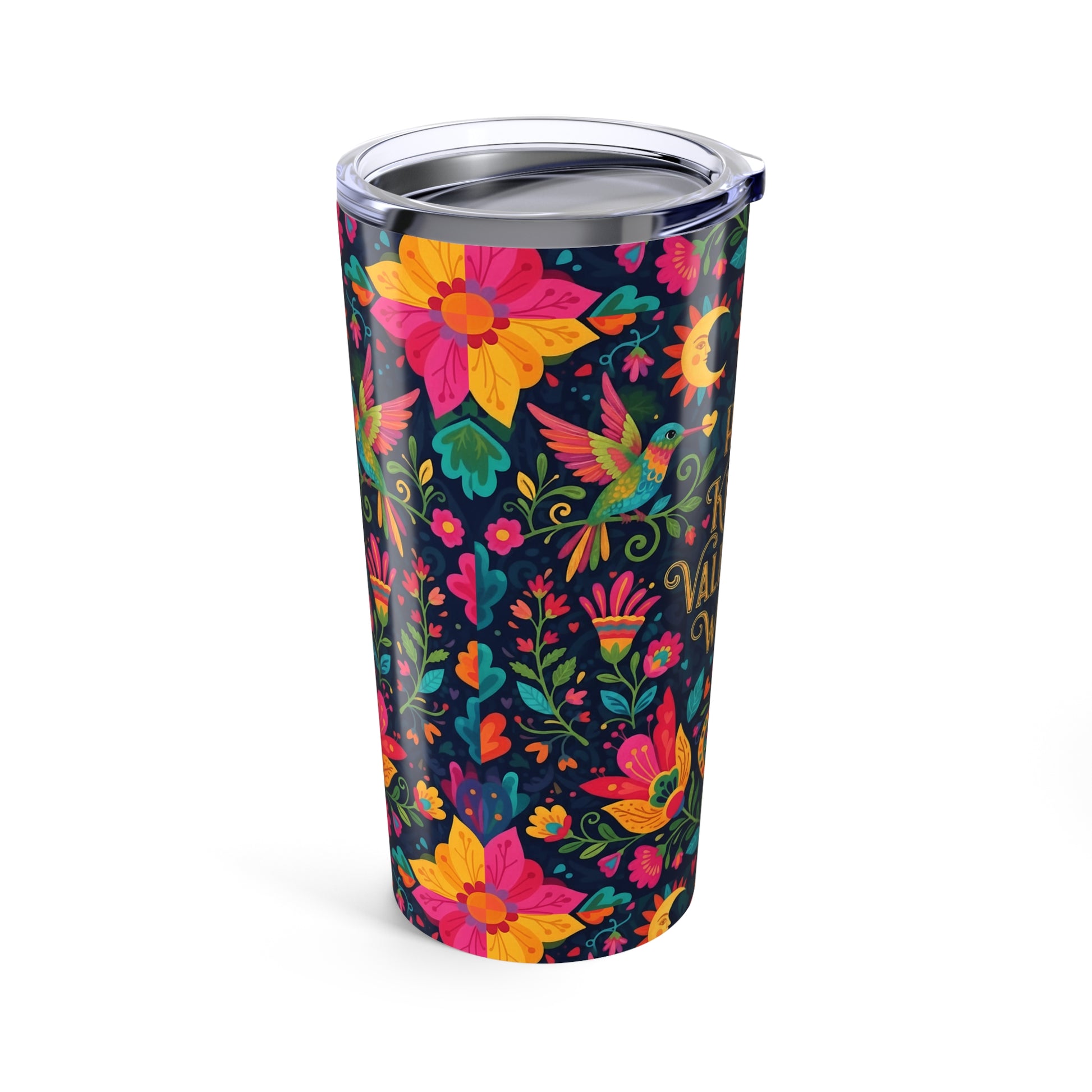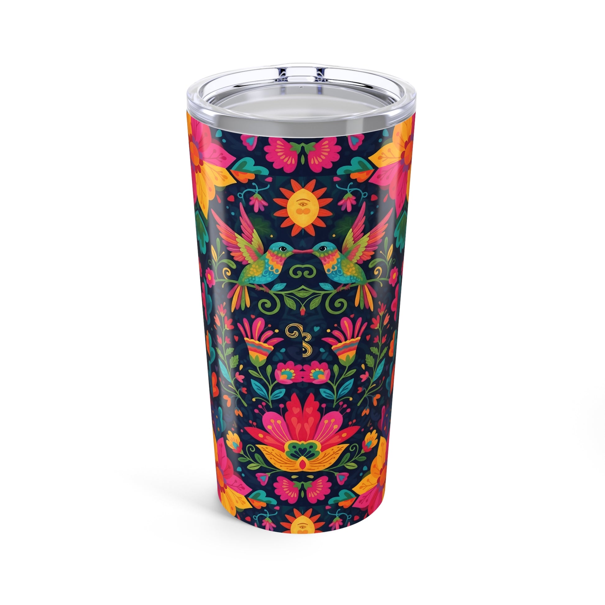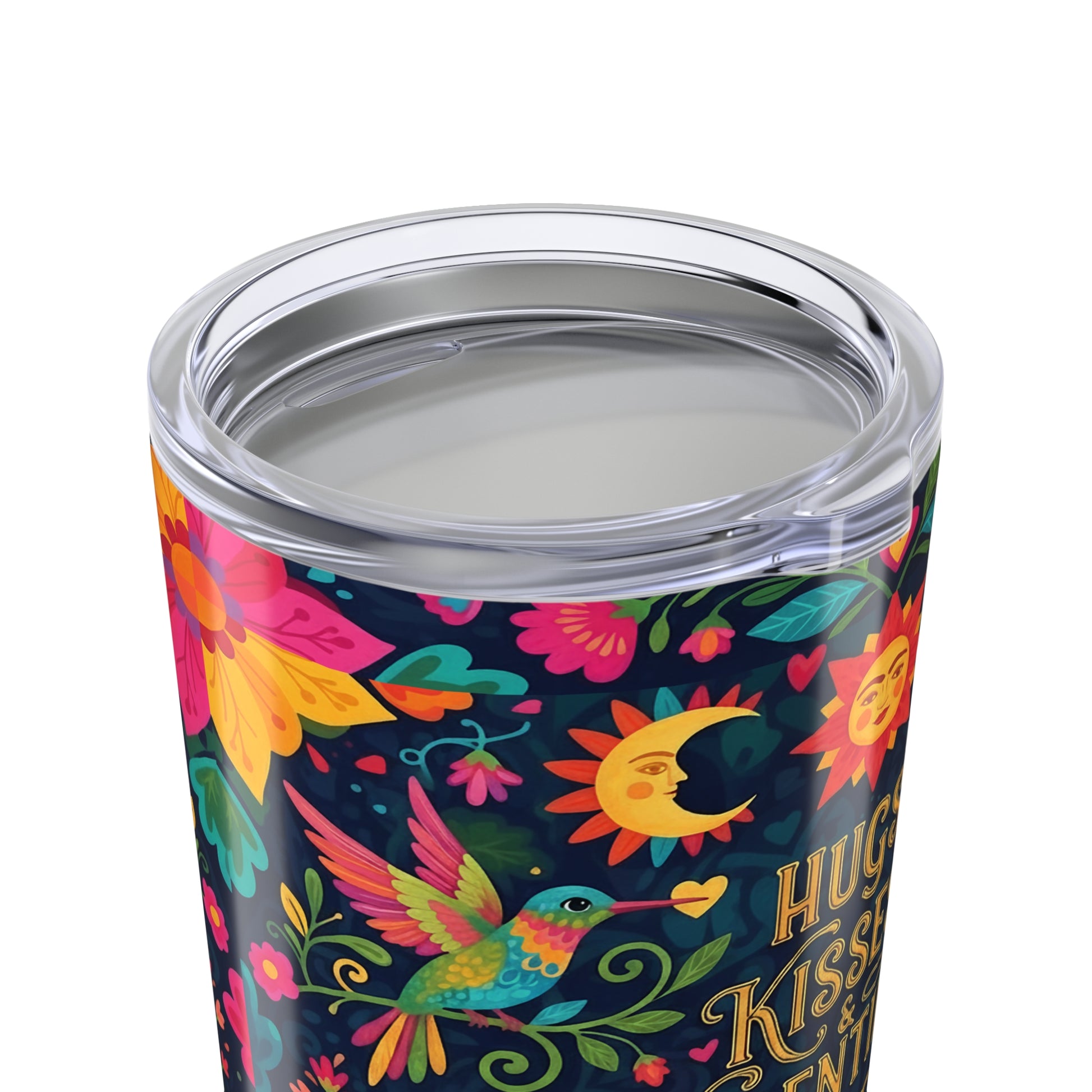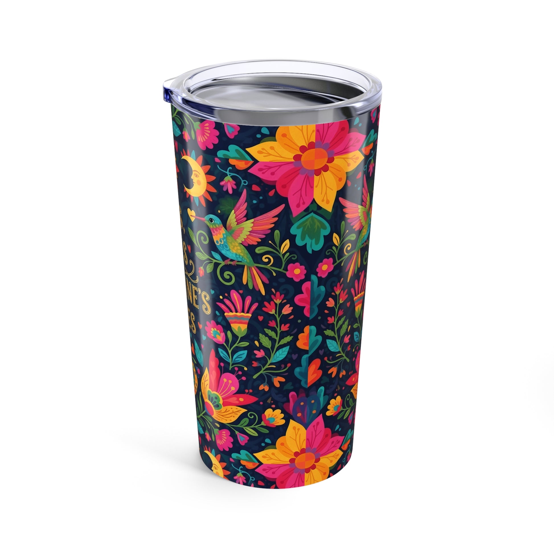 A bright, joyful 20 oz tumbler wrapped in cheerful folk-art illustrations and a warm Valentine’s message. The glossy full-color print blends sun motifs, hummingbirds, and blooming hearts against a deep background, creating a cozy, hand-painted look. It keeps drinks hot or cold for hours and fits everyday routines—from morning coffee at the desk to evening tea on the porch. The clear push-on lid seals with a rubber gasket for fewer spills, while the stainless steel vacuum body resists rust and staining. This tumbler brings a little handcrafted charm to daily sips and celebrations of affection.
