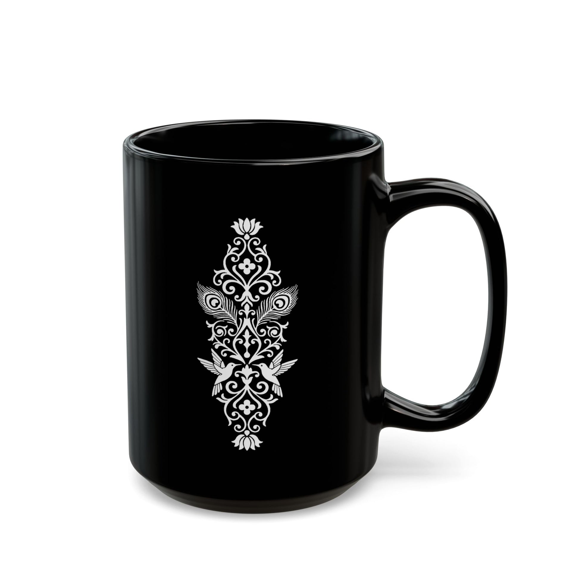 This glossy black ceramic mug carries a quiet, artful presence—a narrow, ornate white motif that reads like a tiny talisman on deep black. It feels like a private ritual: a slow morning sip, the steam rising against the dark glaze while your hands wrap around the C-shaped handle. The contrast of crisp white patterning on rich black keeps the design sophisticated and a little mysterious. Friendly to daily life, it stands up to microwave and dishwasher use and comes in two sizes so you can choose a modest cup or a larger, linger-long mug.