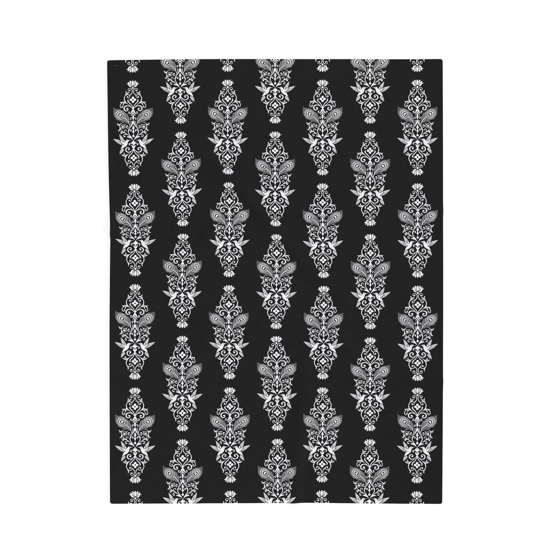 A luxuriously soft velveteen plush blanket wrapped in a bold black-and-white damask motif. The dense, medium-weight polyester nap gives a cozy, tactile warmth, while the printed side holds crisp, high-contrast detail—every flourish of the pattern retains sharpness and depth. Double-stitched edges keep the blanket looking neat after washes and regular use. It settles easily on a couch or armchair and brings a moody, elegant accent to late-night reading, movie marathons, or quiet moments on the porch. For those who love vintage-inspired design with modern comfort, this blanket feels like an heirloom piece updated for everyday life.