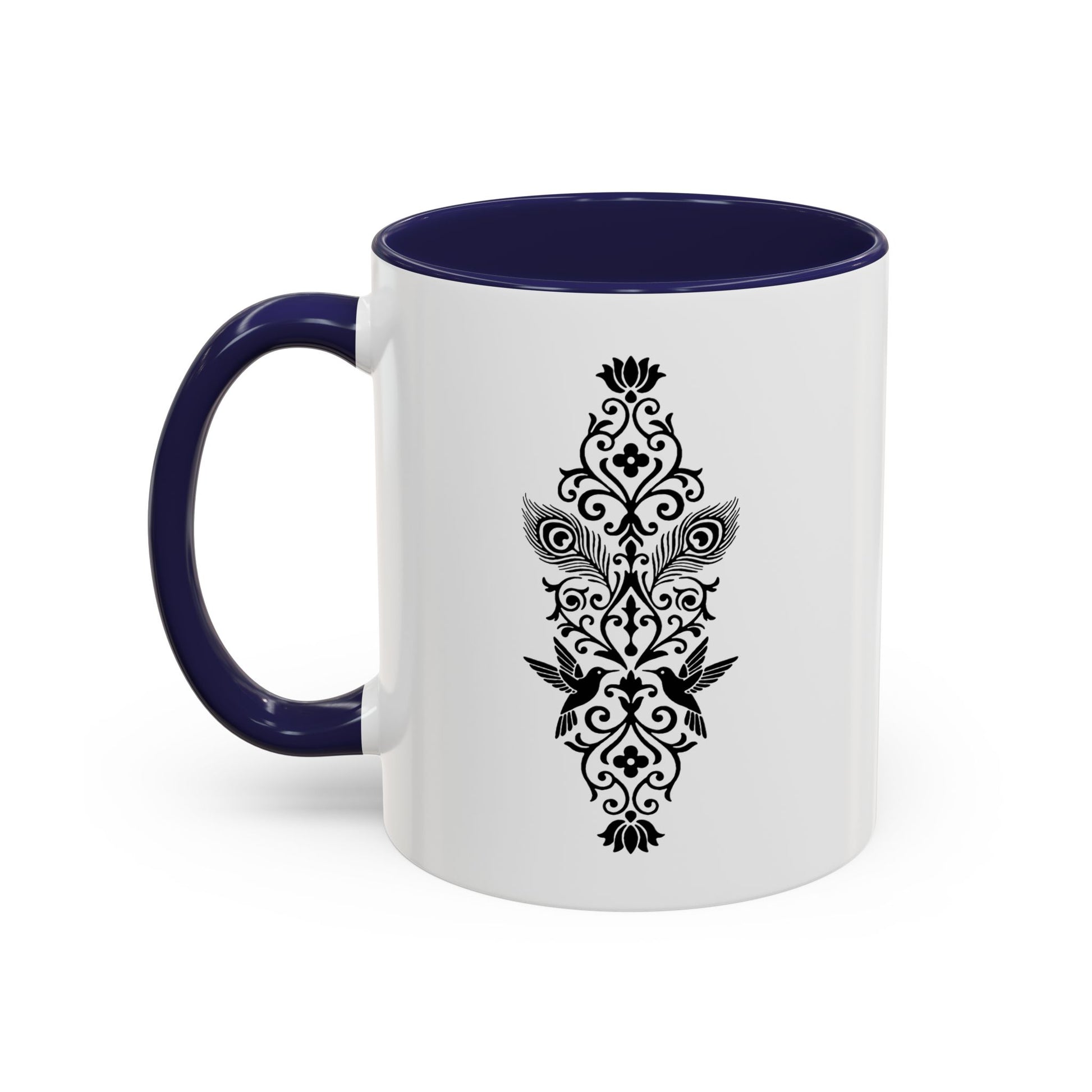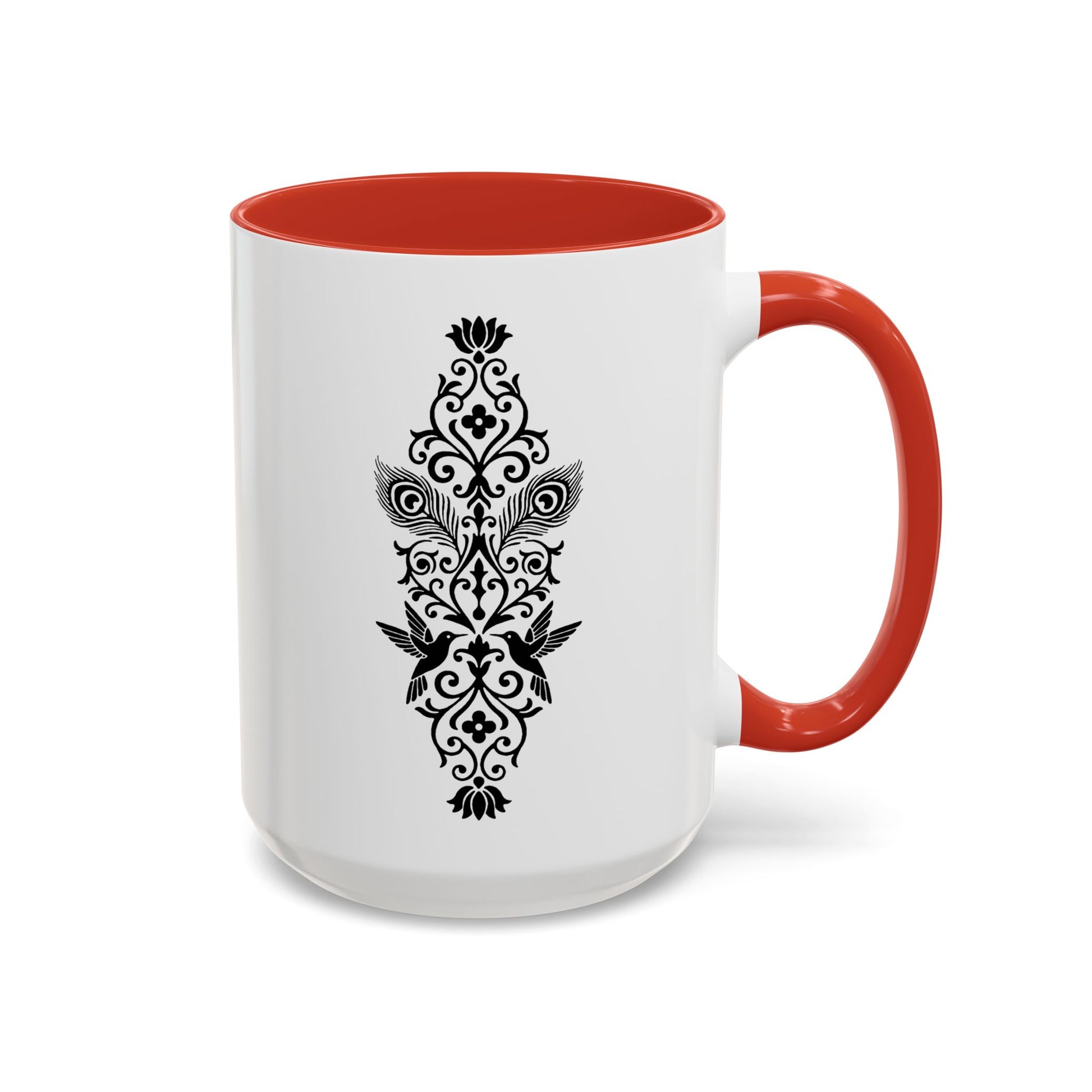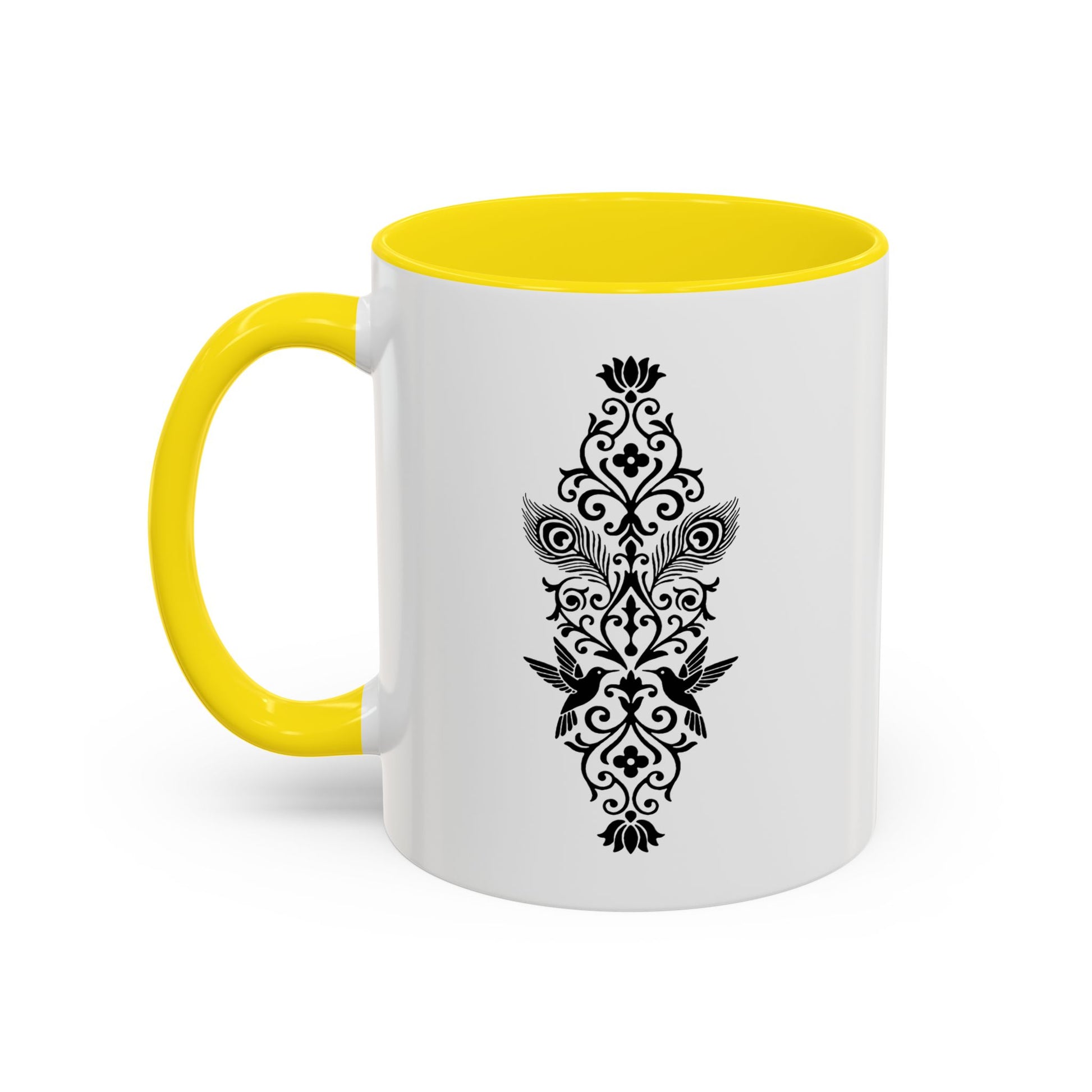 This ceramic accent mug brings quiet elegance to your morning routine. A vertical, ornamental black motif—intricate swirls, stylized leaves, and eye-like forms—rises along the side, creating a balanced, meditative focal point. The glossy white body contrasts with a colored interior and C-shaped handle, giving the piece a crisp, modern-retro feel. It fits into slow mornings, focused desk sessions, and cozy conversations; reach for it when you want your coffee or tea to feel intentional and a little beautiful. Durable, microwave- and dishwasher-safe construction keeps the design bright through everyday use.