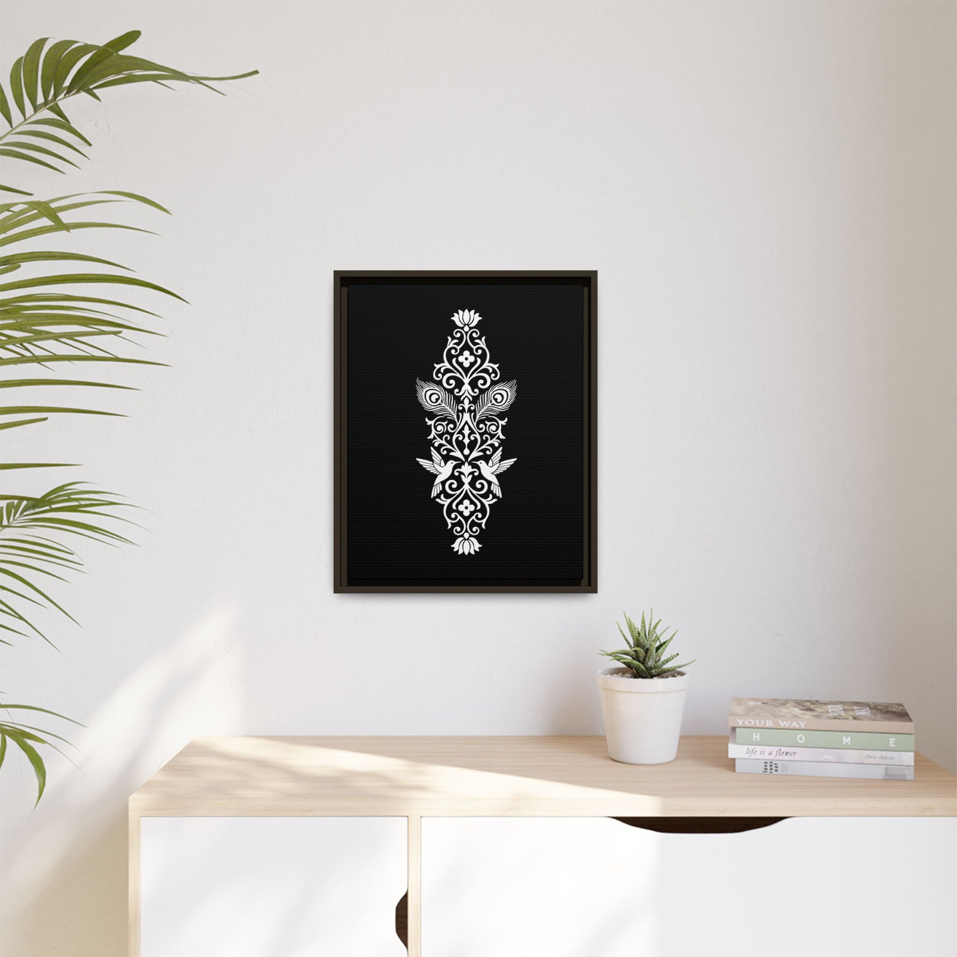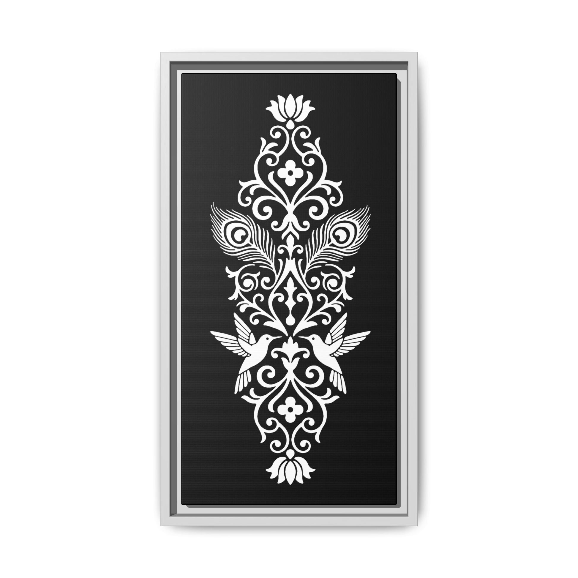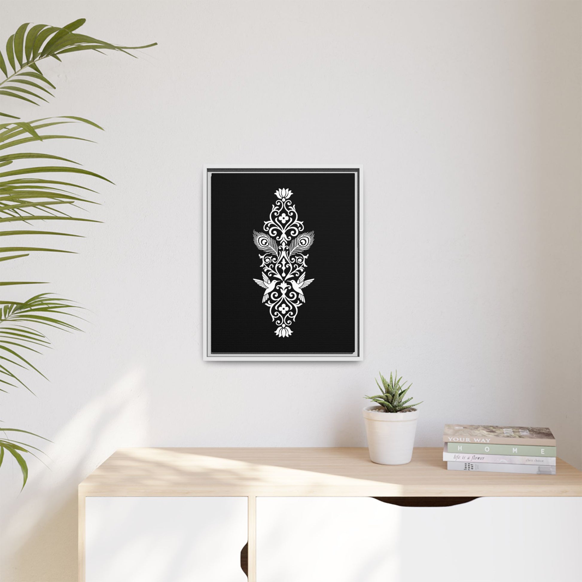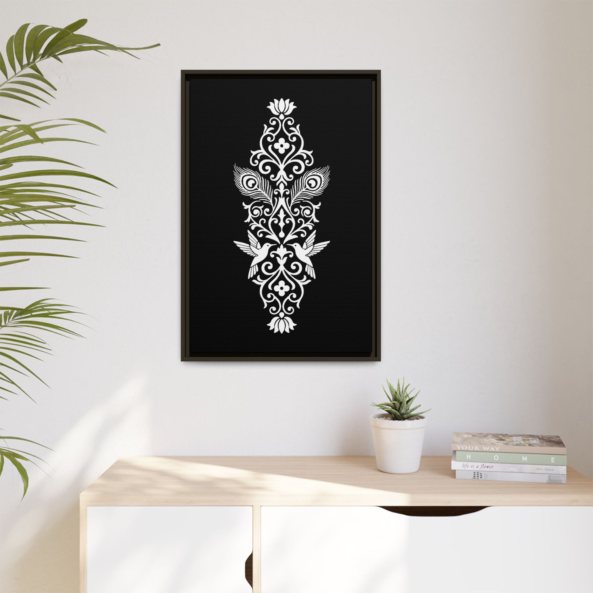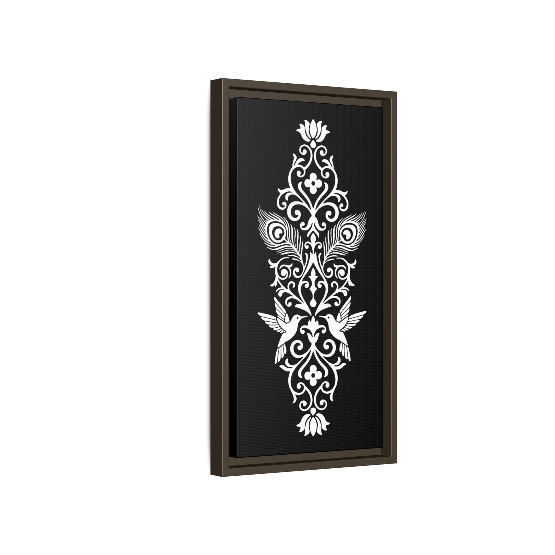 This framed matte canvas brings calm and refined contrast to a modern room. The white ornamental motif—delicate florals, peacock-feather eyes, and two small birds—sits against a deep black field, creating a meditative vertical panel that reads like a symbol or talisman. The slim pine floater frame gives the artwork breathing space and a subtle shadow line, so it feels both contemporary and handcrafted. Hang it alone as a quiet statement on a narrow wall, tuck it into a gallery arrangement, or let it anchor a bedside nook. The restrained palette and symbolic pattern suit someone who prefers minimal, meaningful decor with a touch of folk-art elegance.
