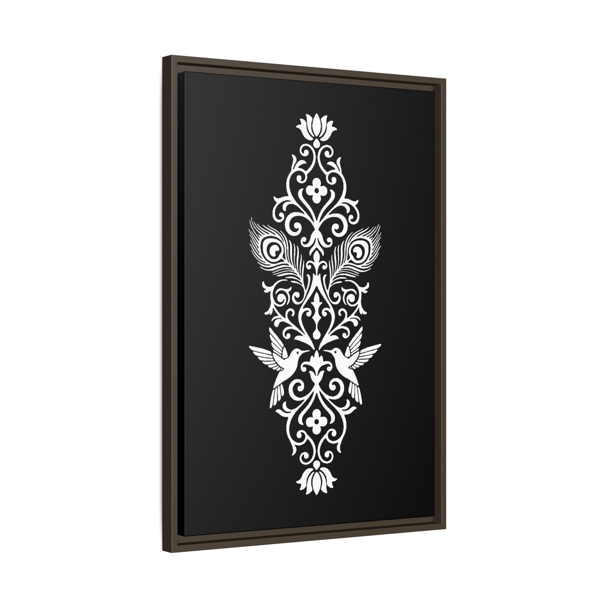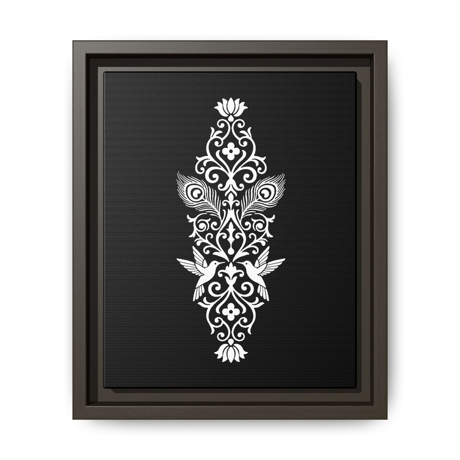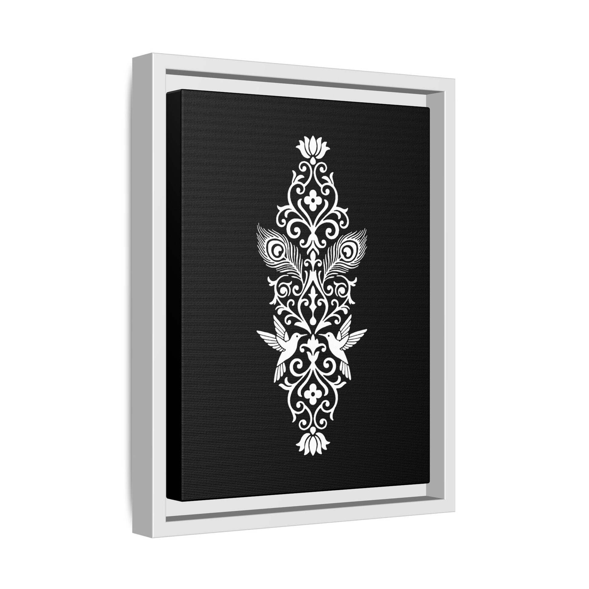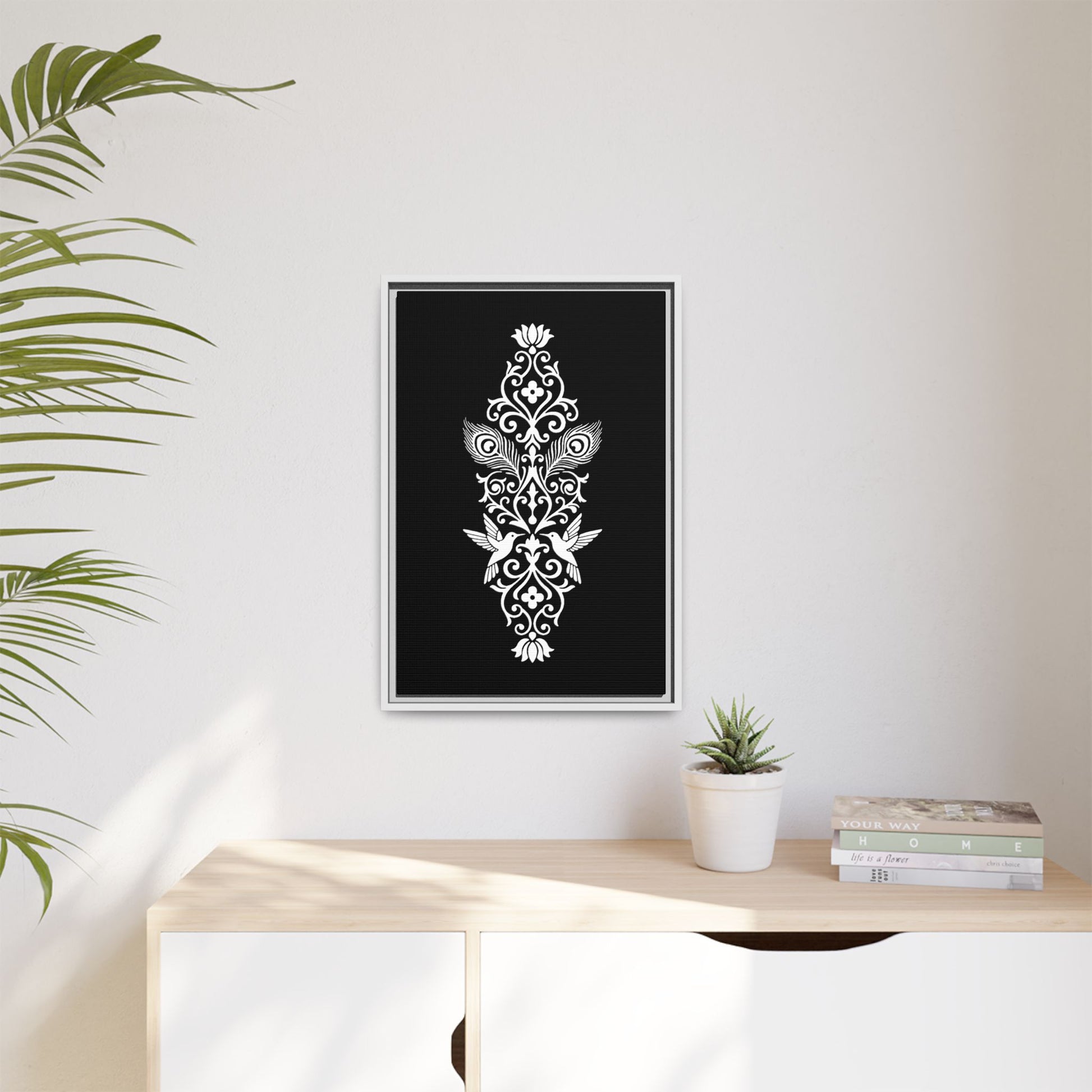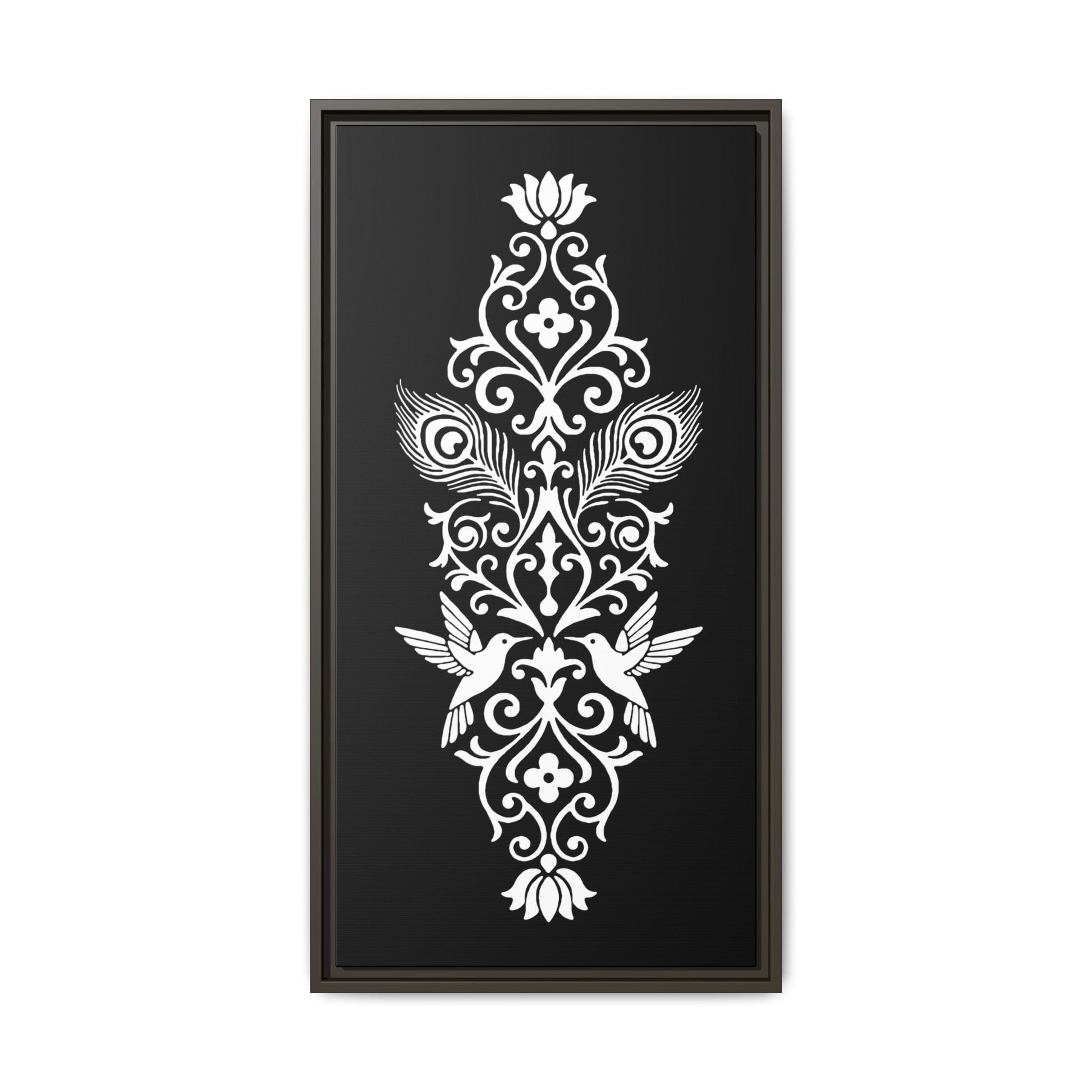 This framed matte canvas brings calm and refined contrast to a modern room. The white ornamental motif—delicate florals, peacock-feather eyes, and two small birds—sits against a deep black field, creating a meditative vertical panel that reads like a symbol or talisman. The slim pine floater frame gives the artwork breathing space and a subtle shadow line, so it feels both contemporary and handcrafted. Hang it alone as a quiet statement on a narrow wall, tuck it into a gallery arrangement, or let it anchor a bedside nook. The restrained palette and symbolic pattern suit someone who prefers minimal, meaningful decor with a touch of folk-art elegance.