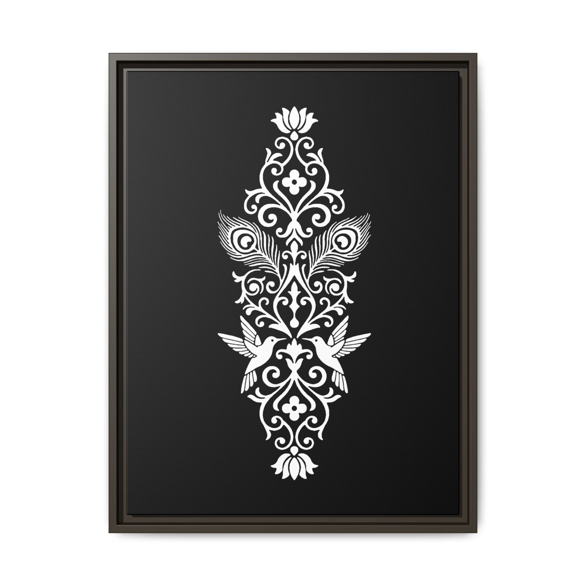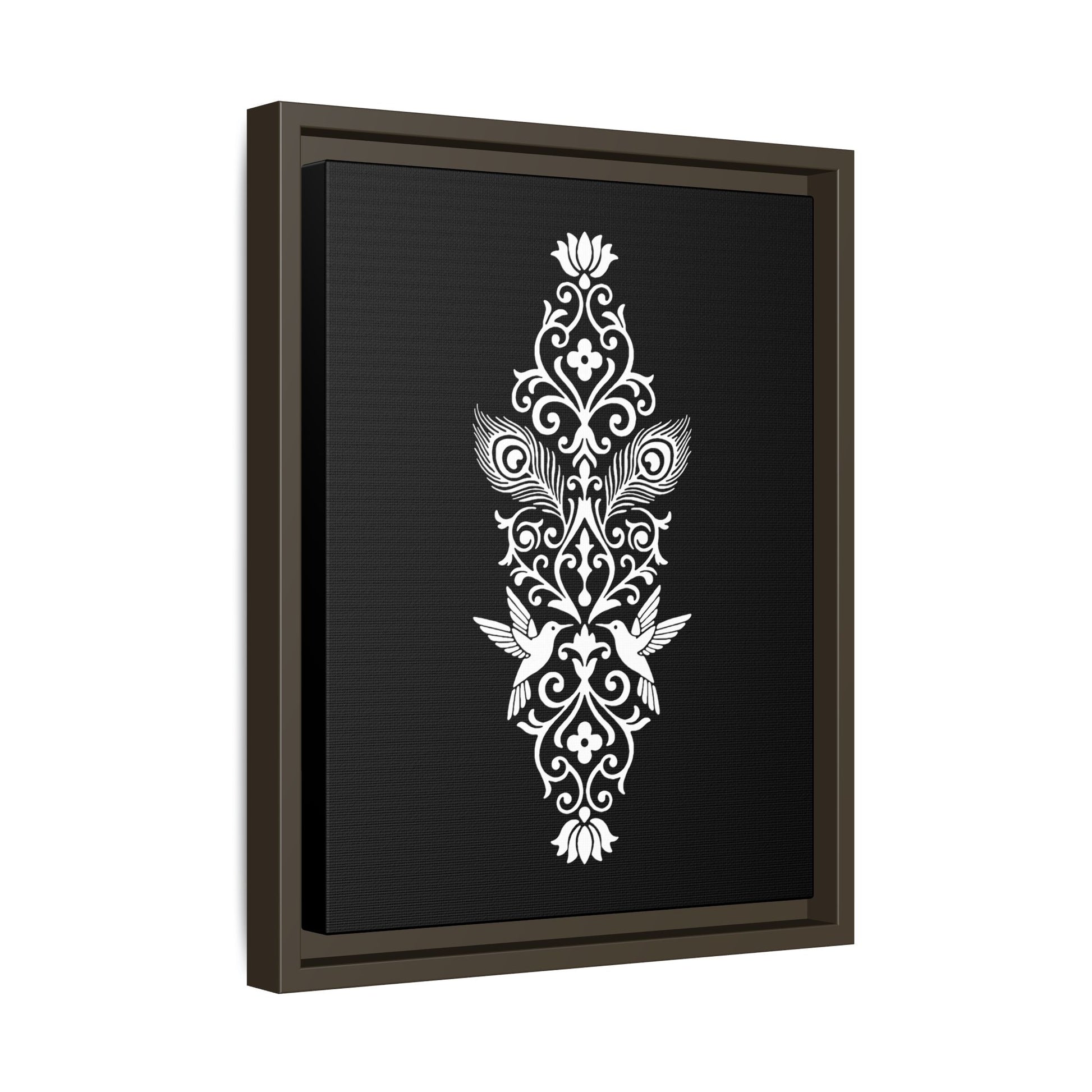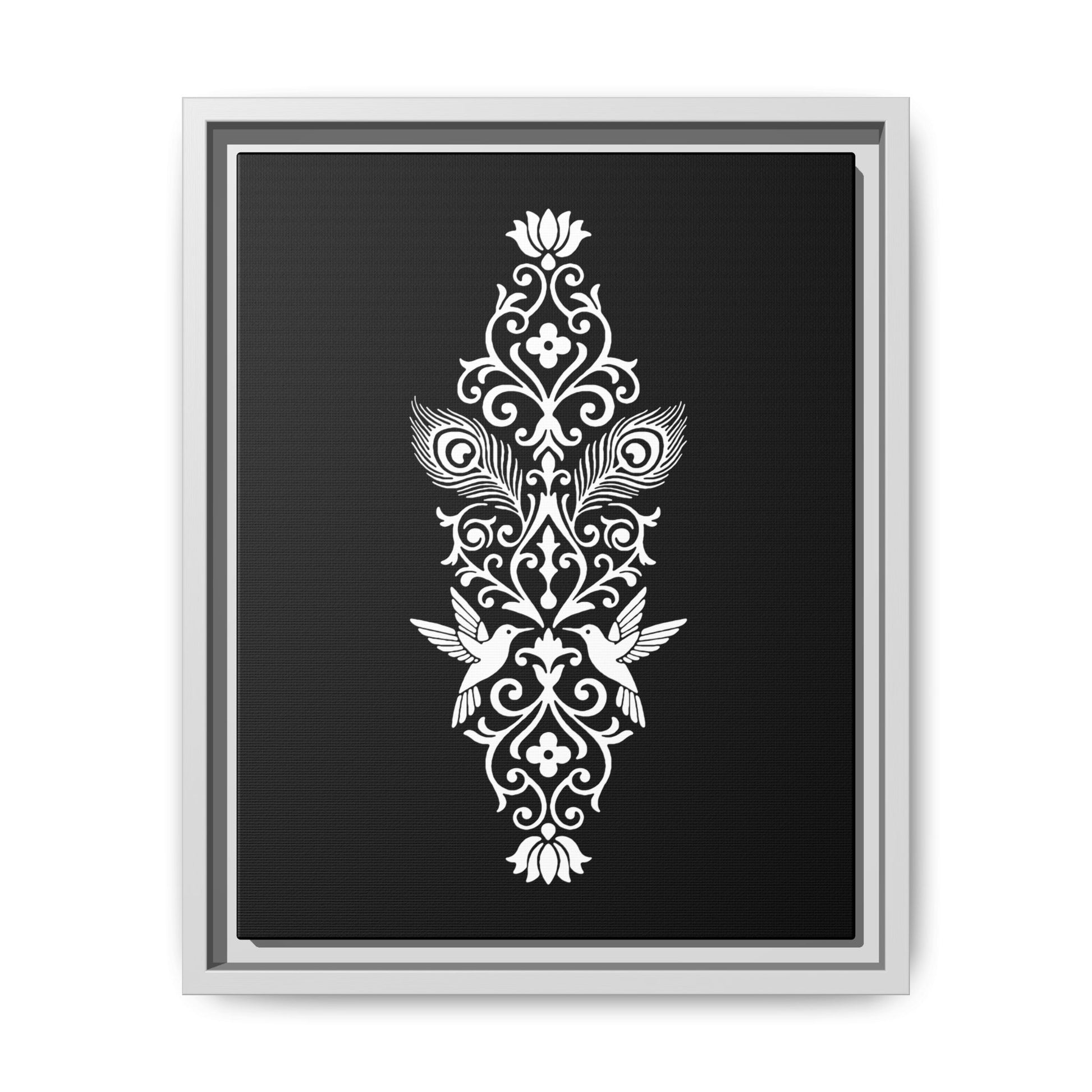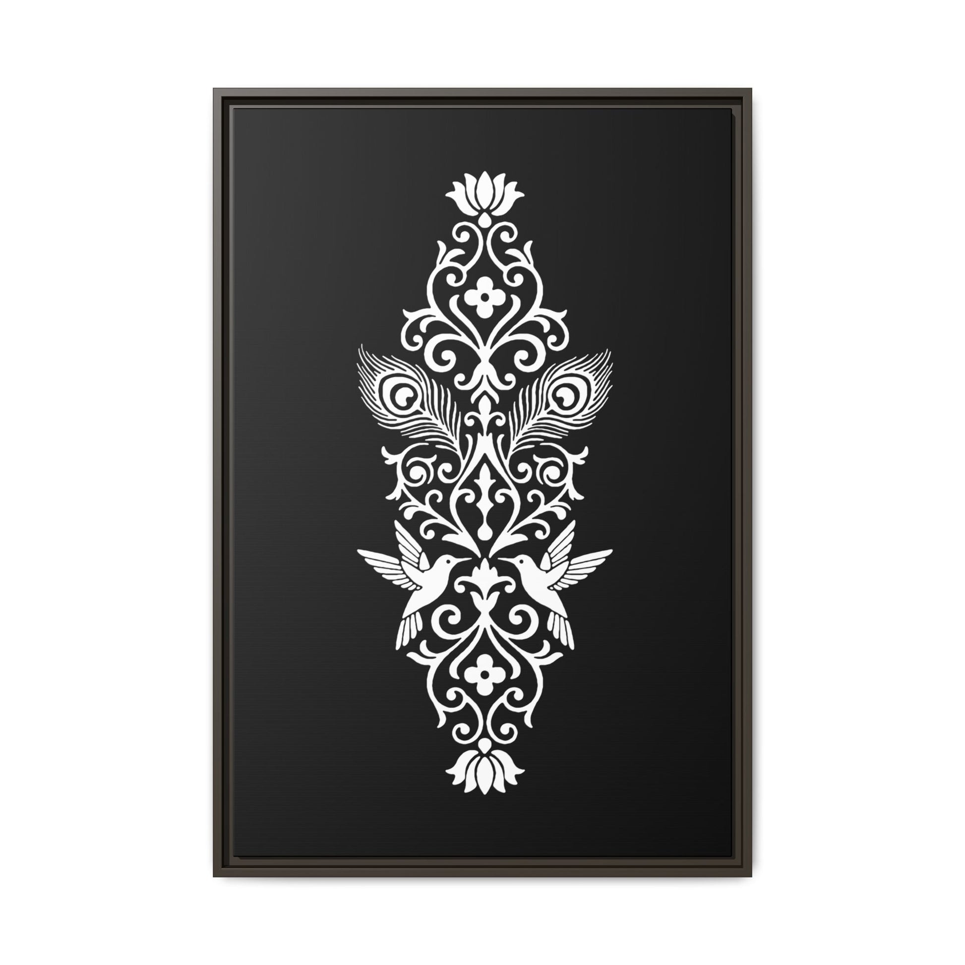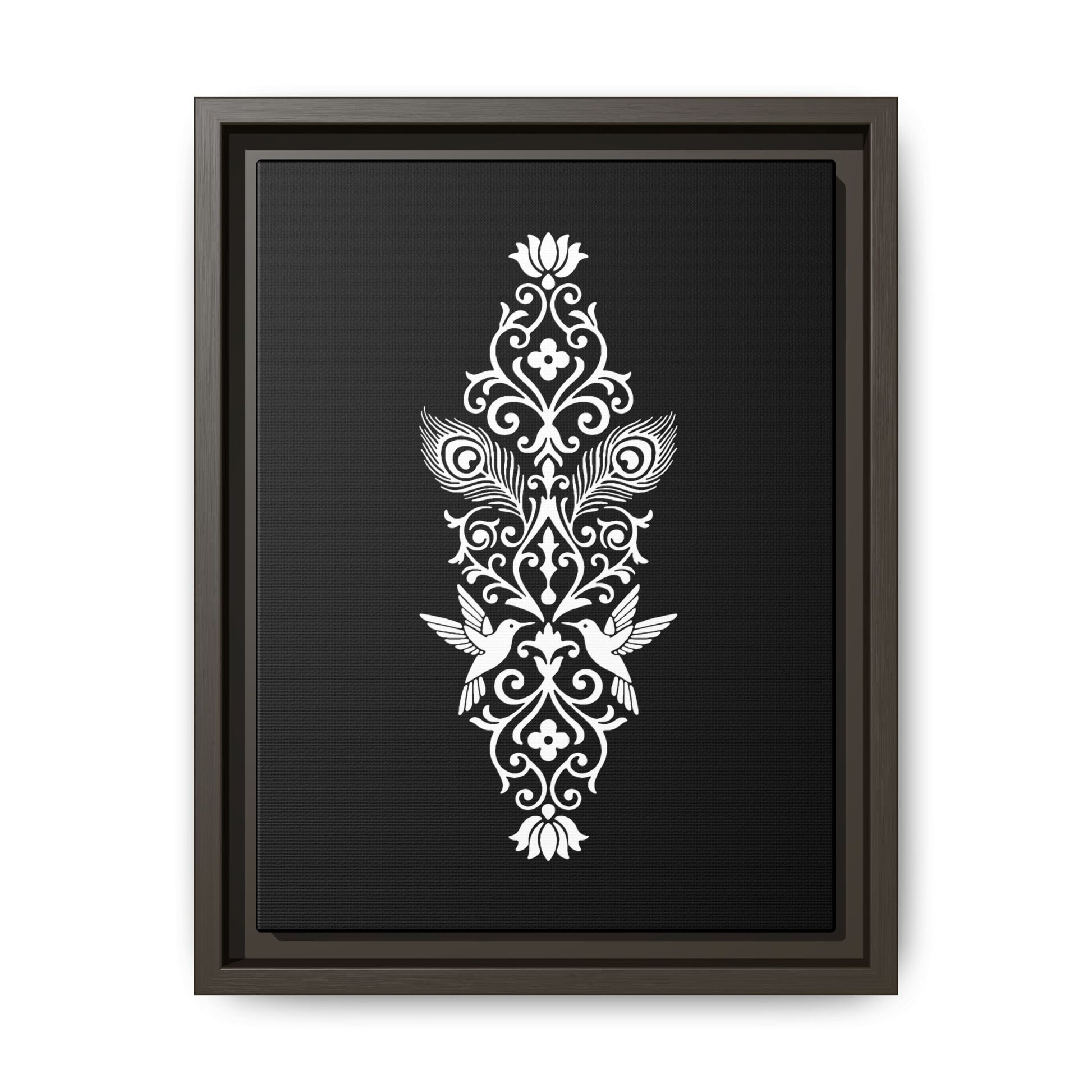 This framed matte canvas brings calm and refined contrast to a modern room. The white ornamental motif—delicate florals, peacock-feather eyes, and two small birds—sits against a deep black field, creating a meditative vertical panel that reads like a symbol or talisman. The slim pine floater frame gives the artwork breathing space and a subtle shadow line, so it feels both contemporary and handcrafted. Hang it alone as a quiet statement on a narrow wall, tuck it into a gallery arrangement, or let it anchor a bedside nook. The restrained palette and symbolic pattern suit someone who prefers minimal, meaningful decor with a touch of folk-art elegance.