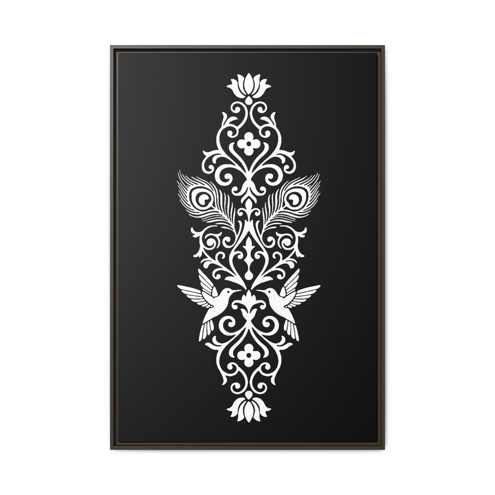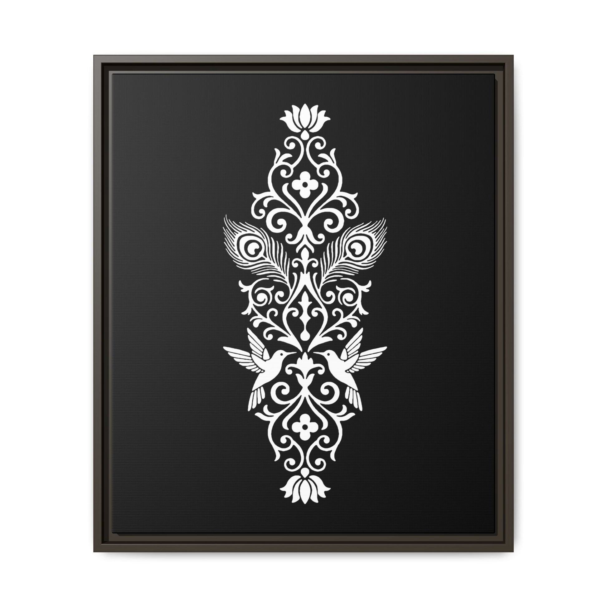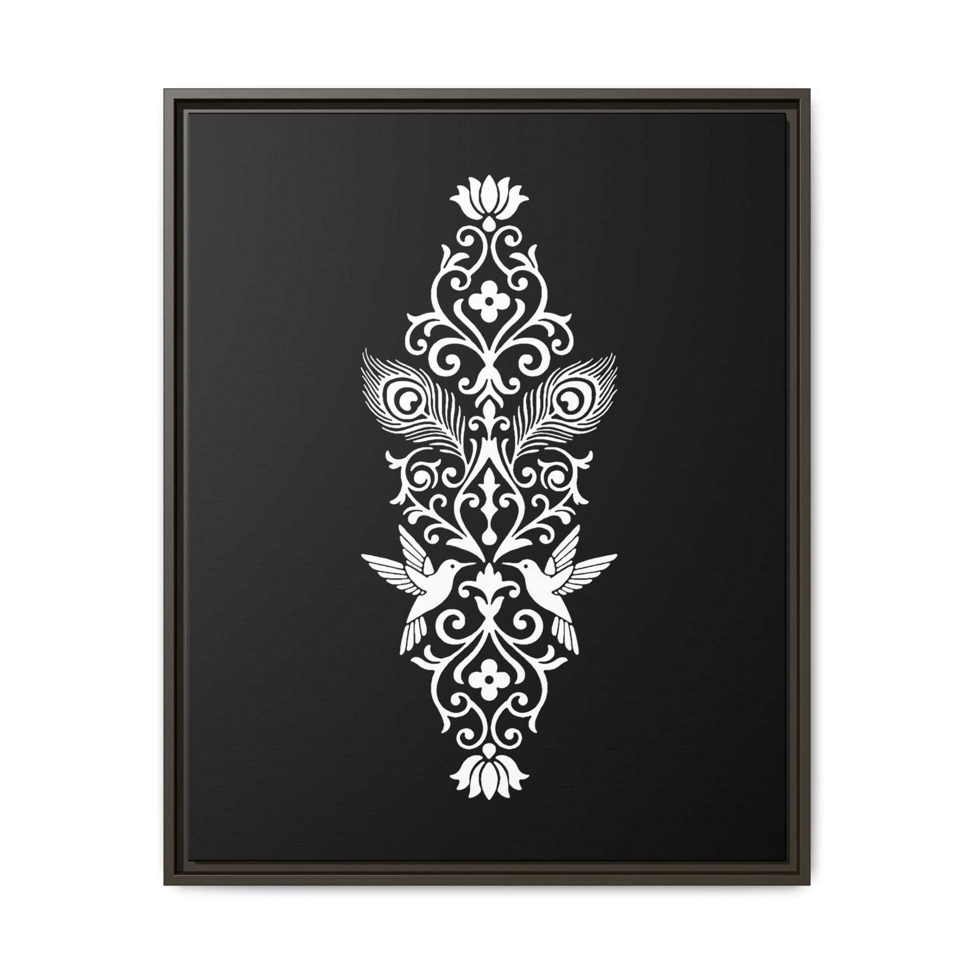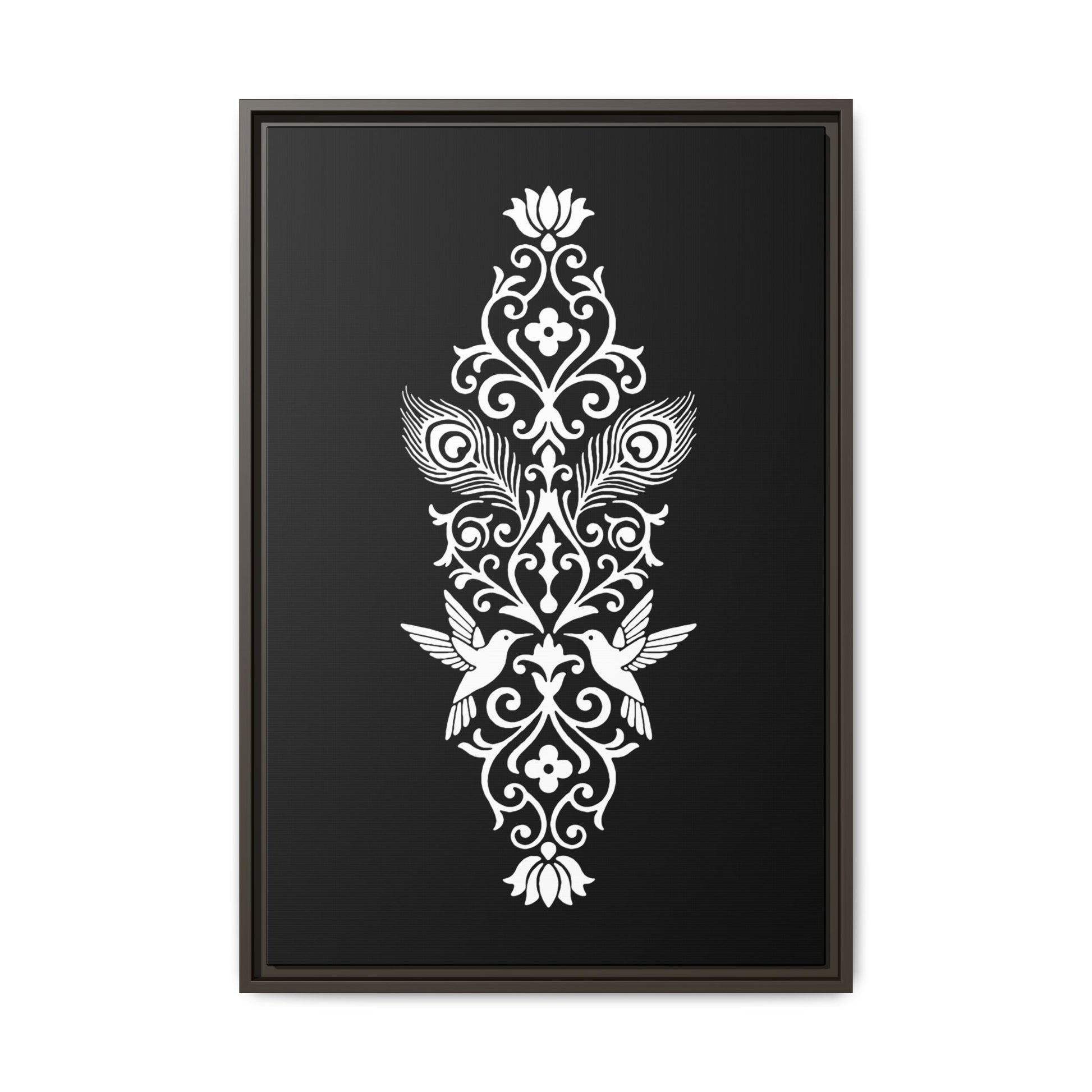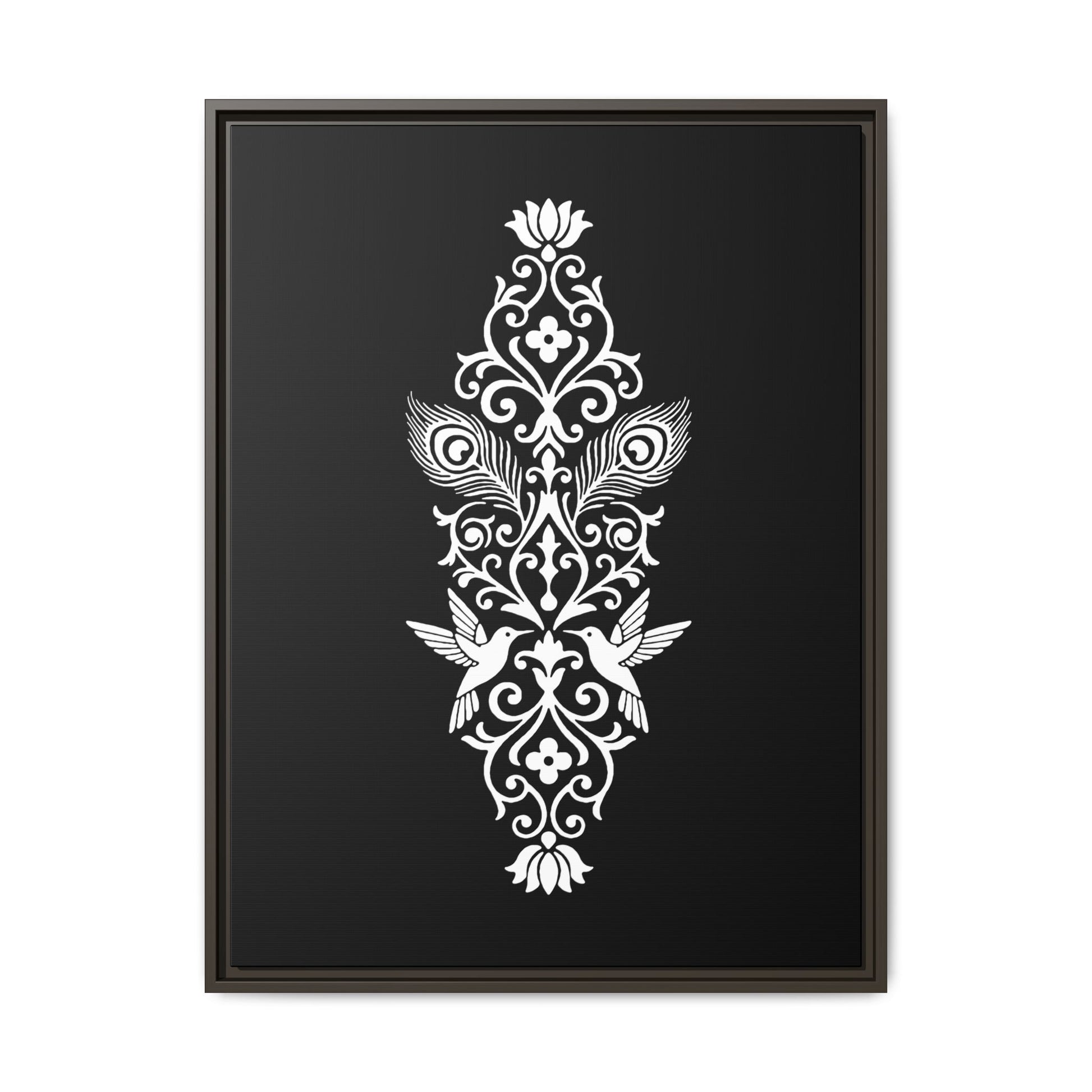 This framed matte canvas brings calm and refined contrast to a modern room. The white ornamental motif—delicate florals, peacock-feather eyes, and two small birds—sits against a deep black field, creating a meditative vertical panel that reads like a symbol or talisman. The slim pine floater frame gives the artwork breathing space and a subtle shadow line, so it feels both contemporary and handcrafted. Hang it alone as a quiet statement on a narrow wall, tuck it into a gallery arrangement, or let it anchor a bedside nook. The restrained palette and symbolic pattern suit someone who prefers minimal, meaningful decor with a touch of folk-art elegance.