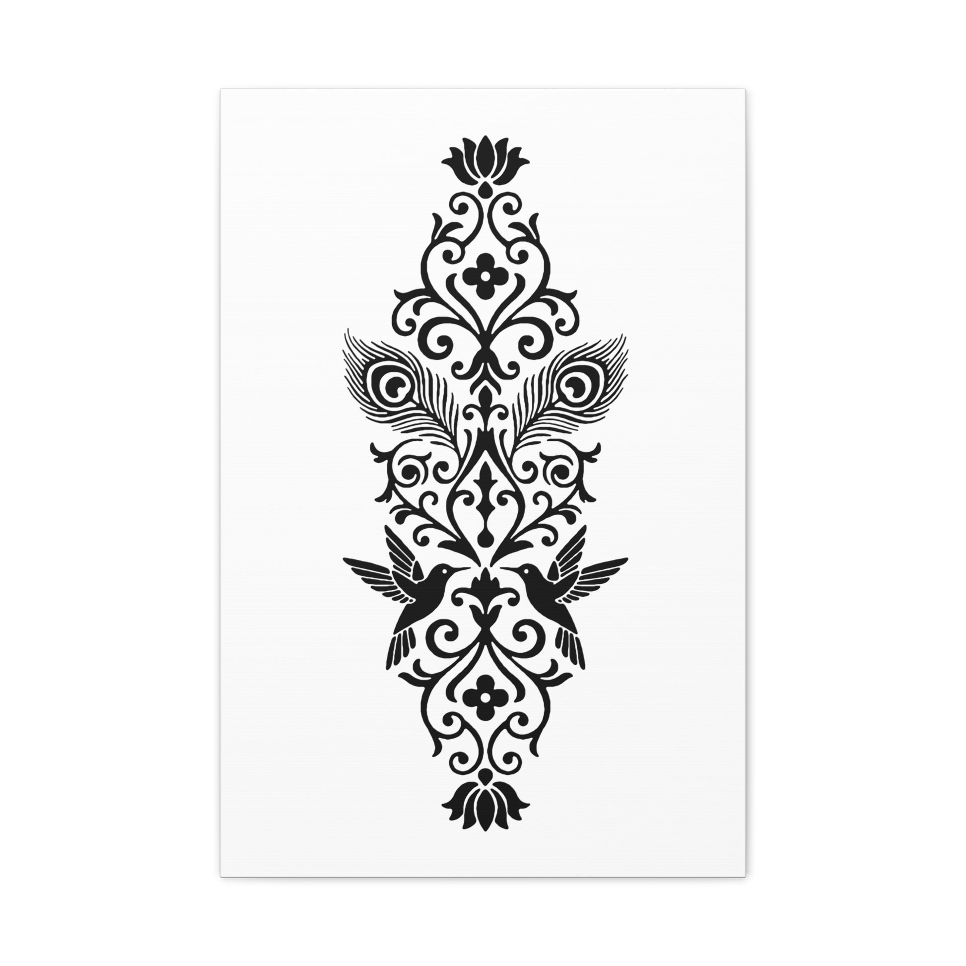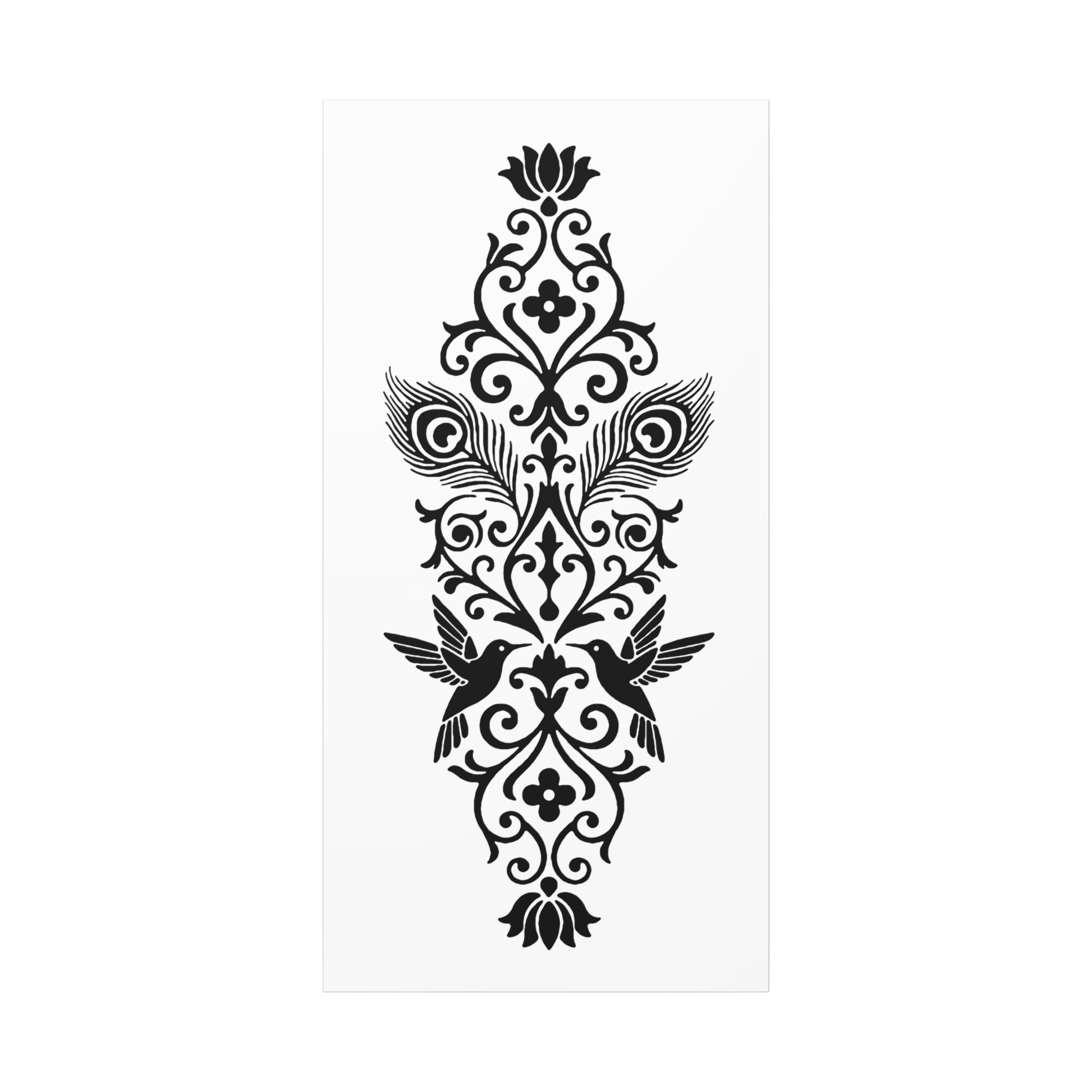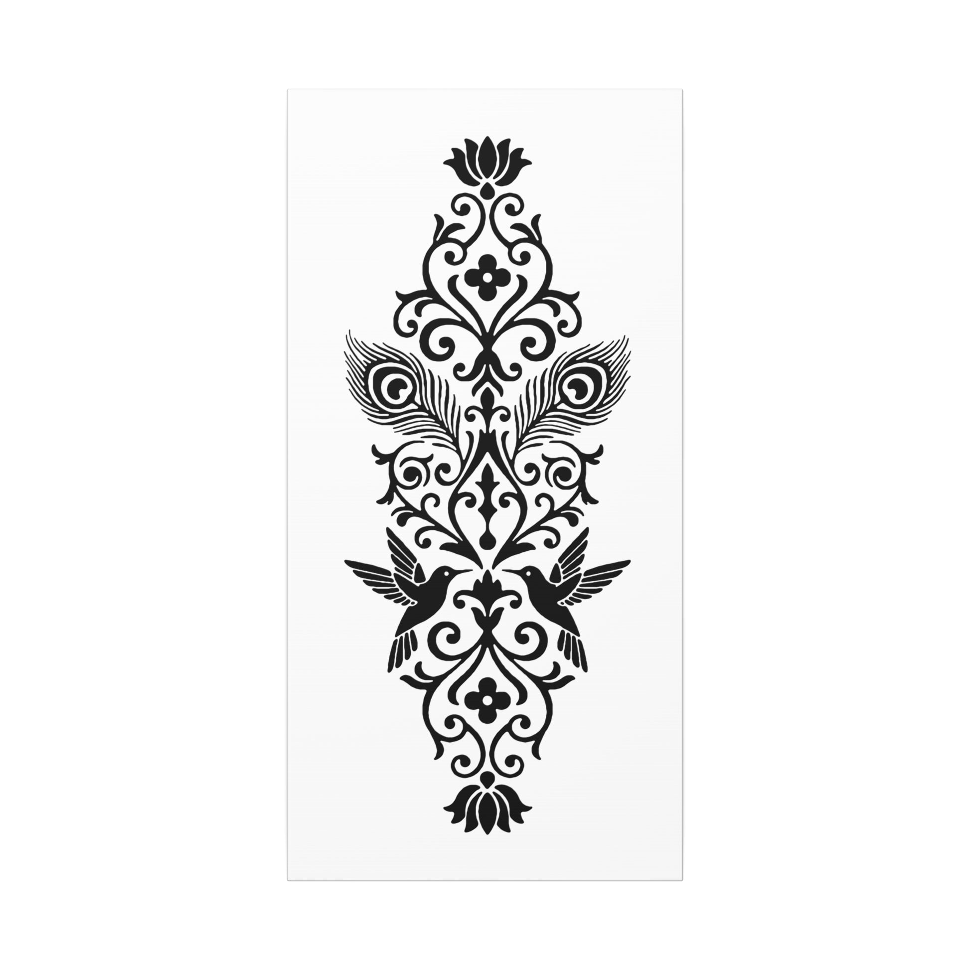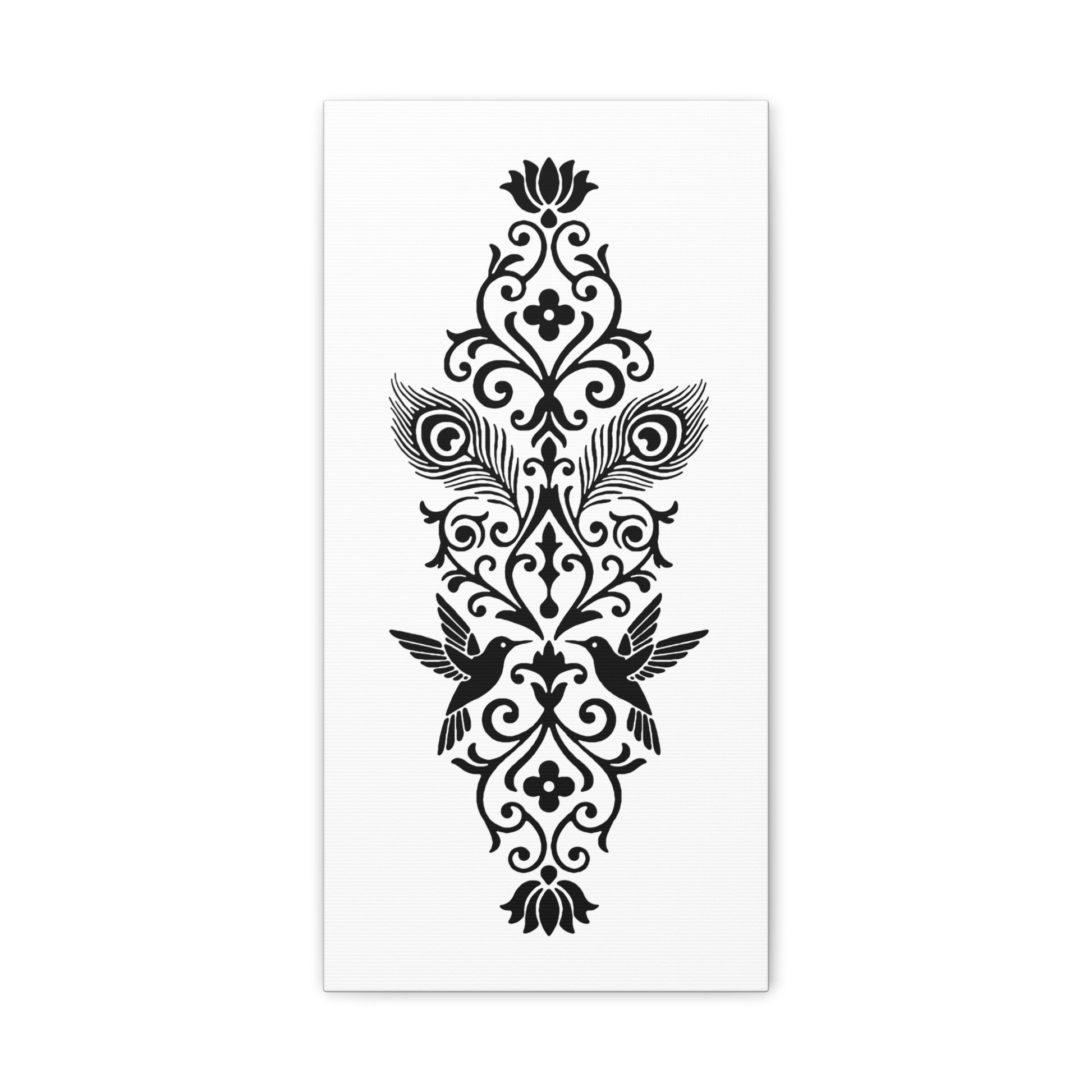 This stretched matte canvas brings quiet, refined elegance to any wall. A vertical, black-and-white ornamental motif—feathered peacock elements and twin hummingbirds—stands out crisply against the clean white ground. The image feels like a hand-applied stencil: delicate curves, repeating floral flourishes, and ink-dark detail that invite a slow, attentive look. Hung in a hallway, bedroom nook, or meditation corner, it calms the room while offering a touch of graphic drama. The narrow, tall format draws the eye upward and pairs naturally with slim picture ledges, grouped frames, or minimalist furniture.