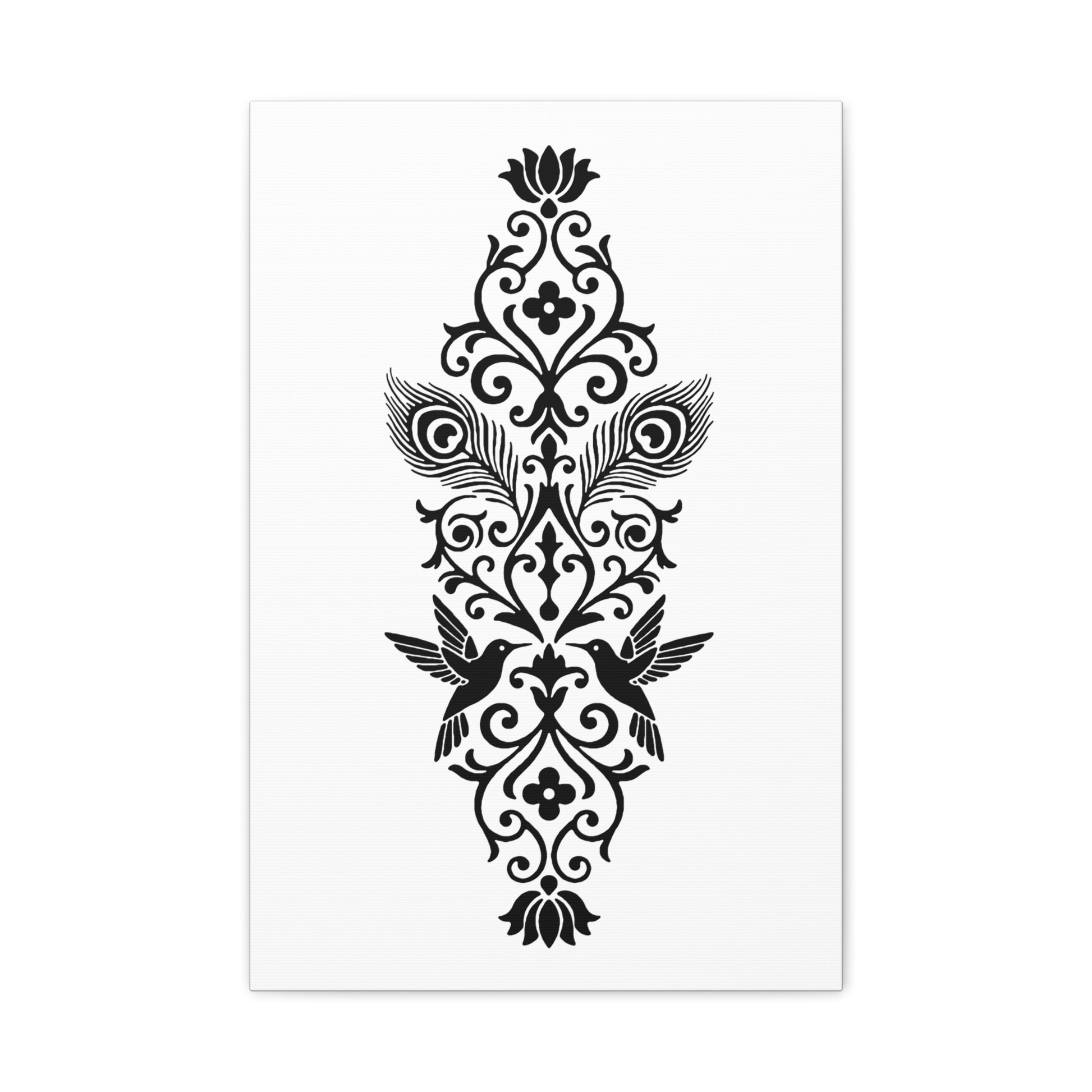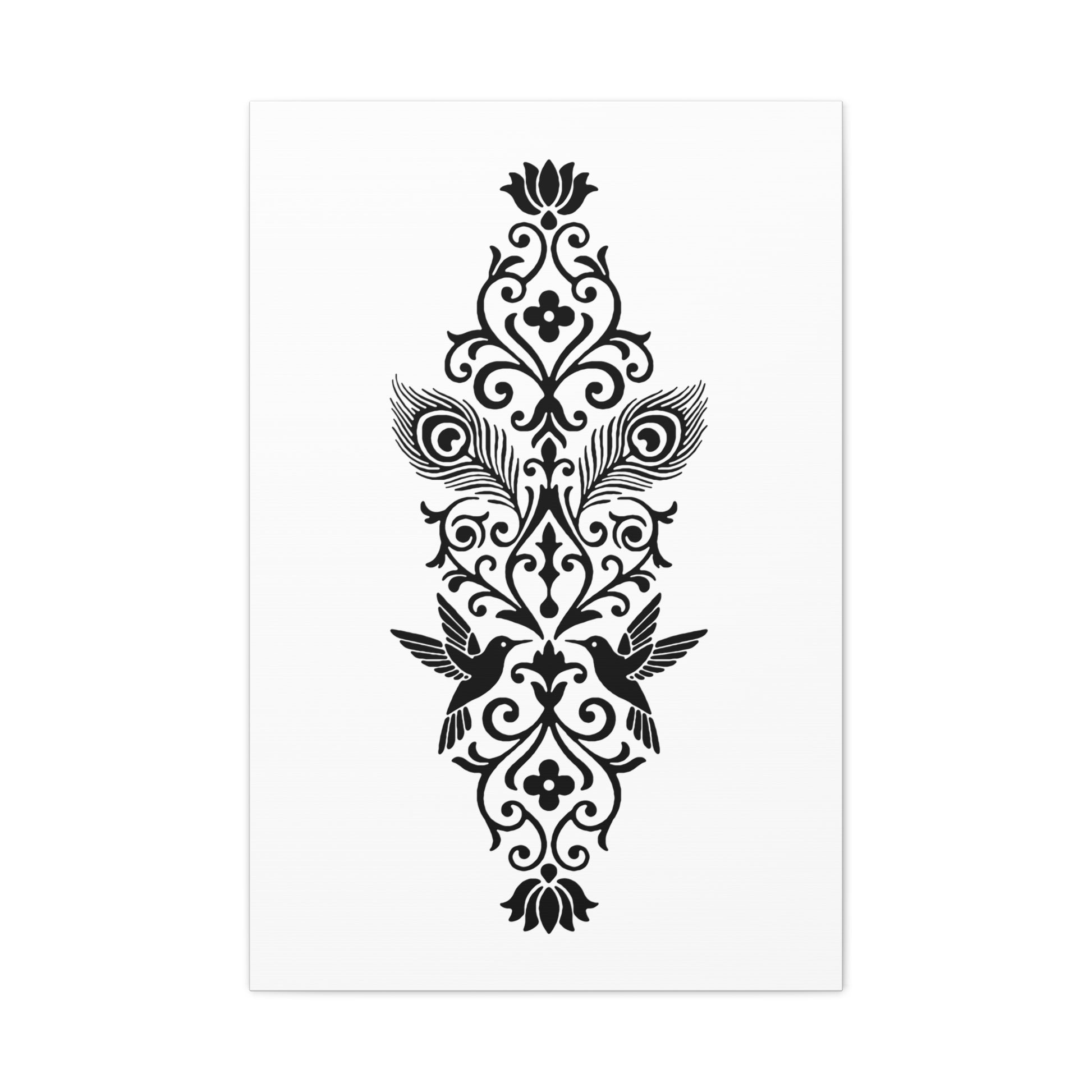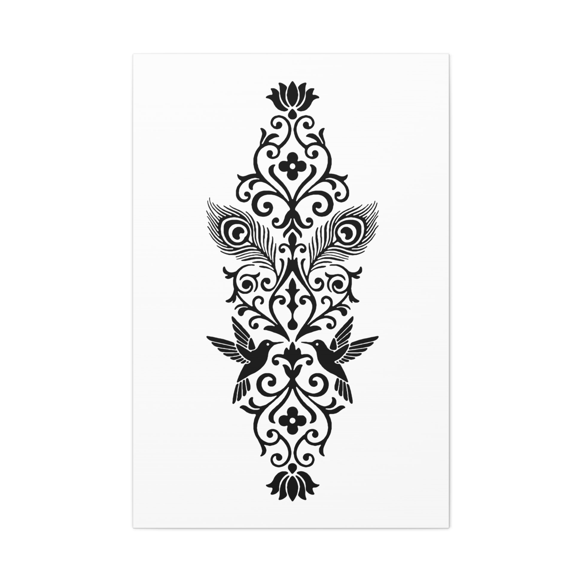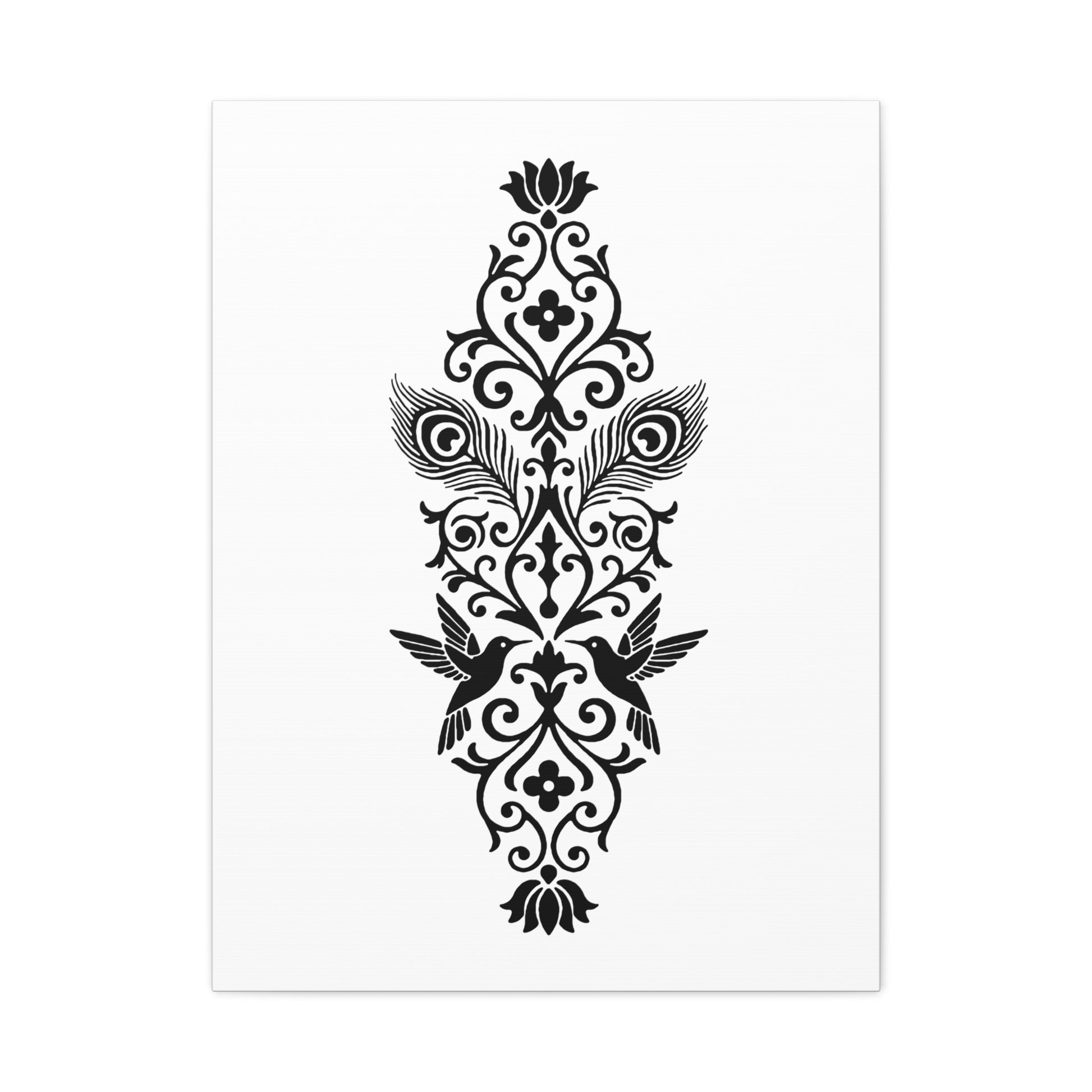 This stretched matte canvas brings quiet, refined elegance to any wall. A vertical, black-and-white ornamental motif—feathered peacock elements and twin hummingbirds—stands out crisply against the clean white ground. The image feels like a hand-applied stencil: delicate curves, repeating floral flourishes, and ink-dark detail that invite a slow, attentive look. Hung in a hallway, bedroom nook, or meditation corner, it calms the room while offering a touch of graphic drama. The narrow, tall format draws the eye upward and pairs naturally with slim picture ledges, grouped frames, or minimalist furniture.