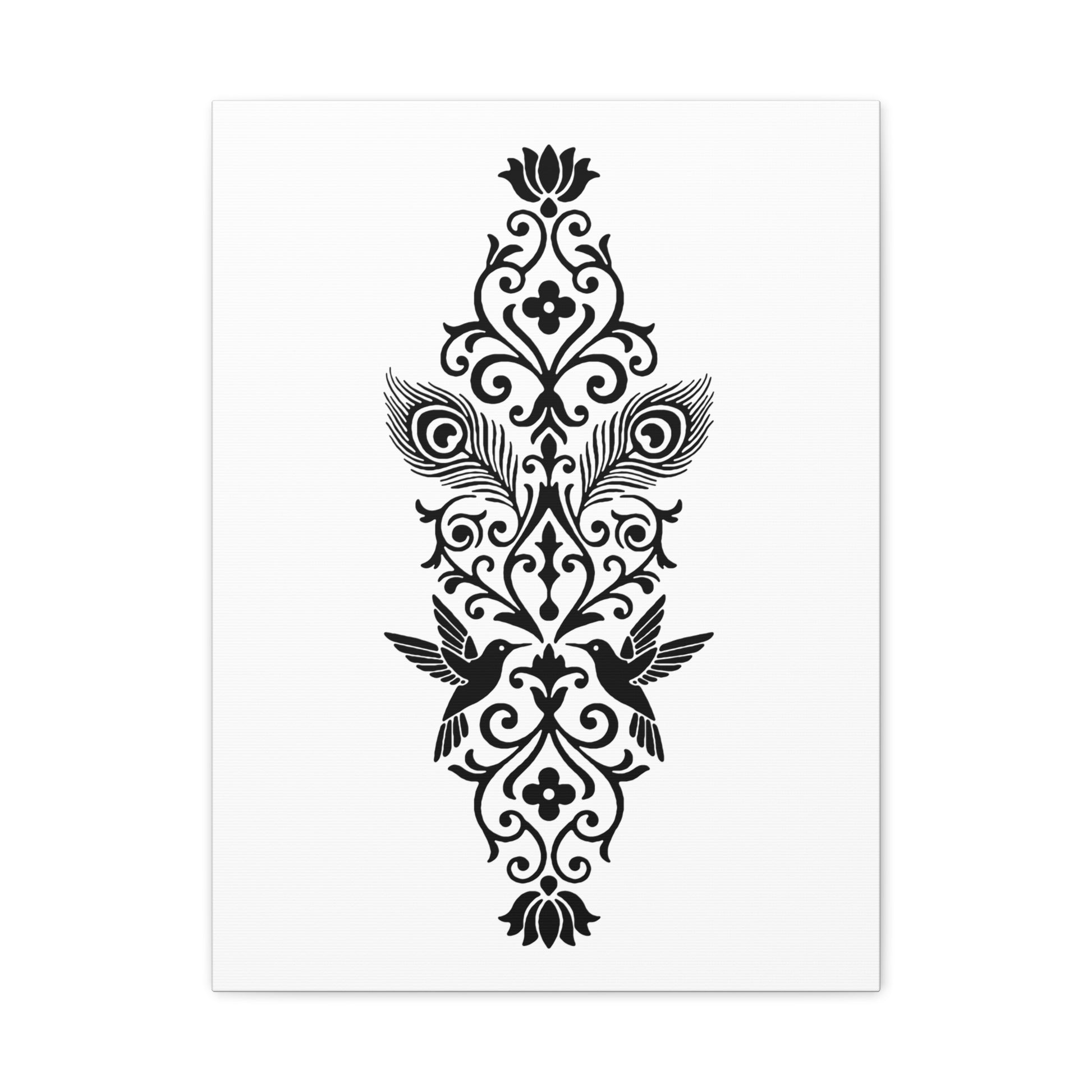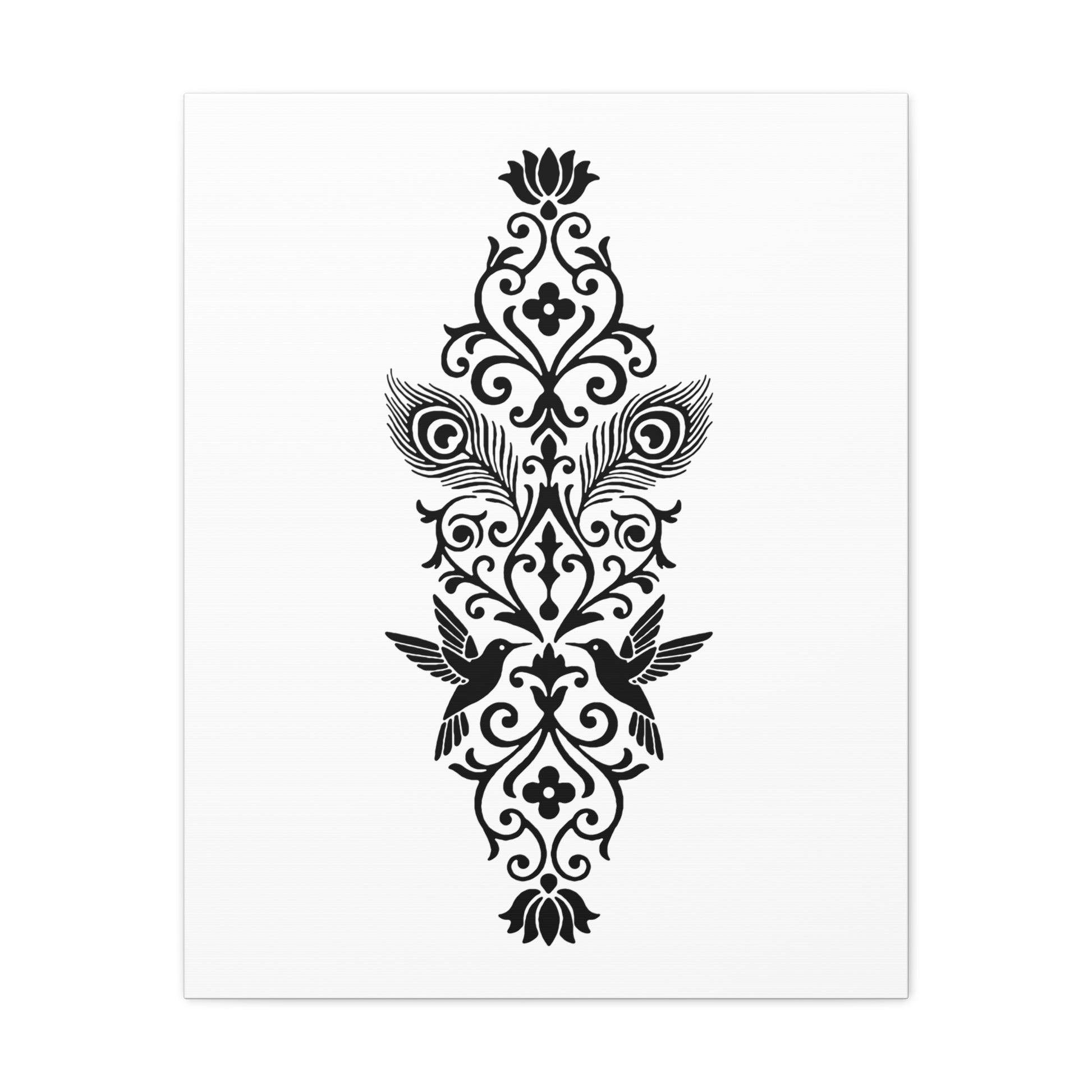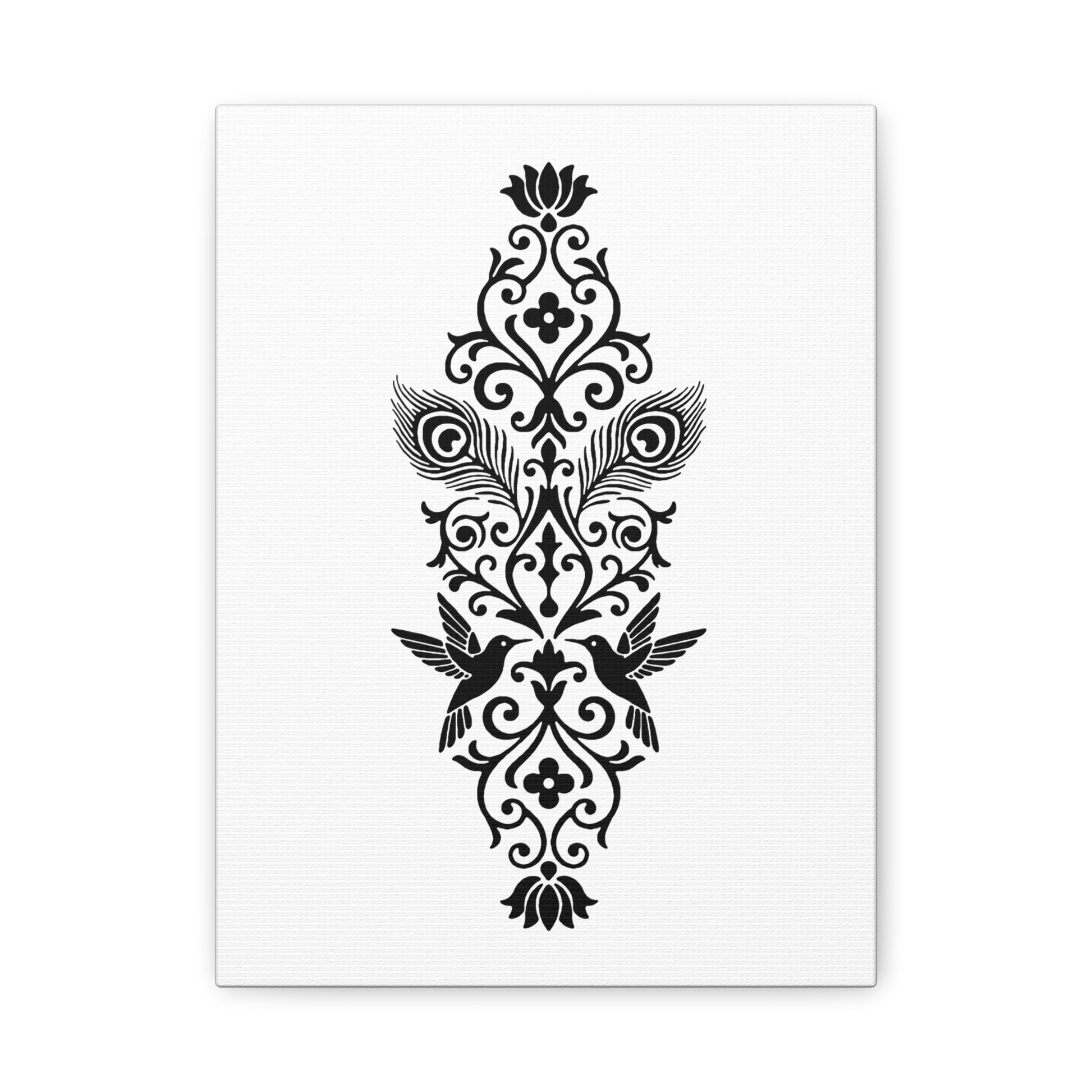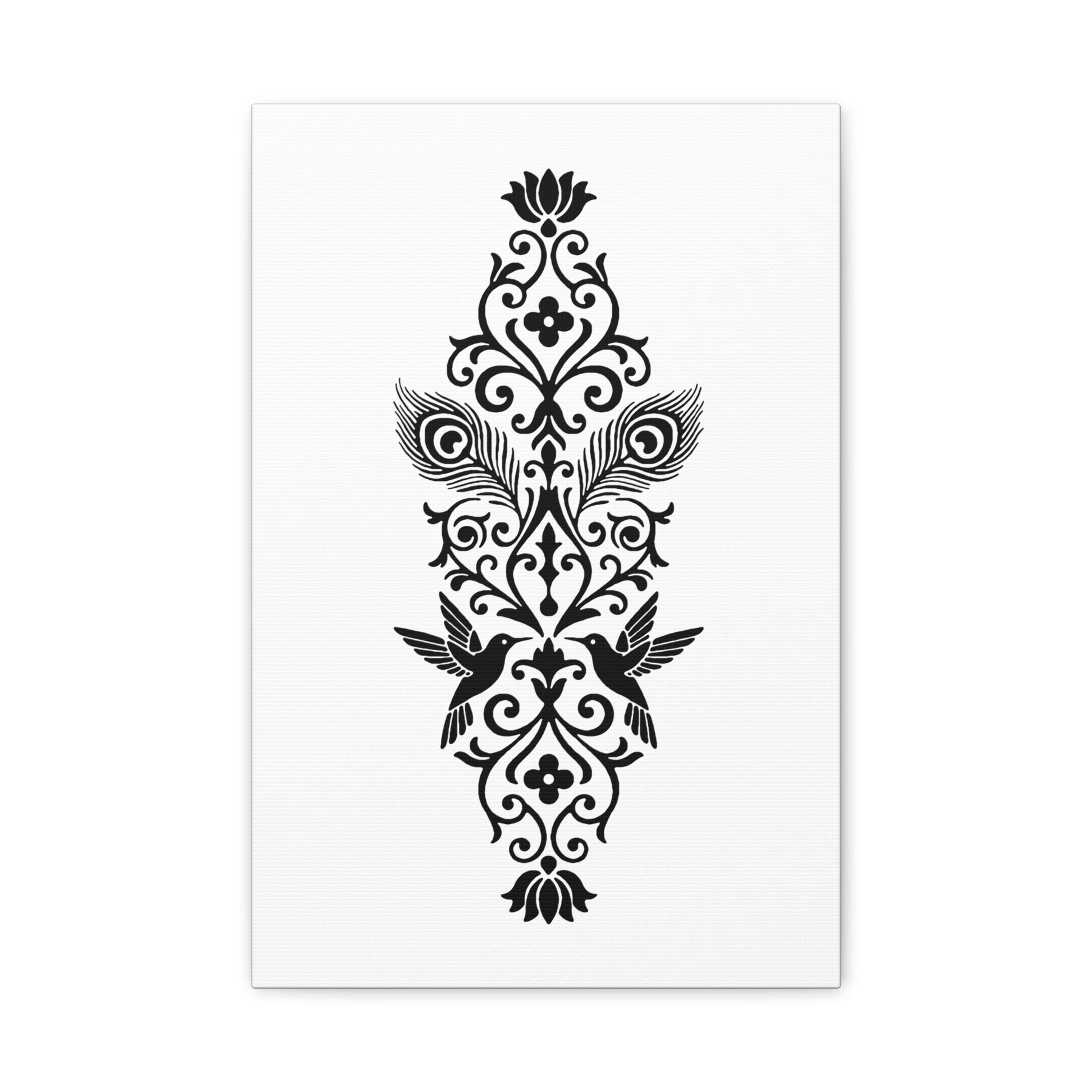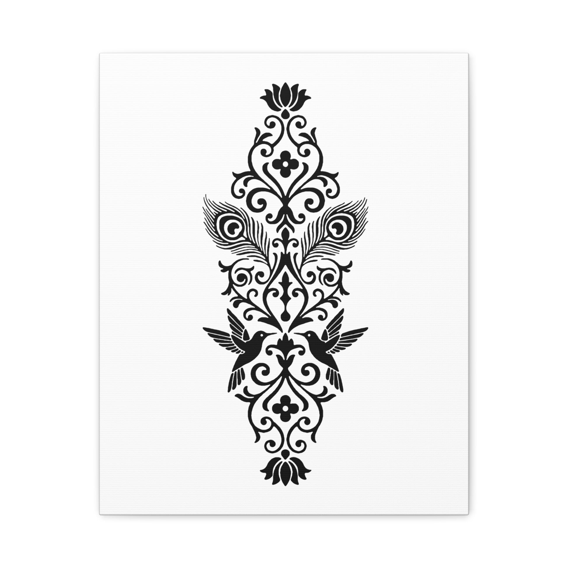 This stretched matte canvas brings quiet, refined elegance to any wall. A vertical, black-and-white ornamental motif—feathered peacock elements and twin hummingbirds—stands out crisply against the clean white ground. The image feels like a hand-applied stencil: delicate curves, repeating floral flourishes, and ink-dark detail that invite a slow, attentive look. Hung in a hallway, bedroom nook, or meditation corner, it calms the room while offering a touch of graphic drama. The narrow, tall format draws the eye upward and pairs naturally with slim picture ledges, grouped frames, or minimalist furniture.