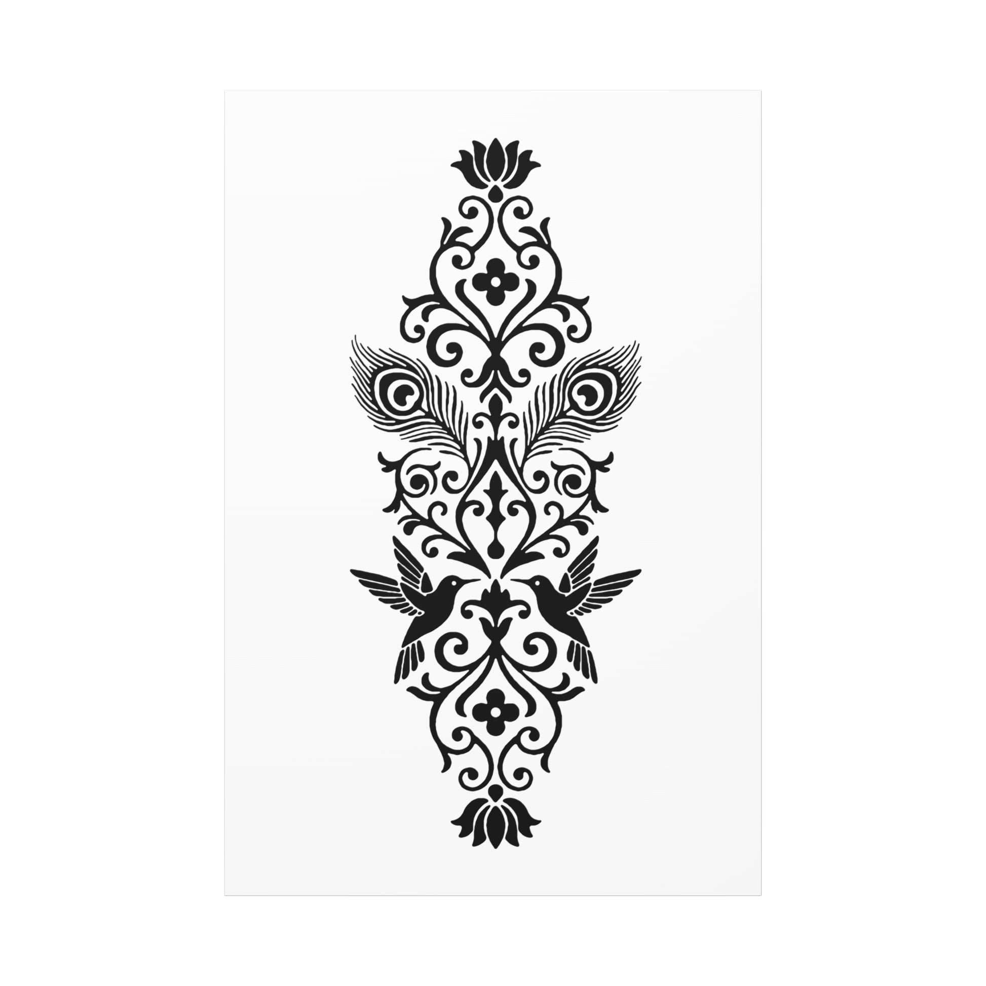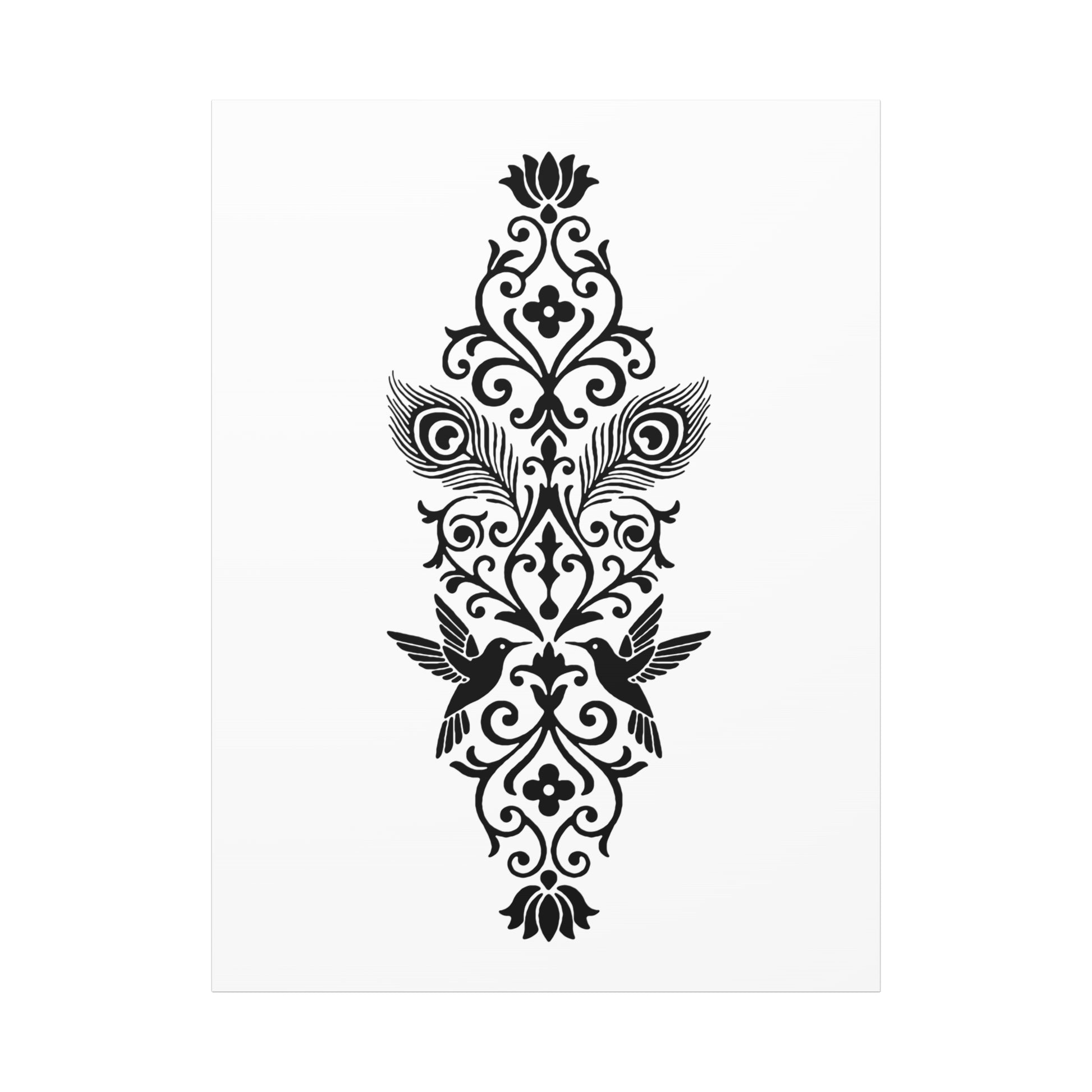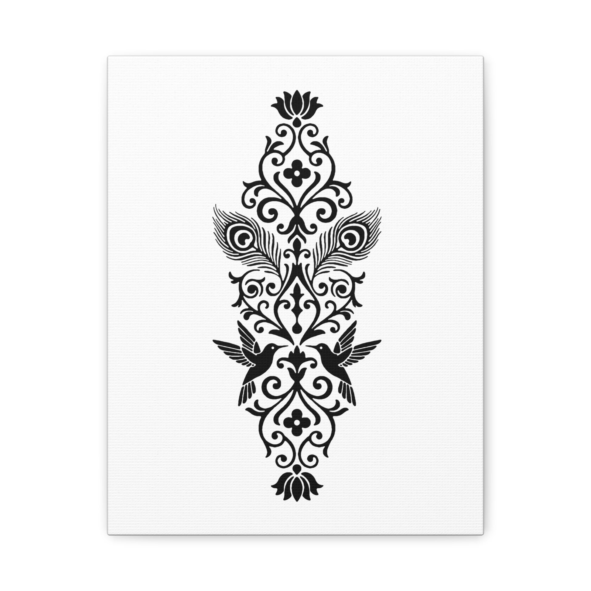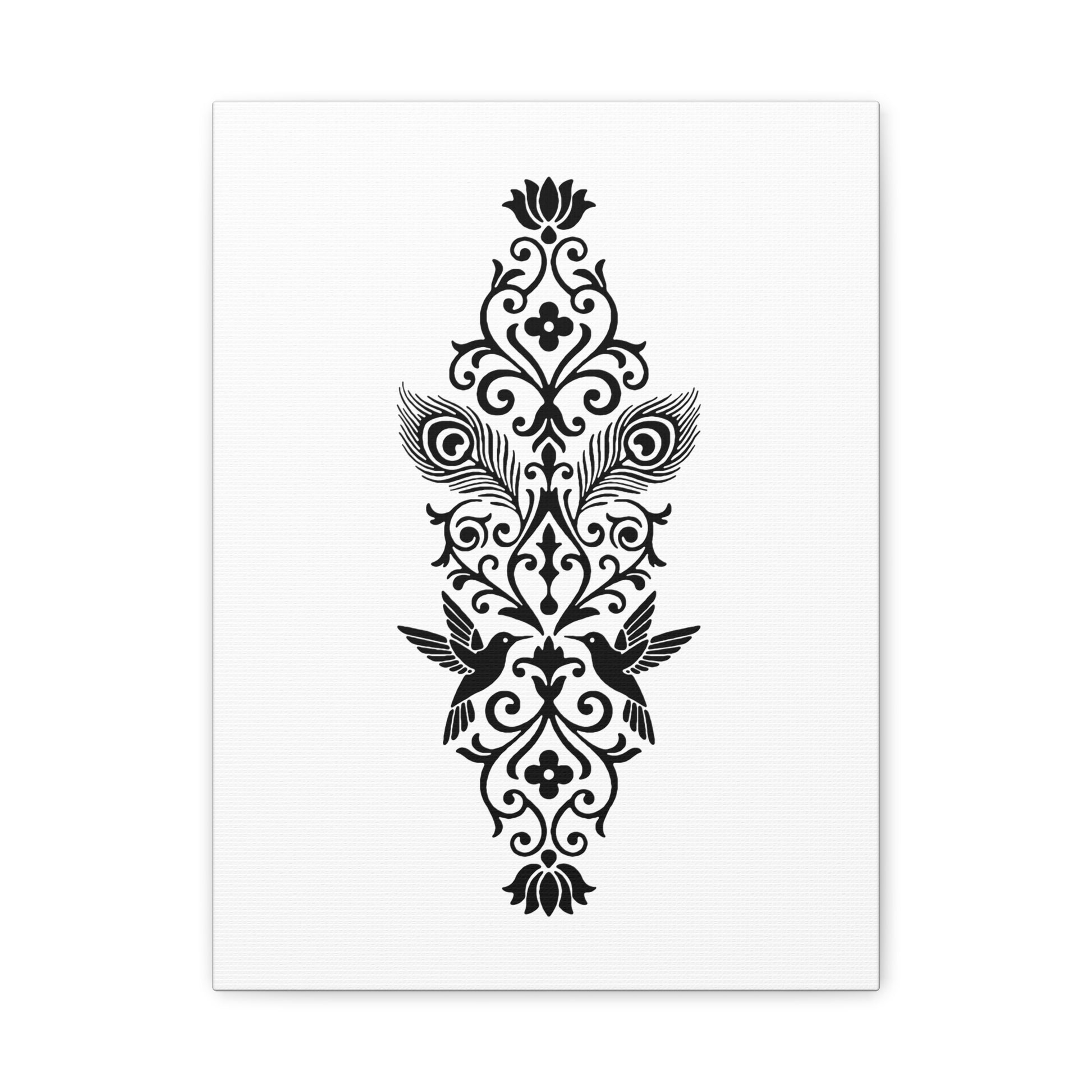 This stretched matte canvas brings quiet, refined elegance to any wall. A vertical, black-and-white ornamental motif—feathered peacock elements and twin hummingbirds—stands out crisply against the clean white ground. The image feels like a hand-applied stencil: delicate curves, repeating floral flourishes, and ink-dark detail that invite a slow, attentive look. Hung in a hallway, bedroom nook, or meditation corner, it calms the room while offering a touch of graphic drama. The narrow, tall format draws the eye upward and pairs naturally with slim picture ledges, grouped frames, or minimalist furniture.