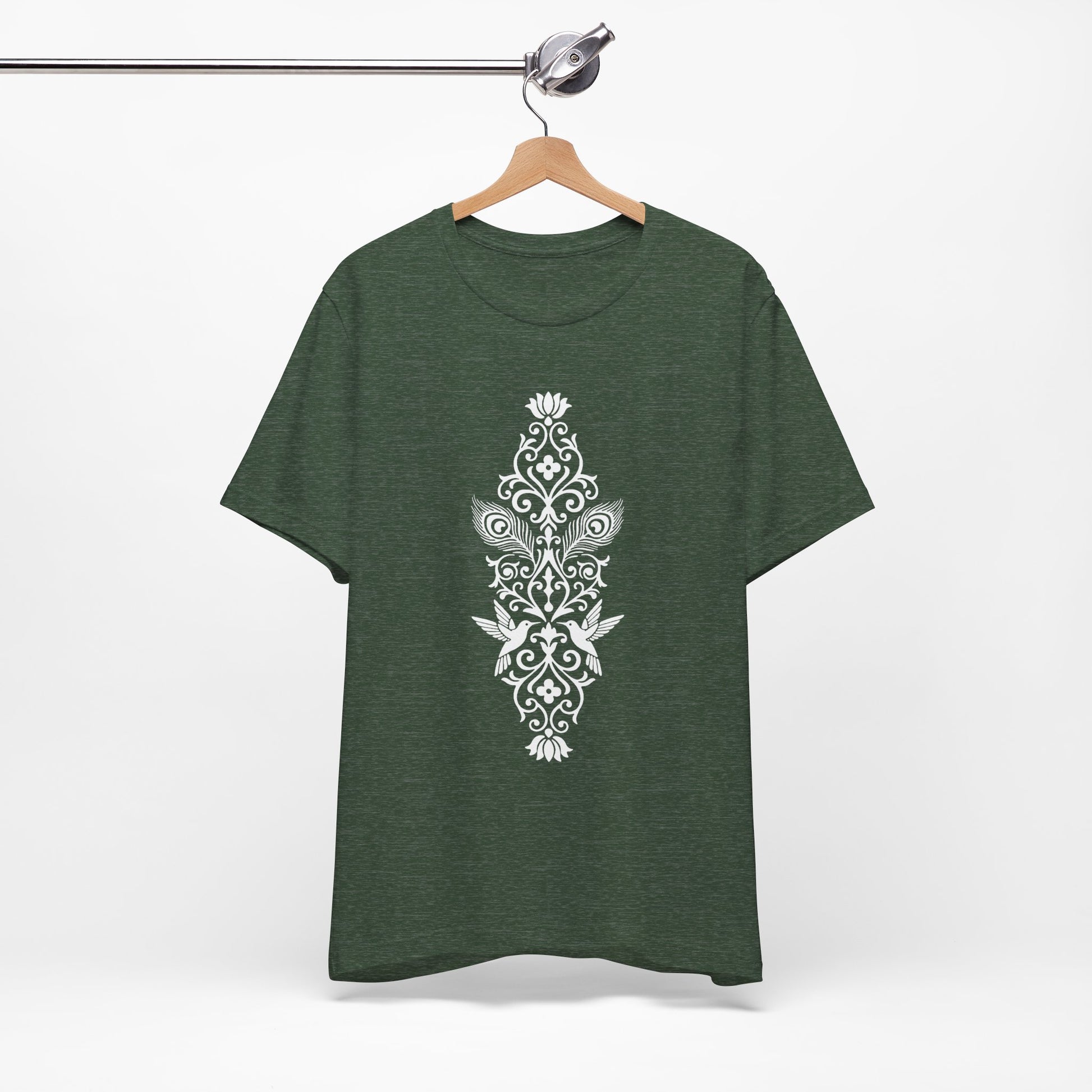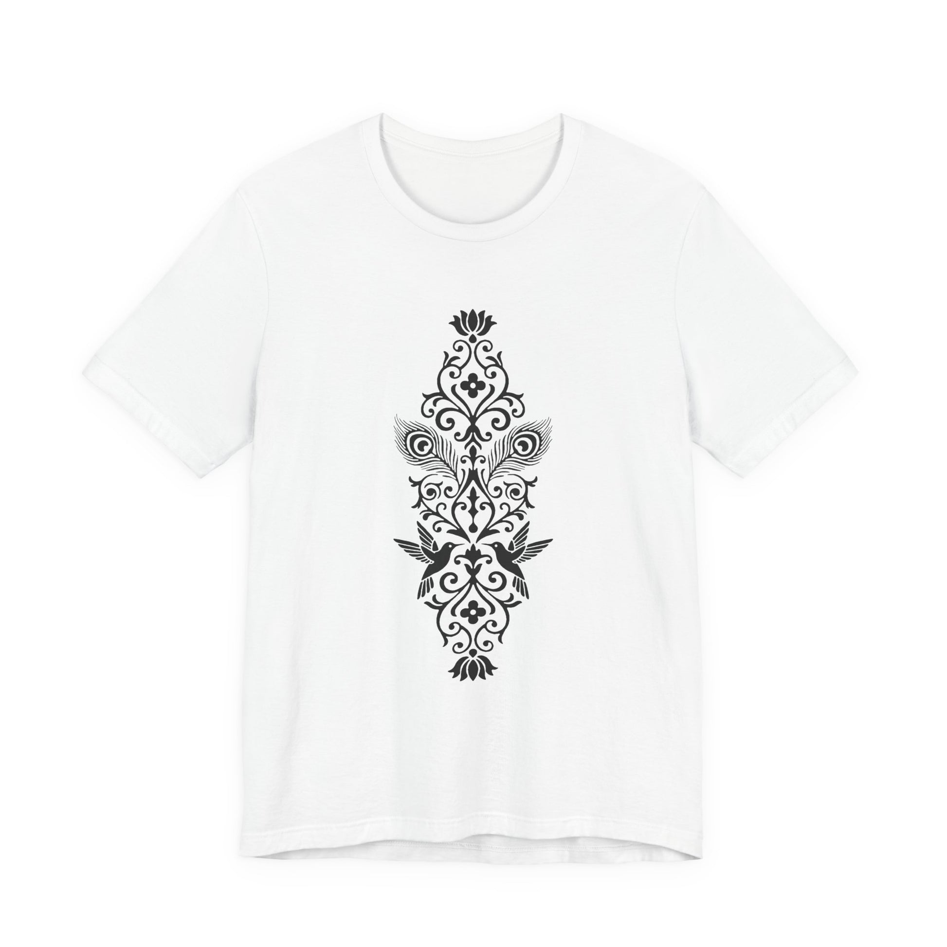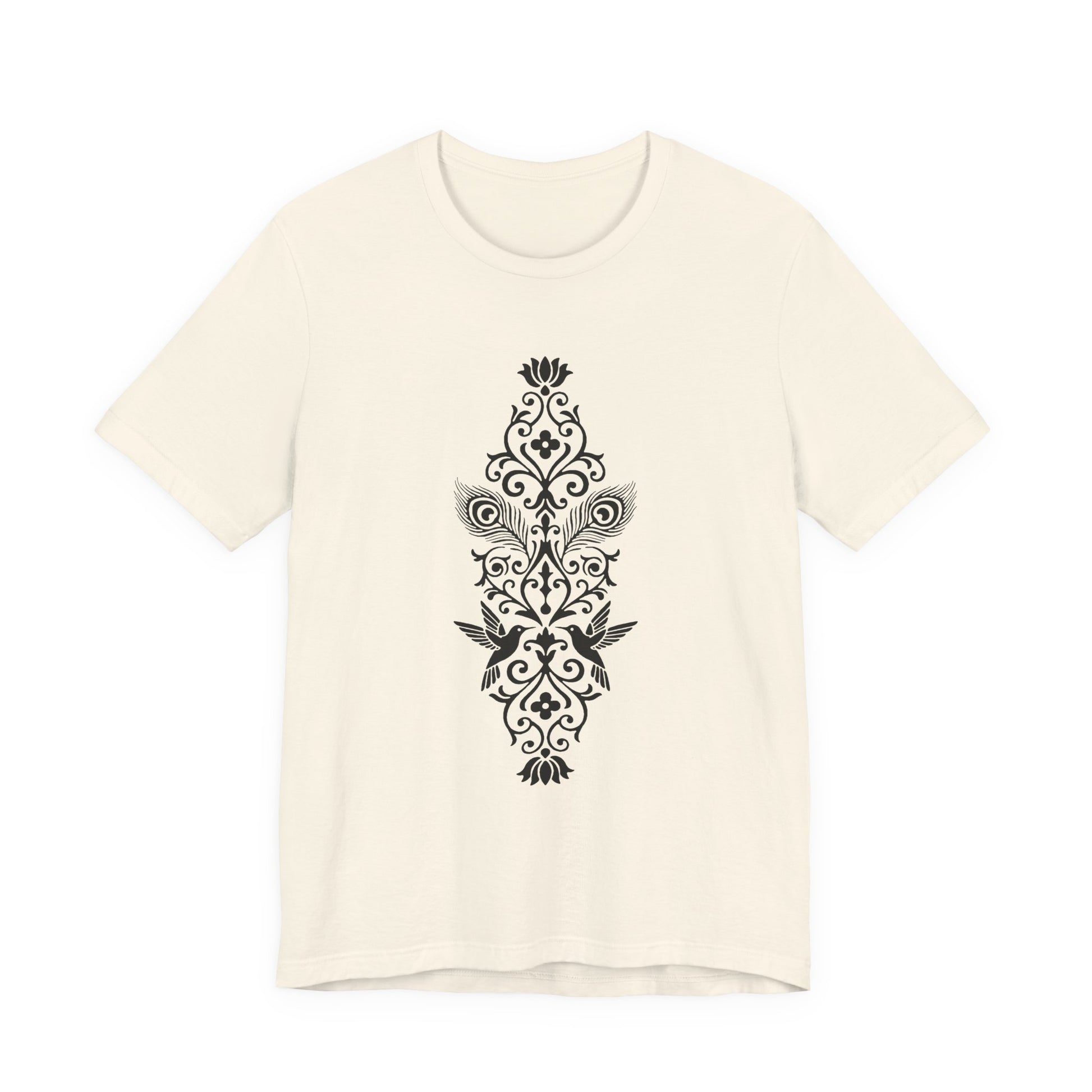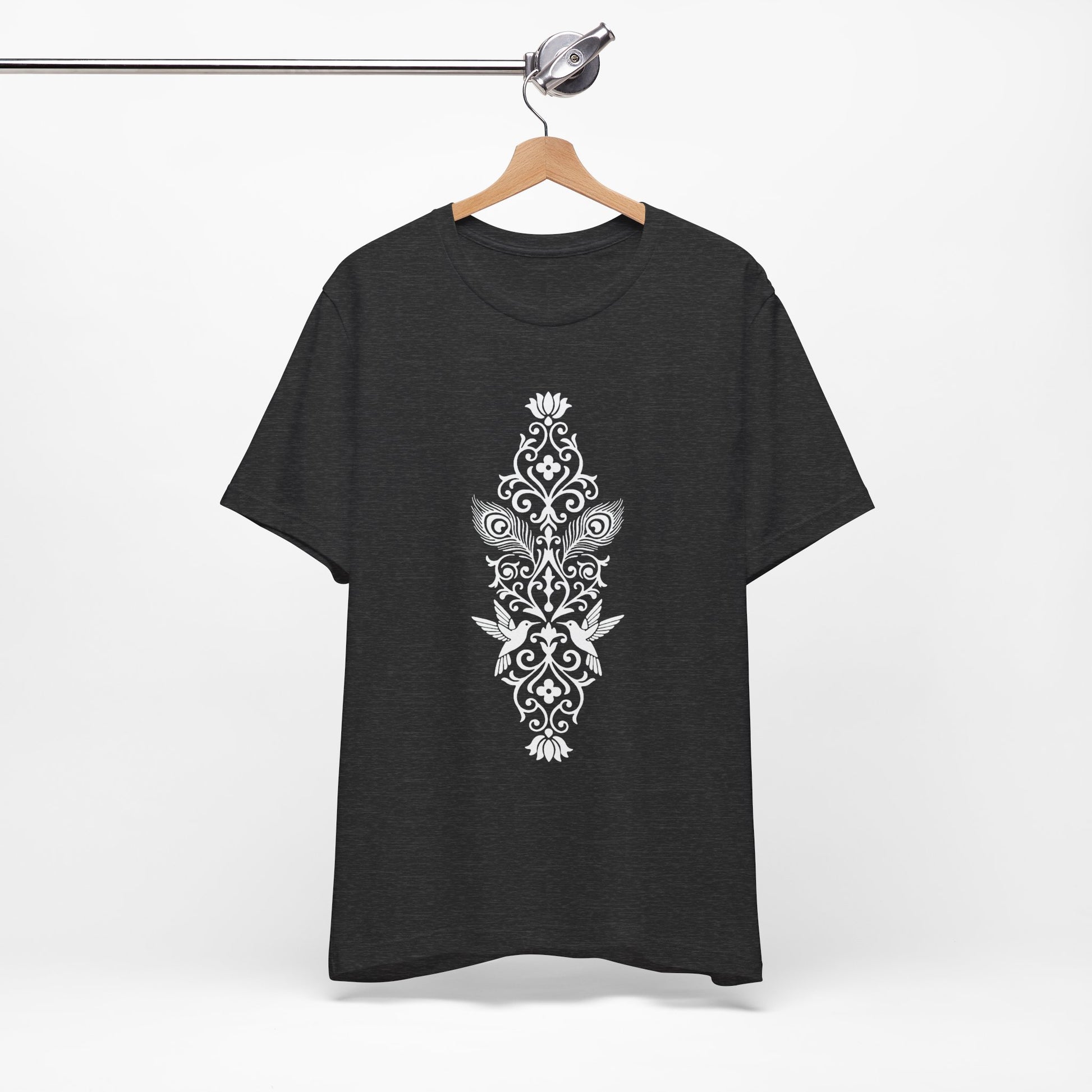 A lightweight, artful tee that balances everyday comfort with quiet sophistication. The soft Airlume combed cotton feels breathable and close to the skin, while the vertical ornate design draws the eye with delicate flourishes and subtle symmetry. Wear it tucked into high-waisted jeans for a casual gallery walk, or layered under a jacket when evenings are cool. The crew neckline and retail fit keep the silhouette neat and intentional, letting the printed motif be the centerpiece. Ethically made and thoughtfully finished, this shirt slips easily into the wardrobe of someone who values craftsmanship and understated style.