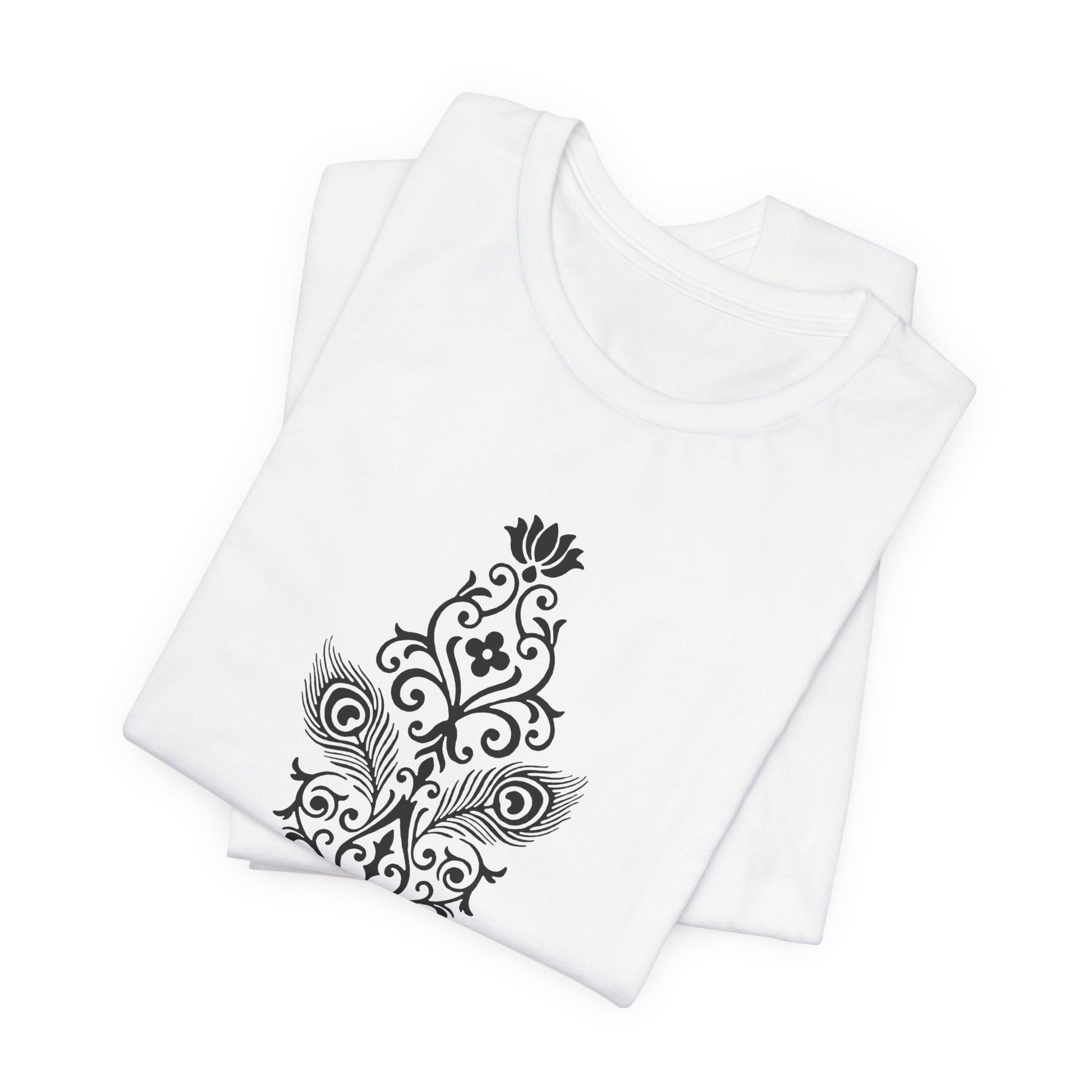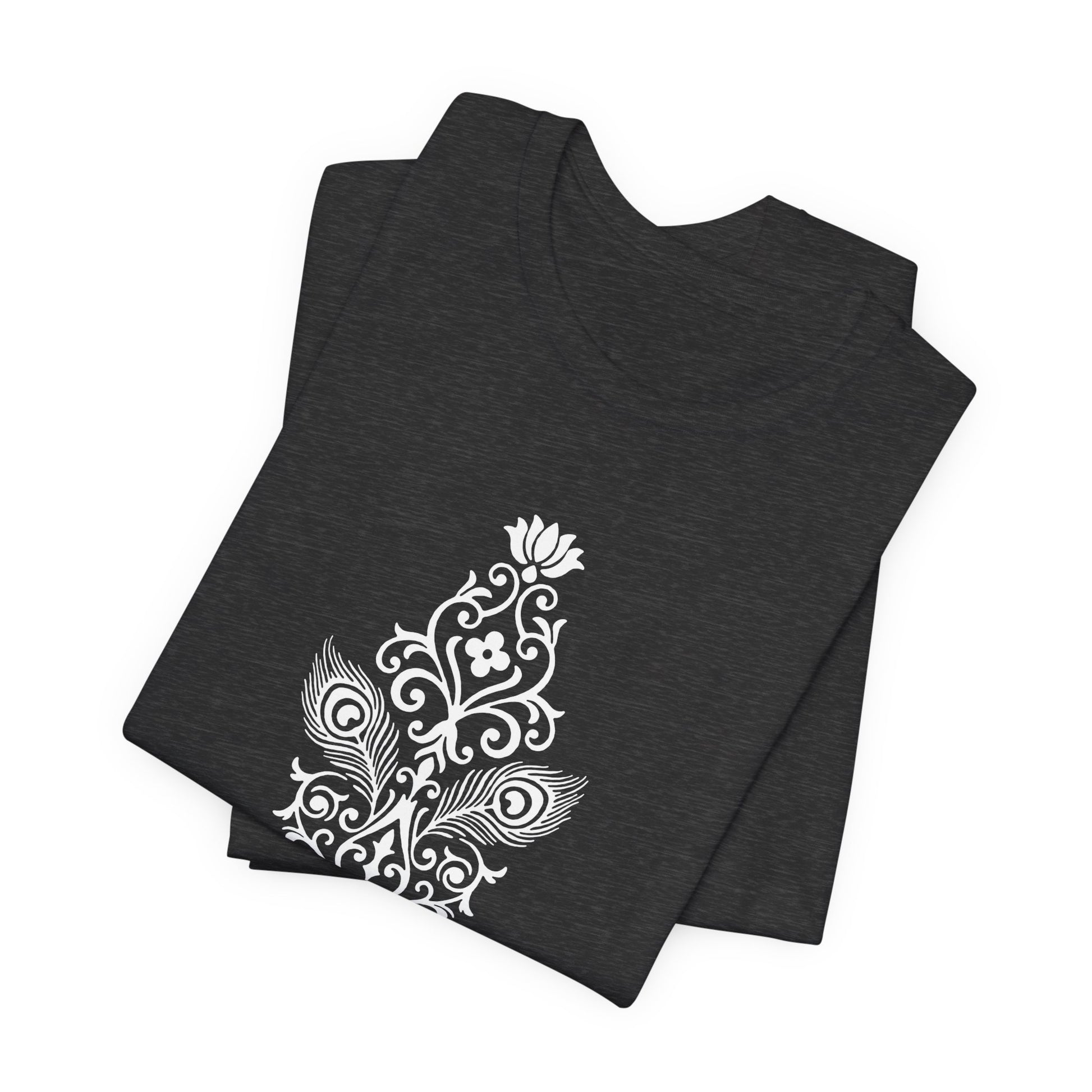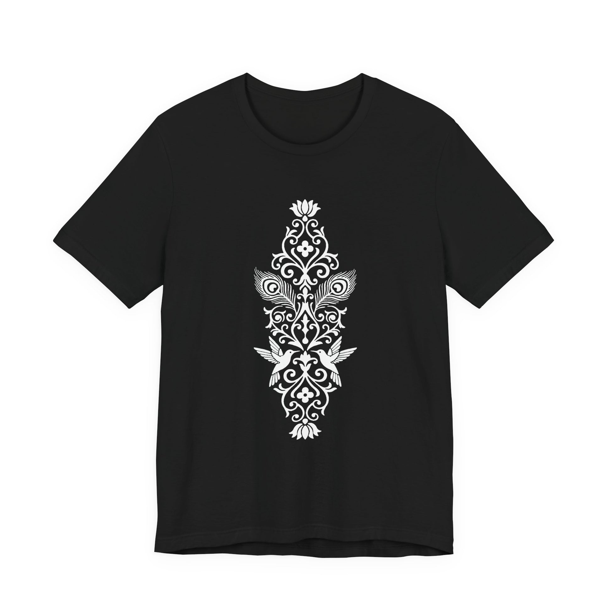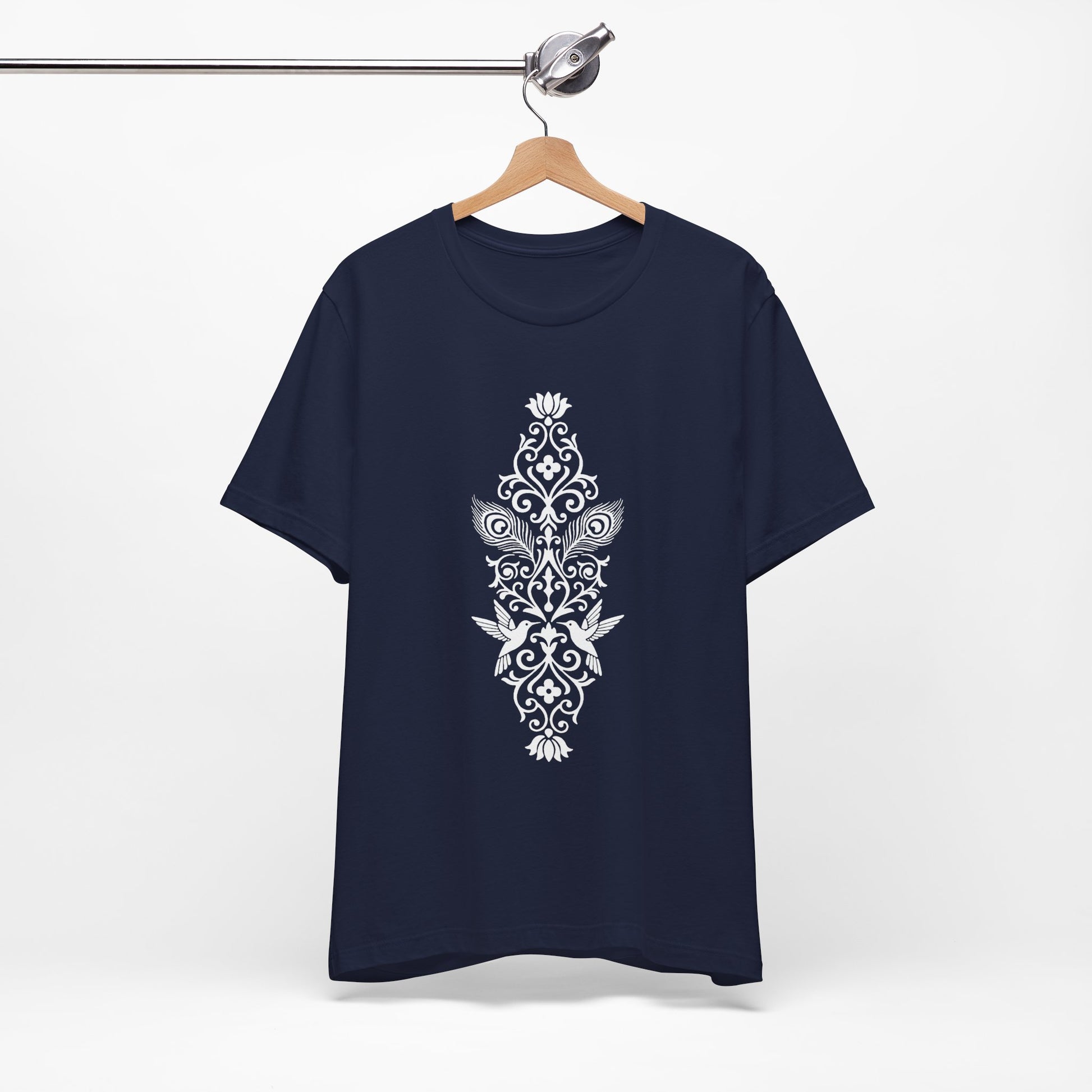 A lightweight, artful tee that balances everyday comfort with quiet sophistication. The soft Airlume combed cotton feels breathable and close to the skin, while the vertical ornate design draws the eye with delicate flourishes and subtle symmetry. Wear it tucked into high-waisted jeans for a casual gallery walk, or layered under a jacket when evenings are cool. The crew neckline and retail fit keep the silhouette neat and intentional, letting the printed motif be the centerpiece. Ethically made and thoughtfully finished, this shirt slips easily into the wardrobe of someone who values craftsmanship and understated style.