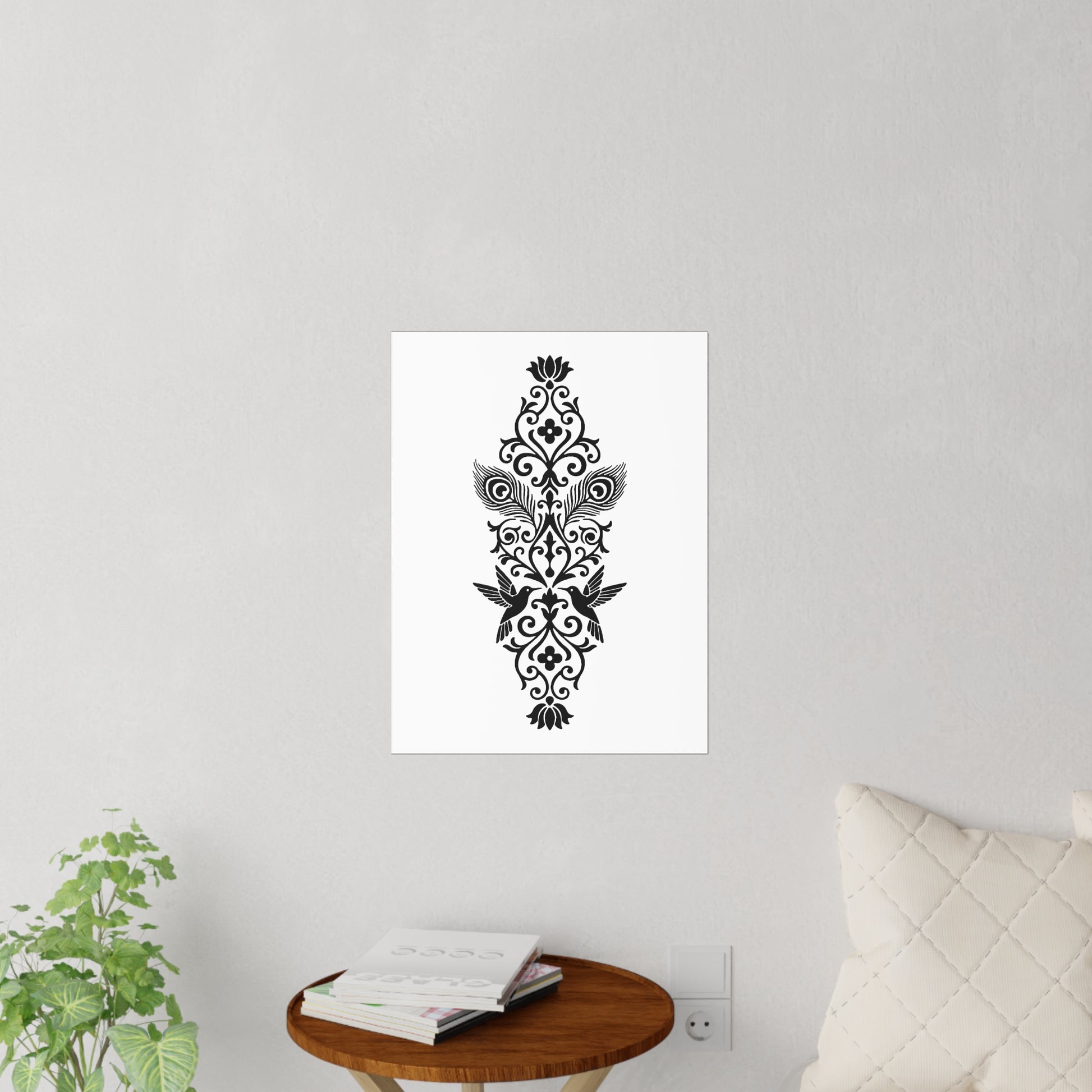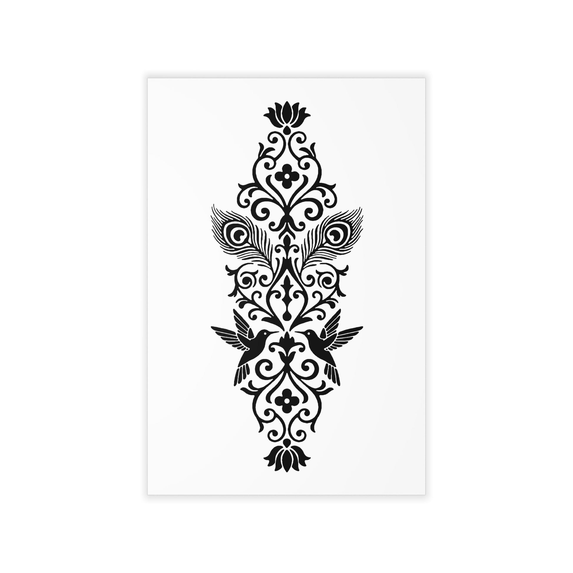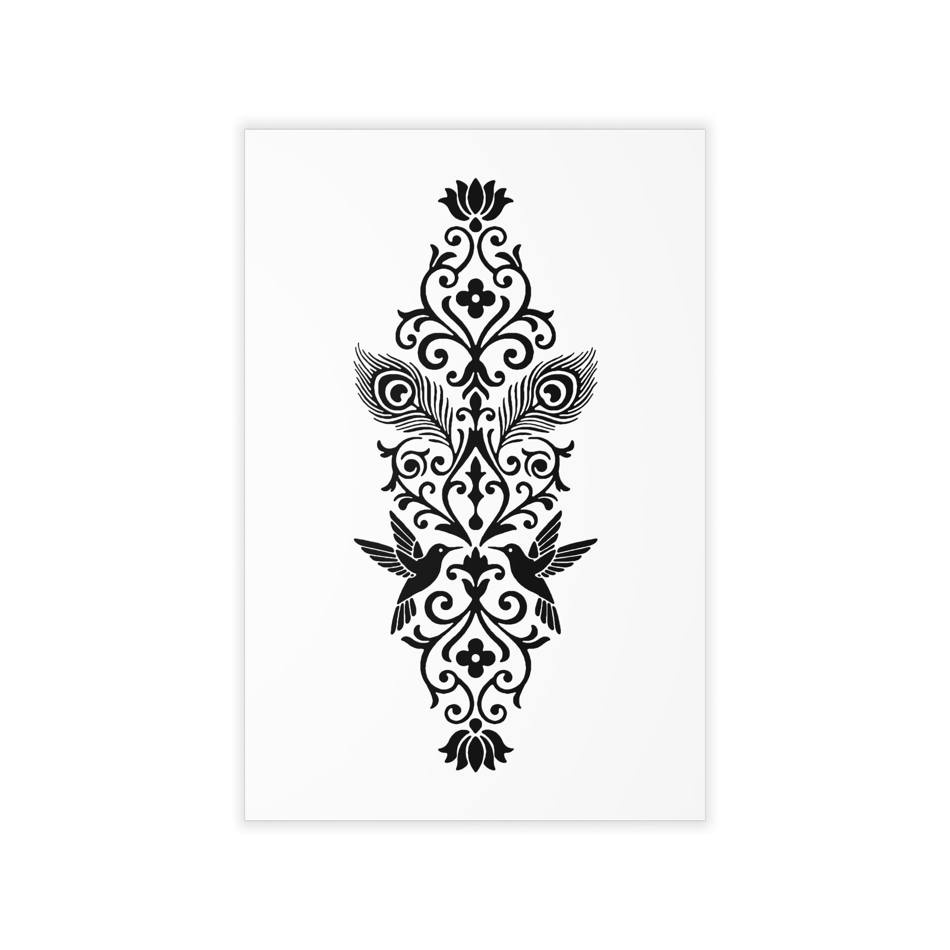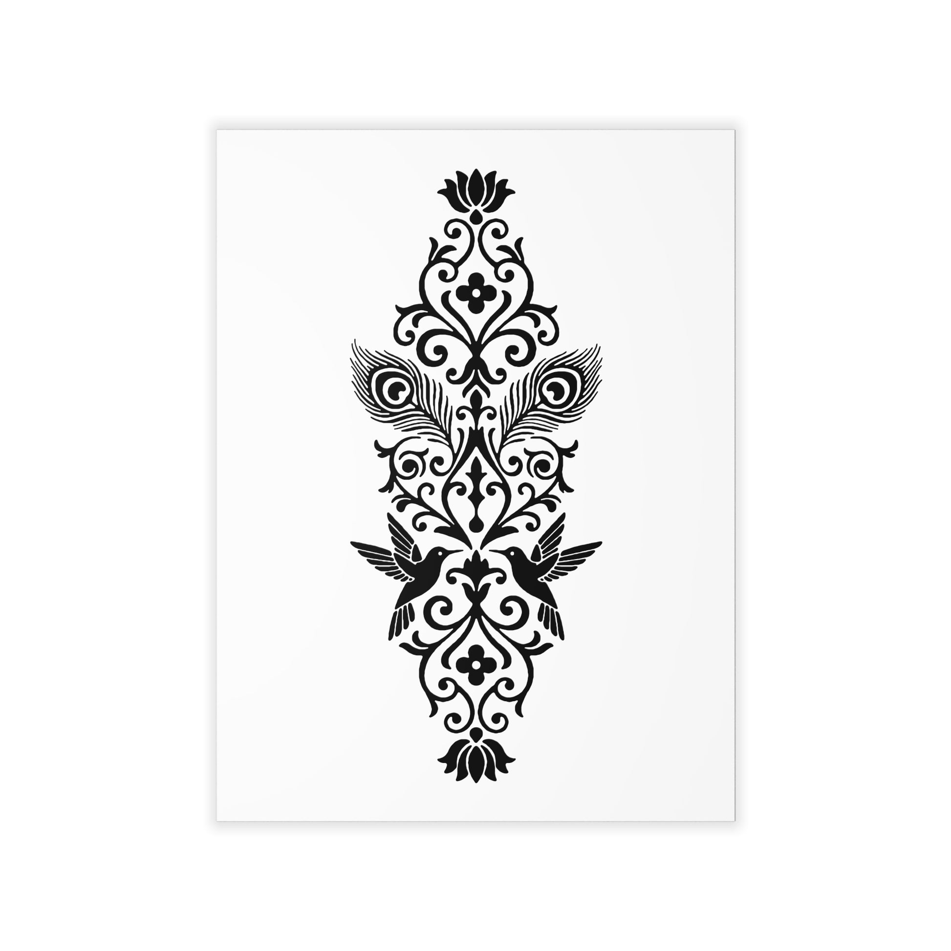 A hand-drawn ornamental wall decal in striking black, inspired by vintage filigree and nature motifs. The tall, vertical design pairs stylized peacock-feather swirls with delicate hummingbirds and floral flourishes to create an elegant focal strip on a blank wall. It brings a quiet, curated energy to entryways, reading nooks, and minimalist living spaces—like a soft, graphic tattoo for your room. Because it’s matte and finely textured, the artwork reads like ink on paper from across the room while adding subtle tactile interest up close. Place it above a console, beside a mirror, or along a stair landing to add a refined, artisanal accent that feels both timeless and contemporary.