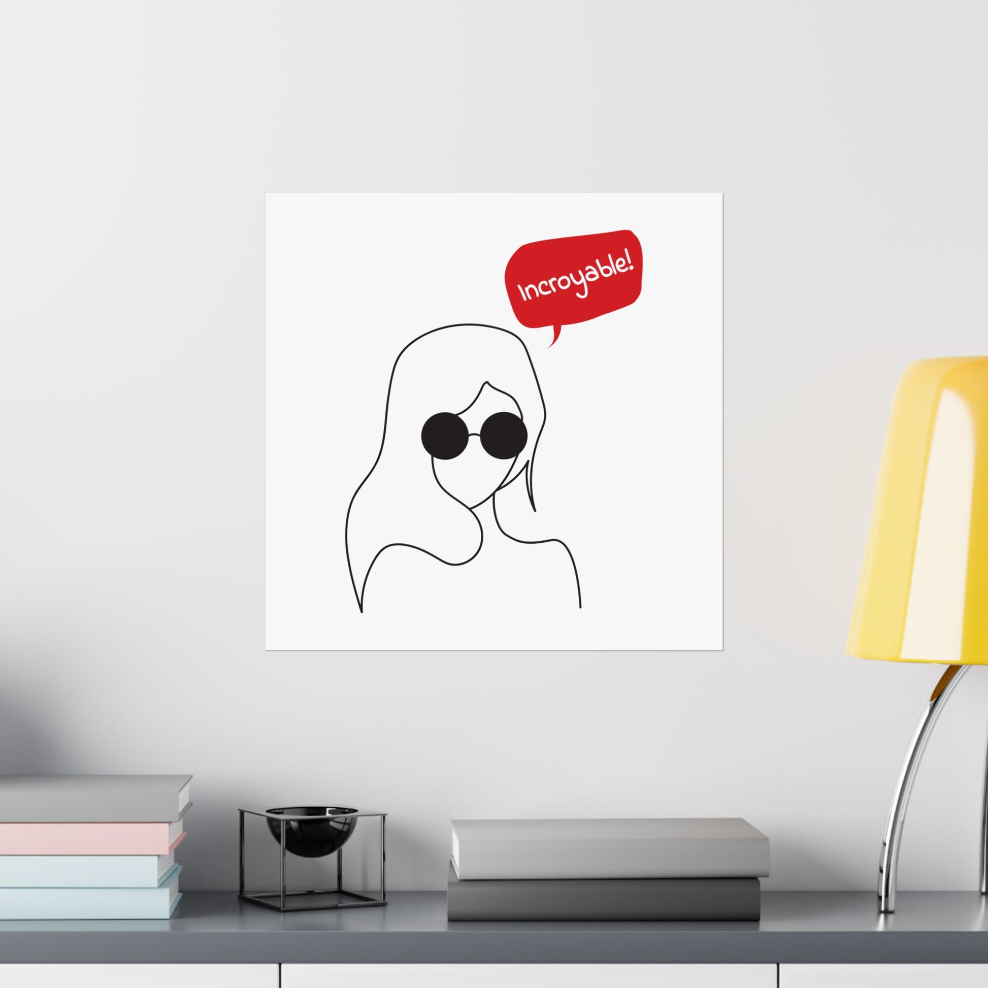 A minimalist matte poster that speaks with subtle style. A single-line illustration of a woman in round sunglasses meets a bold red speech bubble that says “Incroyable!” — clean, contemporary, and playfully confident. Hung over a dresser, framed in a compact gallery wall, or leaned on a shelf, this poster brings a quiet, cosmopolitan energy to small spaces. The matte, museum-grade paper and giclée printing keep lines crisp and colors steady, so the expressive red stays vivid while the soft matte finish reduces glare and keeps the look understated. Choose from many sizes to fit a foyer, bedroom, studio, or office nook.
