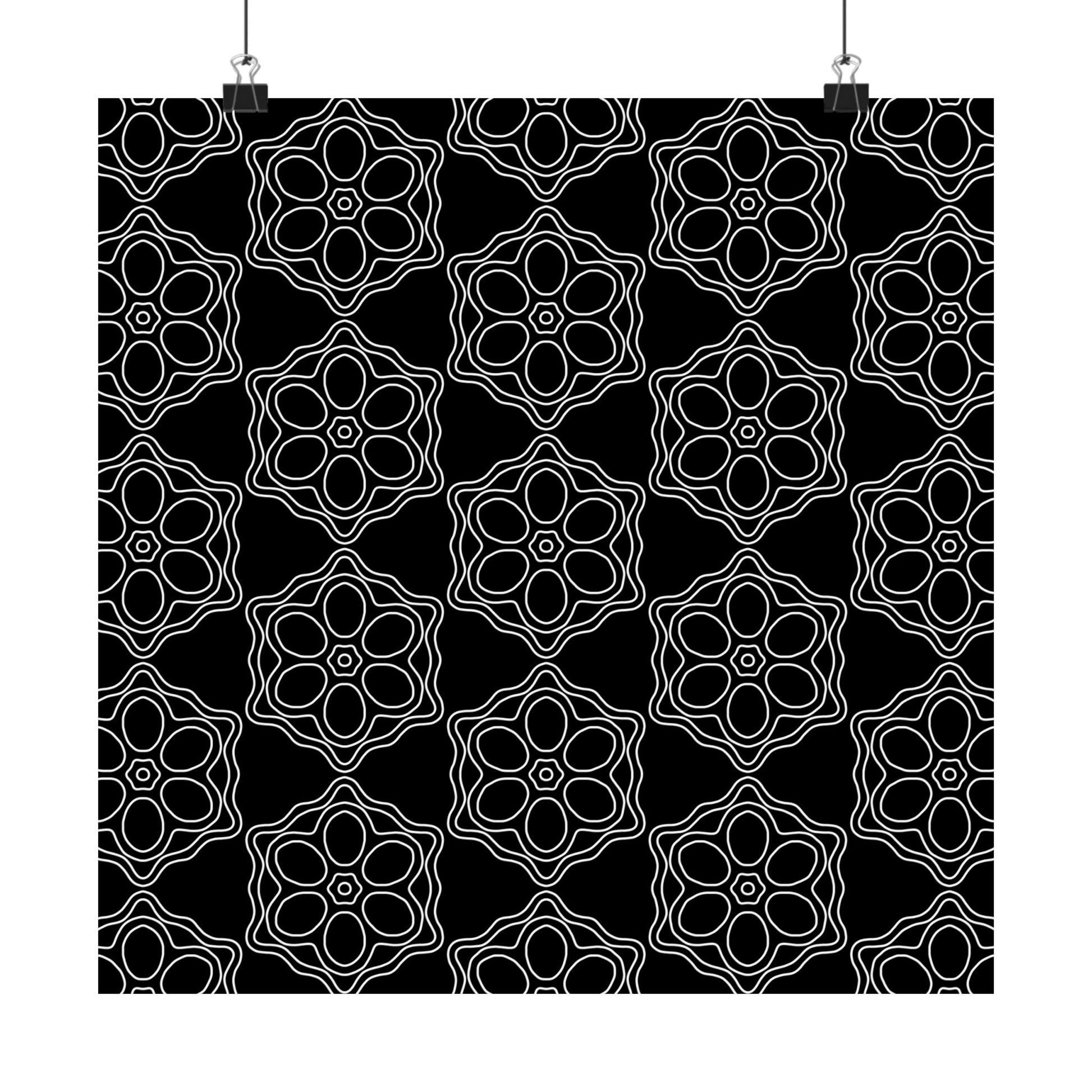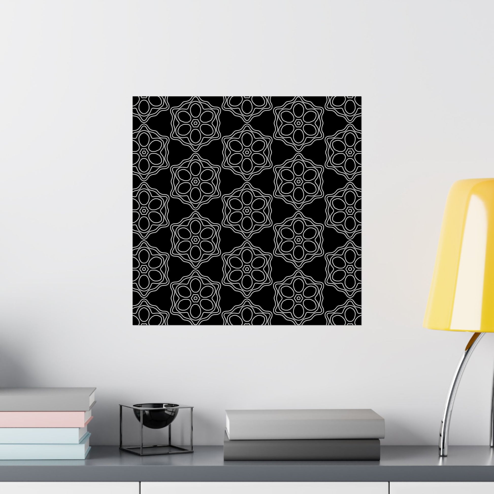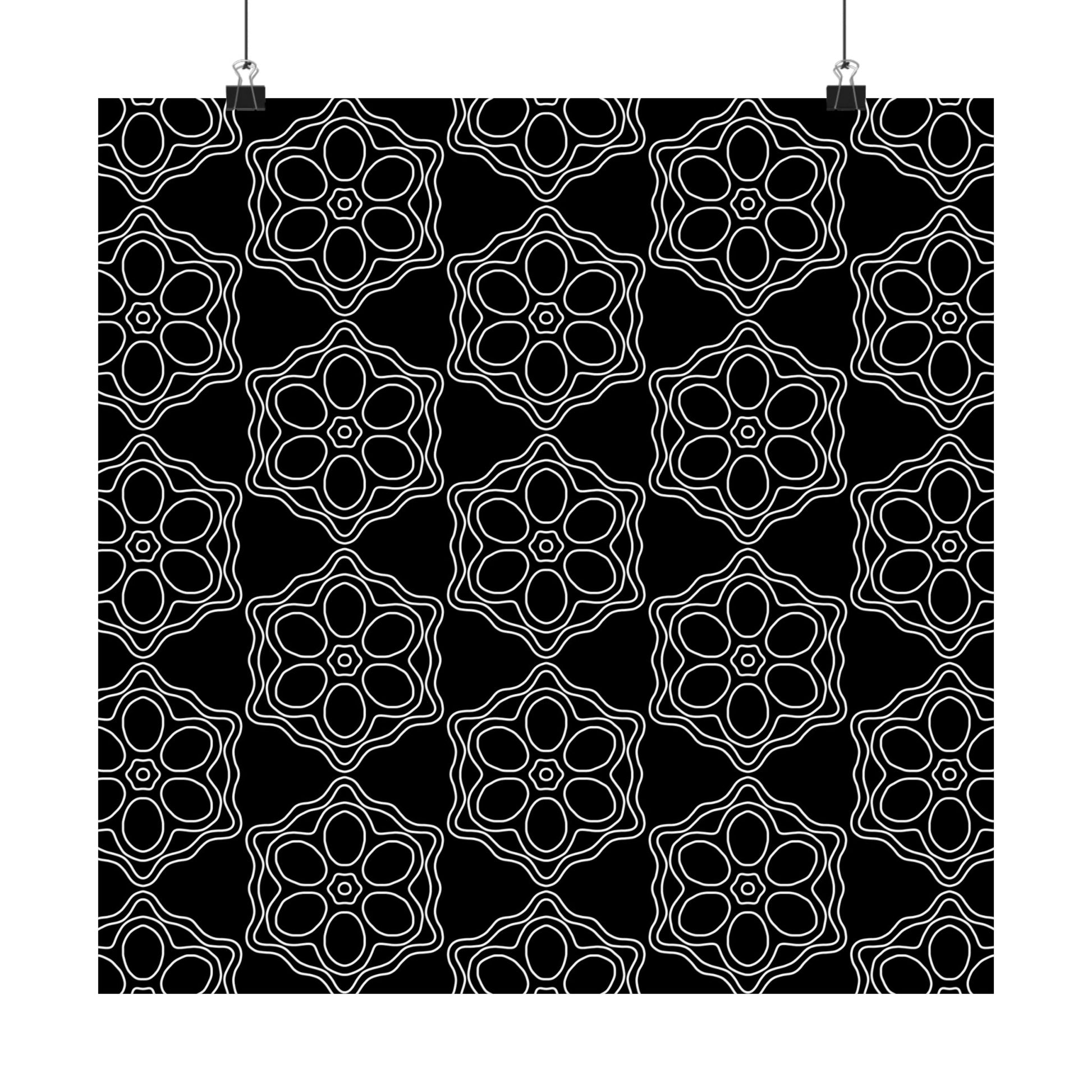 A matte vertical poster that brings calm geometry and subtle contrast to any indoor space. The repeating circular-floral motif in soft gray lines floats over a deep black field, creating a rhythm that feels both modern and meditative. Printed on museum-grade archival paper with vibrant giclée inks, the design keeps its clarity and tone over time without glare thanks to the matte finish. Hang it in a study, gallery wall, or minimalist living room to introduce quiet structure and a refined, slightly moody atmosphere.