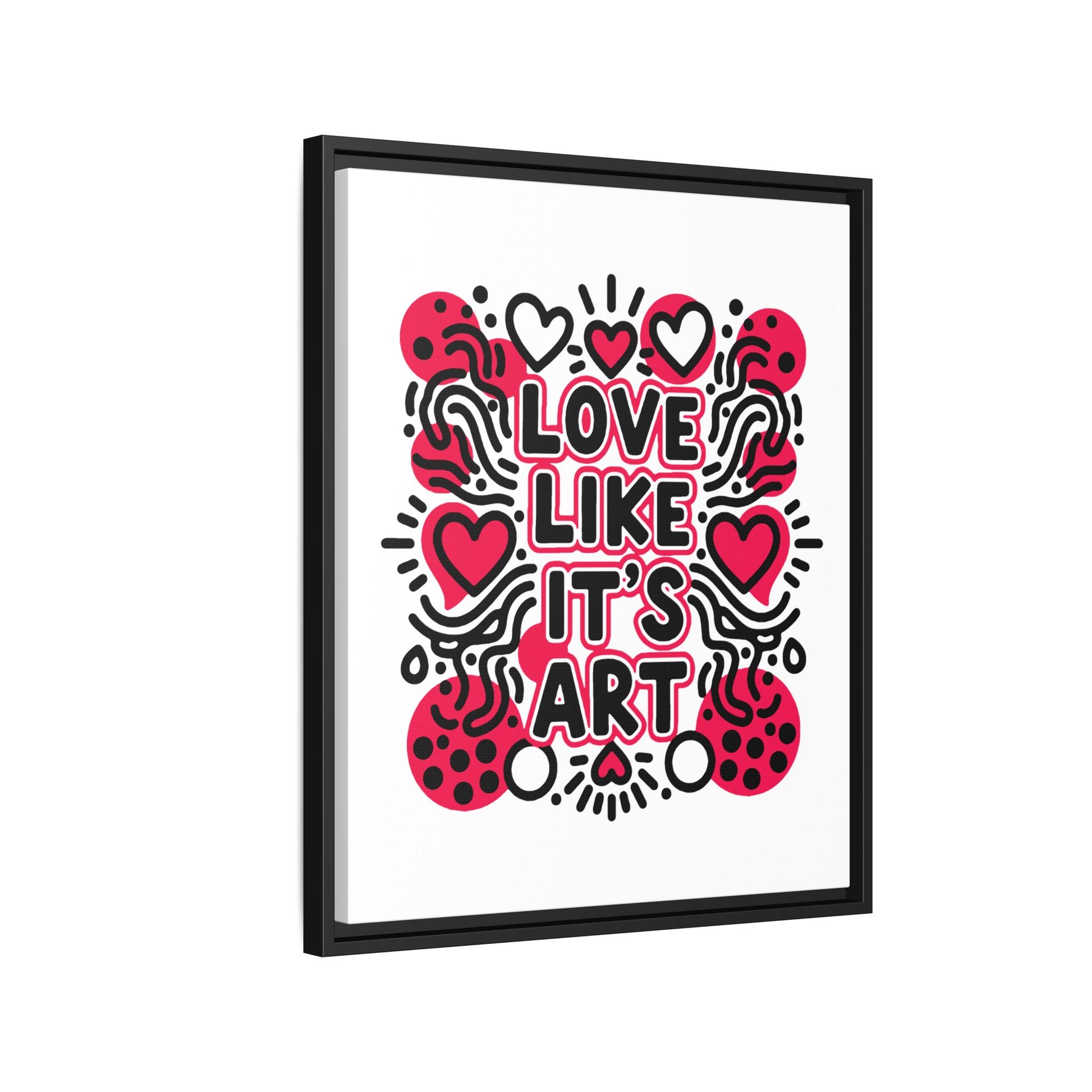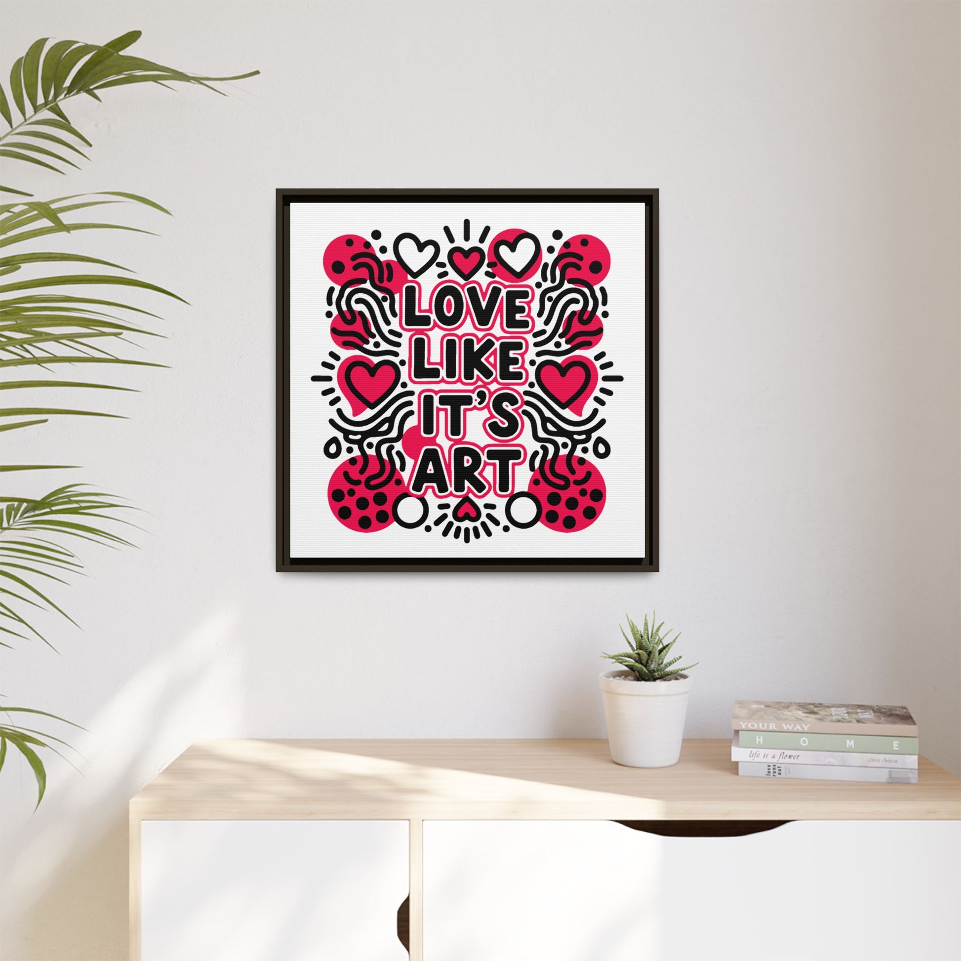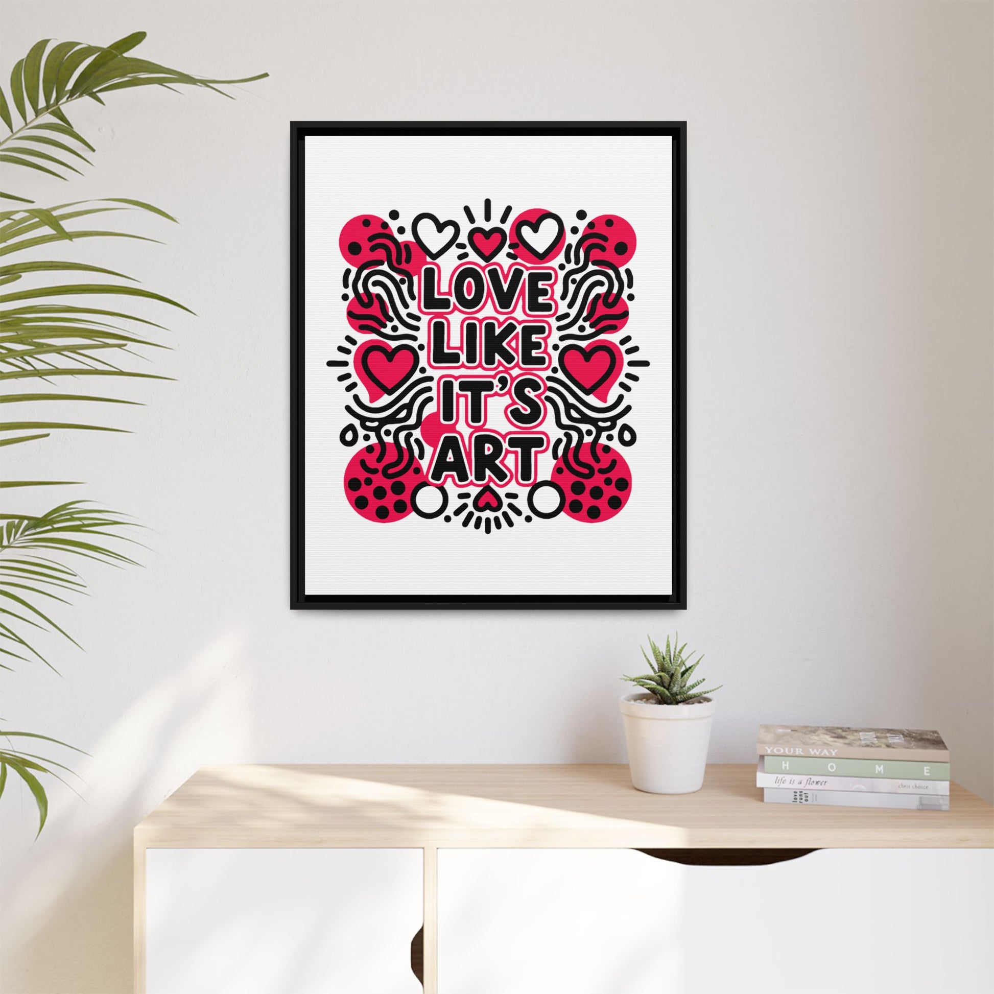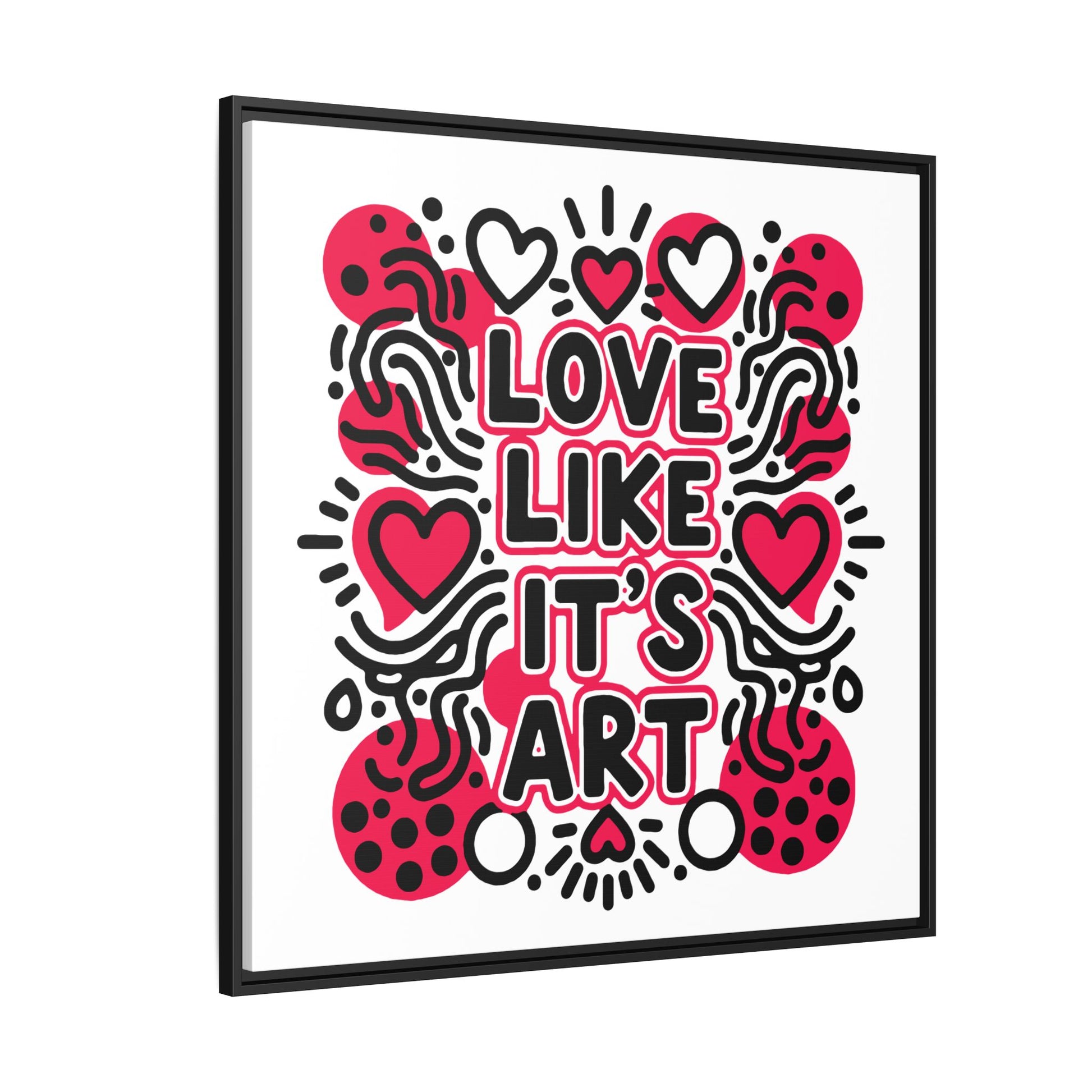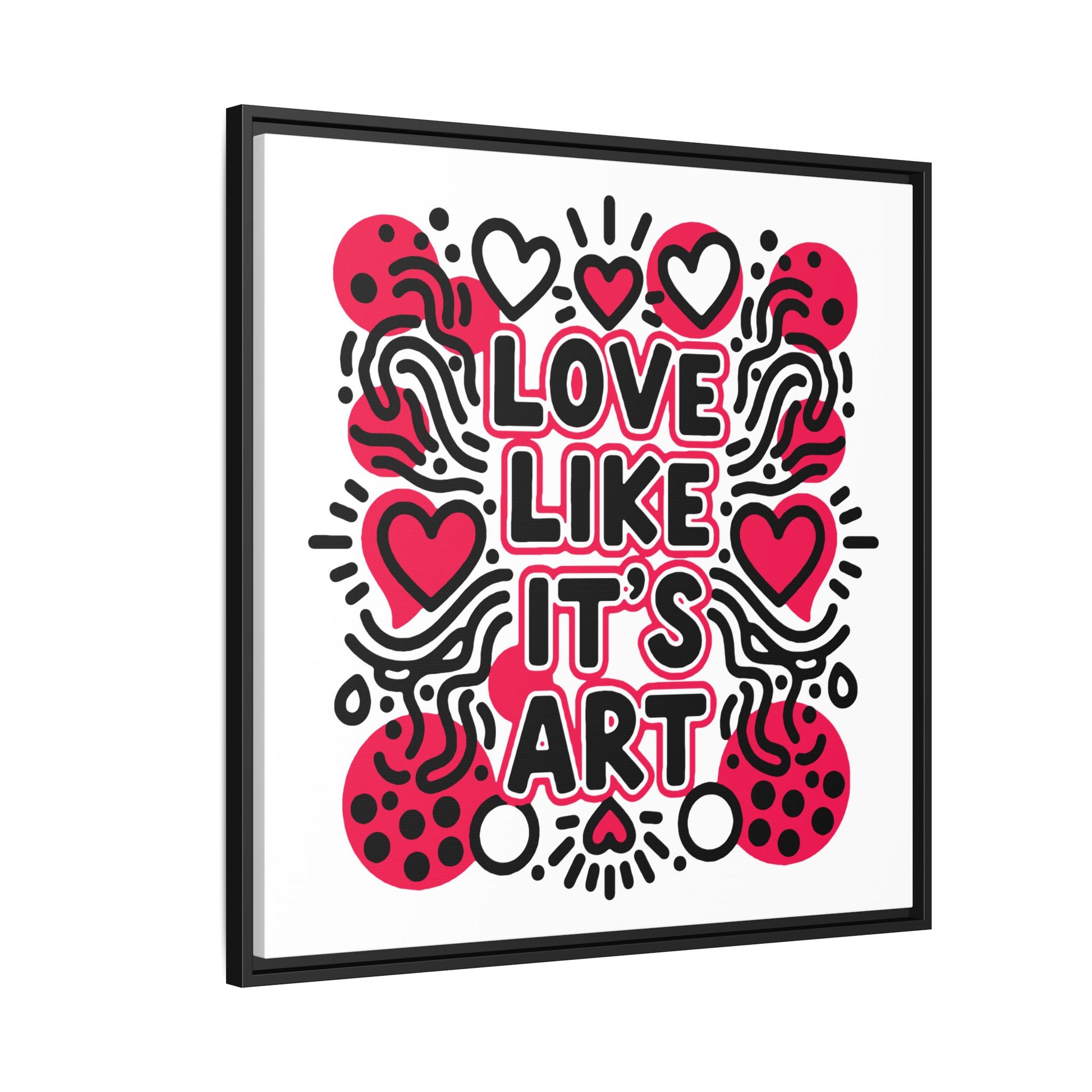 Elevate your space with this vibrant matte canvas, framed. Featuring a lively design that reads "Love Like It's Art," this piece radiates creativity and joy, making it a perfect addition to any home. Whether hung in a cozy living room, a modern office, or a playful studio, it evokes a sense of passion and inspiration. This product appeals to art enthusiasts, couples celebrating love, and anyone looking to add a splash of color to their decor. Ideal for Valentine's Day, anniversaries, art-themed events, or simply as a daily reminder to embrace creativity in life.