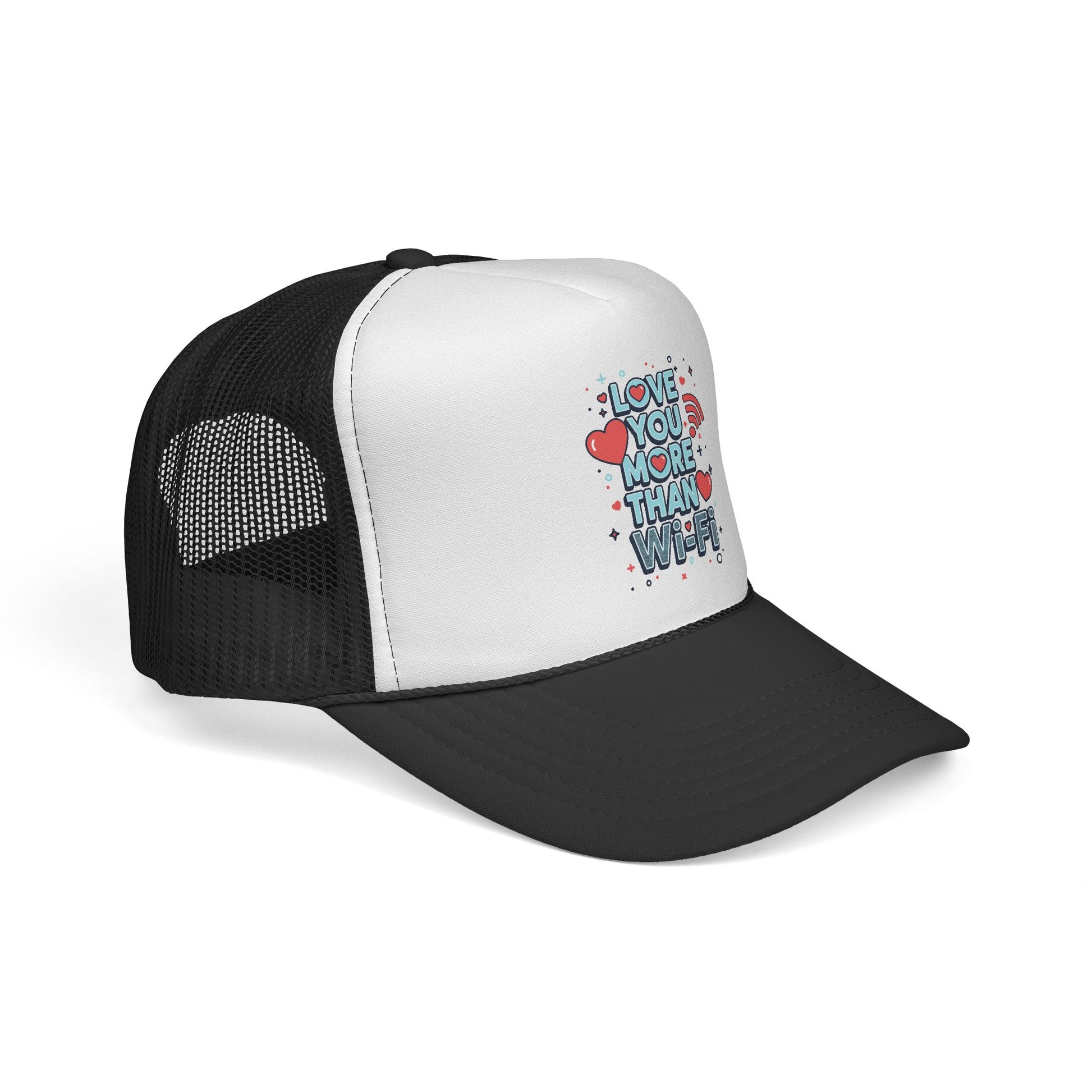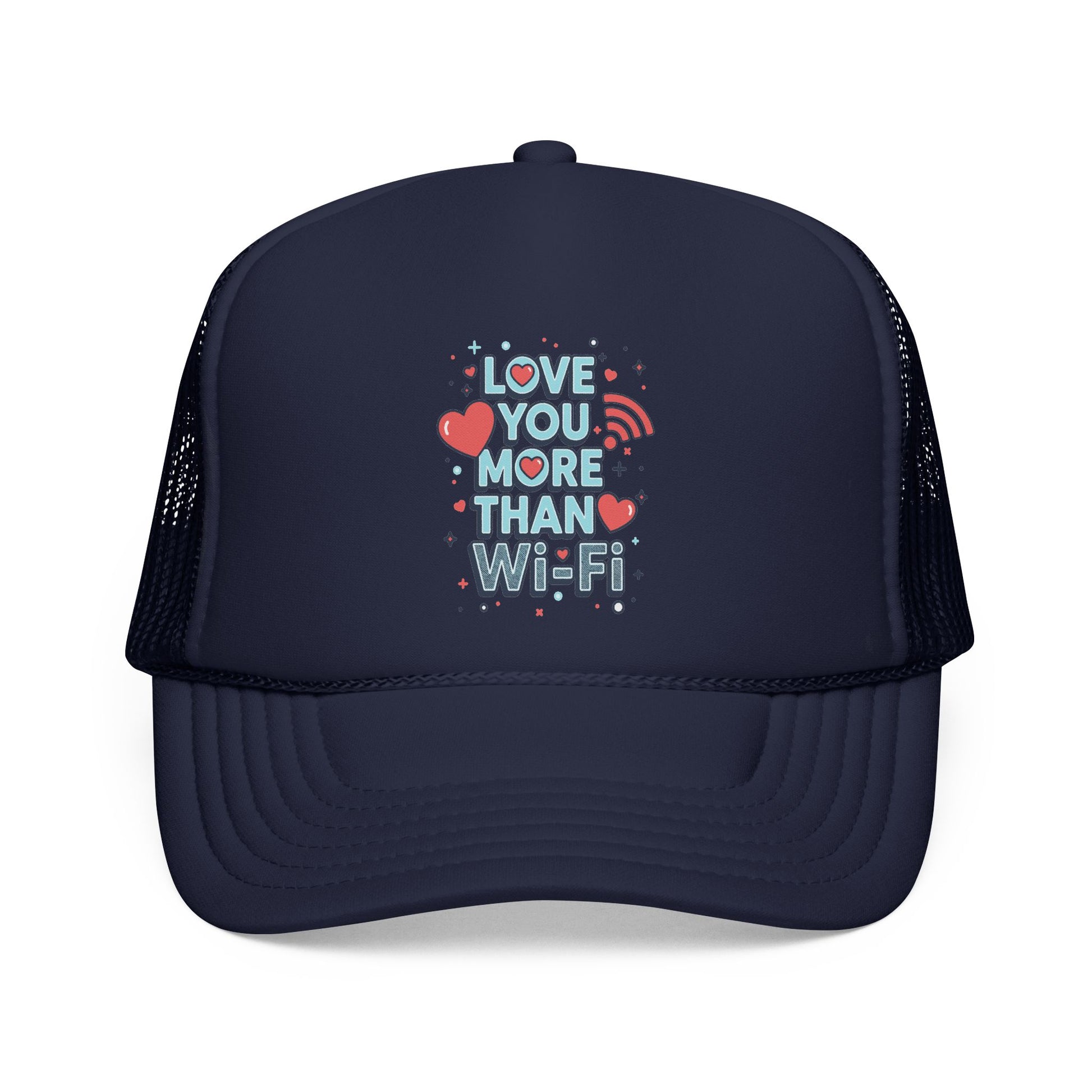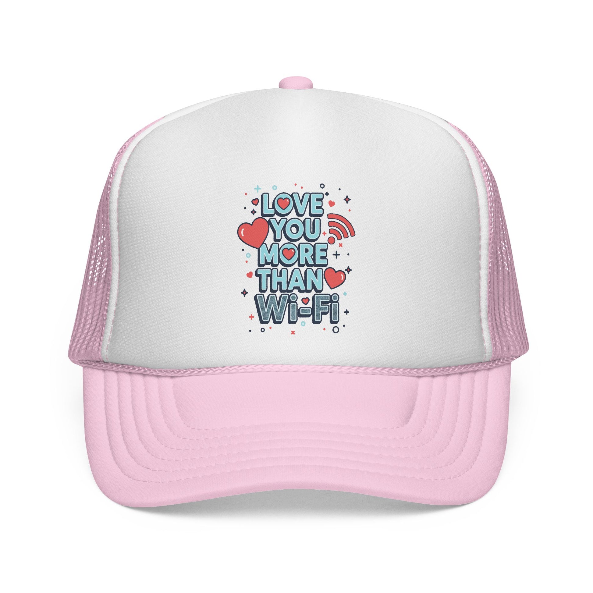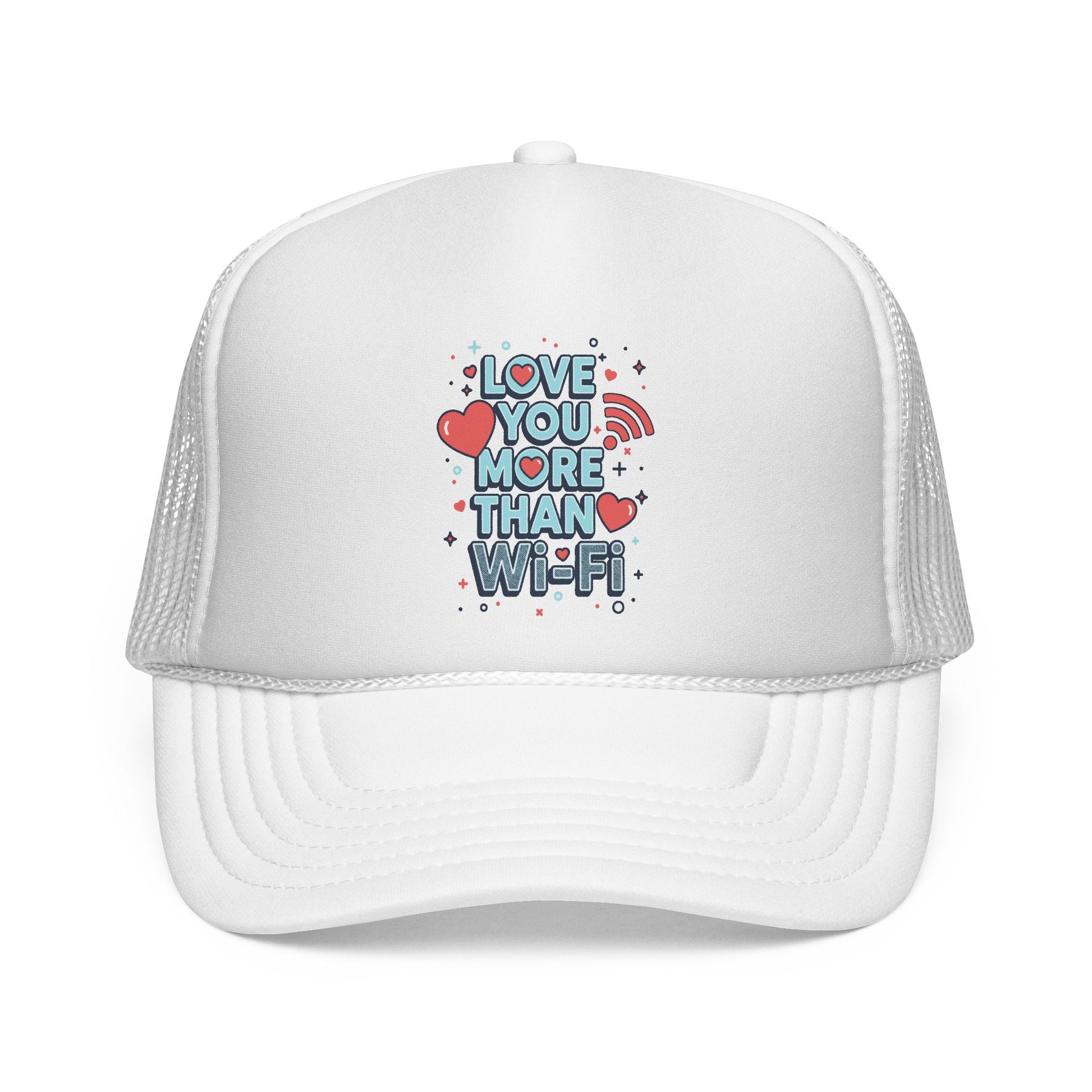 A playful red trucker cap that speaks directly to the connected heart. The foam-front and mesh-back silhouette keeps breathability high while the vibrant, fade-resistant print—“Love You More Than Wi‑Fi”—sits front-and-center with tiny hearts and signal motifs. Lightweight and structured, it settles into weekend adventures, coffee runs, or casual date nights and becomes a small, wearable declaration that brings smiles and conversation wherever it goes.