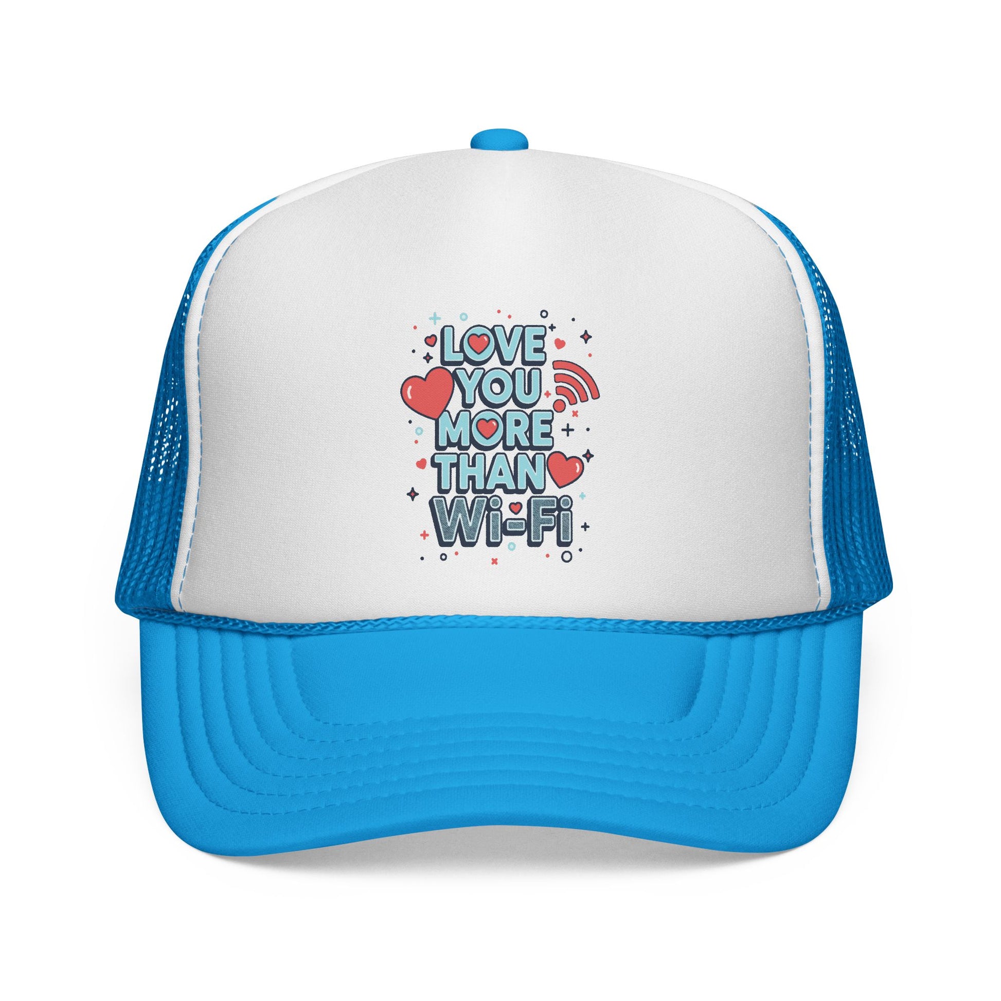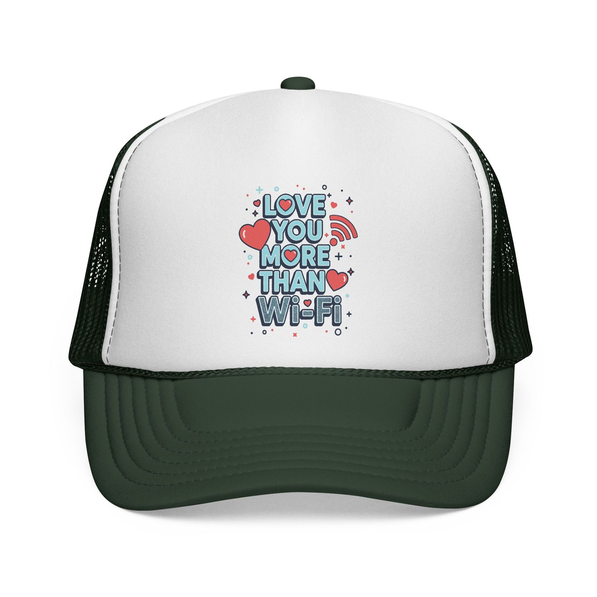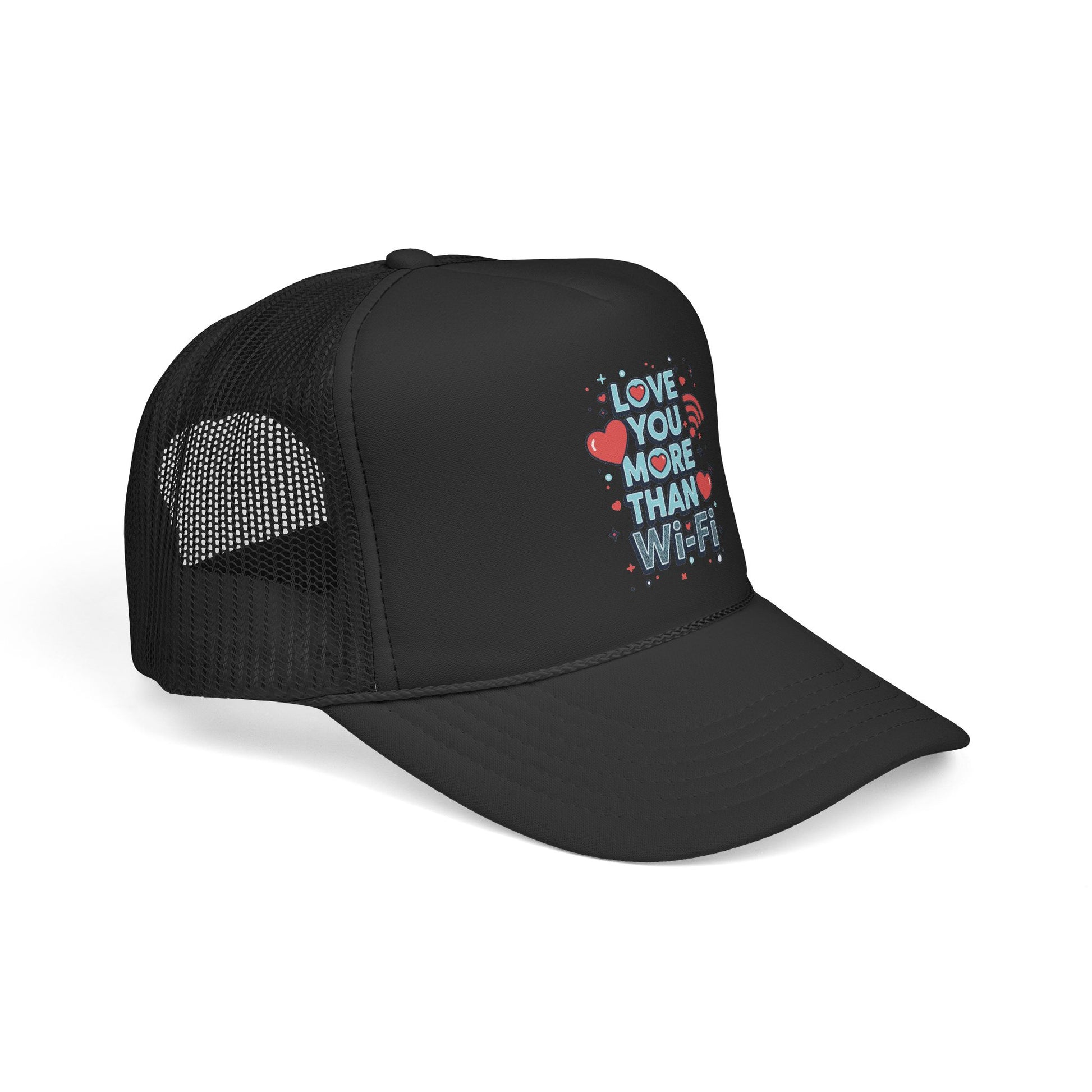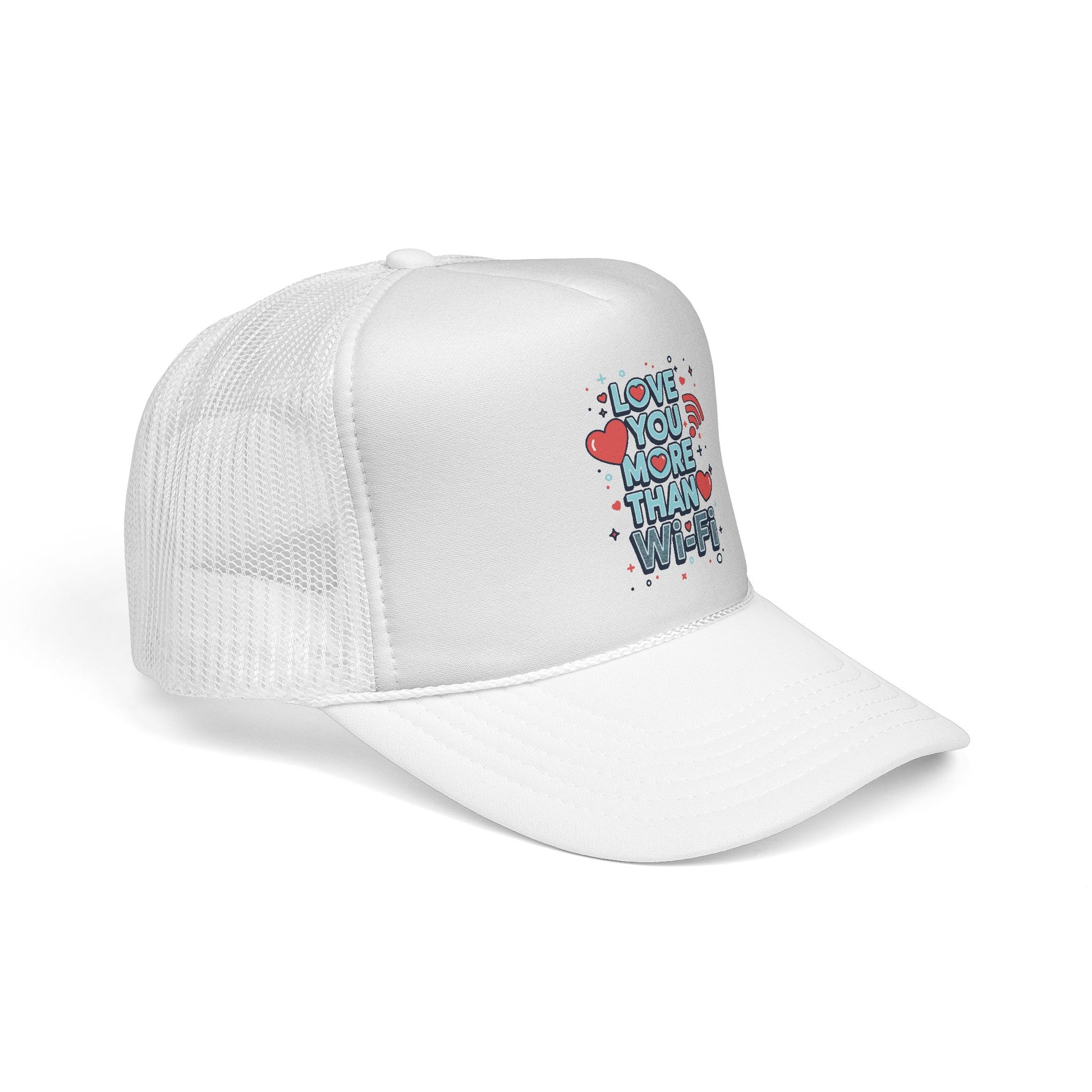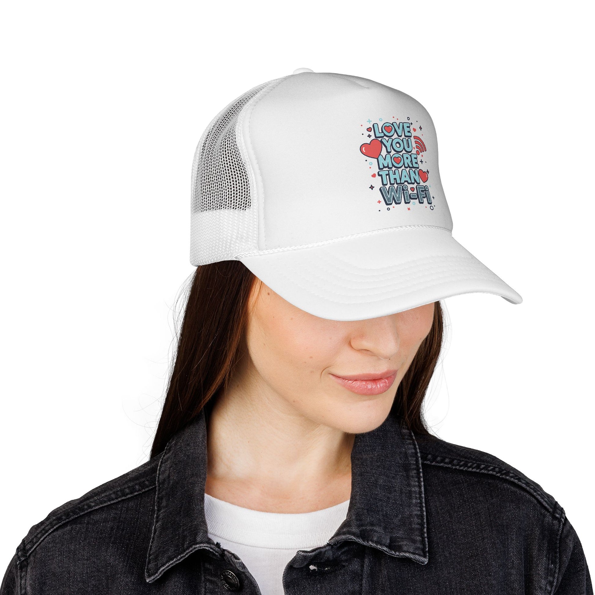 A playful red trucker cap that speaks directly to the connected heart. The foam-front and mesh-back silhouette keeps breathability high while the vibrant, fade-resistant print—“Love You More Than Wi‑Fi”—sits front-and-center with tiny hearts and signal motifs. Lightweight and structured, it settles into weekend adventures, coffee runs, or casual date nights and becomes a small, wearable declaration that brings smiles and conversation wherever it goes.