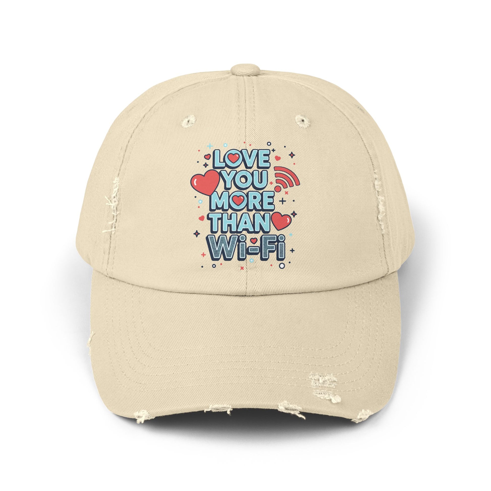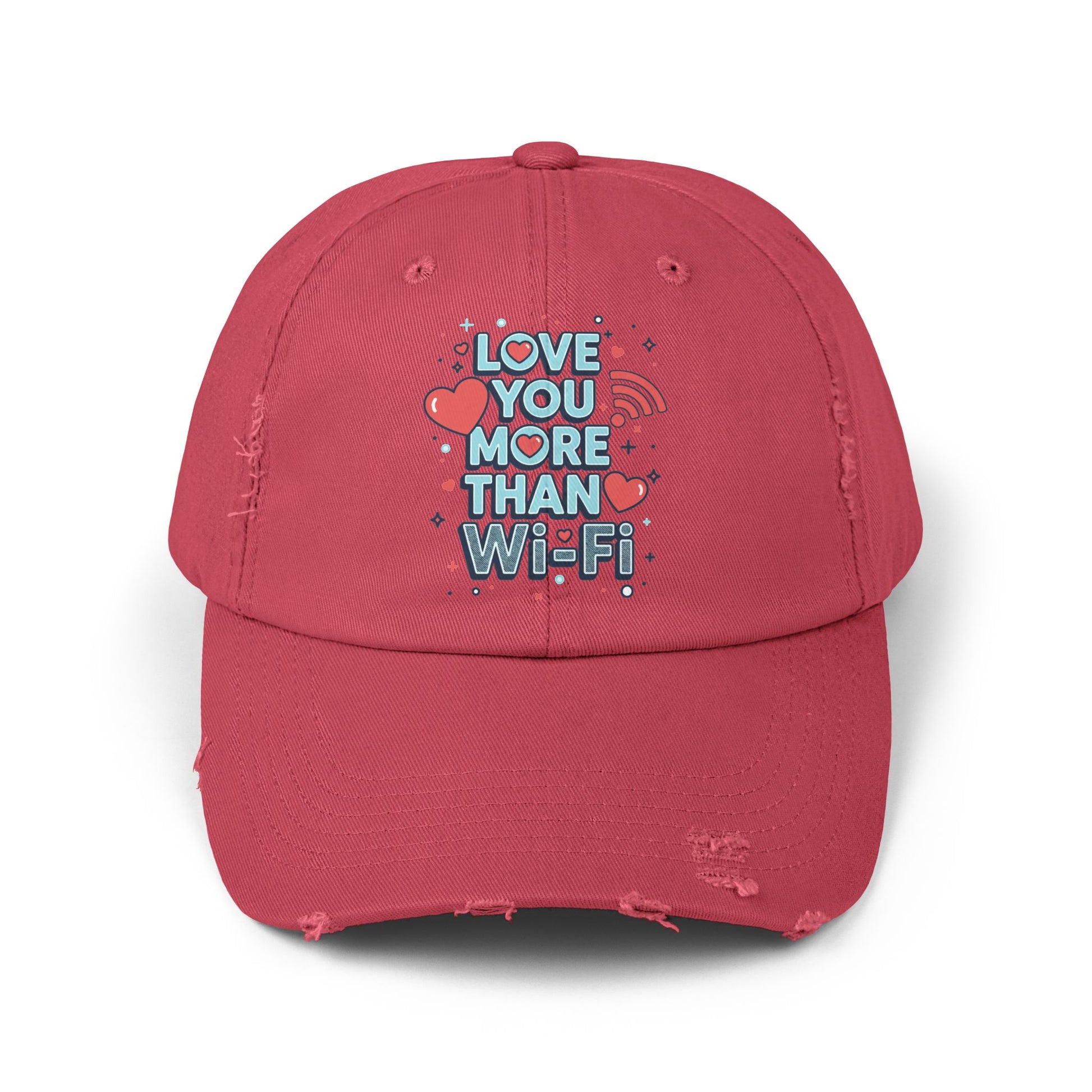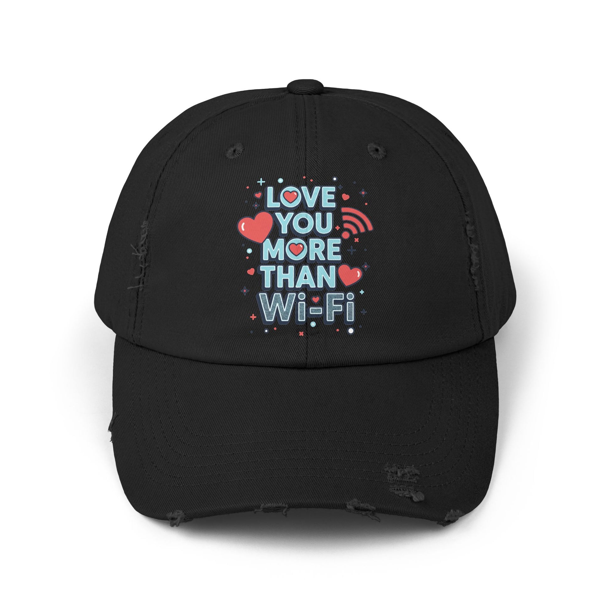 A lived-in, vintage-style cap that speaks with a wink. The distressed black cotton twill softens with wear, while the playful DTF print— “Love You More Than Wi‑Fi” surrounded by hearts and signal motifs—reads like a private joke you want to share. Low-profile, unstructured comfort sits easily on the head; small rips and faded edges add character so each hat feels like it has its own story. The hideaway strap with metal D-ring lets you adjust the fit and keep the silhouette clean. Wear it on coffee runs, casual dates, or lazy weekend walks when you want to show affection with a bit of humor and a worn-in vibe.