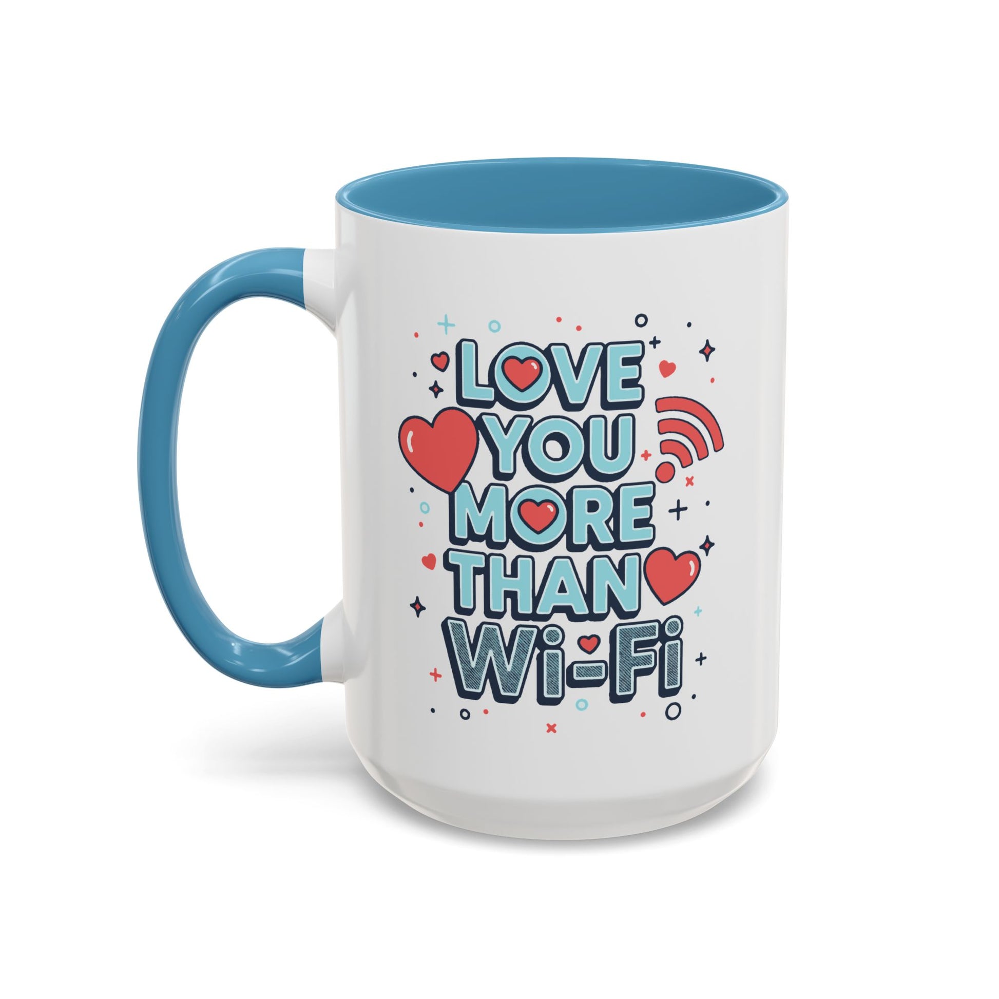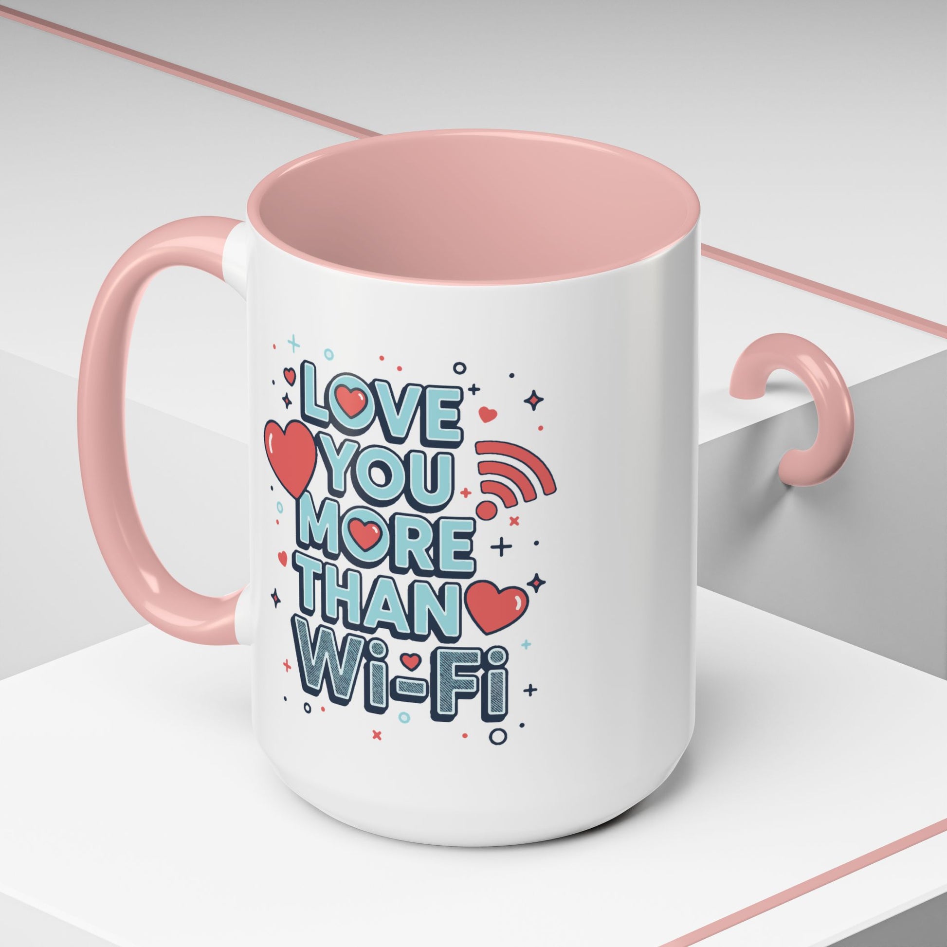 Sip something warm and a little silly with this glossy accent mug. The cheerful hand-lettered design— “Love You More Than Wi‑Fi” surrounded by hearts and tiny signal icons—reads like a quick, affectionate note. It’s light enough for daily use, yet bright and bold enough to spark a smile every morning. Hold the C-shaped handle and feel the smooth ceramic warmth; the colored interior and handle give the design a playful contrast that pops against the white body. This mug settles into kitchen counters, work desks, and bedside tables, quietly broadcasting a small, modern love language that feels personal and familiar.