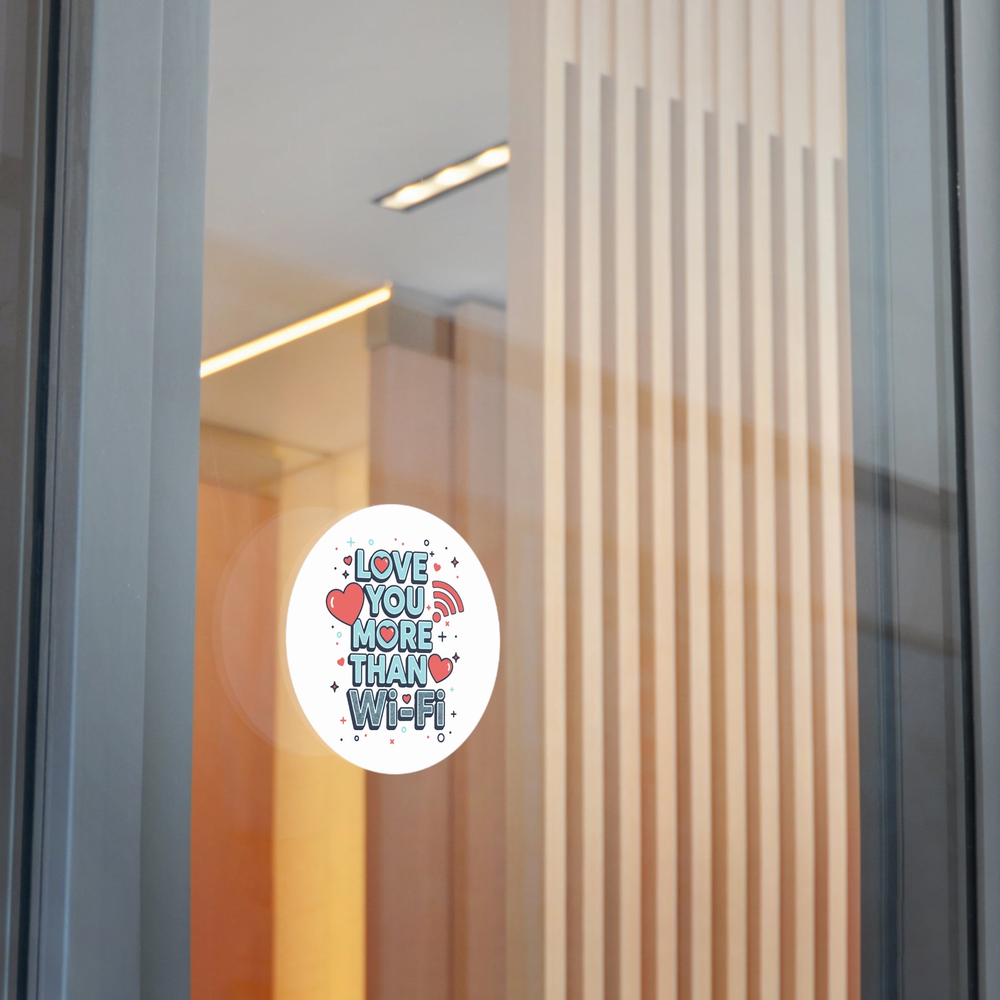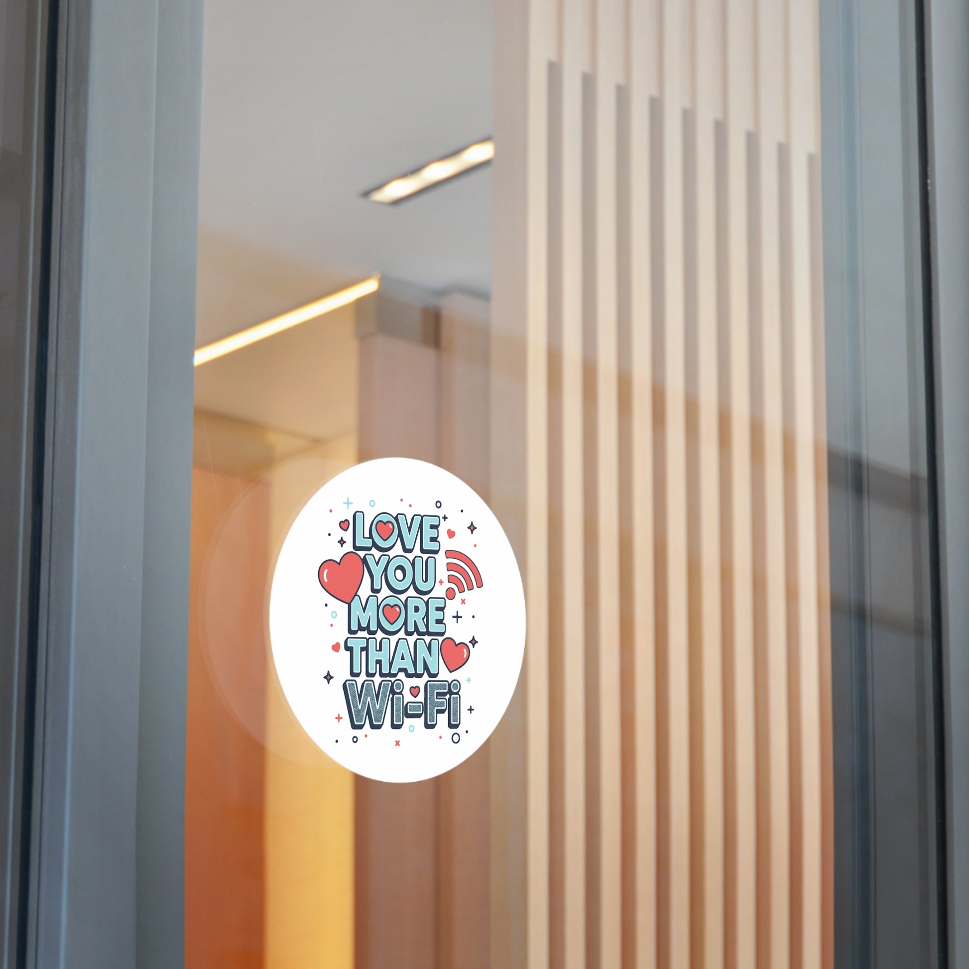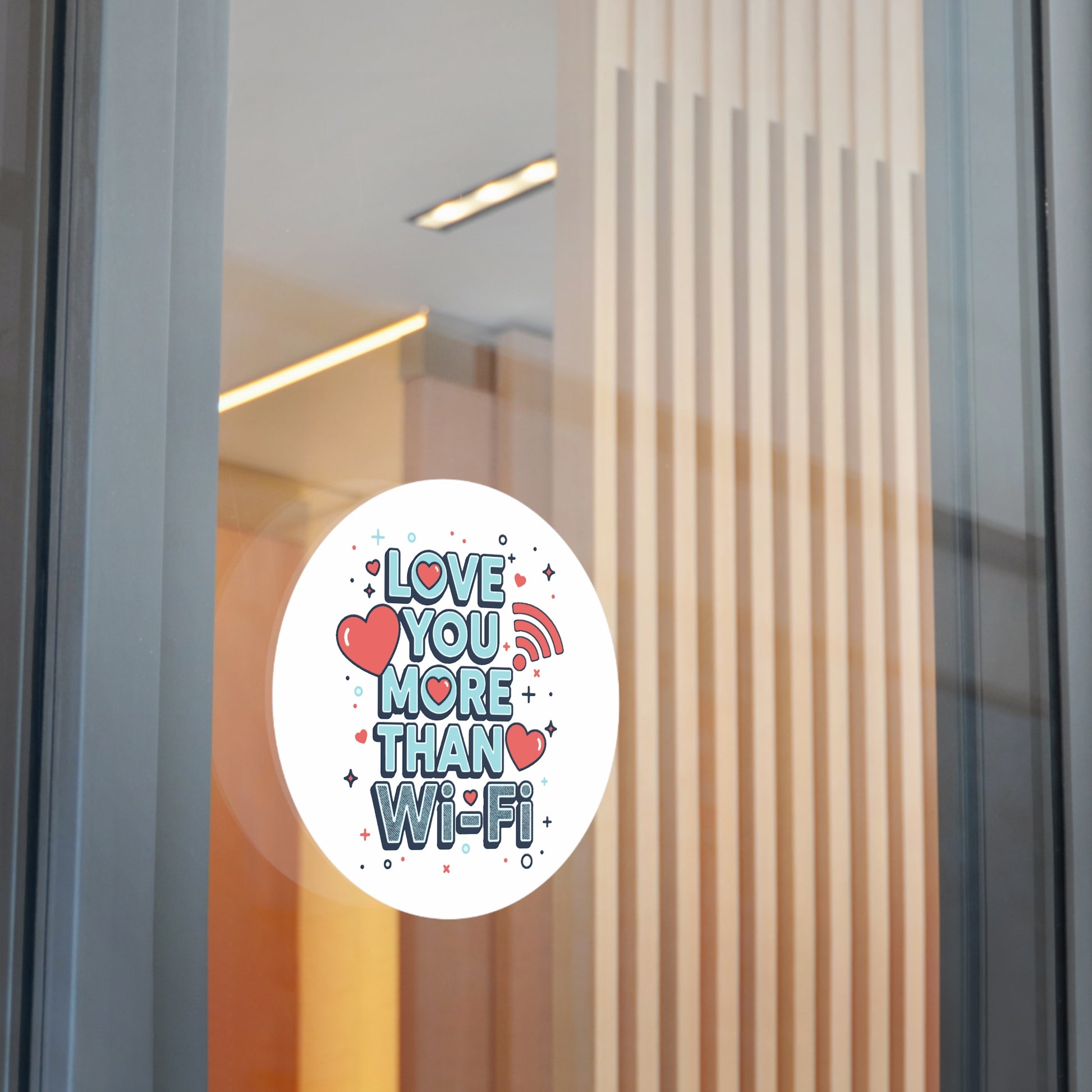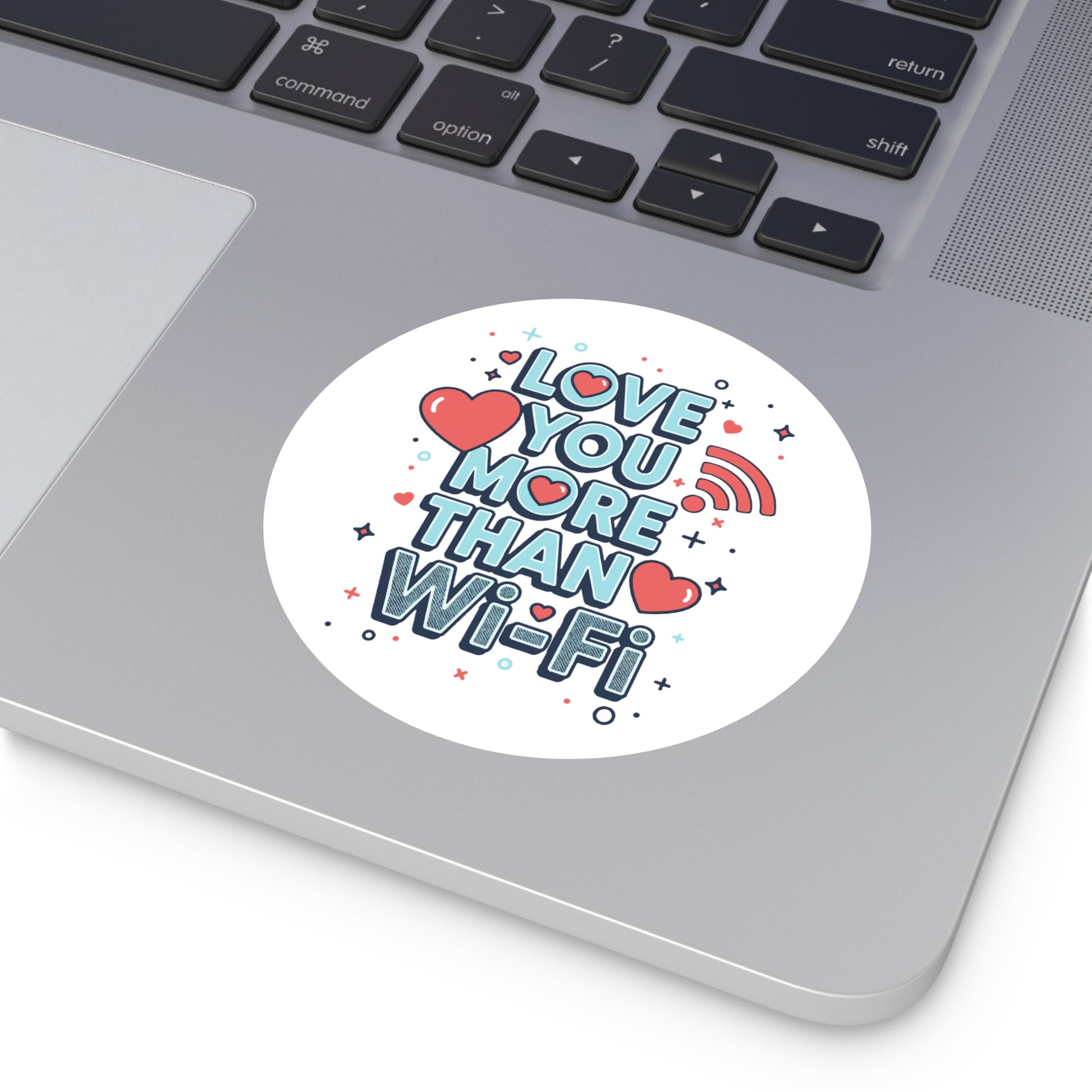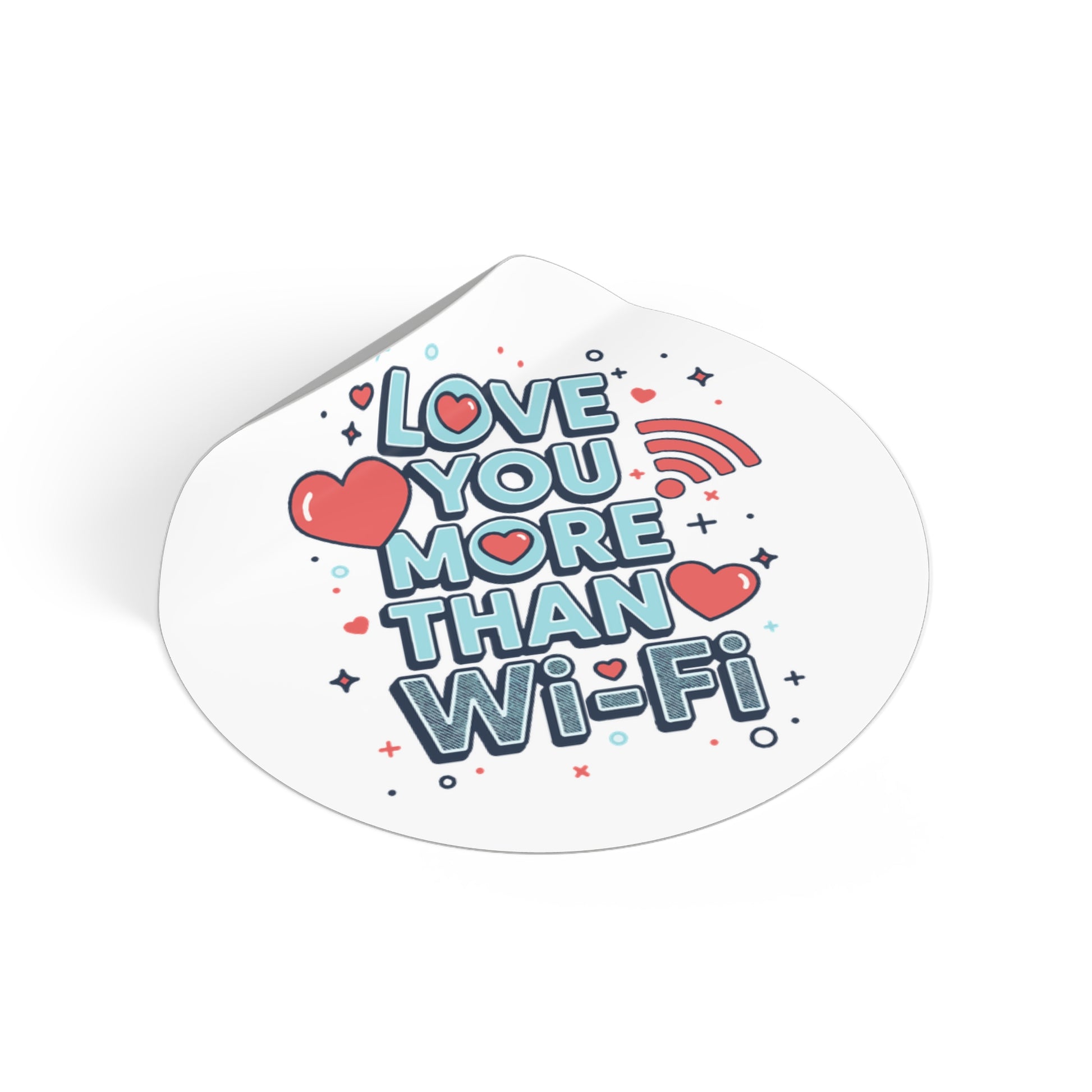 A cheerful round vinyl sticker that says “Love You More Than Wi‑Fi,” rendered in playful block letters, hearts, and tiny star accents. The matte surface and rich eco‑solvent inks keep colors poppy and soft to the touch, while a UV protective laminate guards the print from sun and weather. Lightweight and waterproof, it peels on easily and clings with a strong adhesive—perfect for laptops, water bottles, phone cases, notebooks, planners, or anywhere you want to leave a tiny, sincere reminder of affection. The design reads as both modern and whimsical, a small keepsake that sparks smiles and tech‑savvy romance.