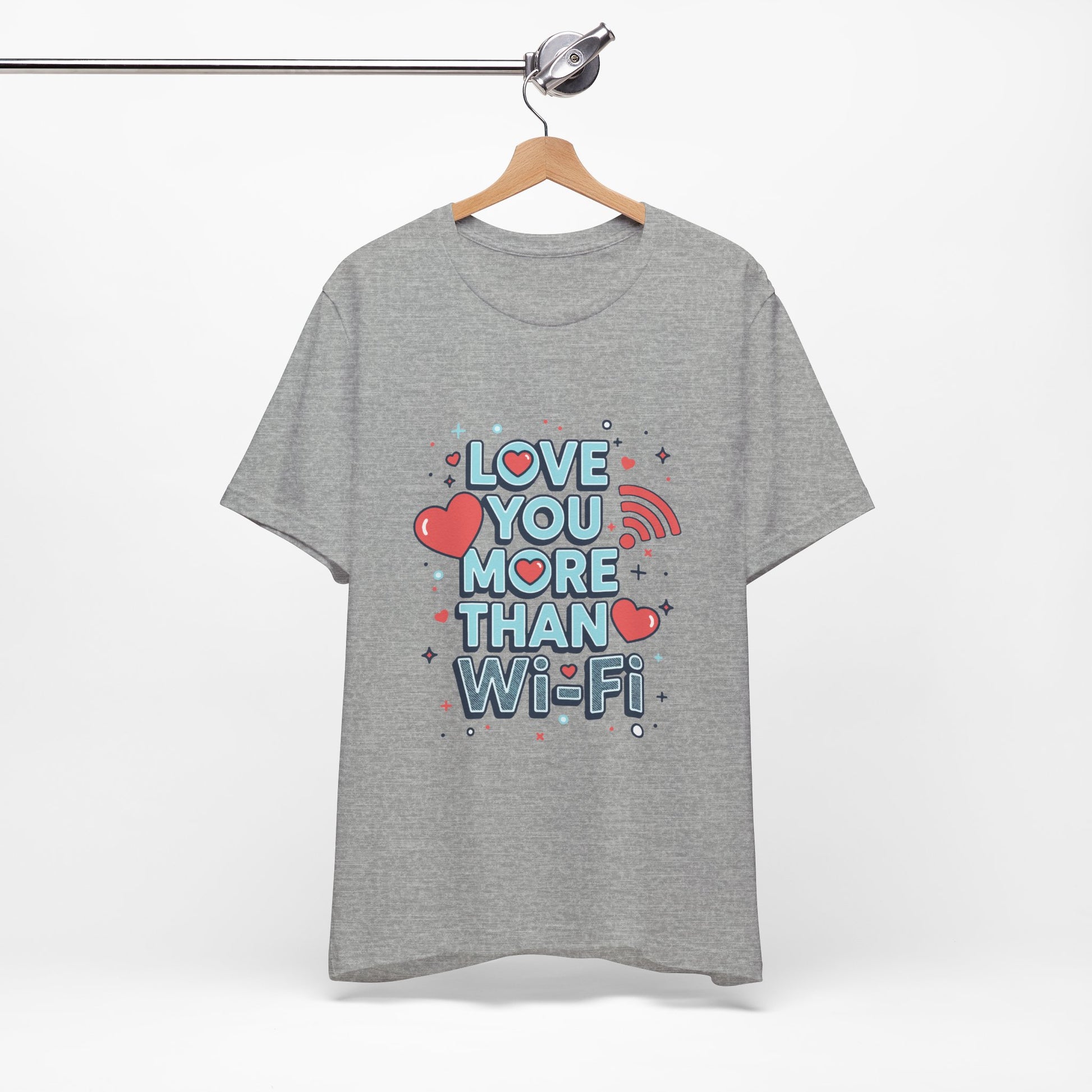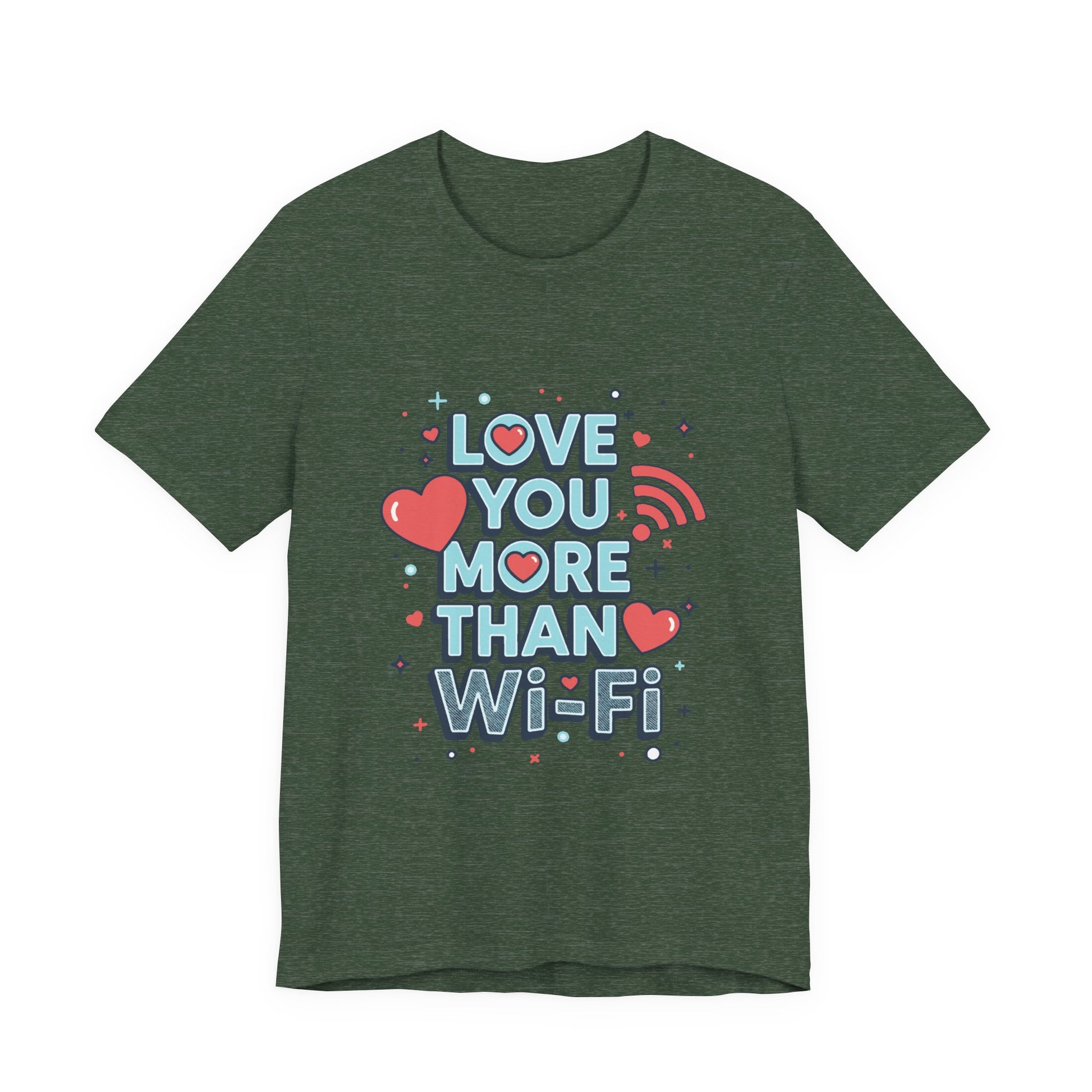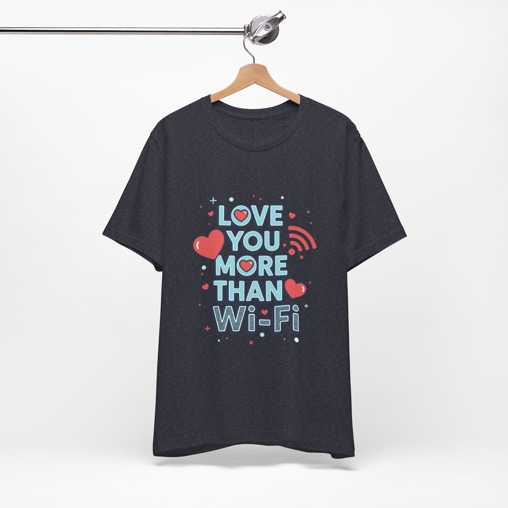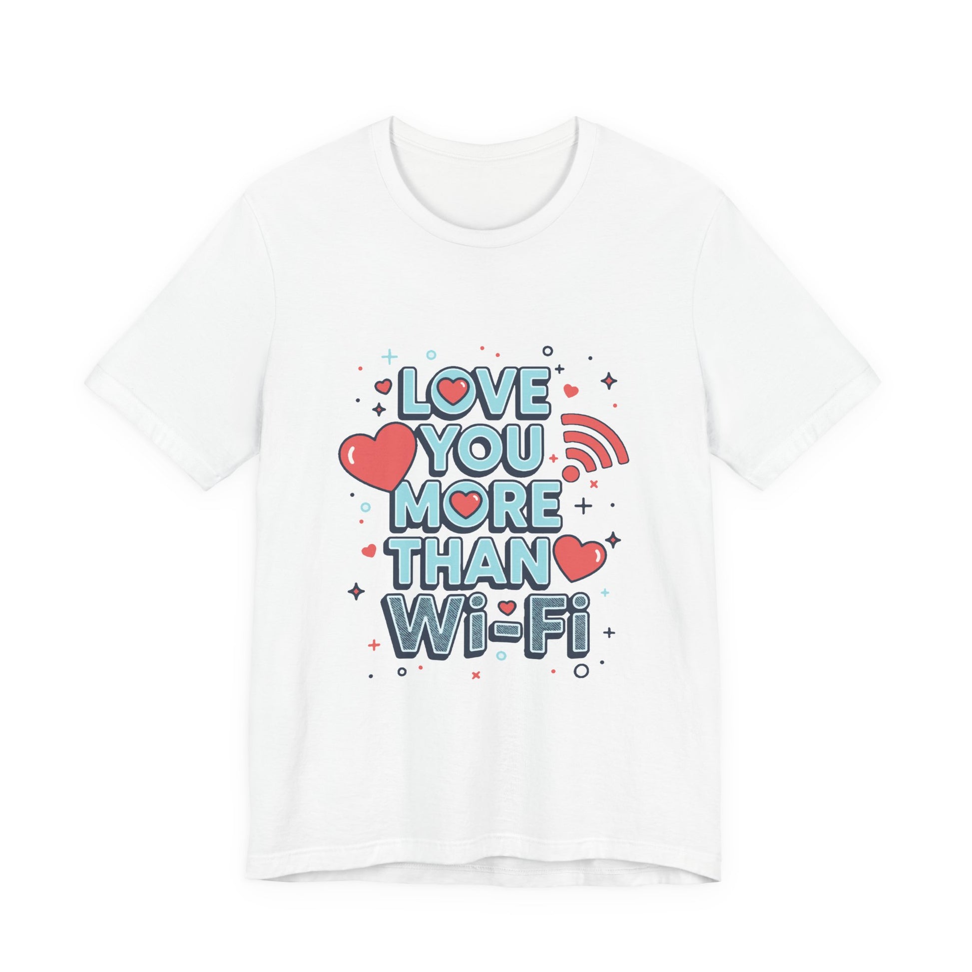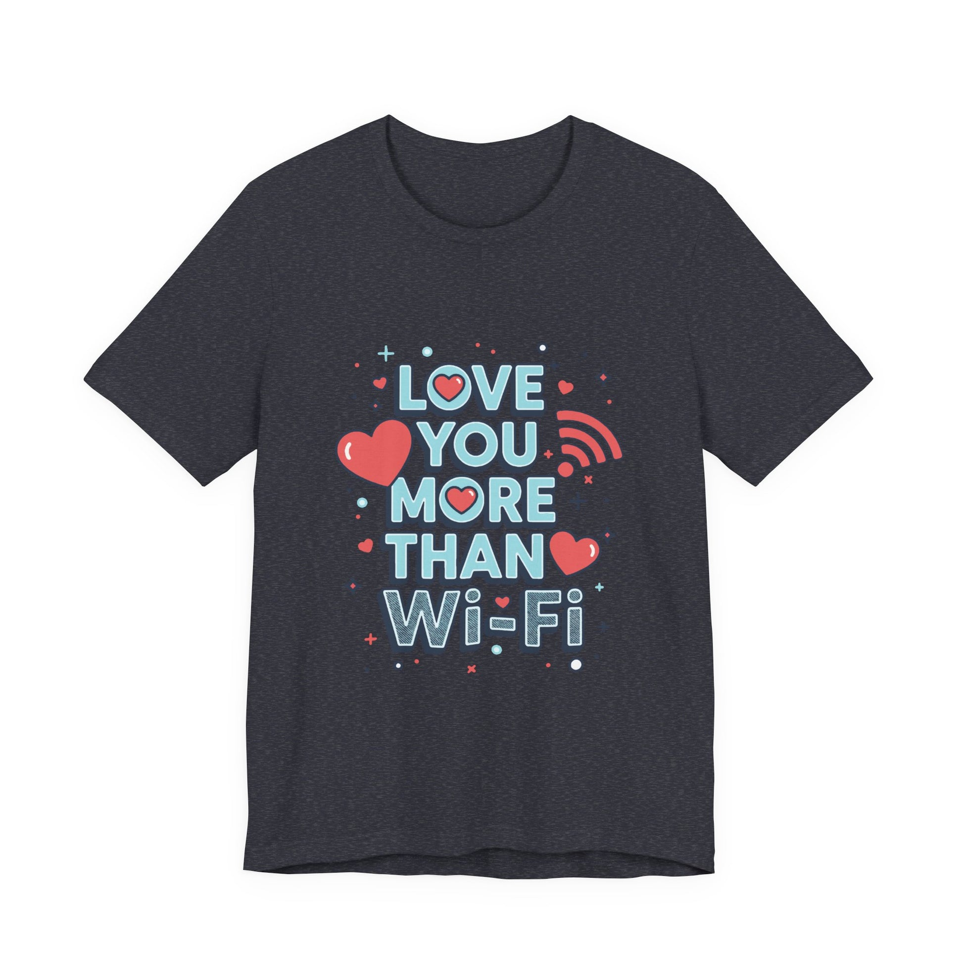 Lightweight and soft, this tee puts a little playful romance on your chest: a bright, hand-lettered block that reads “Love You More Than Wi‑Fi,” accented with hearts and a tiny signal icon. The airy 100% Airlume combed and ring‑spun cotton feels breathable for all-day wear and layers cleanly under jackets or sweaters. Side seams and shoulder tape keep the shape crisp through washes. It’s a casual, honest way to say what you feel—whether you’re lounging at home, grabbing coffee with your person, or sending a flirty snapshot midday.