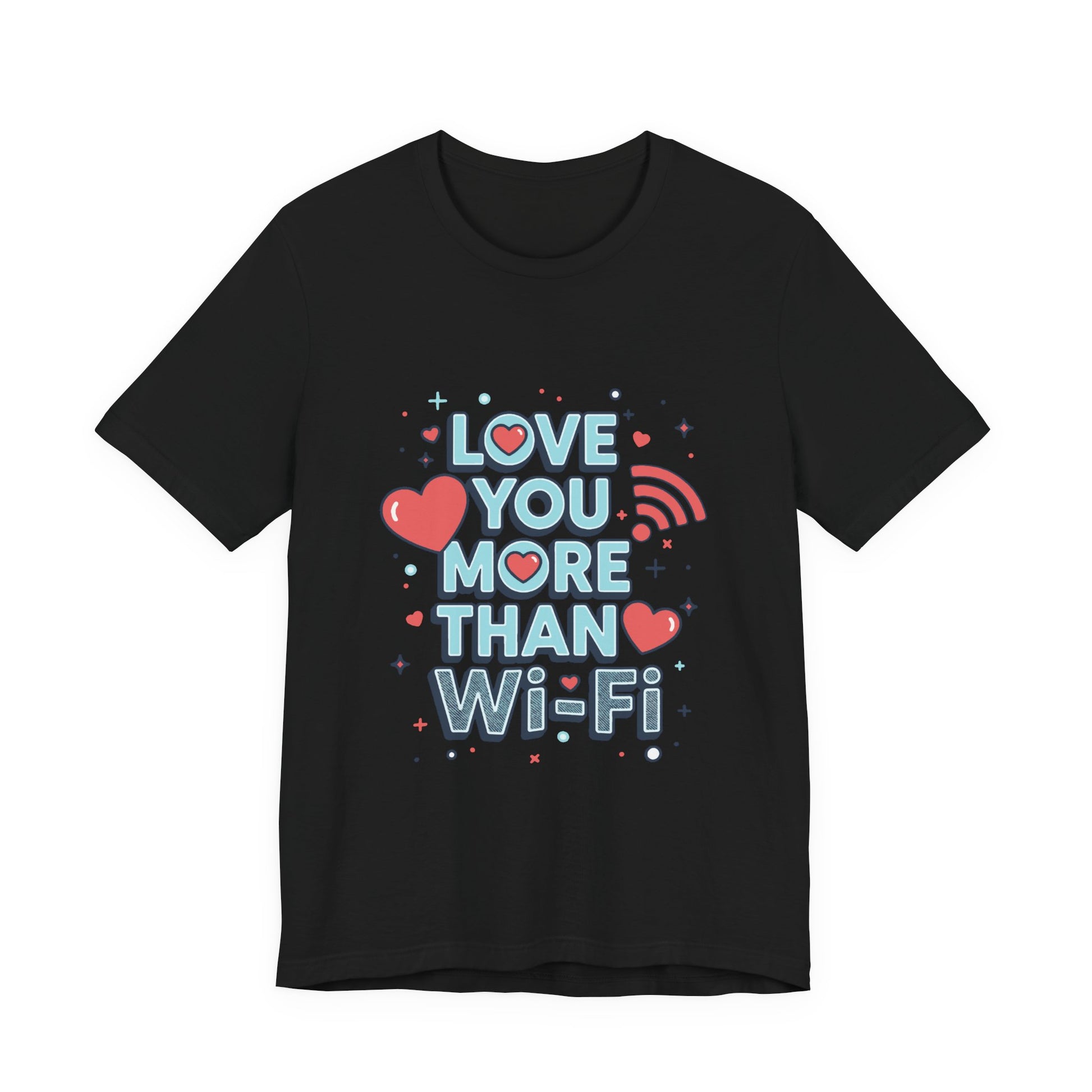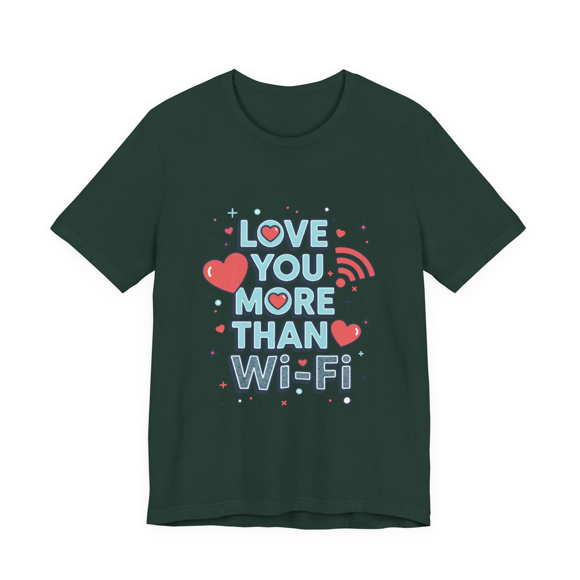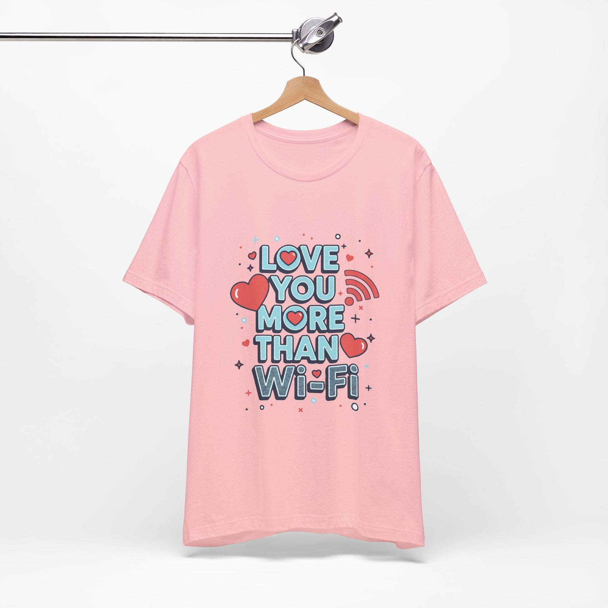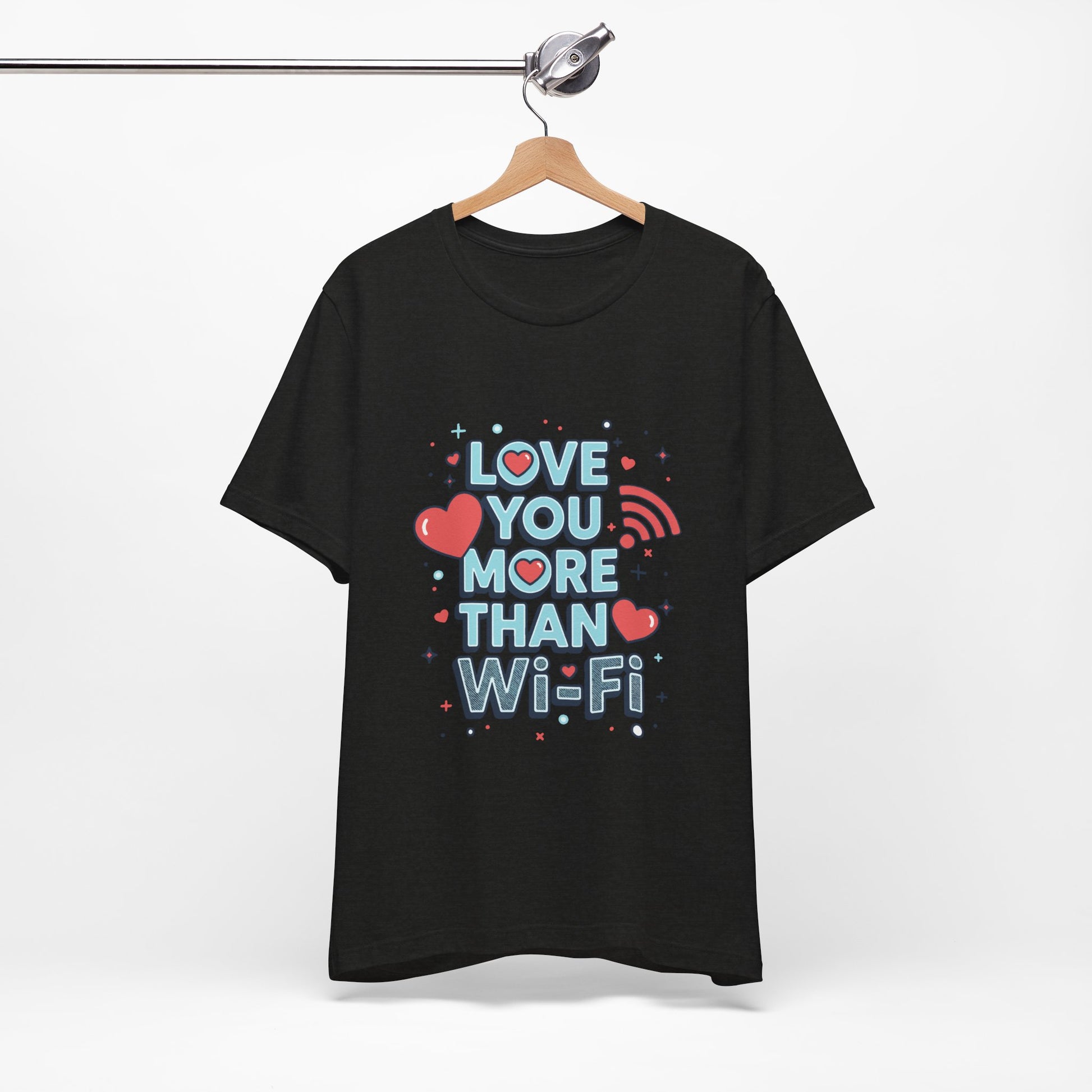 Lightweight and soft, this tee puts a little playful romance on your chest: a bright, hand-lettered block that reads “Love You More Than Wi‑Fi,” accented with hearts and a tiny signal icon. The airy 100% Airlume combed and ring‑spun cotton feels breathable for all-day wear and layers cleanly under jackets or sweaters. Side seams and shoulder tape keep the shape crisp through washes. It’s a casual, honest way to say what you feel—whether you’re lounging at home, grabbing coffee with your person, or sending a flirty snapshot midday.